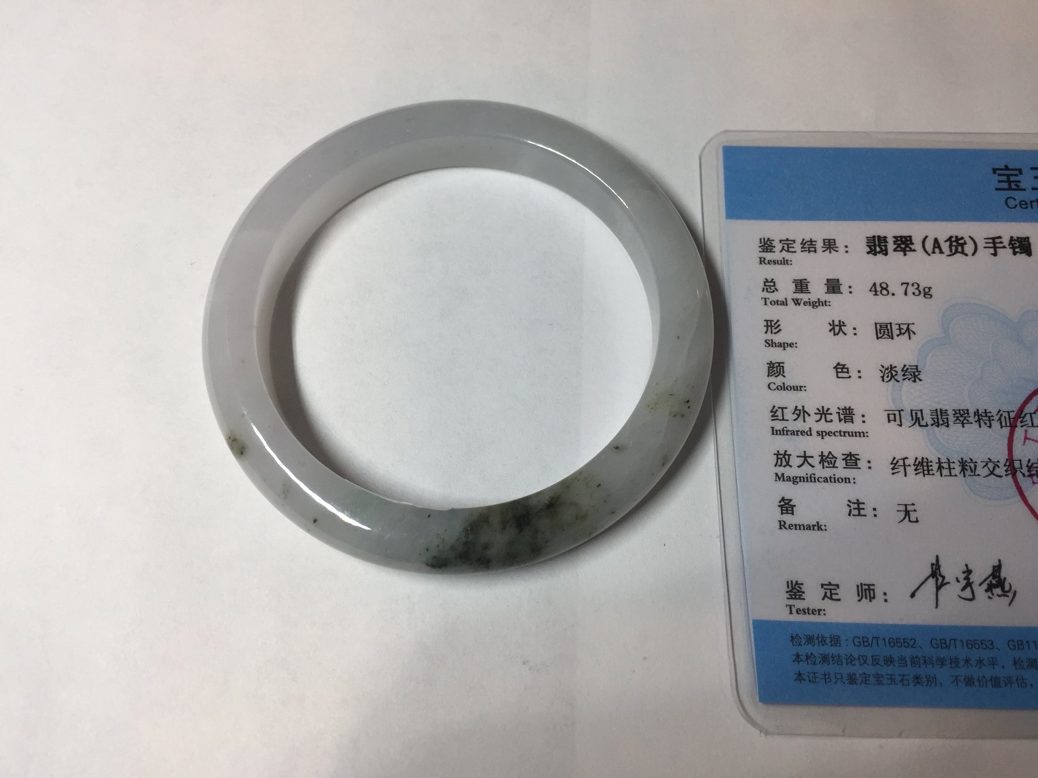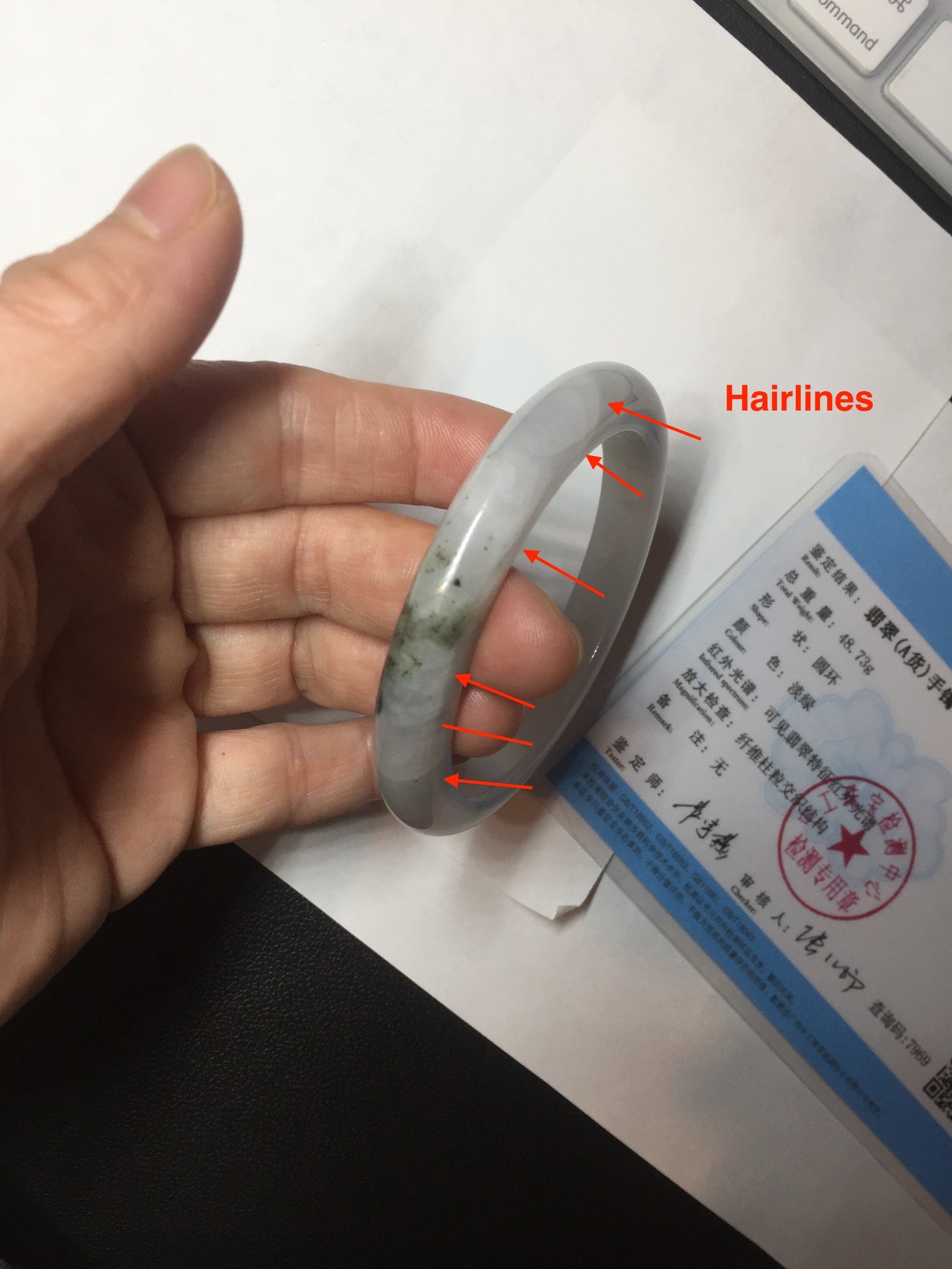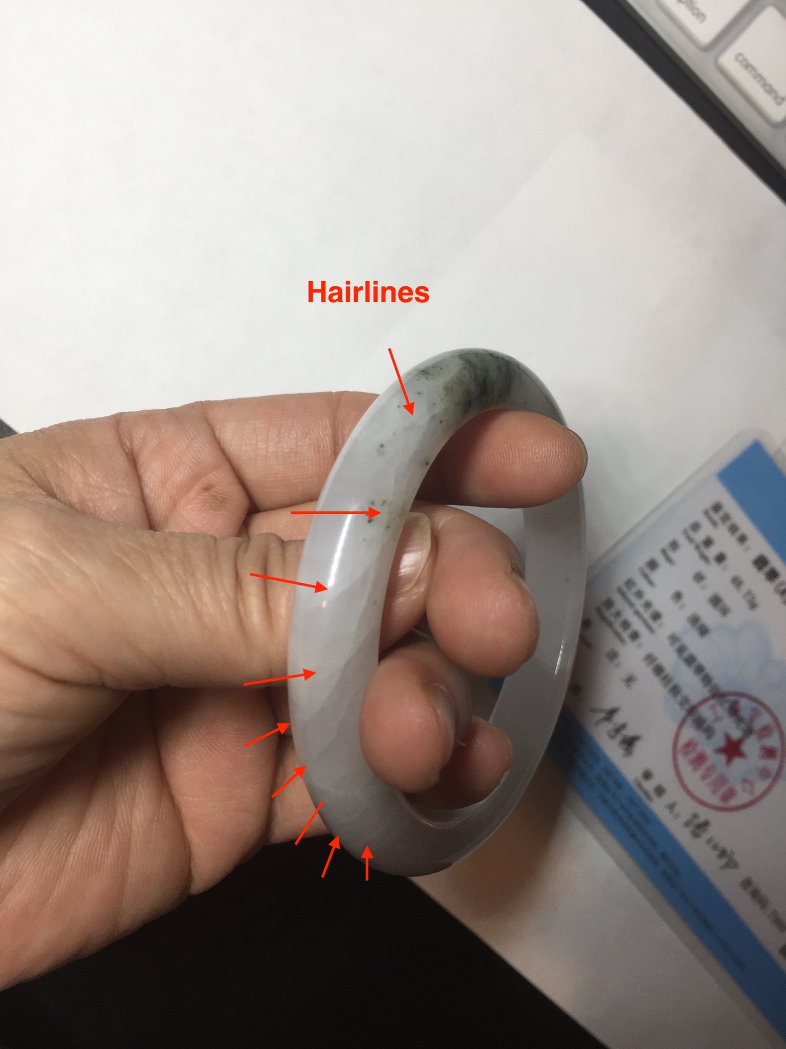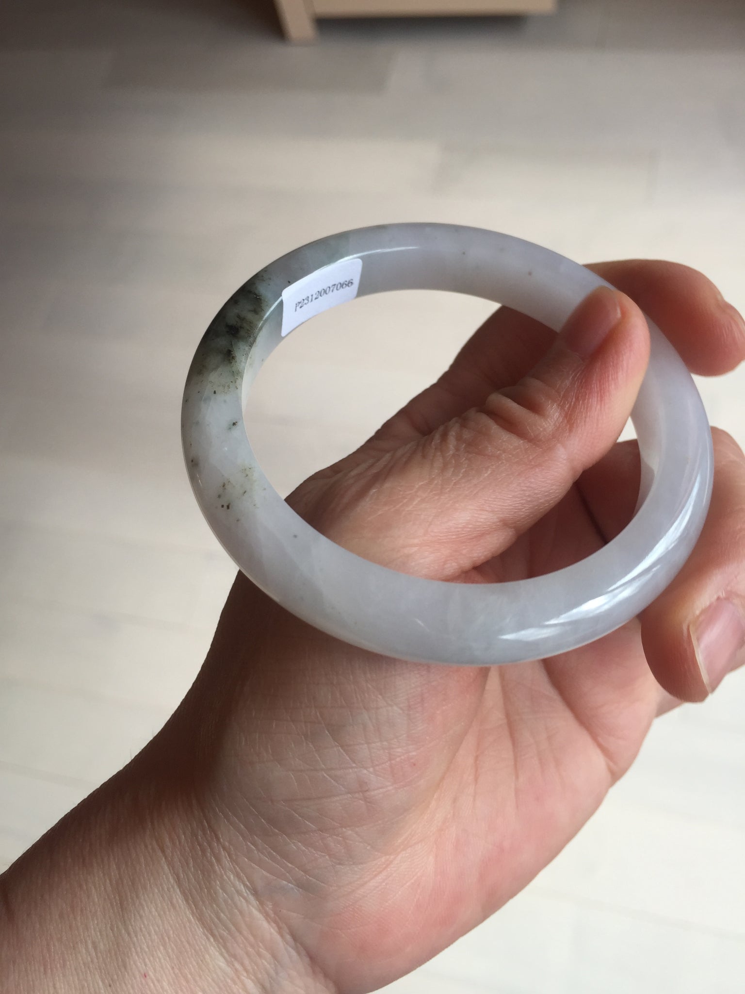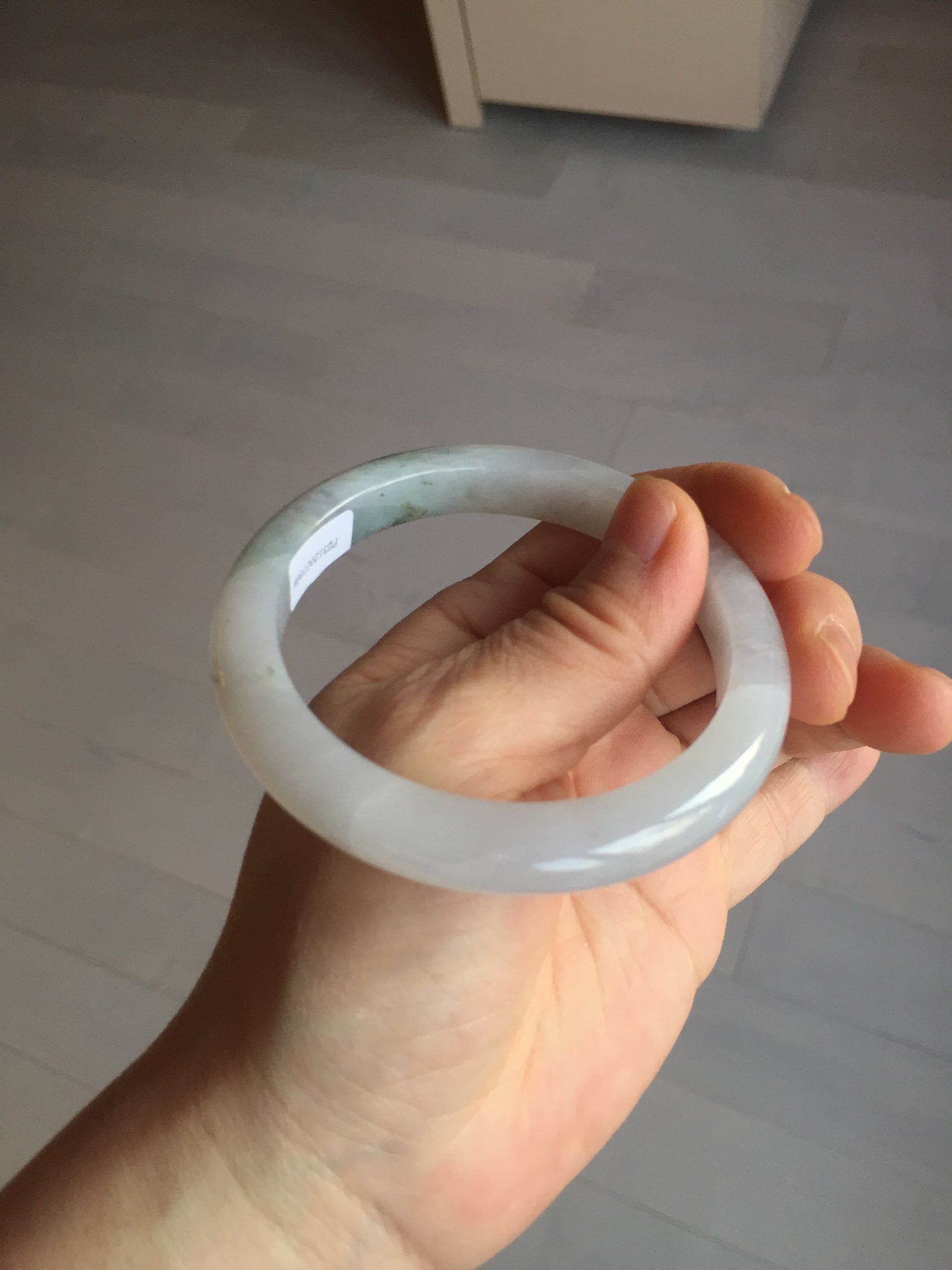No cracks but quite a lot of hairlines. The bangle is solid (Guaranteed!). Some cotton lines and cotton areas, black/ brown spots and areas. The purple is super light and it is only a hint of it.