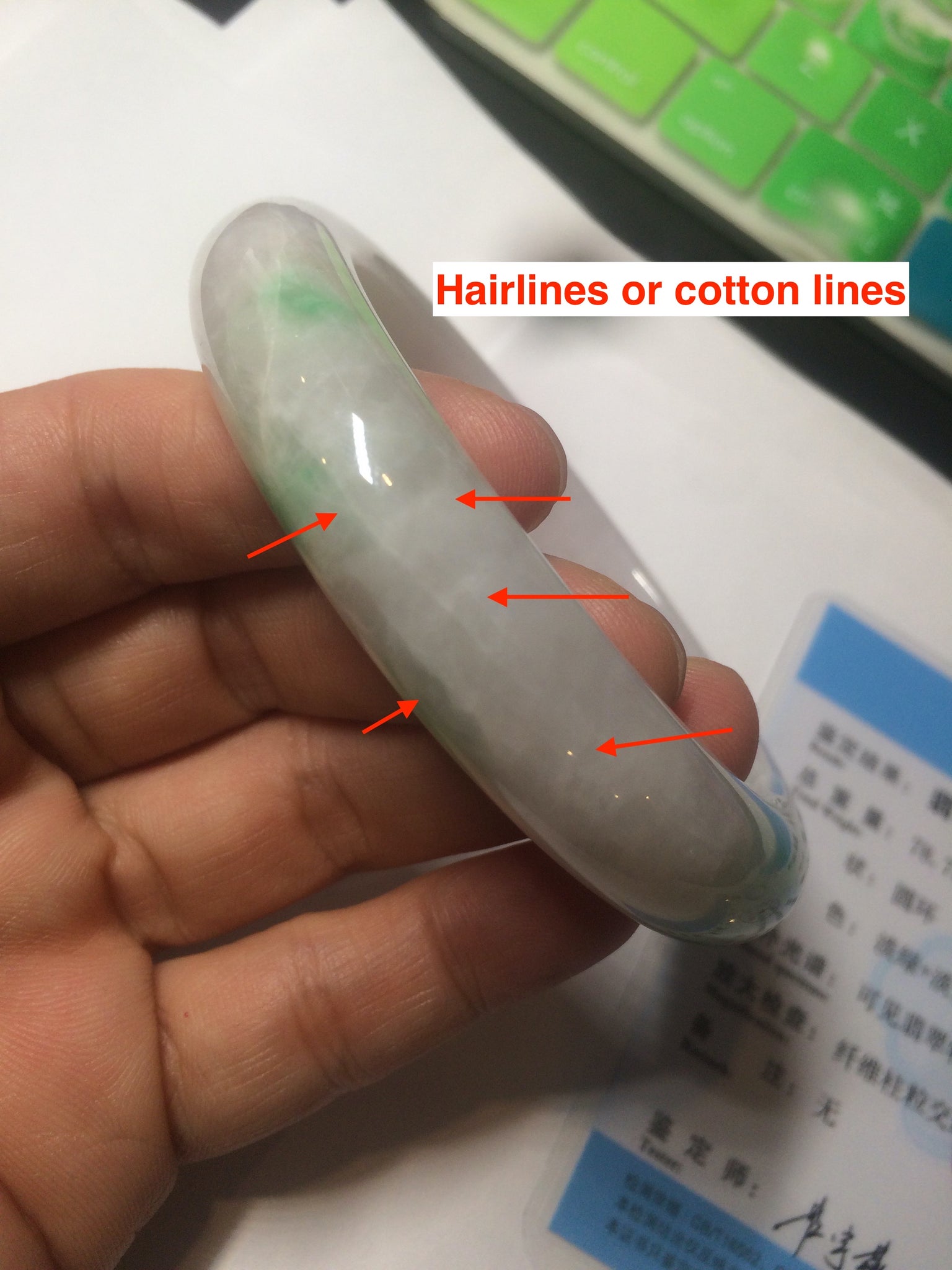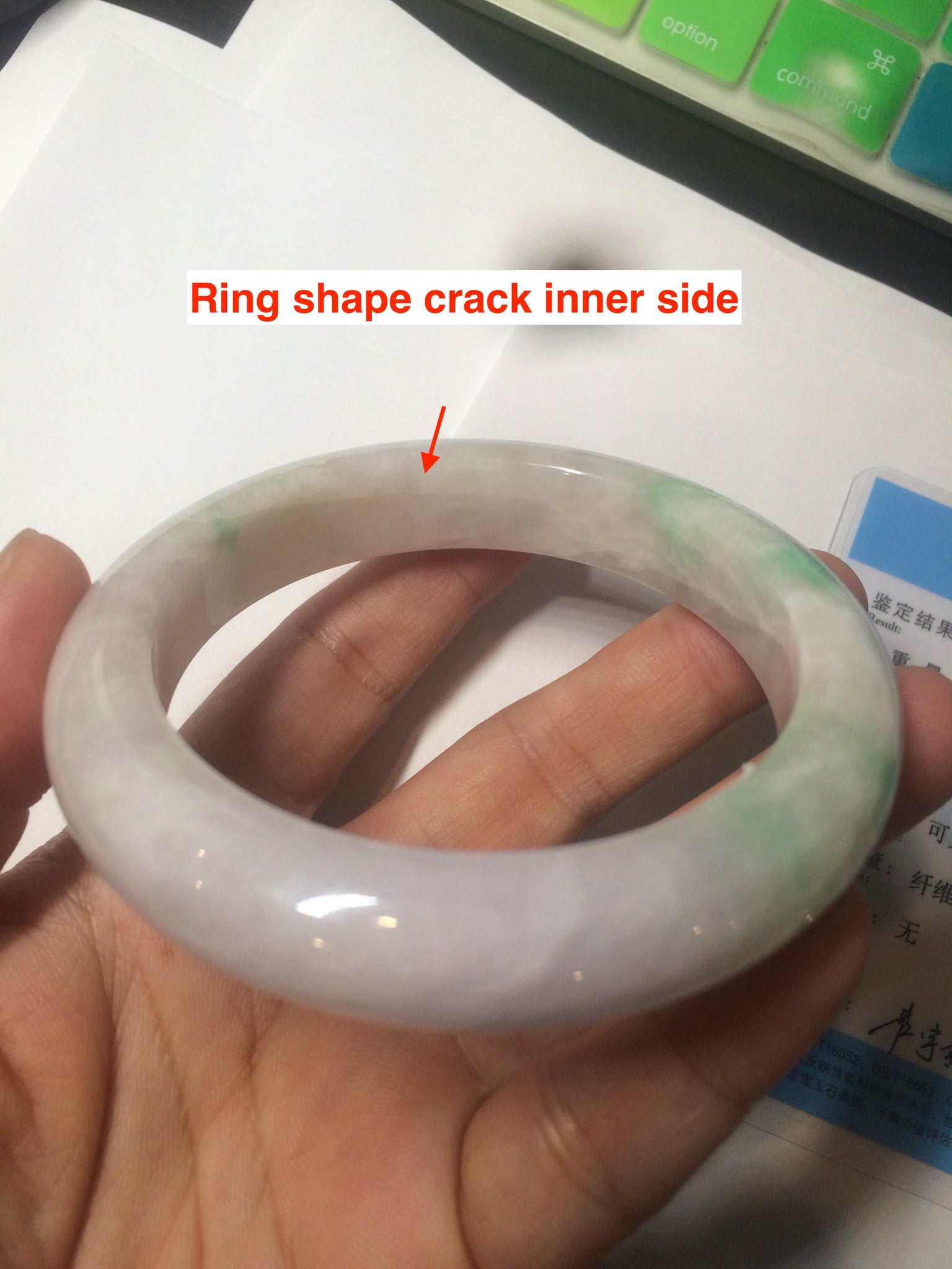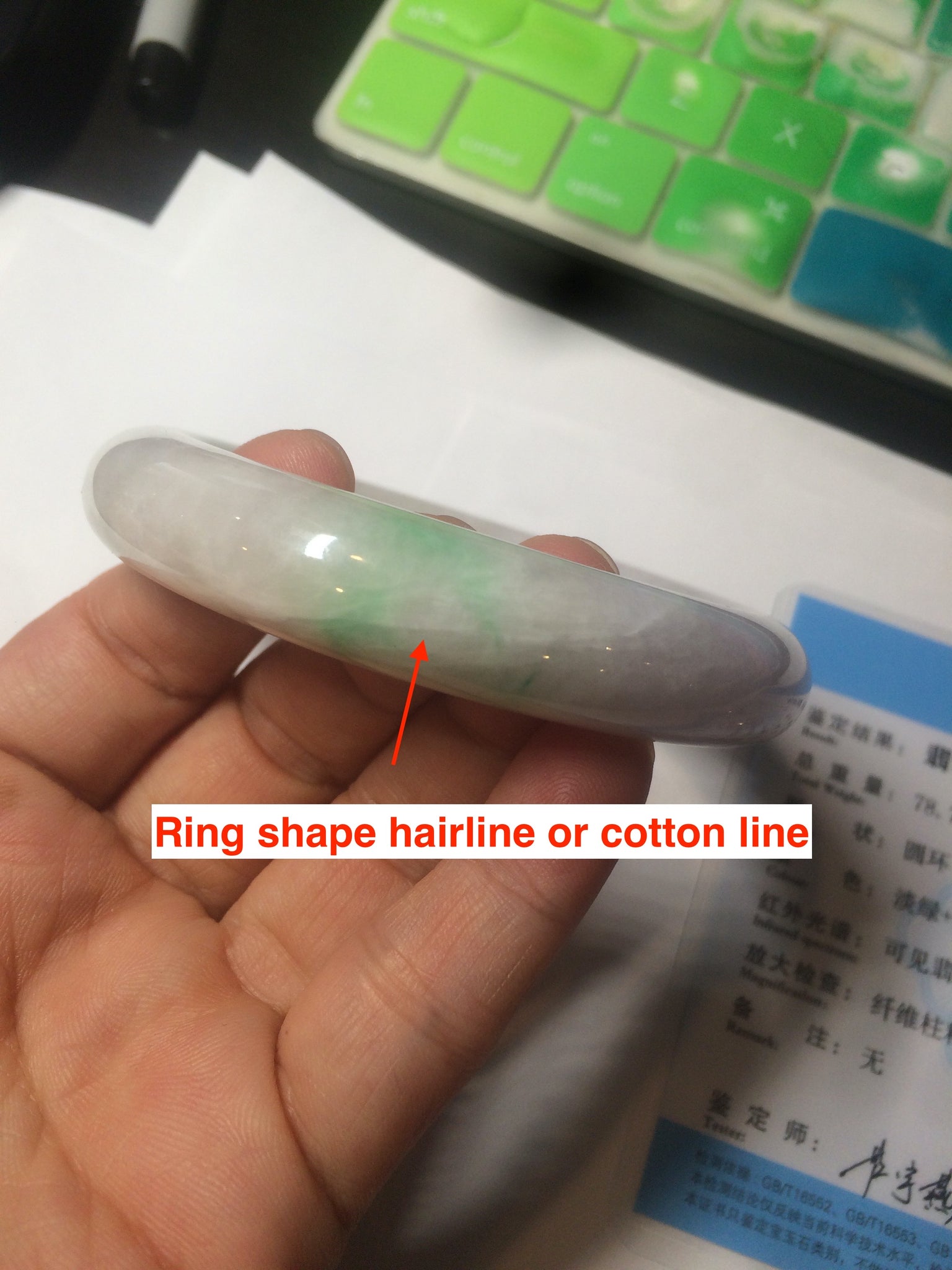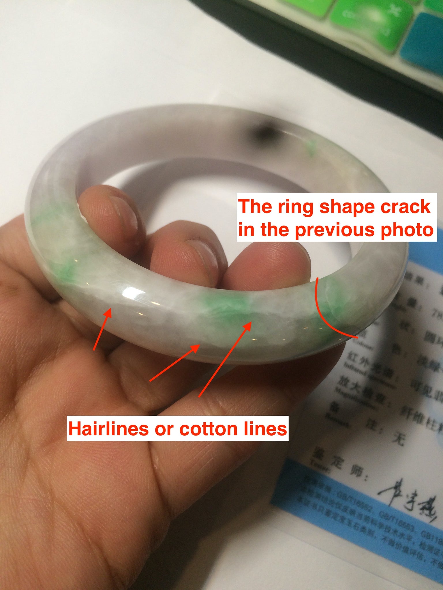 One ring-shaped crack. Quite a lot of hairlines or cotton lines. Photos may not show all. One of them are ring shape. The bangle is solid(Guaranteed!). Some cotton spots and lines. Not transparent. The purple is lighter than in the photos.
