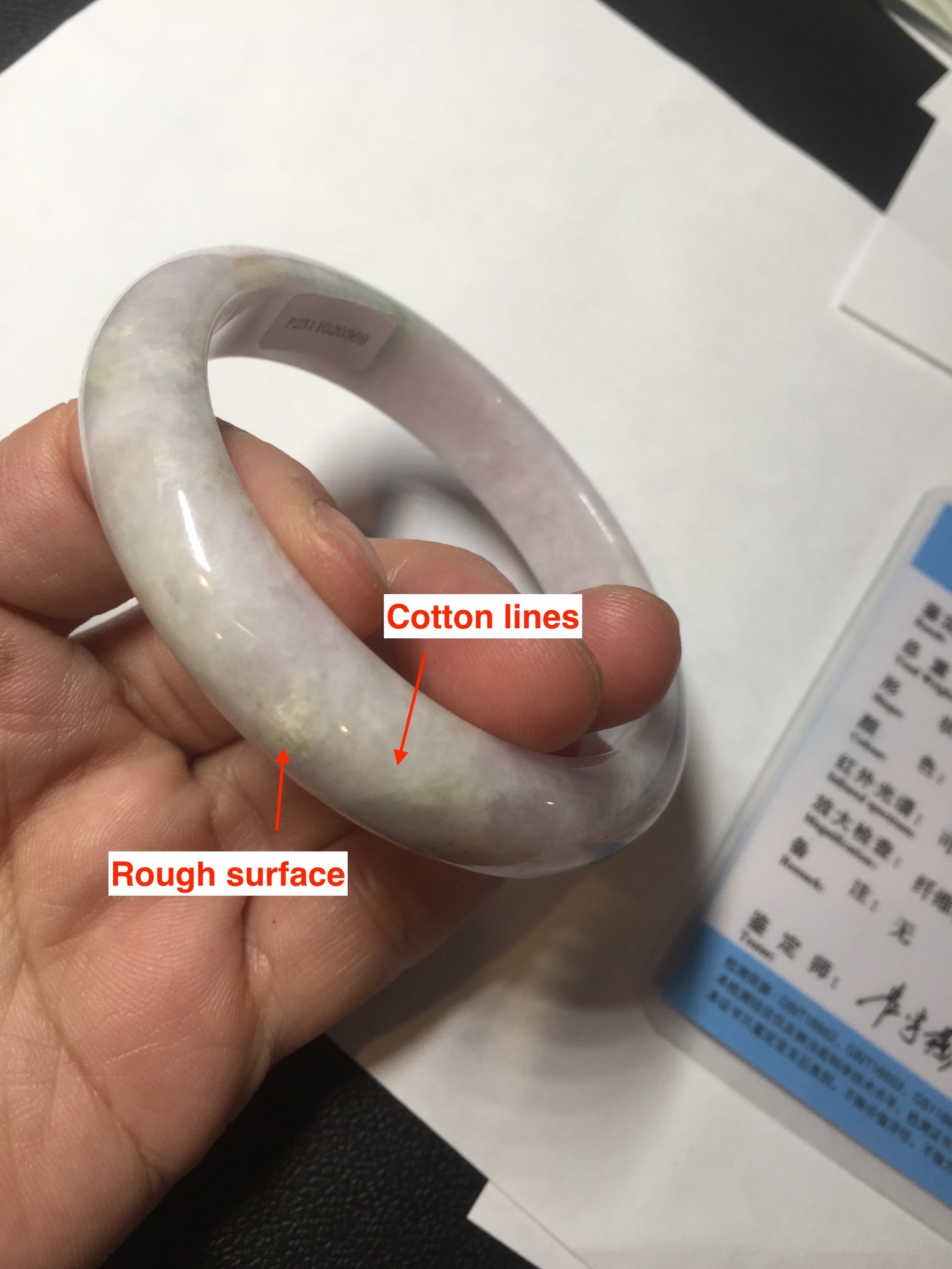 No crack. Some yellow rough surfaces with a medium amount of wax. One hairline. The texture is less fine. It has some blisters, cotton lines, spots, and areas. The green and purple colors are super light, lighter than in the photos.