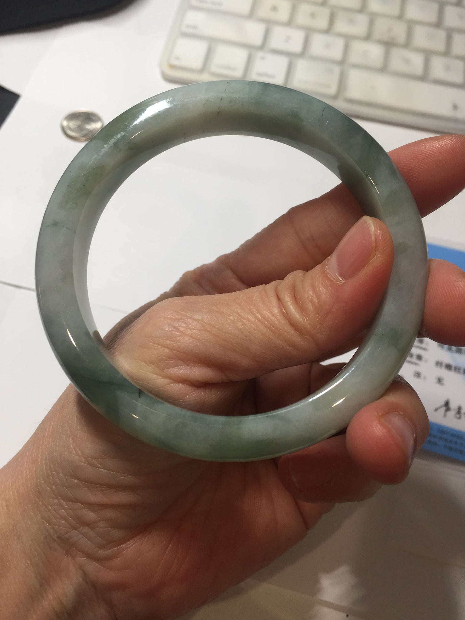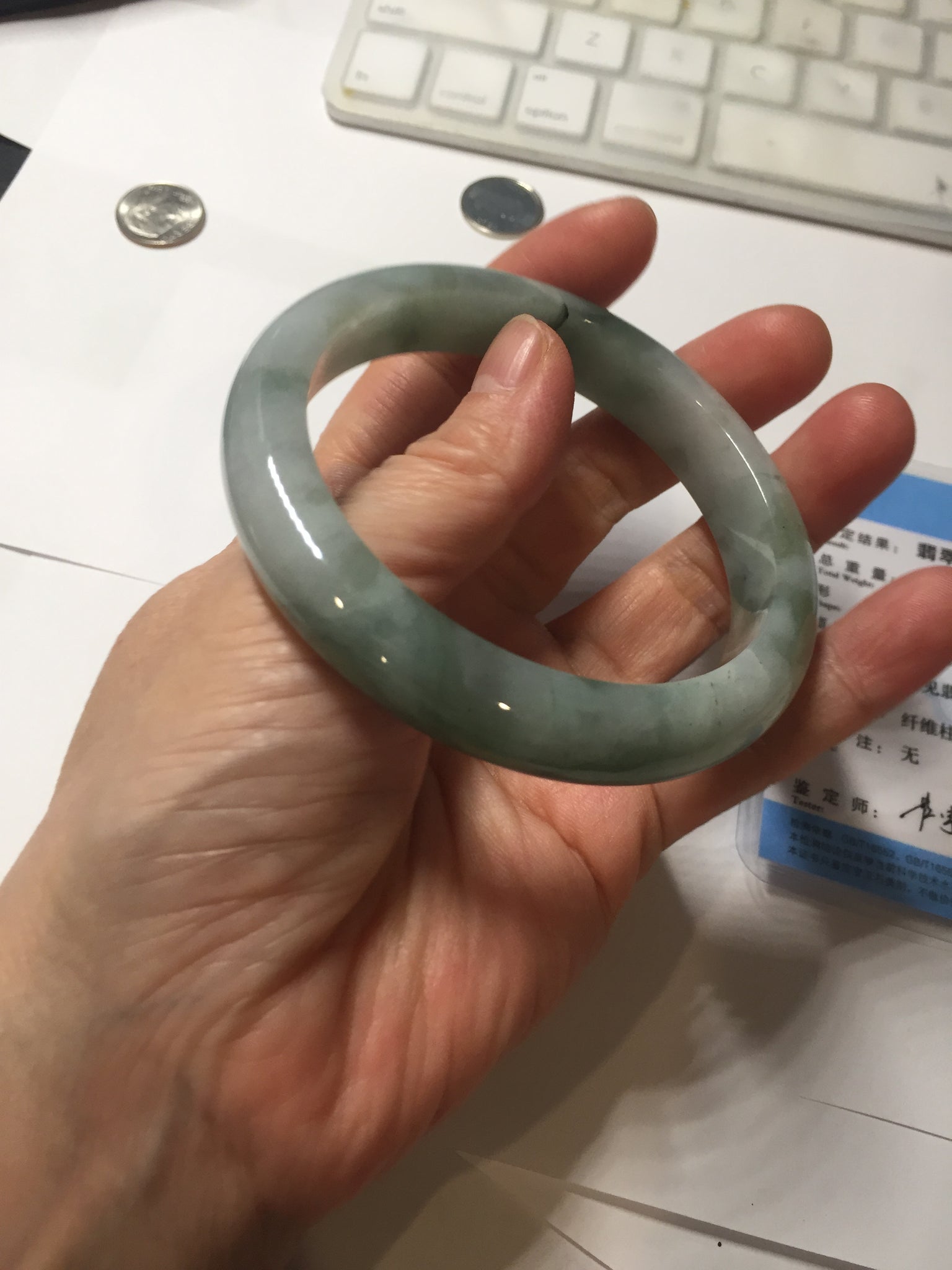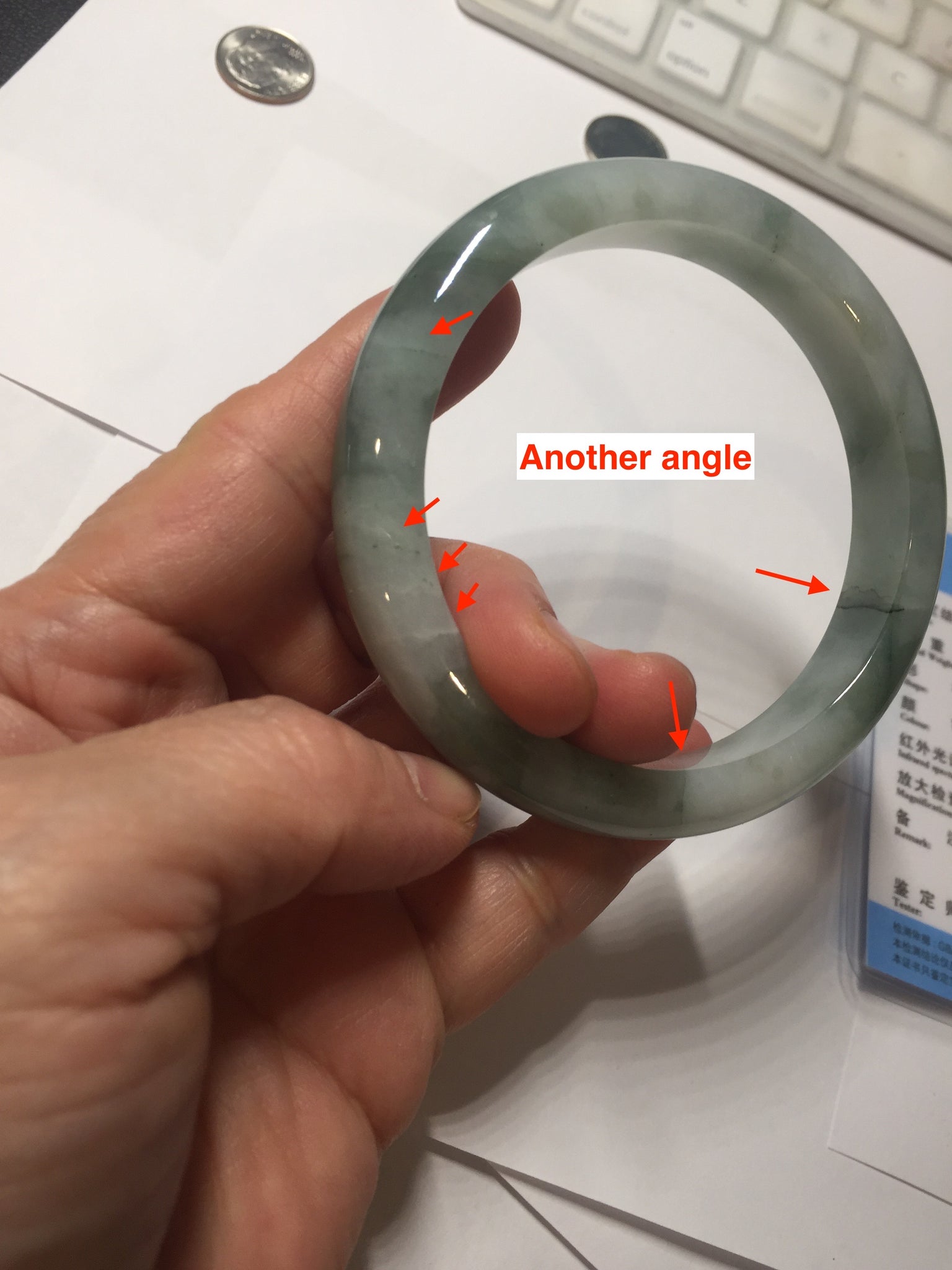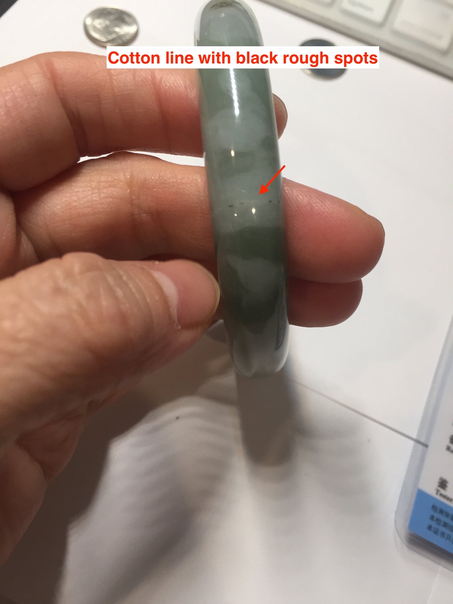One color root crack. The bangle is solid(Guaranteed). Makes high pitch sound when tapped. It connected to a cotton line with black rough spots on the other side. But this is not an around the bangle crack. Some hairlines. Some black color roots. Some black small rough surfaces. Some cotton lines, cotton areas, and cotton spots.
