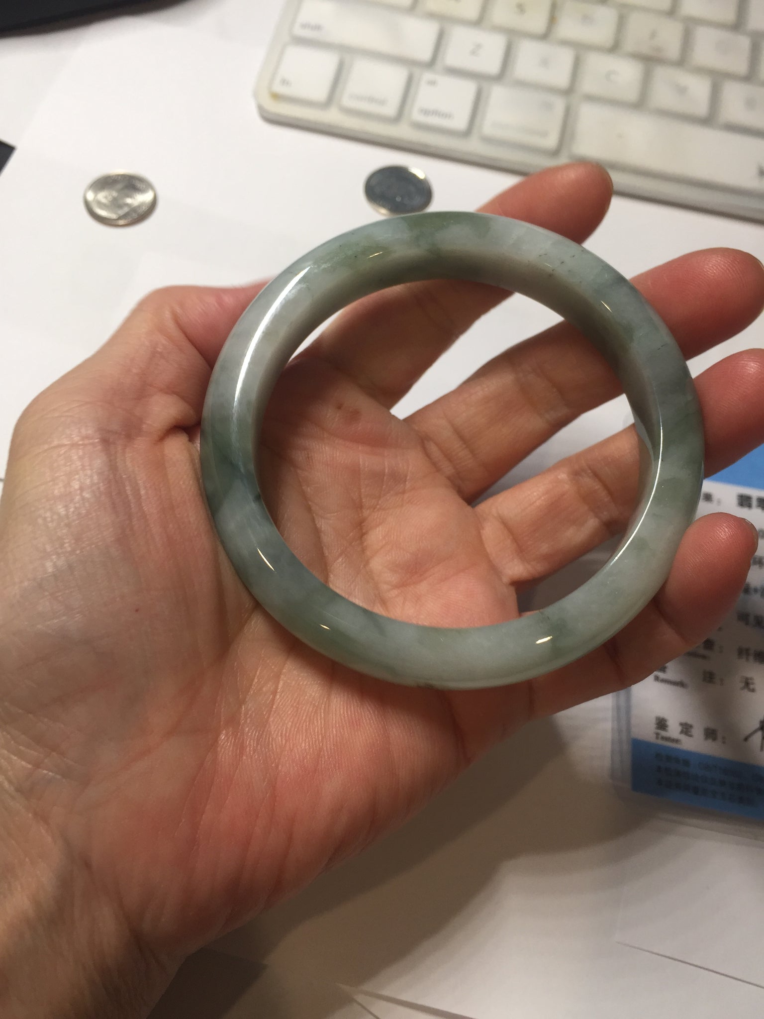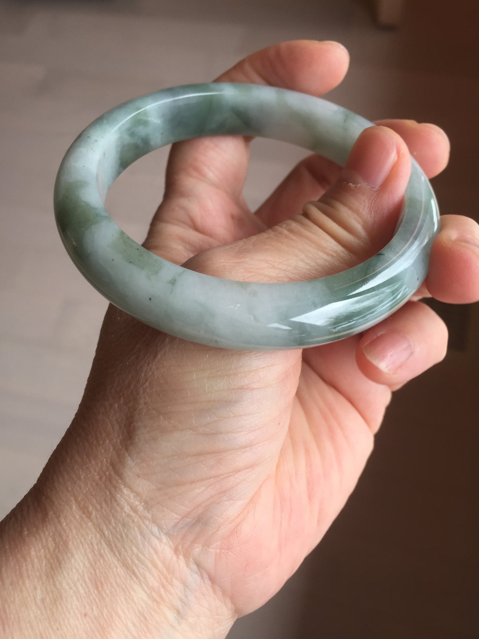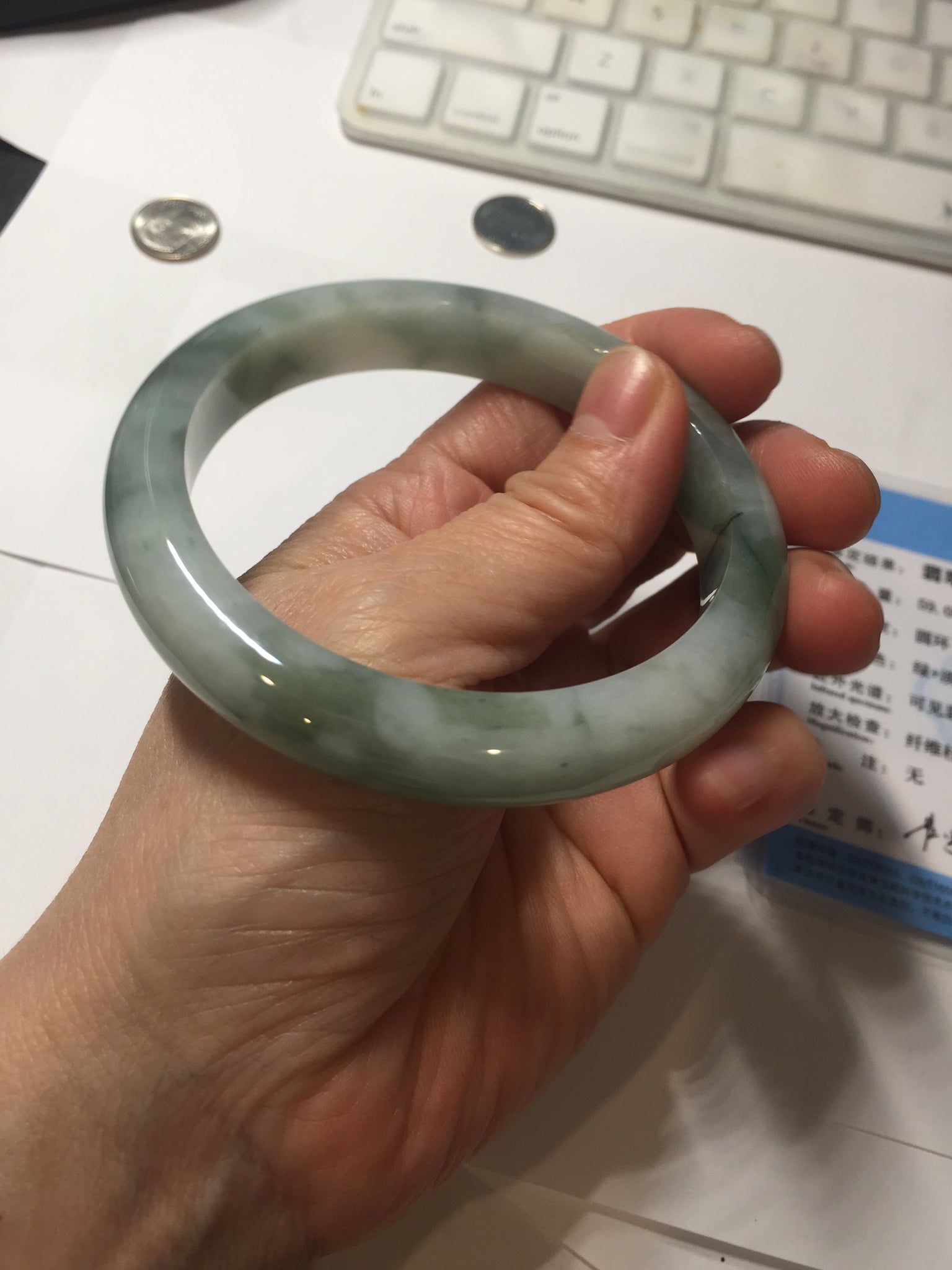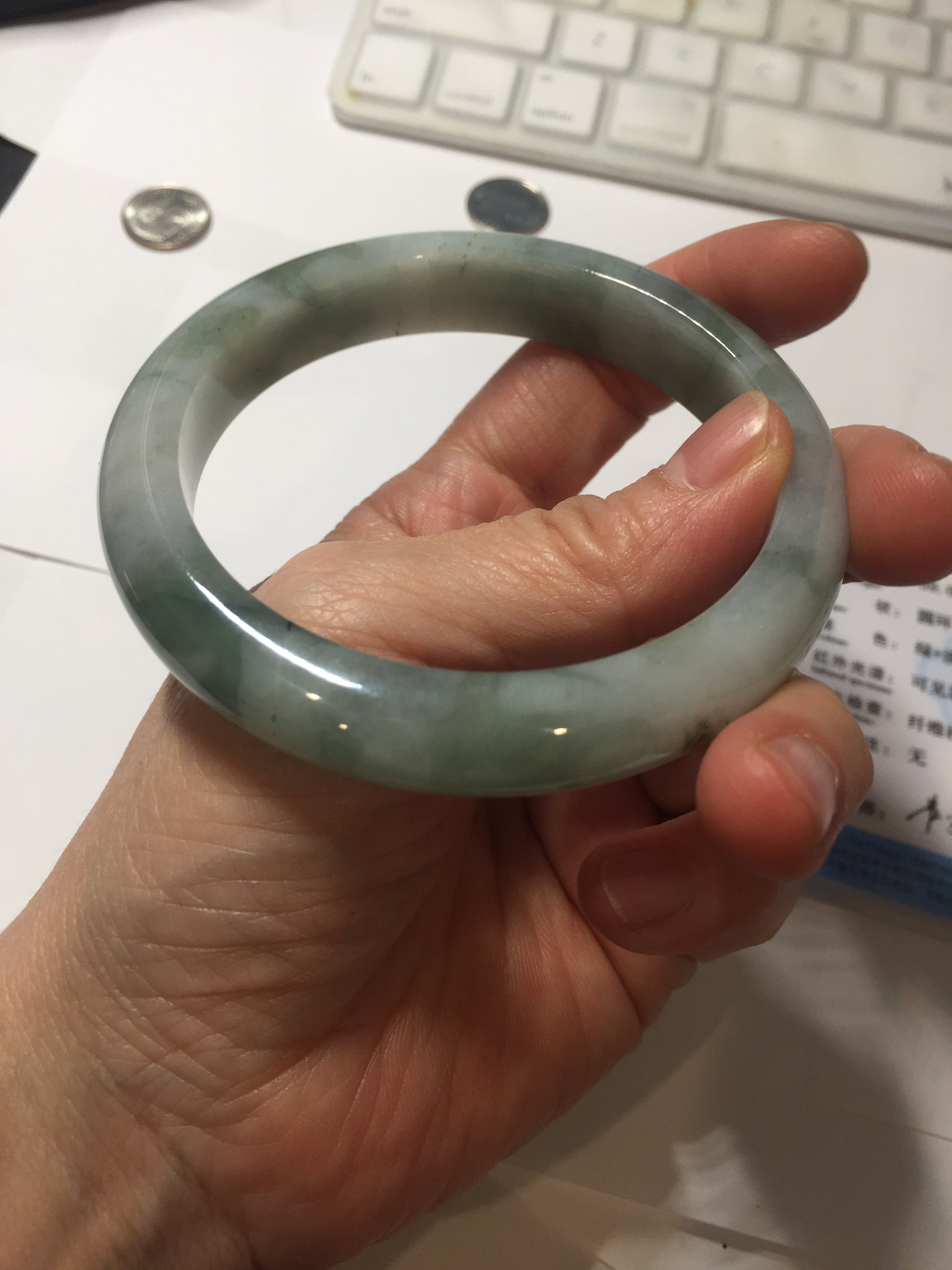 One color root crack. The bangle is solid(Guaranteed). Makes high pitch sound when tapped. It connected to a cotton line with black rough spots on the other side. But this is not an around the bangle crack. Some hairlines. Some black color roots. Some black small rough surfaces. Some cotton lines, cotton areas, and cotton spots.