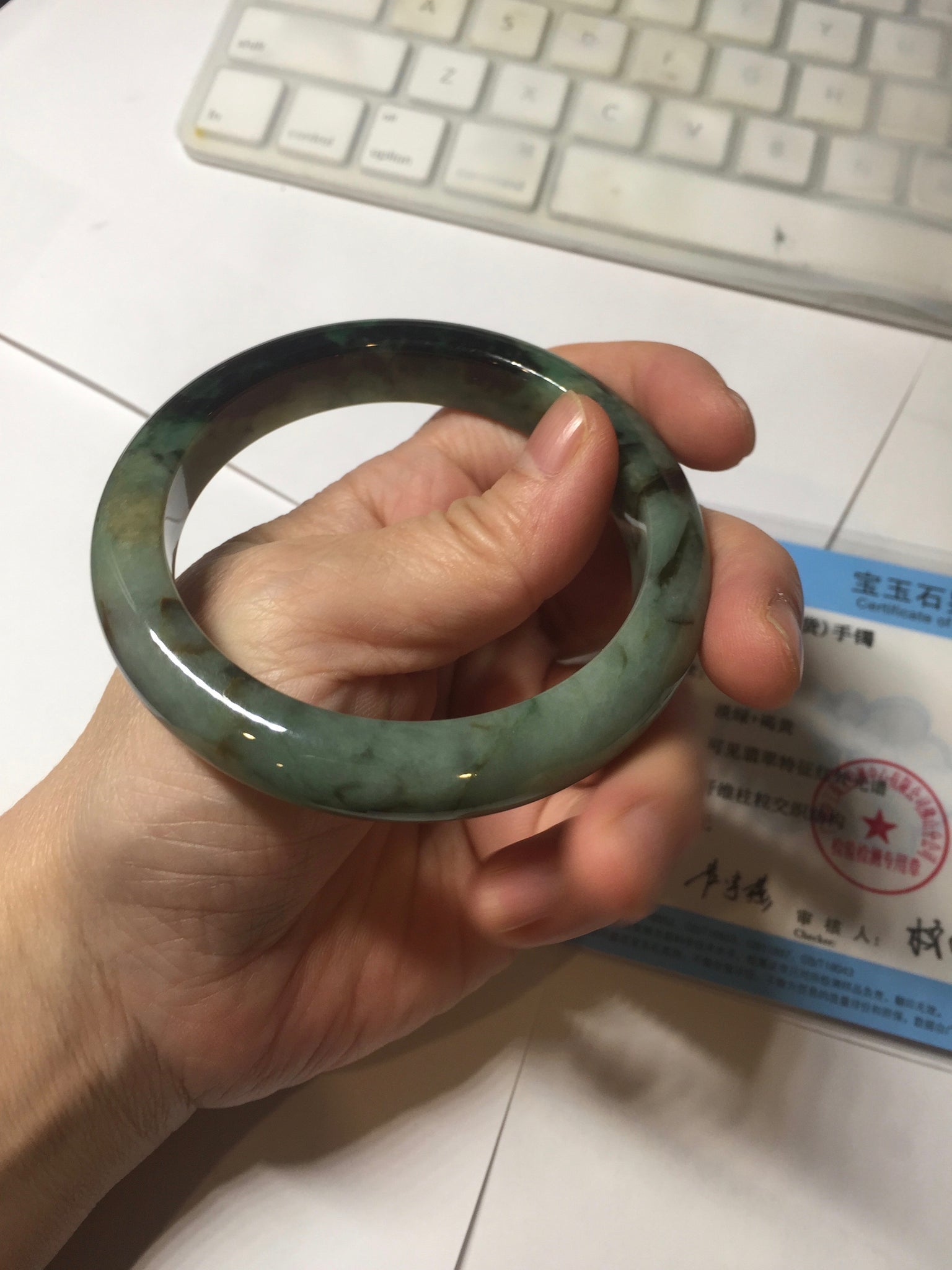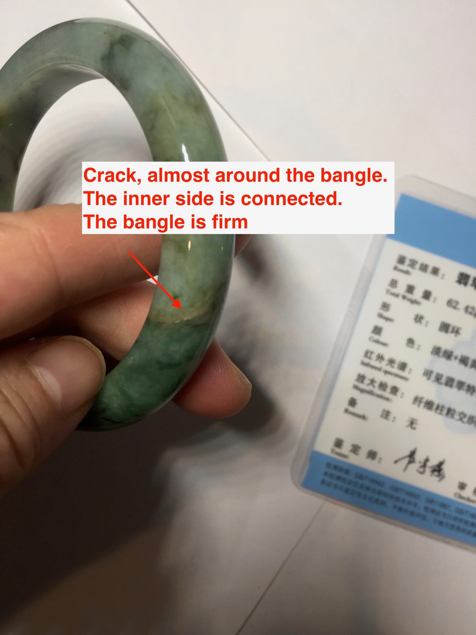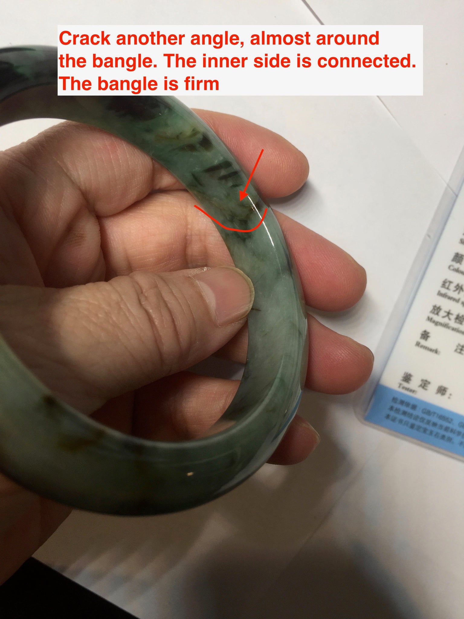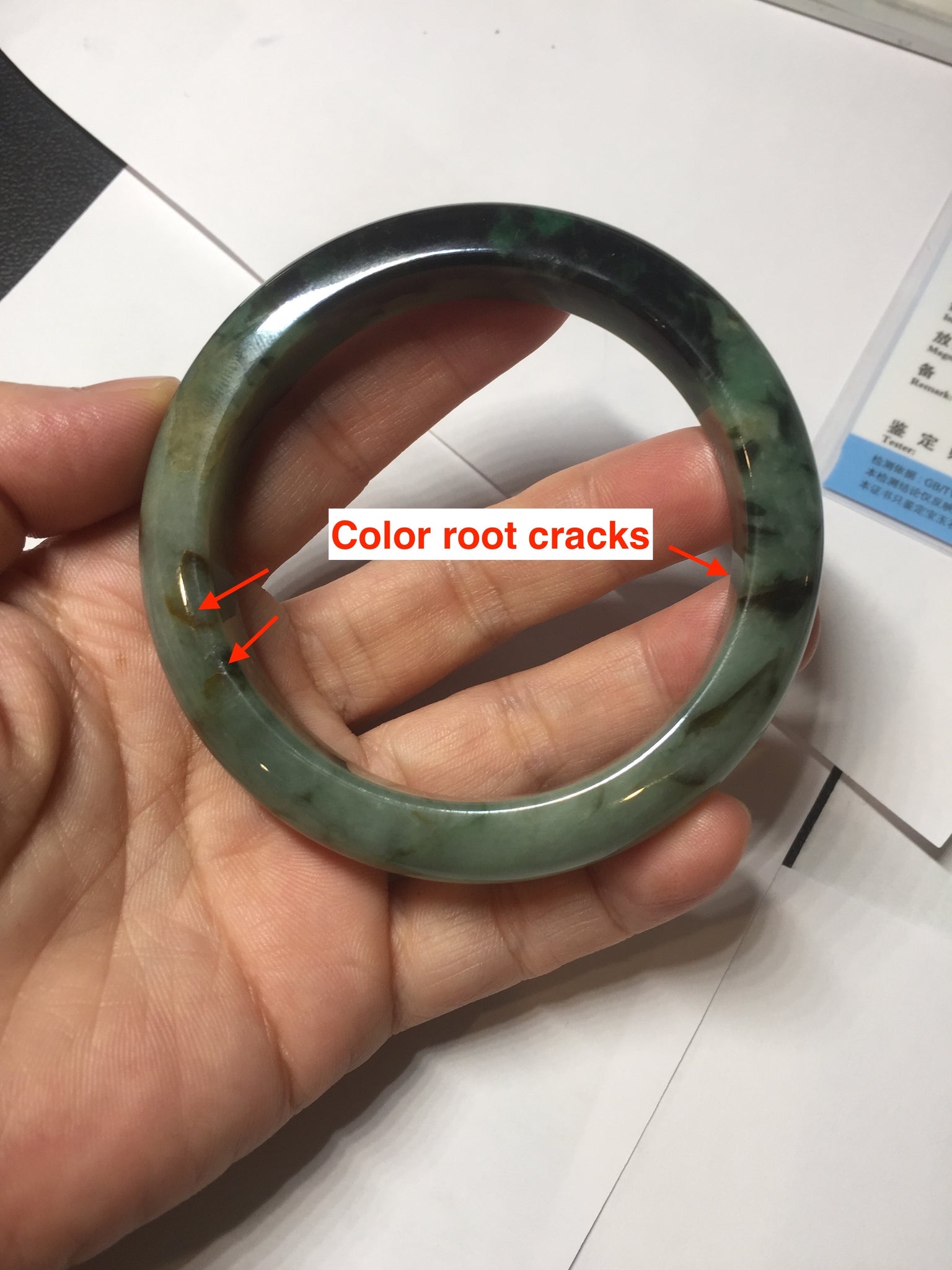 Some cracks or color root cracks. One almost around the bangle crack. The bangle’s internal structure remains continuous. The bangle is solid(Guaranteed). Some small brown rough surfaces. Some brown color roots. Some cotton spots and lines. Not transparent. Has some black/gray color.
