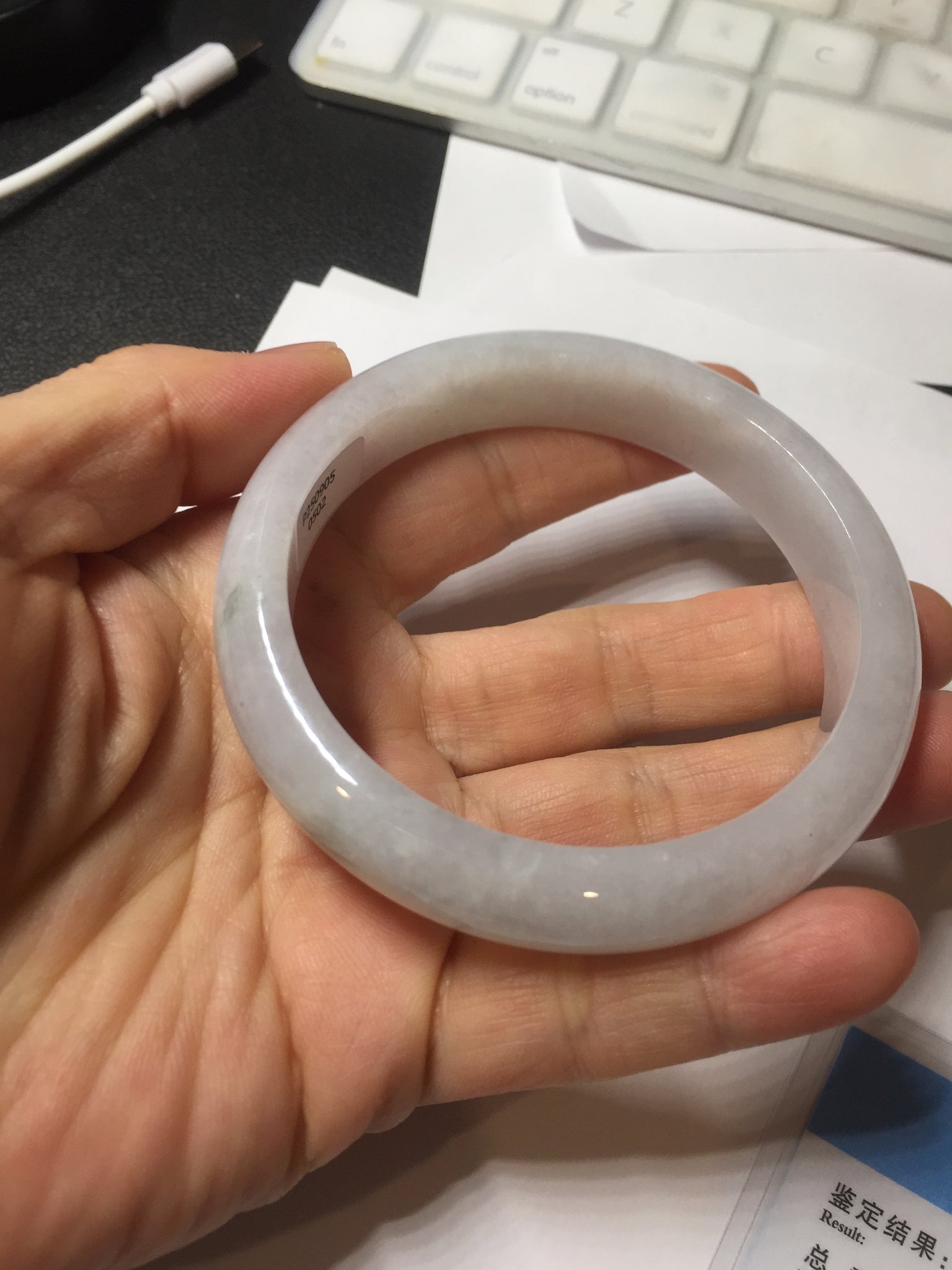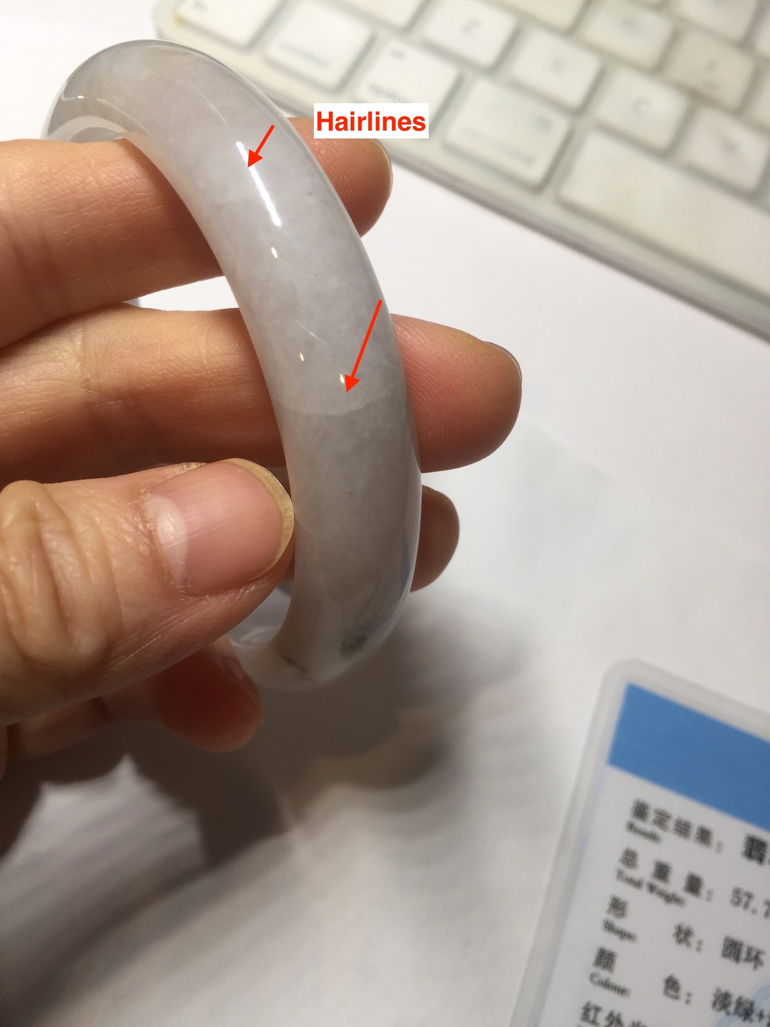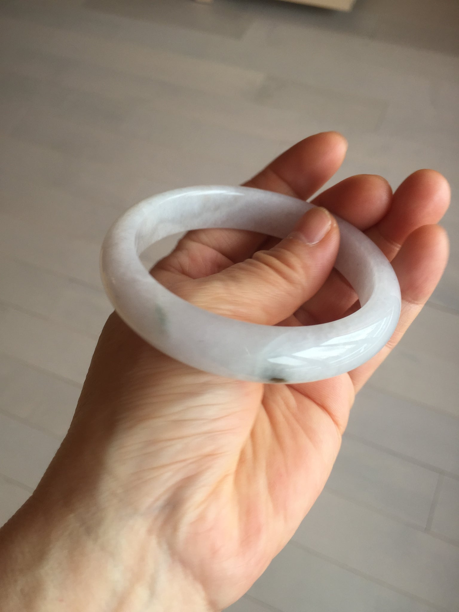 Imperfections: Two surface cracks. Some hairlines. The bangle is solid(Guaranteed!). Makes high pitch sound when tapped. Some cotton lines, cotton spots and cotton areas. The purple is super light. Just a hint of it. Way lighter than in the photos due to the purple color always more camera friendly.