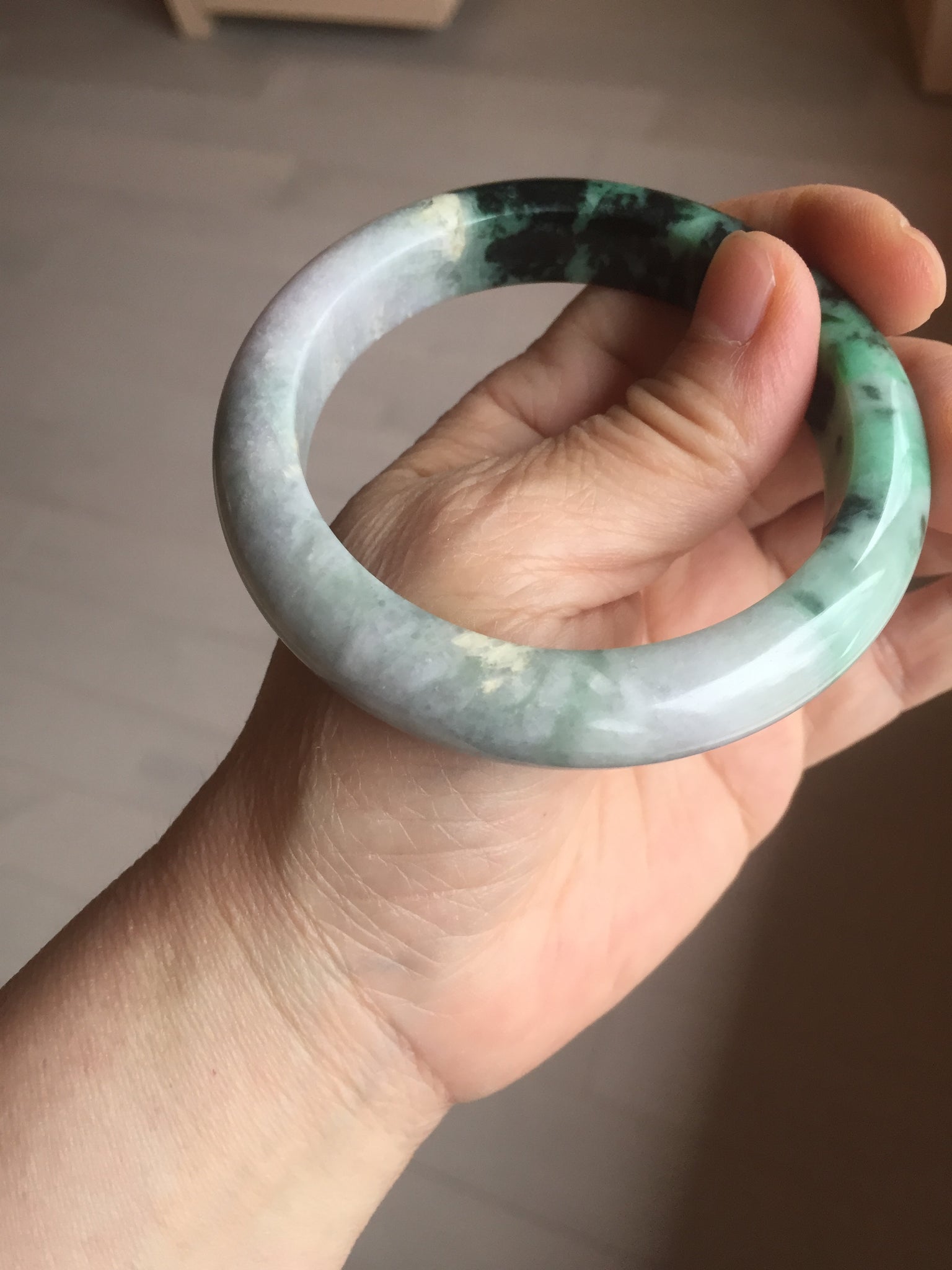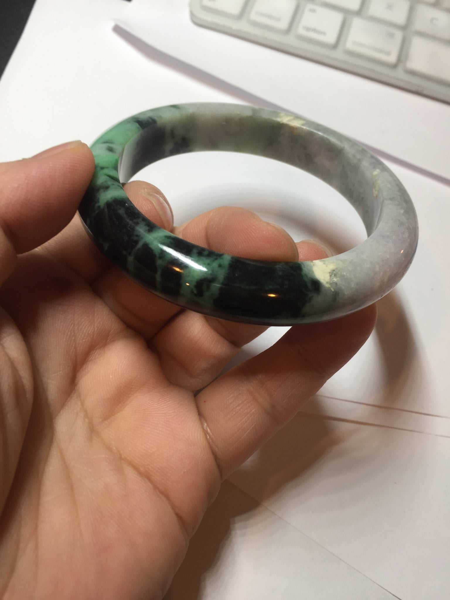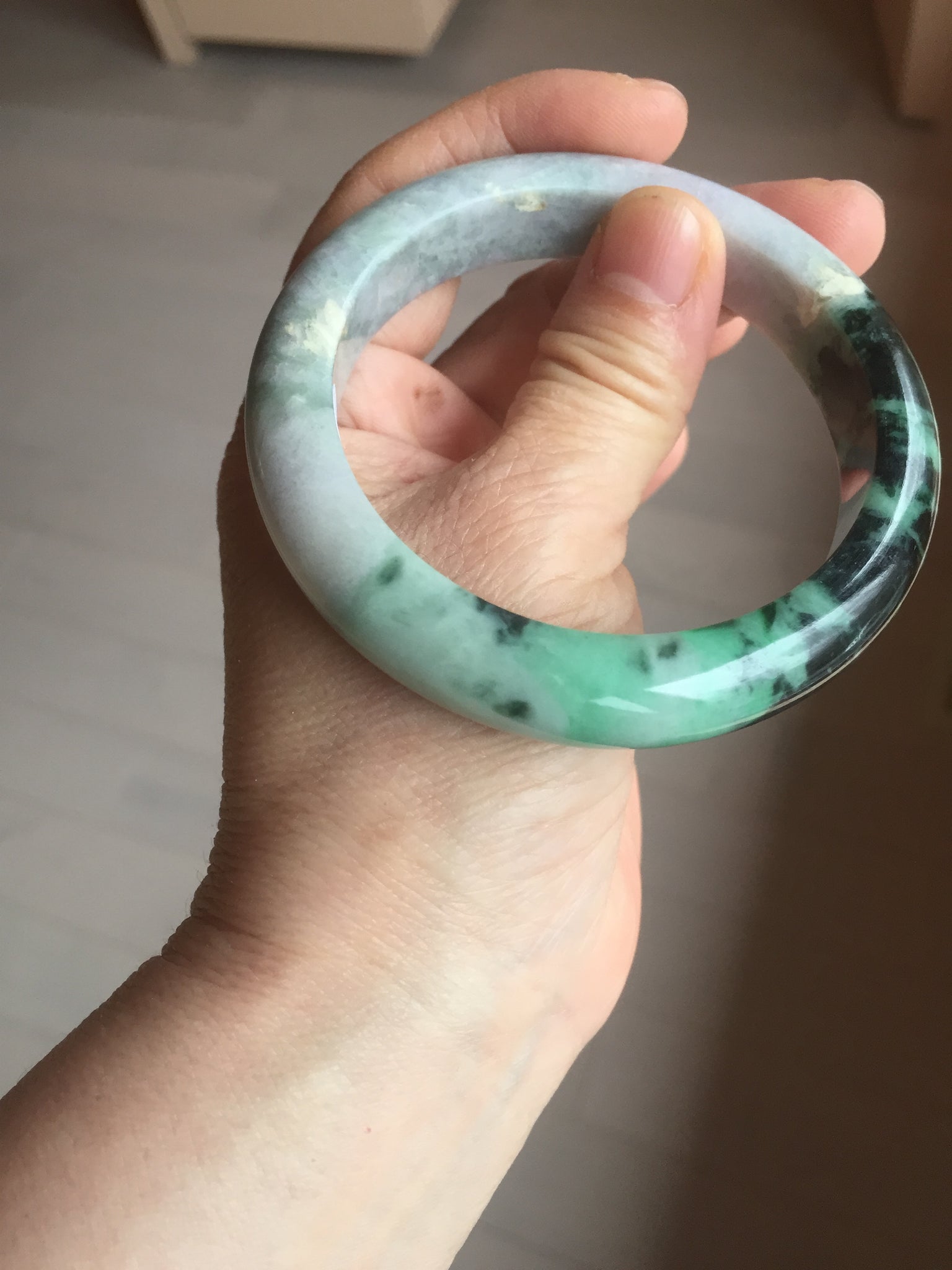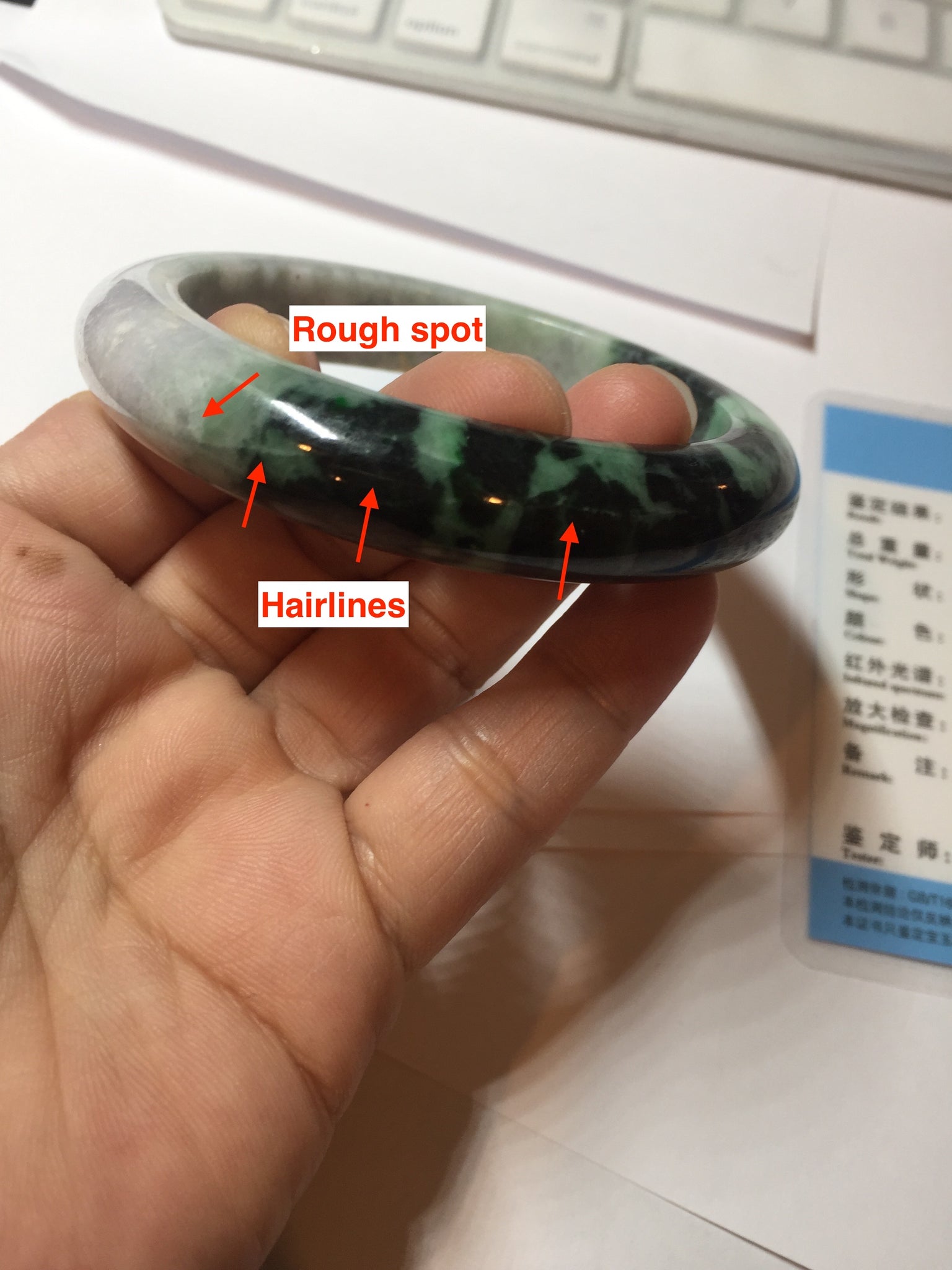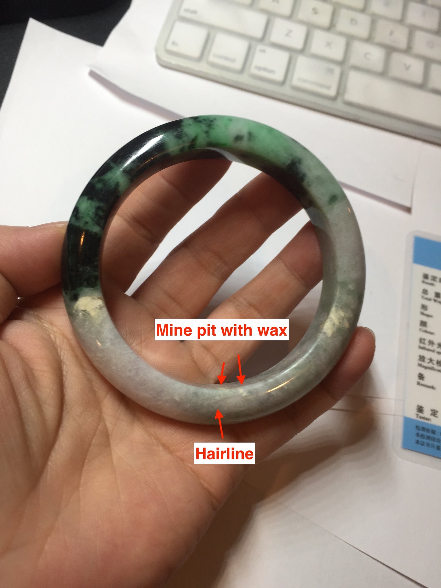 Some rough surfaces, notches with wax, surface fissures, and mine pits. Photos may not show all of them. They are not so obviously when wearing. Some hairlines. Some cotton spots and cotton lines. The bangle is solid(Guaranteed!).