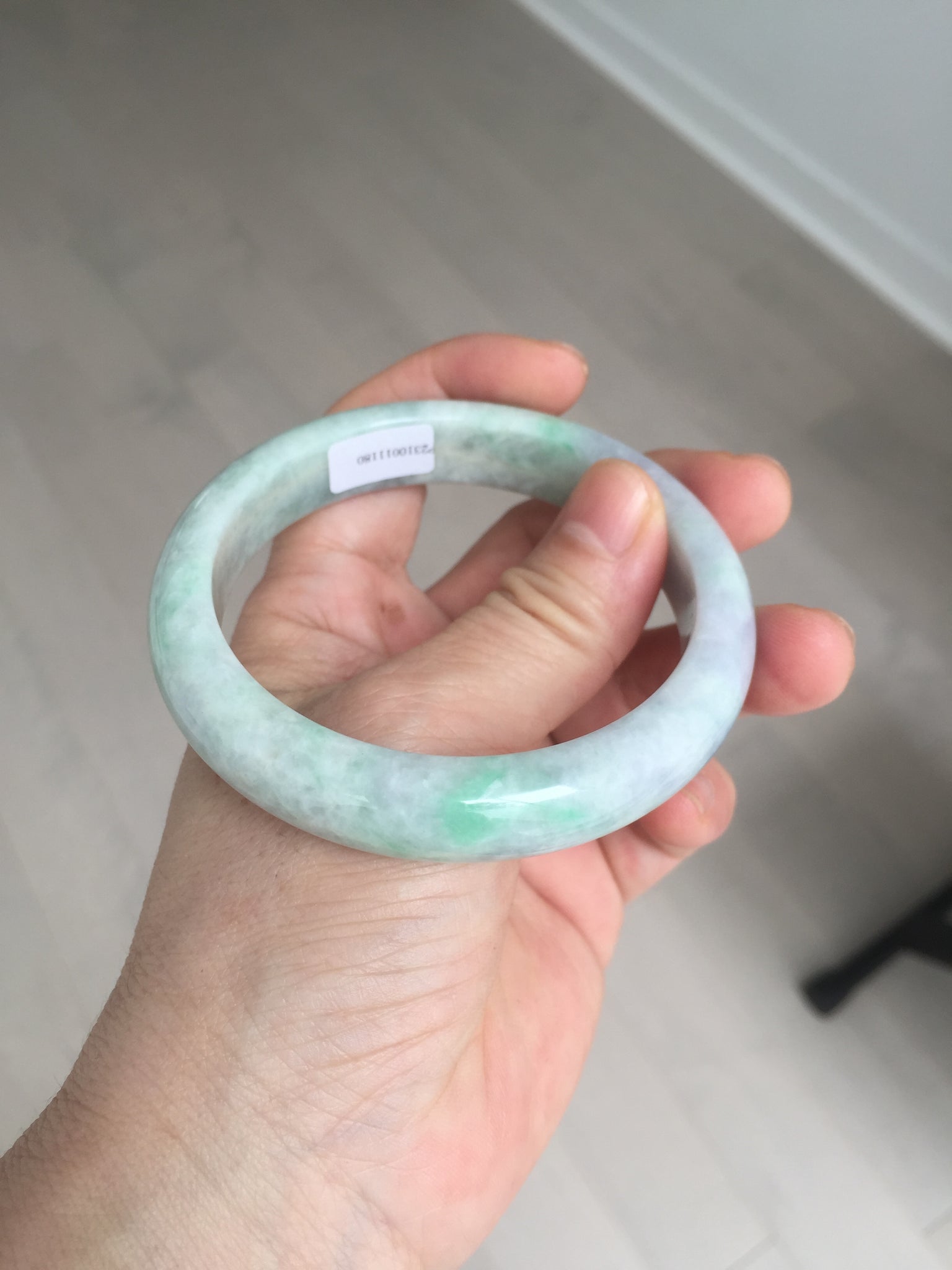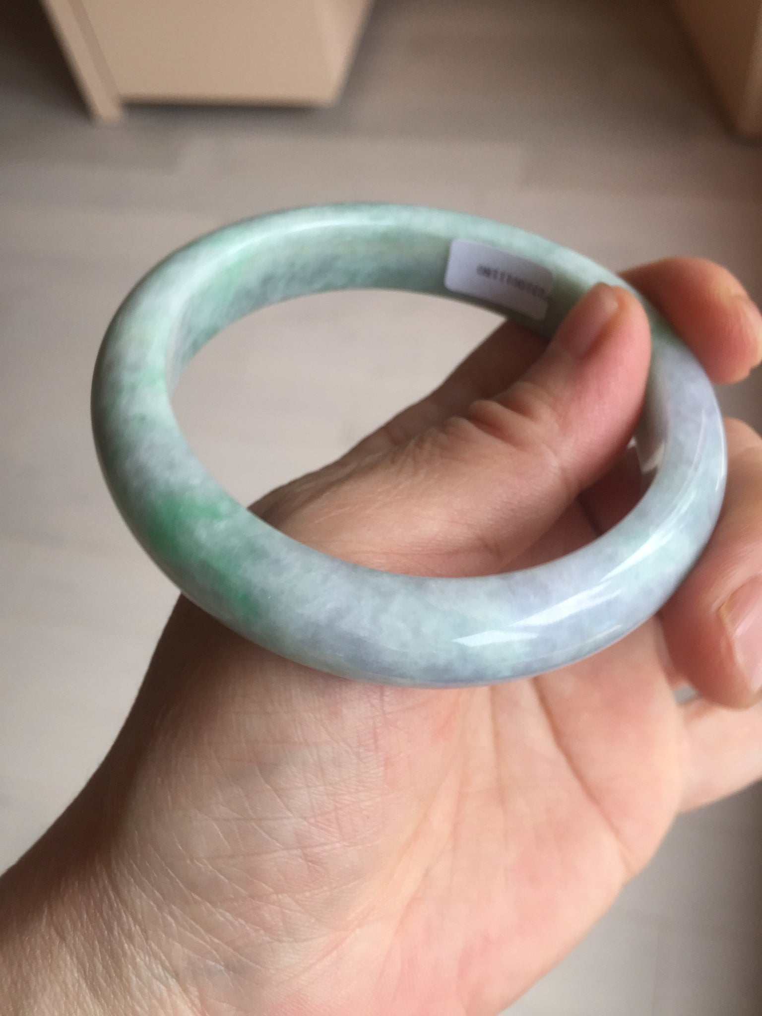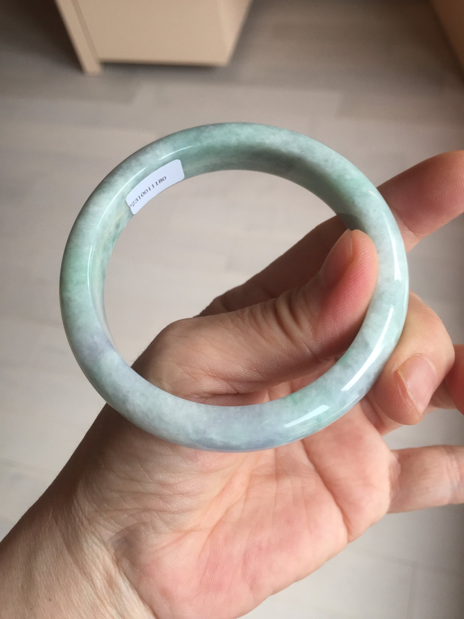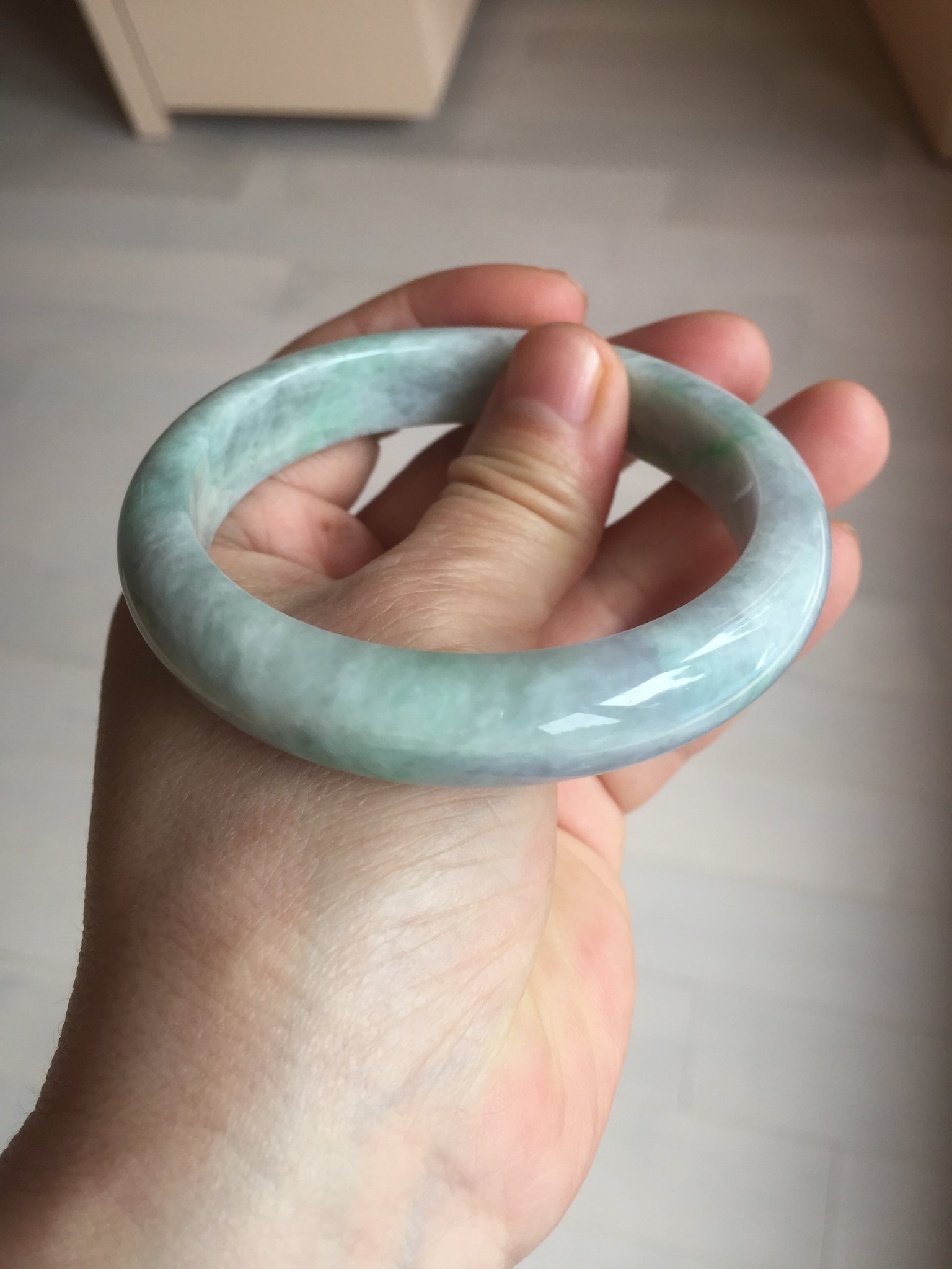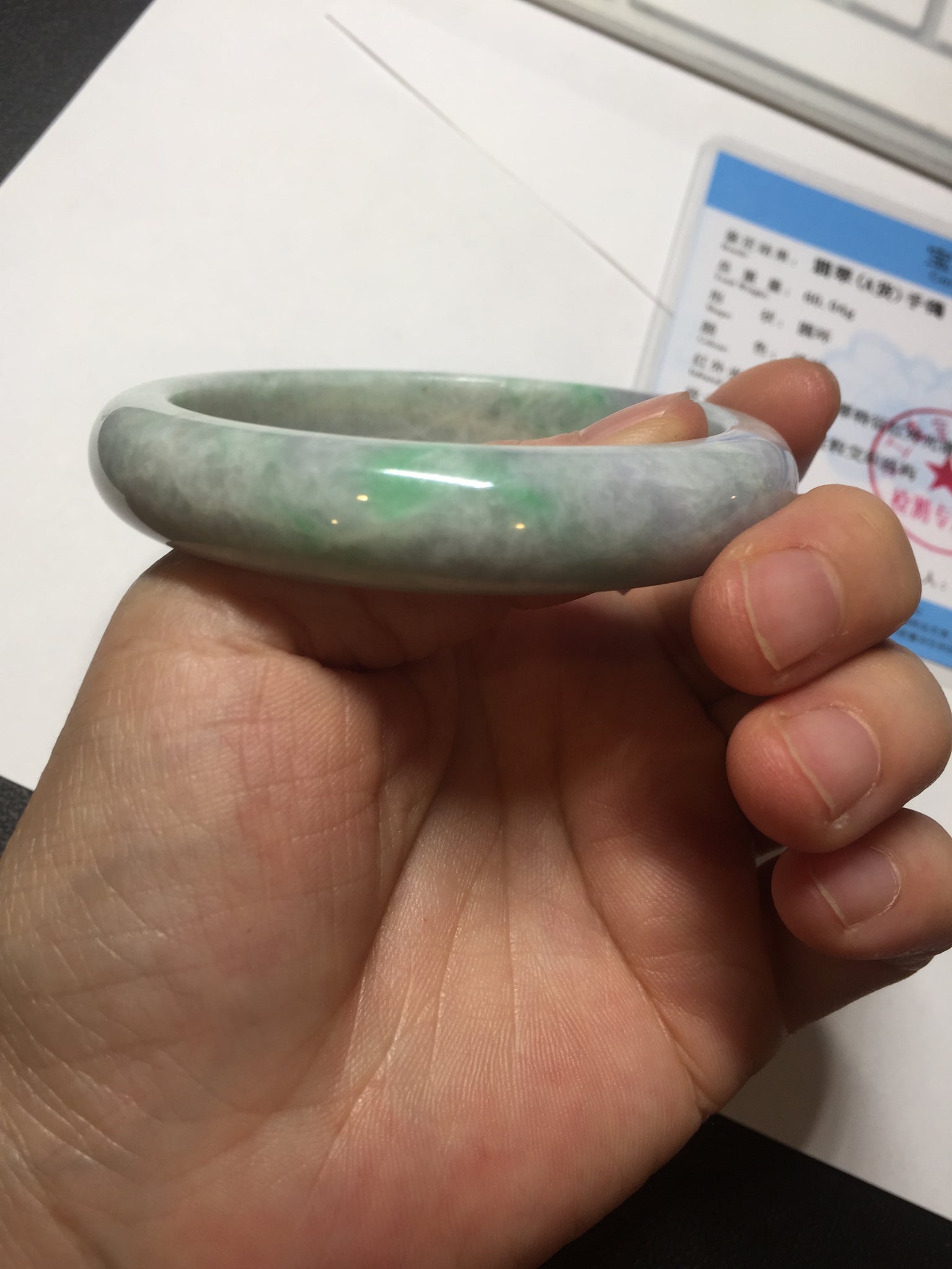 One lone ring-shaped crack. The bangle is solid. The texture is not delicate. Has some hairlines, cotton lines, or structure lines. Quite a lot of cotton spots and areas. Not transparent or watery. The purple is lighter than in the photos due to the purple color always being more camera-friendly.