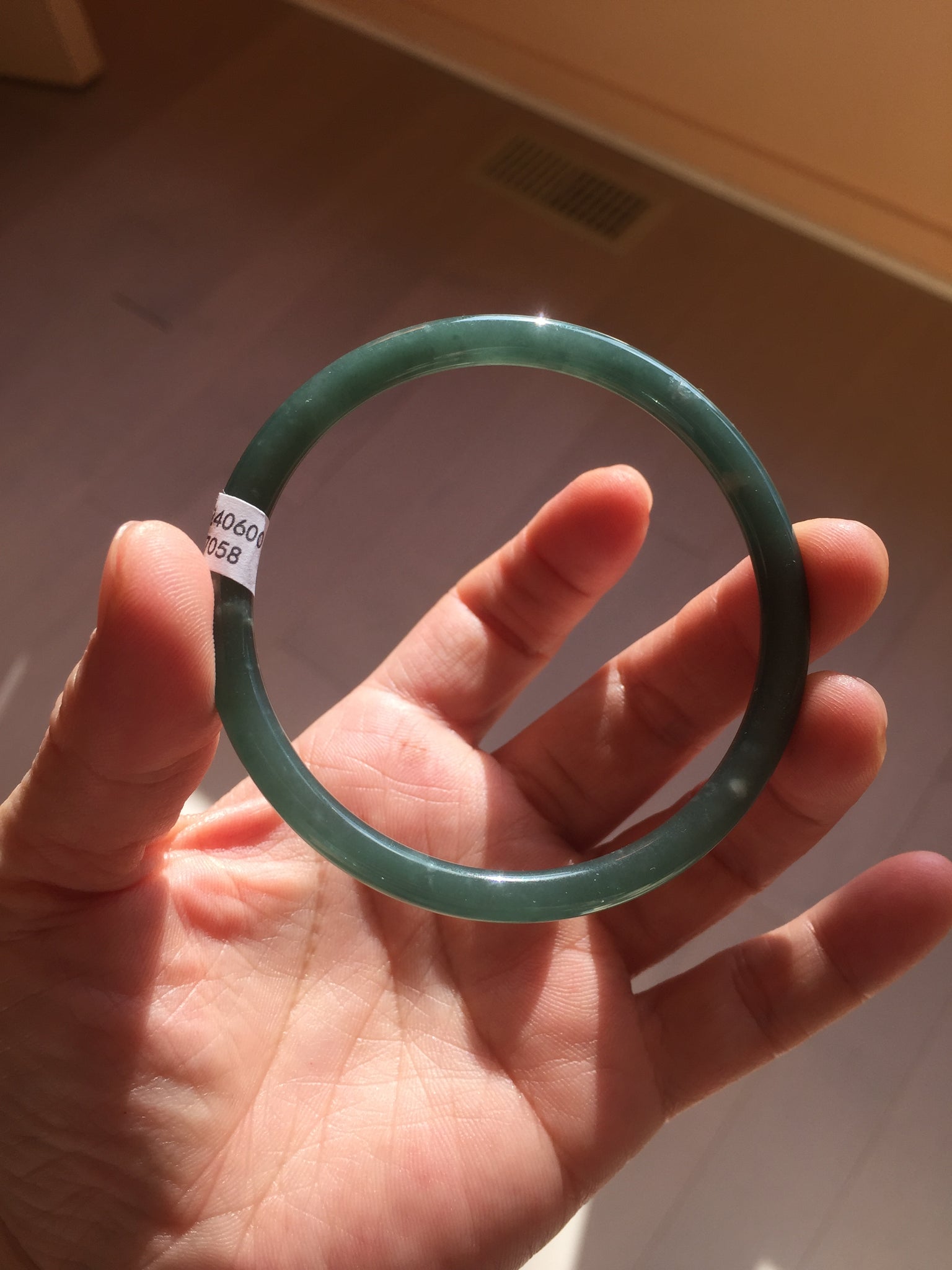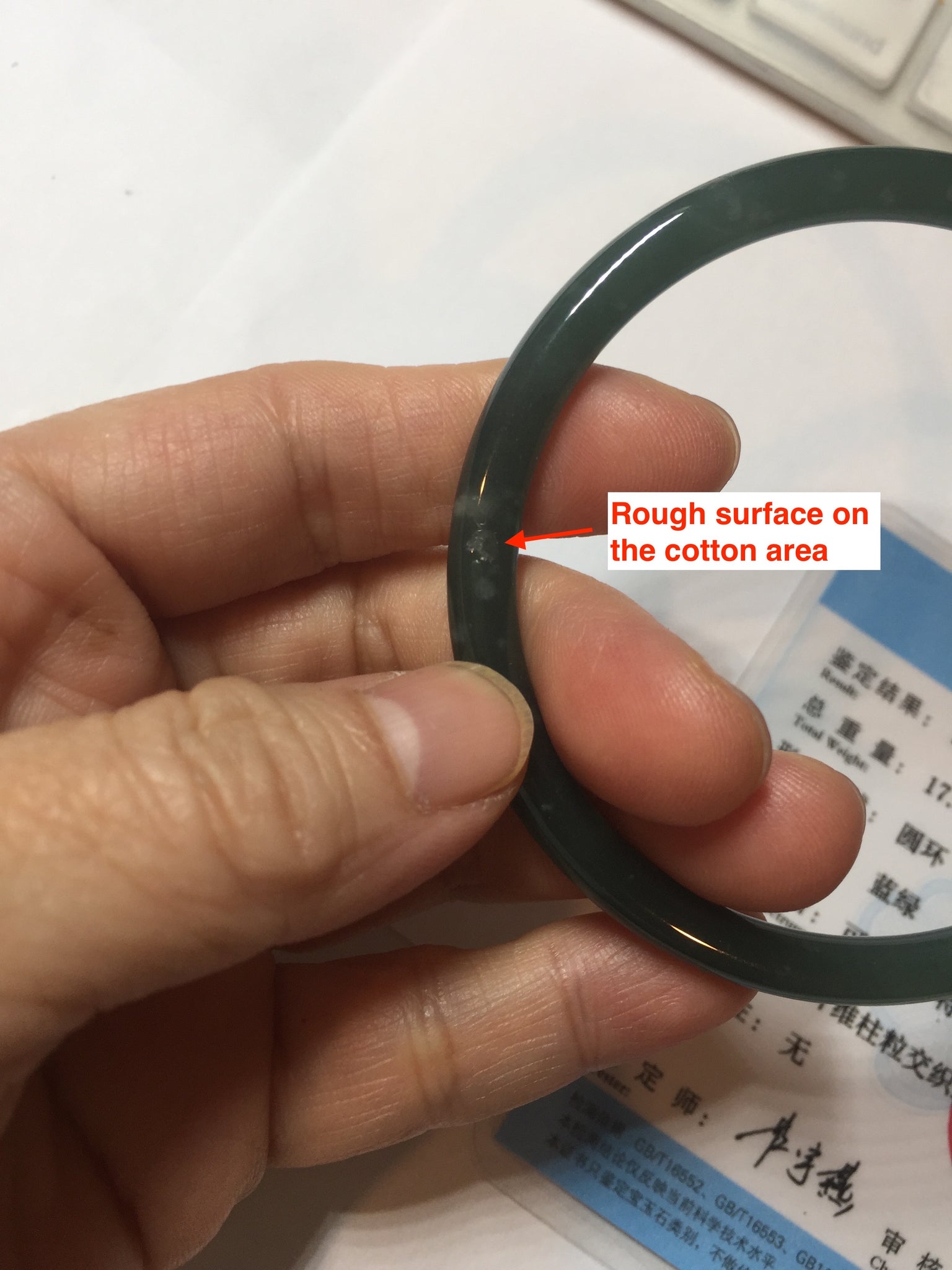 Some rough surface or tiny fissures on the cotton areas due to the mineral difference. Some cotton lines and cotton areas. Not transparent. The bangle has some gray/ black color.