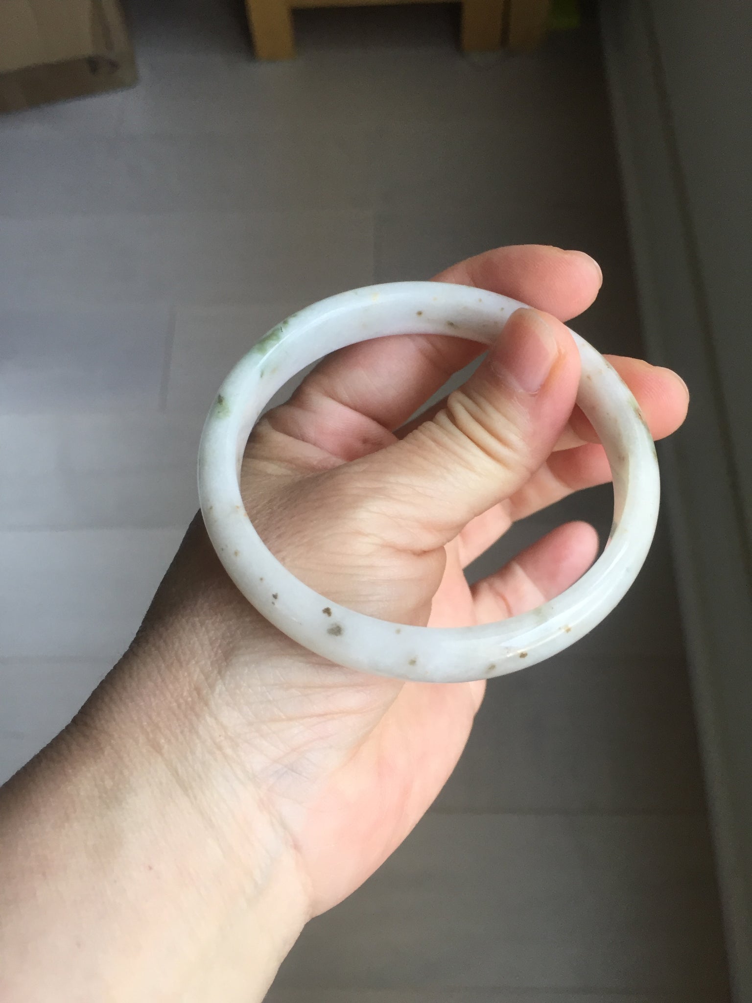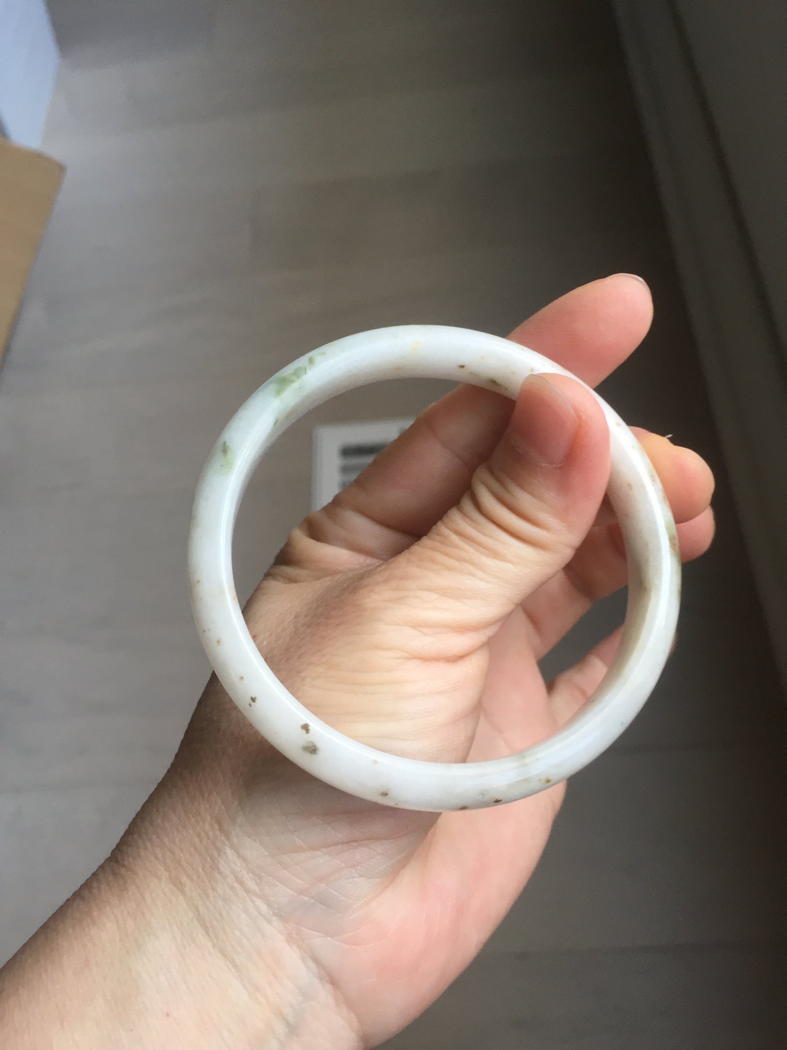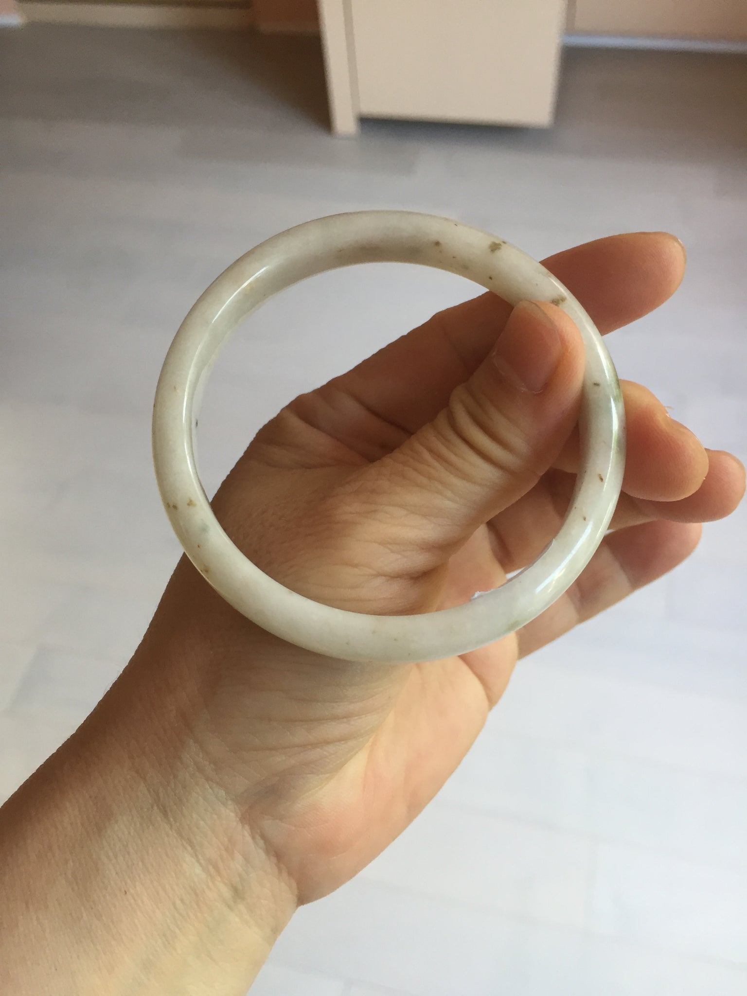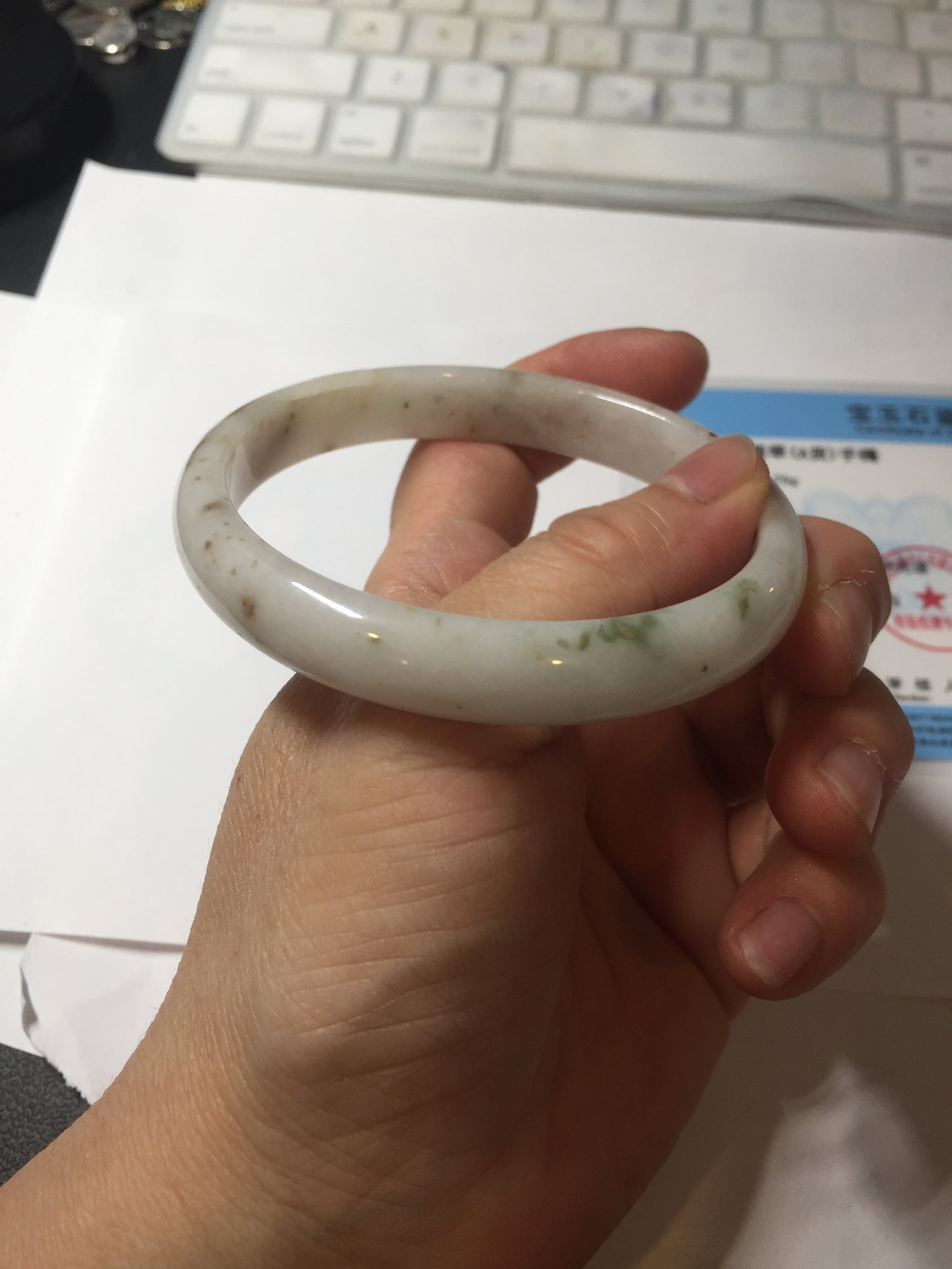 Imperfections: One U shape crack. Some small brown rough surfaces. Some cotton lines, areas, and cotton spots. Not transparent.
