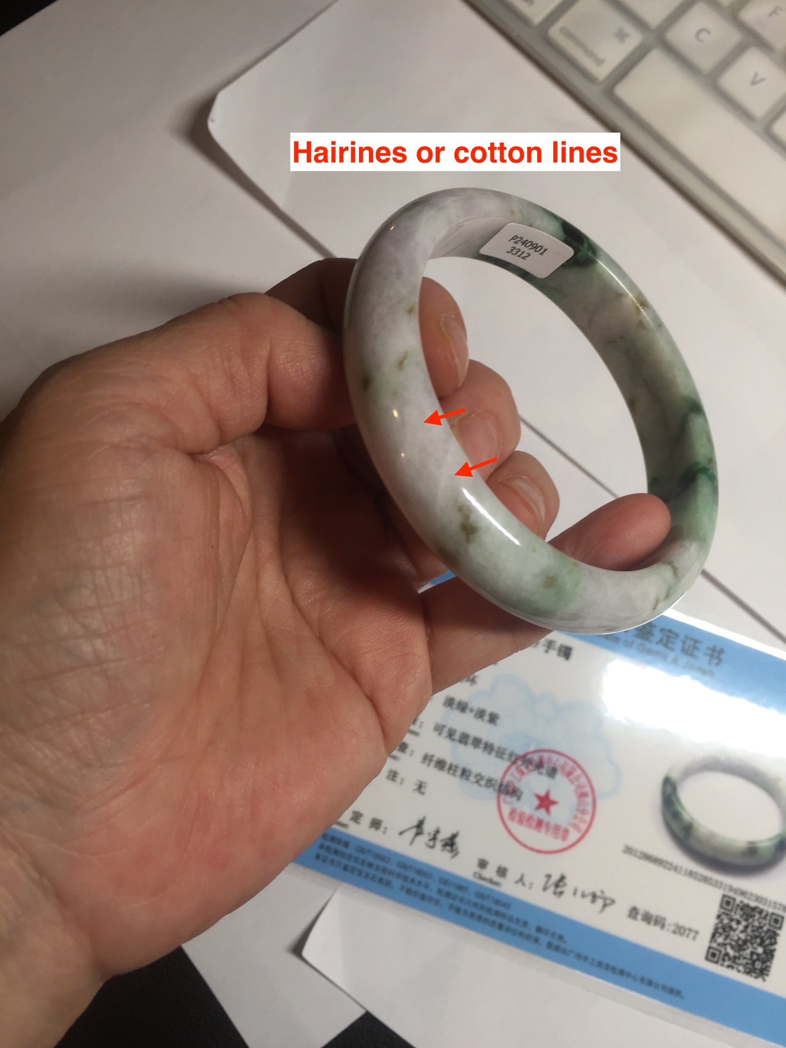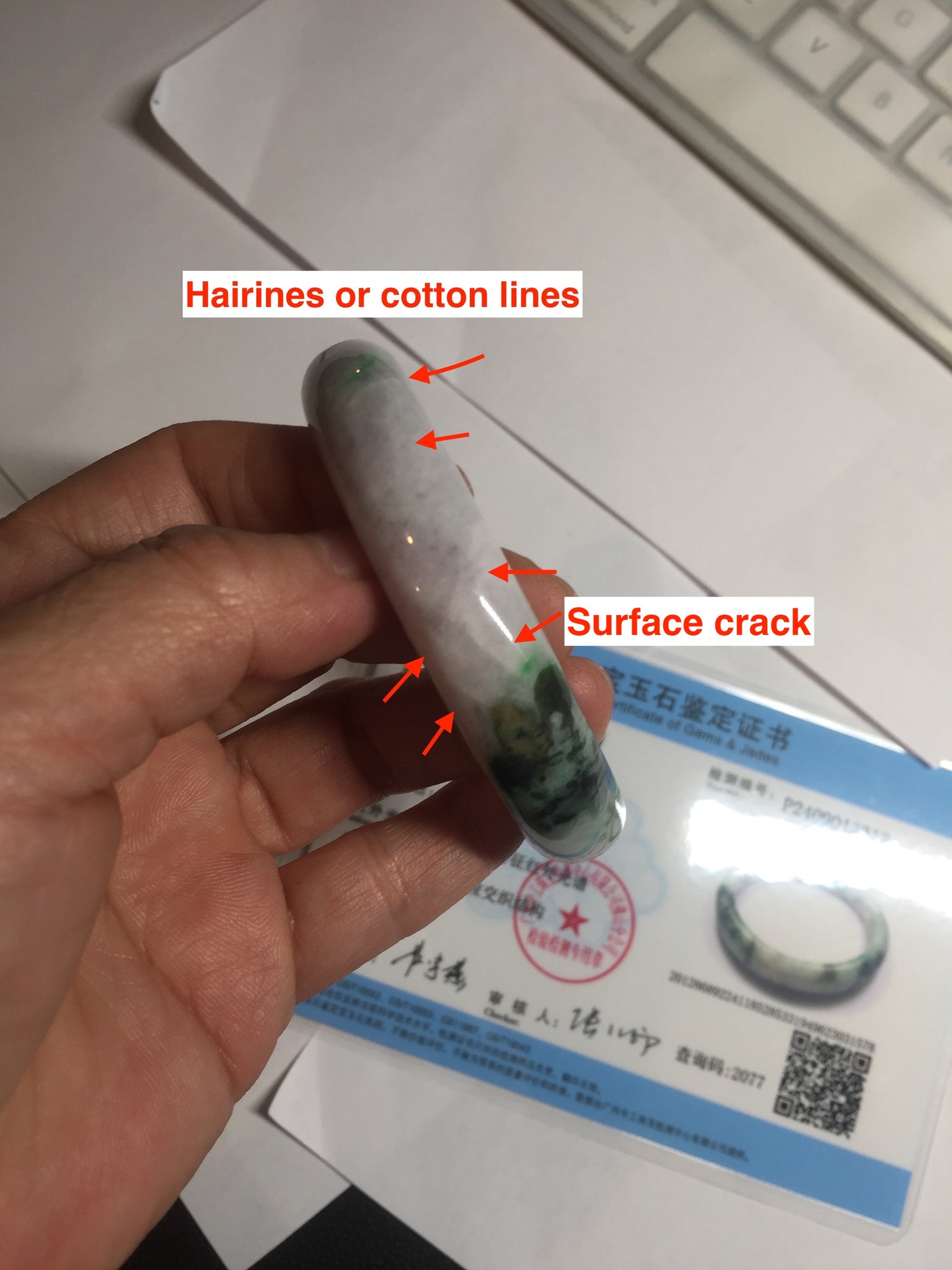 Jade root, or hairline root, and are not considered cracks. A crack is considered to be a crack you can feel that runs up and down the width of the bangle.