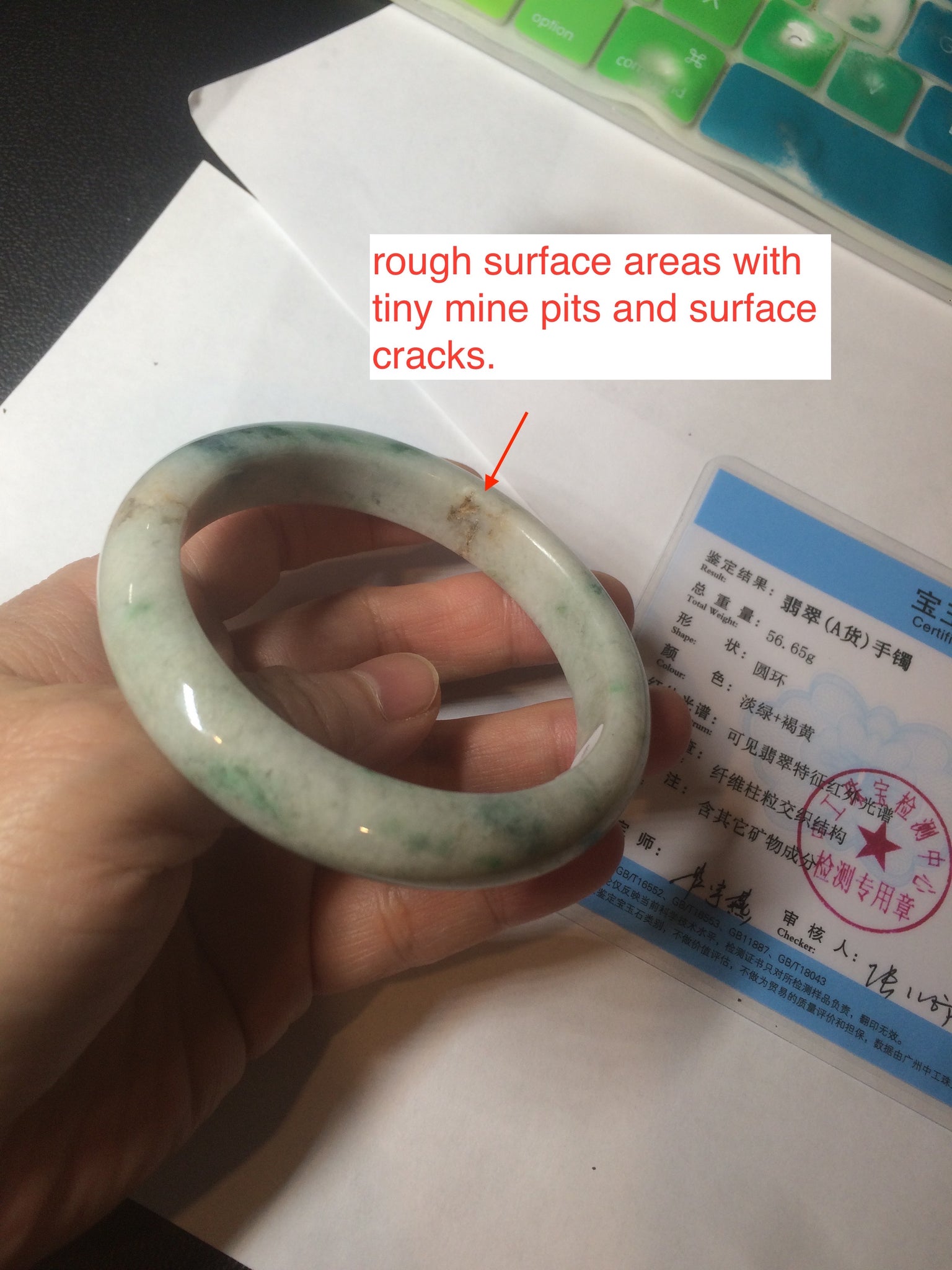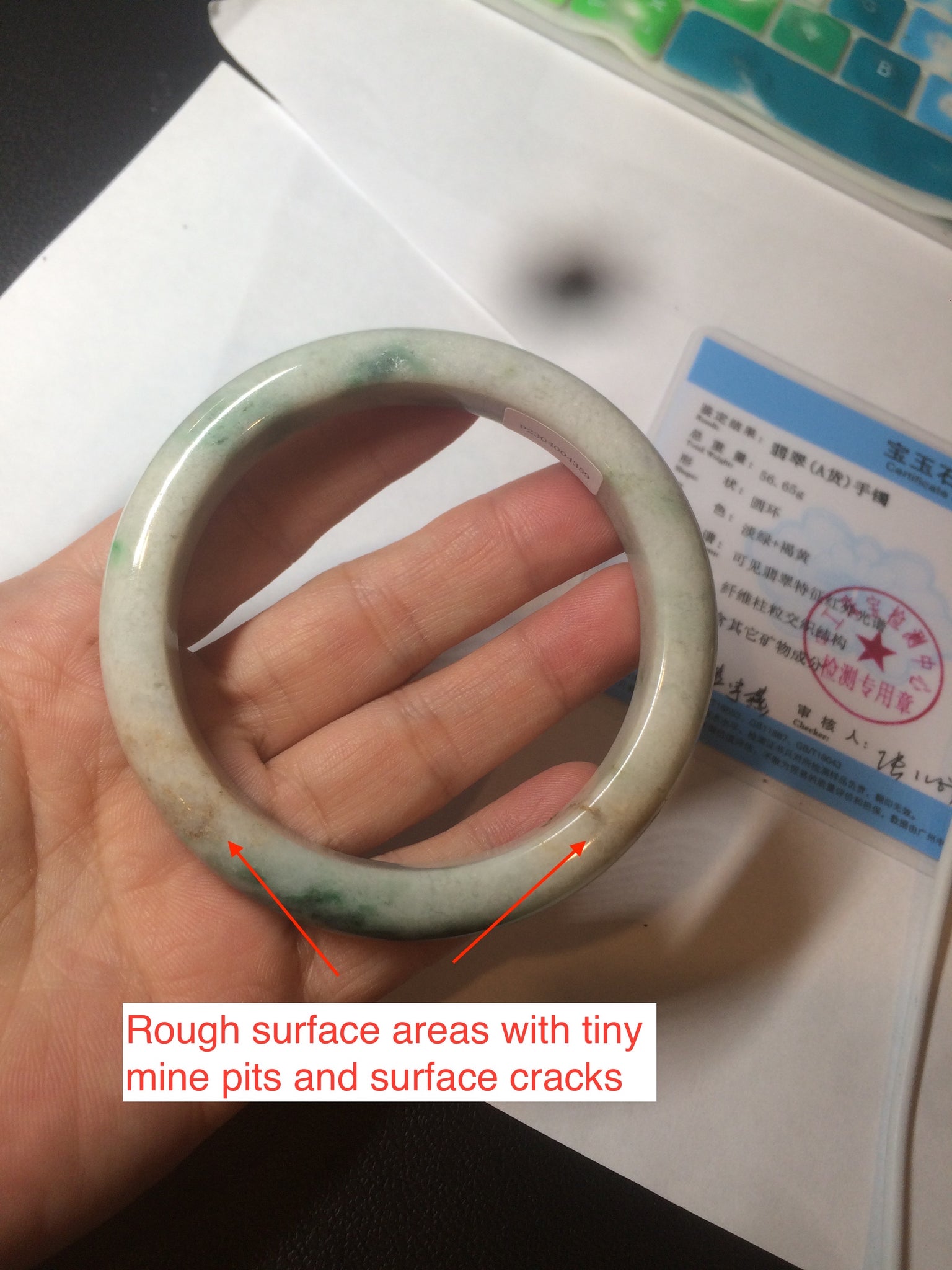 Some brown rough surface areas with tiny mine pits and surface cracks. Cotton spots and areas. Not transparent. Not watery.