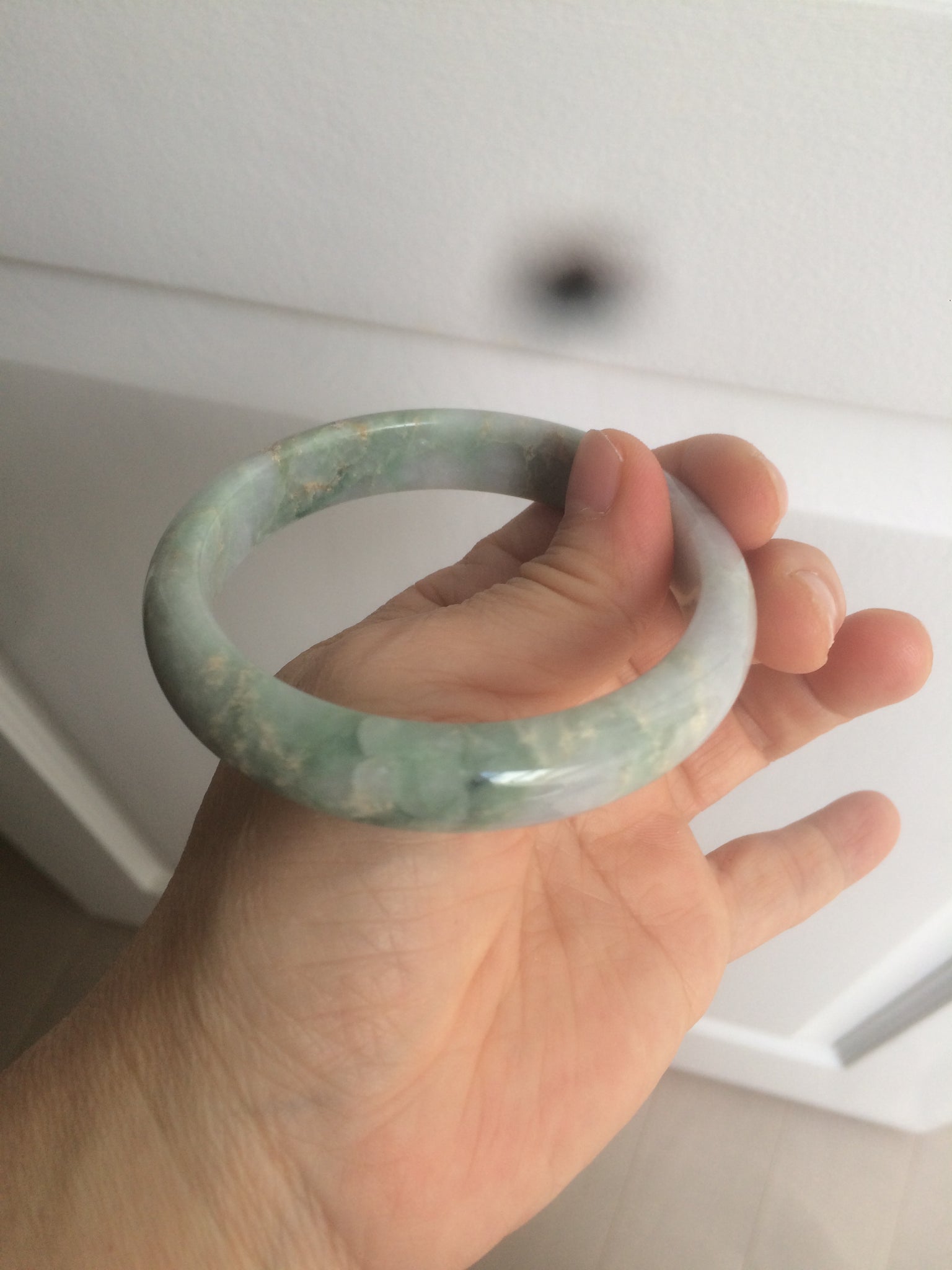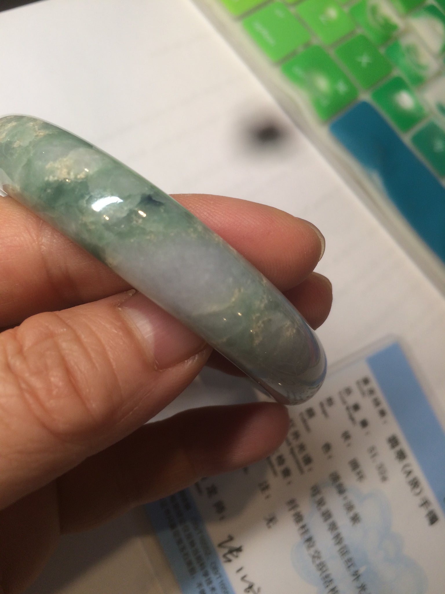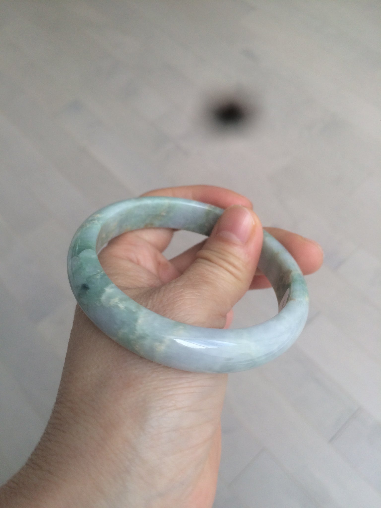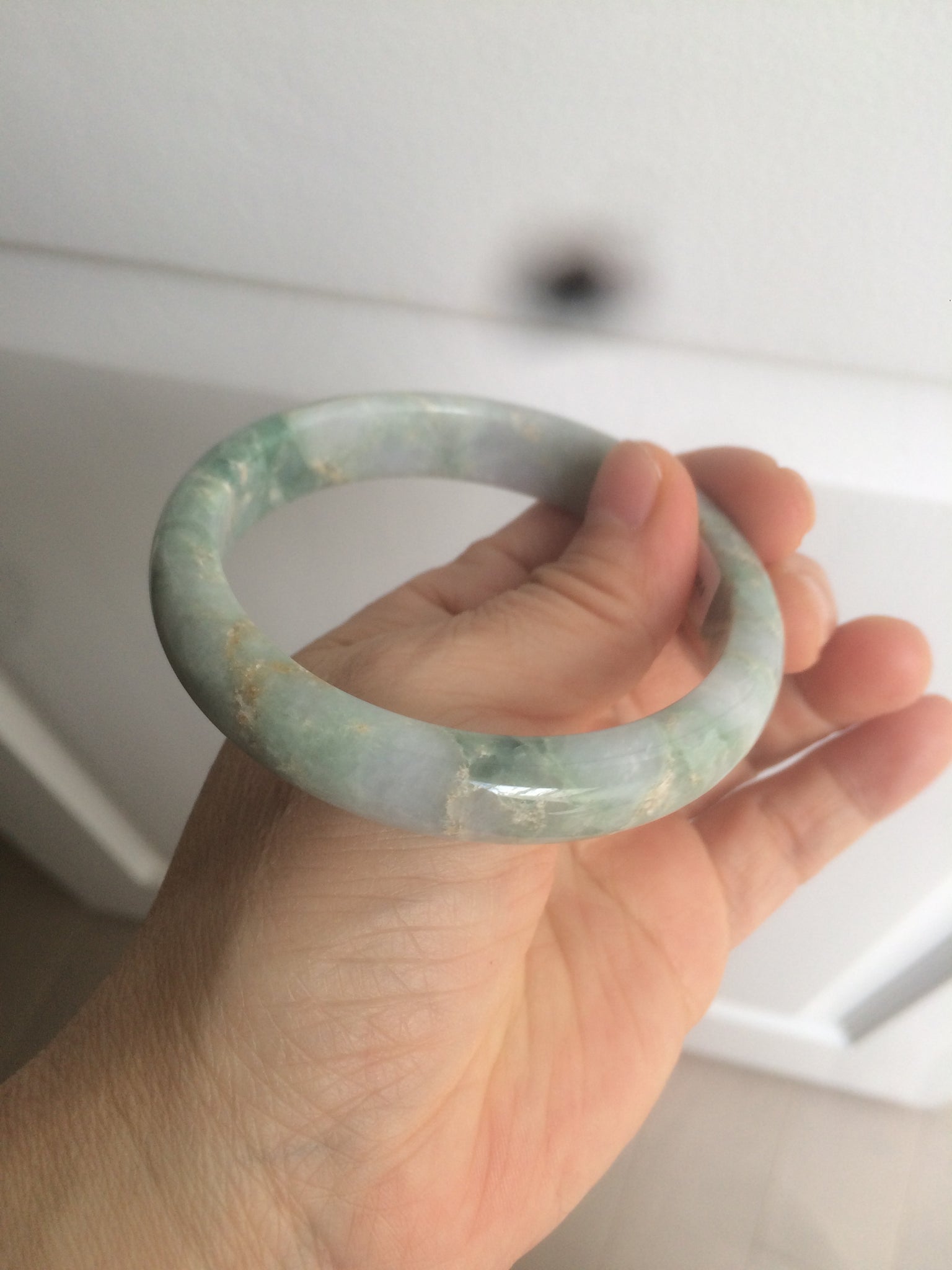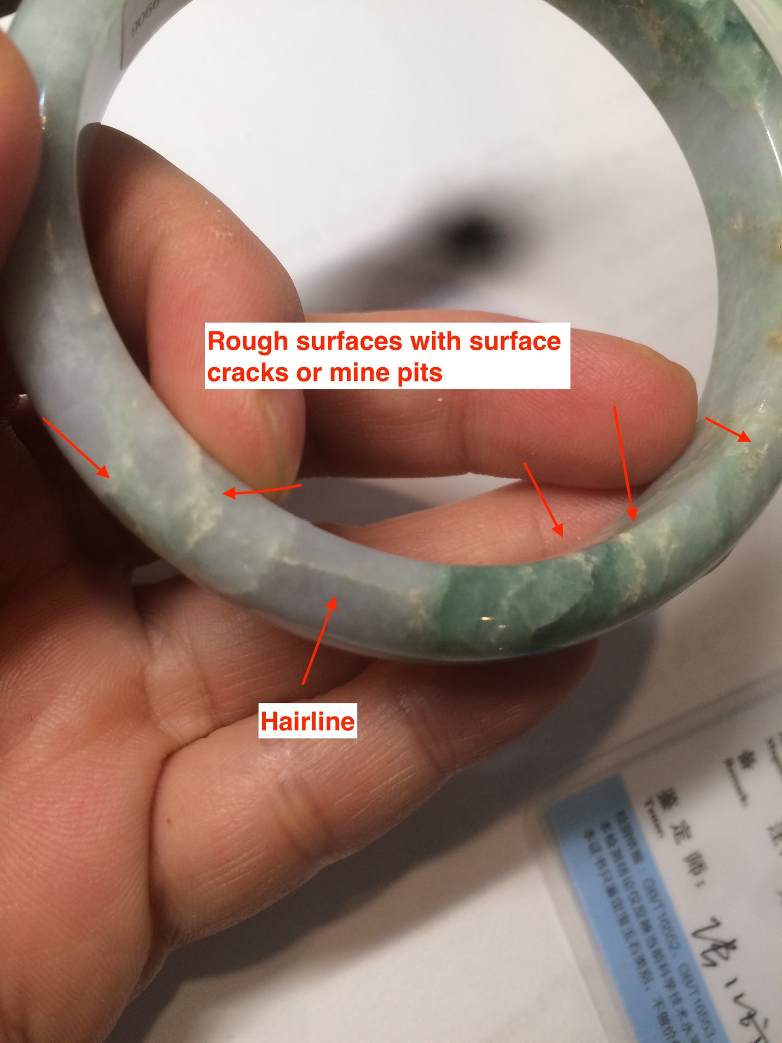 Quite a lot of yellow rough surface with surface scratches/mine pits, and a small amount of wax. One hairlines. Cotton areas and cottonspots. Not transparent. Not watery. The purple is super light. Lighter than in the photos. May have some other flaws that I did not mentioned.