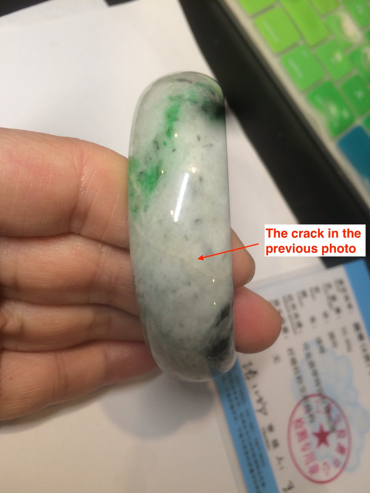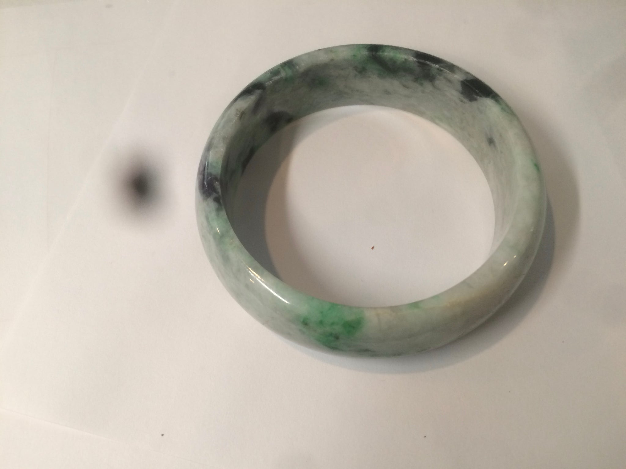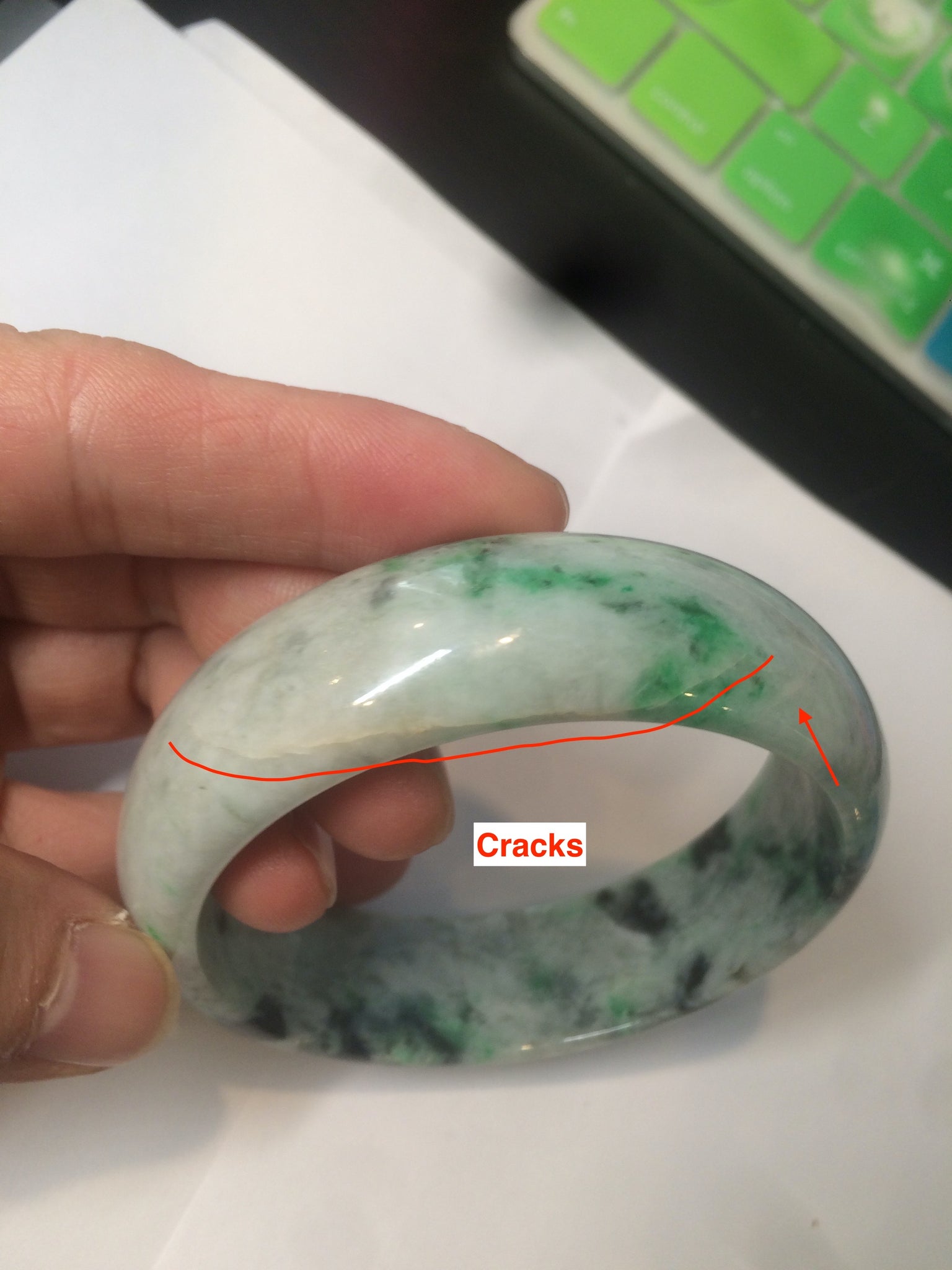 Imperfections: Some cracks. The bangle is firm. 2 of them with wax residue.  Some hairlines and cotton lines. Some rough surfaces. Not transparent. Dark green/black spots.