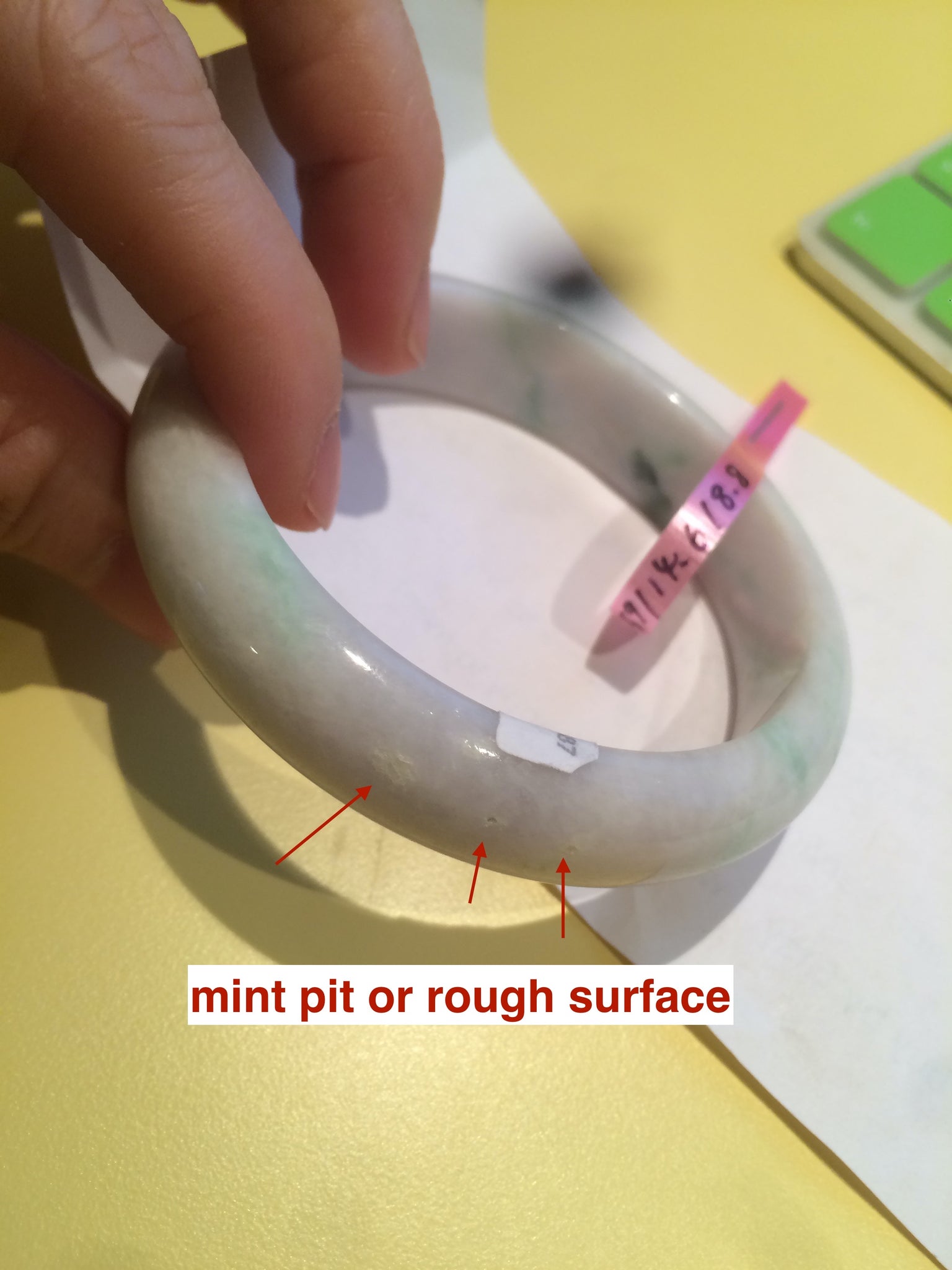 One around the bangle crack. This may decrease the firmness of the bangle. One V shape crack. One notch area. Some mine pits and rough surfaces. the texture is not so fine, in some areas you can see the structure lines. The cracks and pits have a tiny little bit of wax residue.