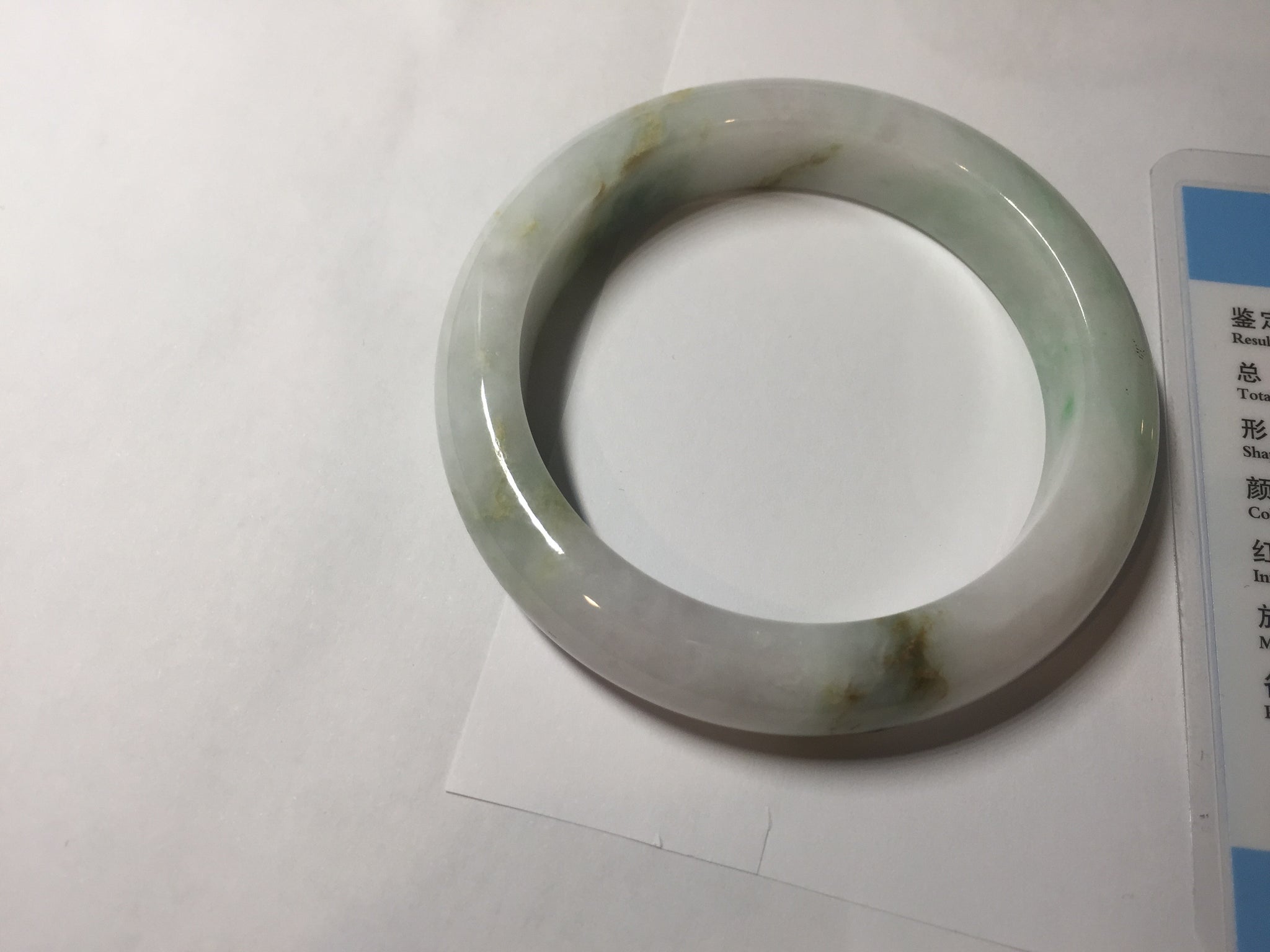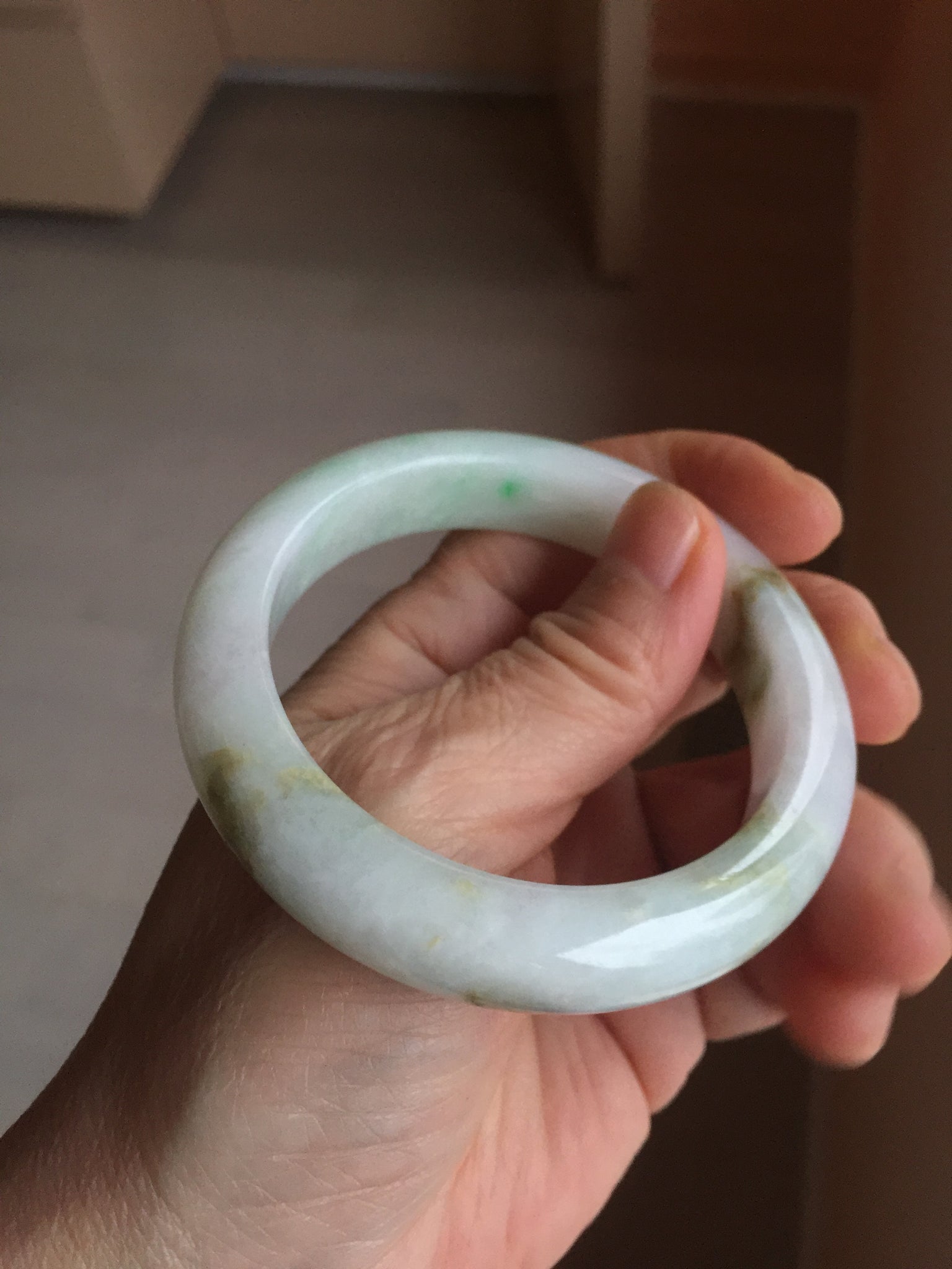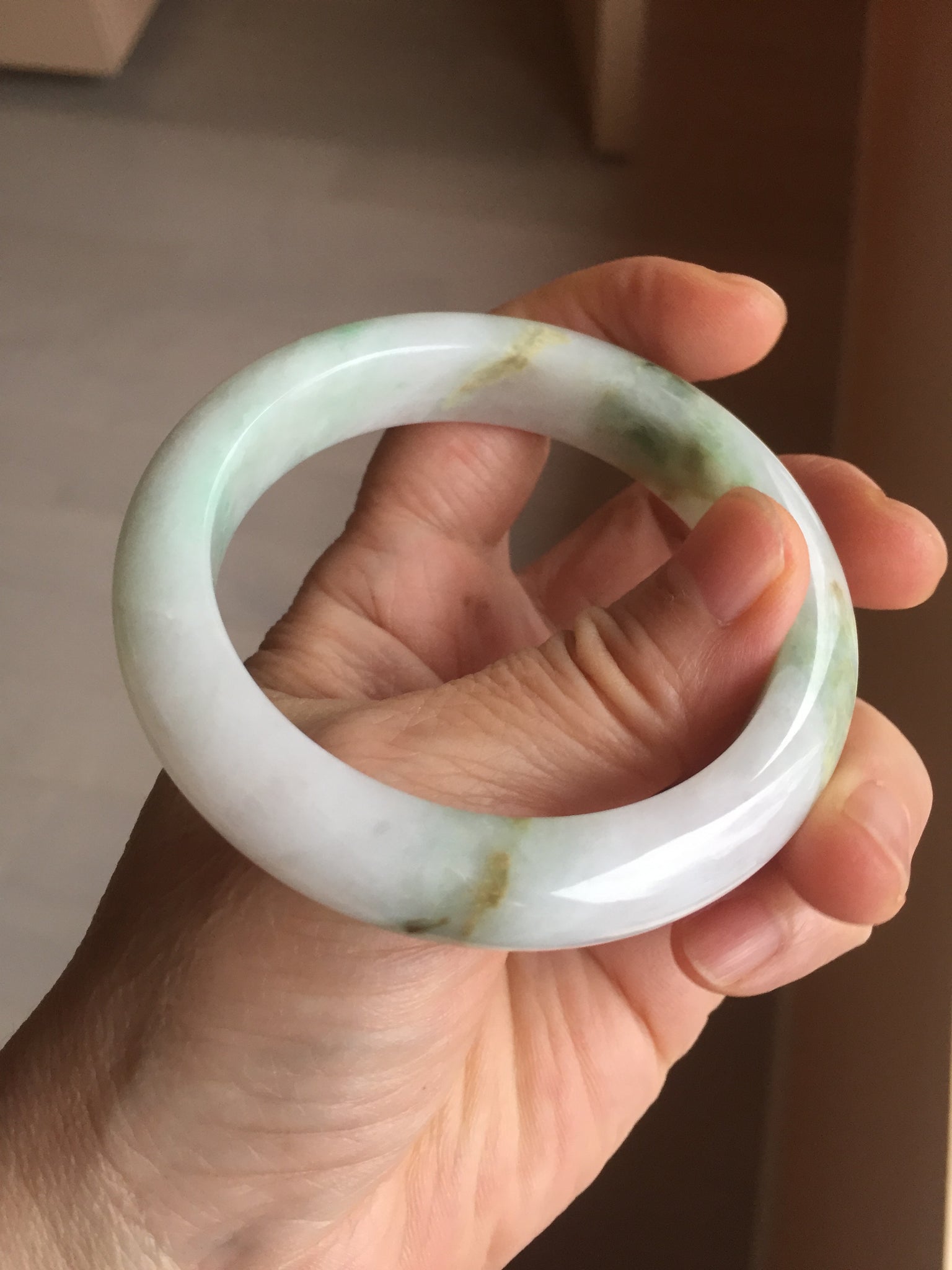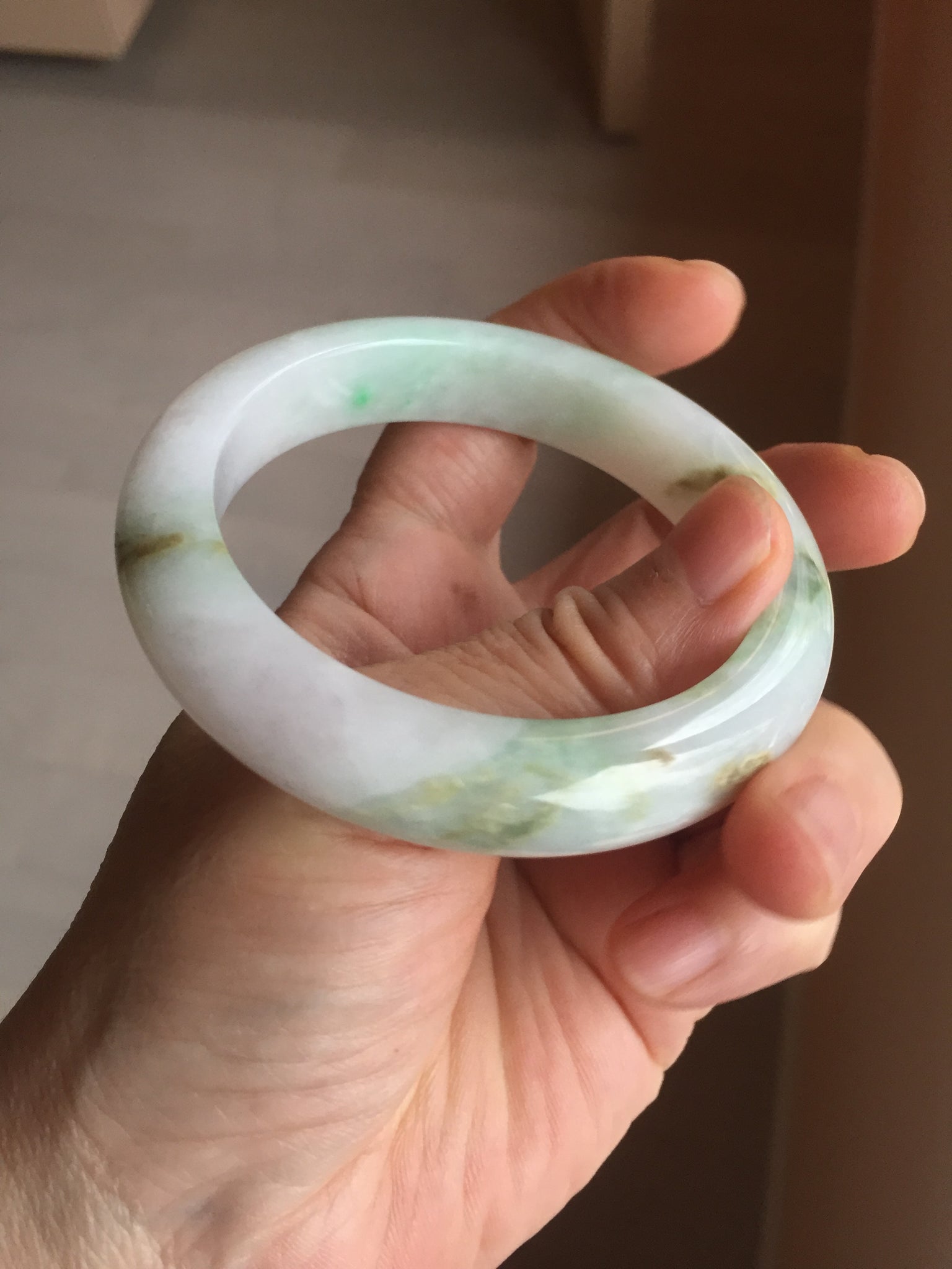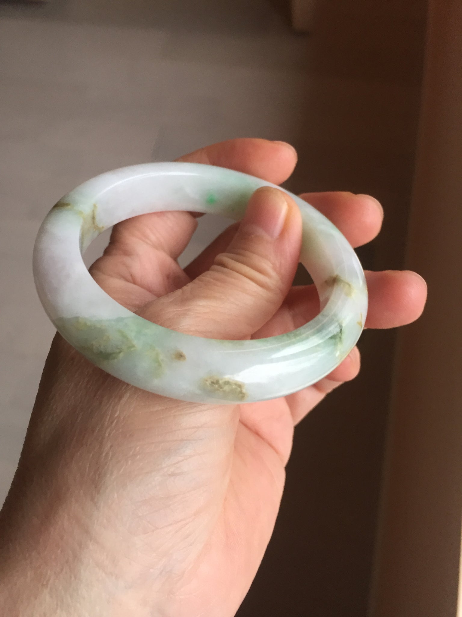 Some brown rough surfaces with surface cracks, fissures, or scratches. One crack. The bangle is solid(Guaranteed). Some cotton lines or hairlines. Some cotton spots and cotton areas. Not transparent. The purple is super light. Way lighter than in the photos due to the purple color always more camera friendly.