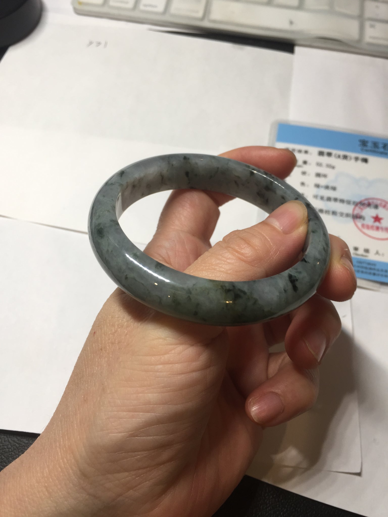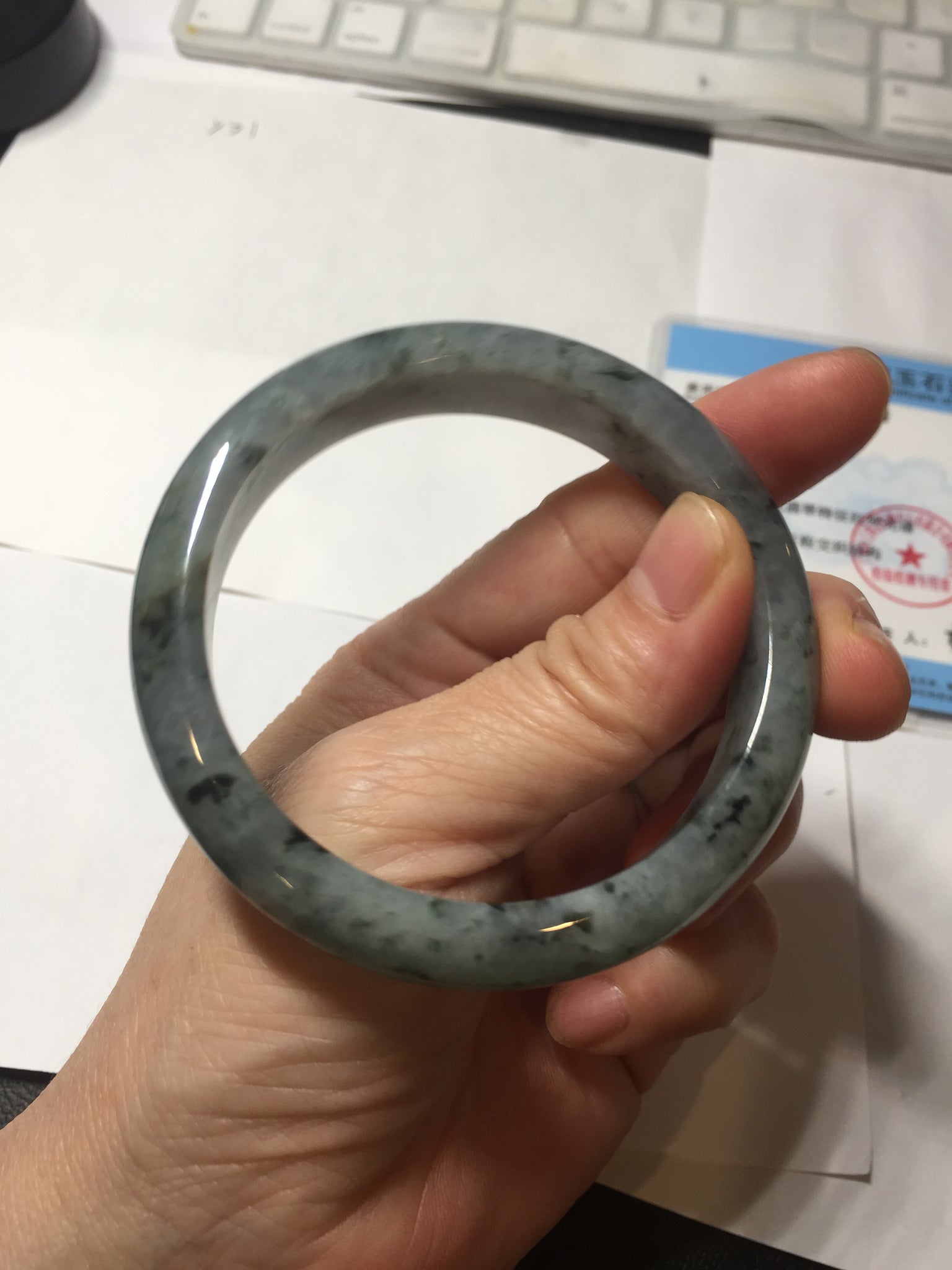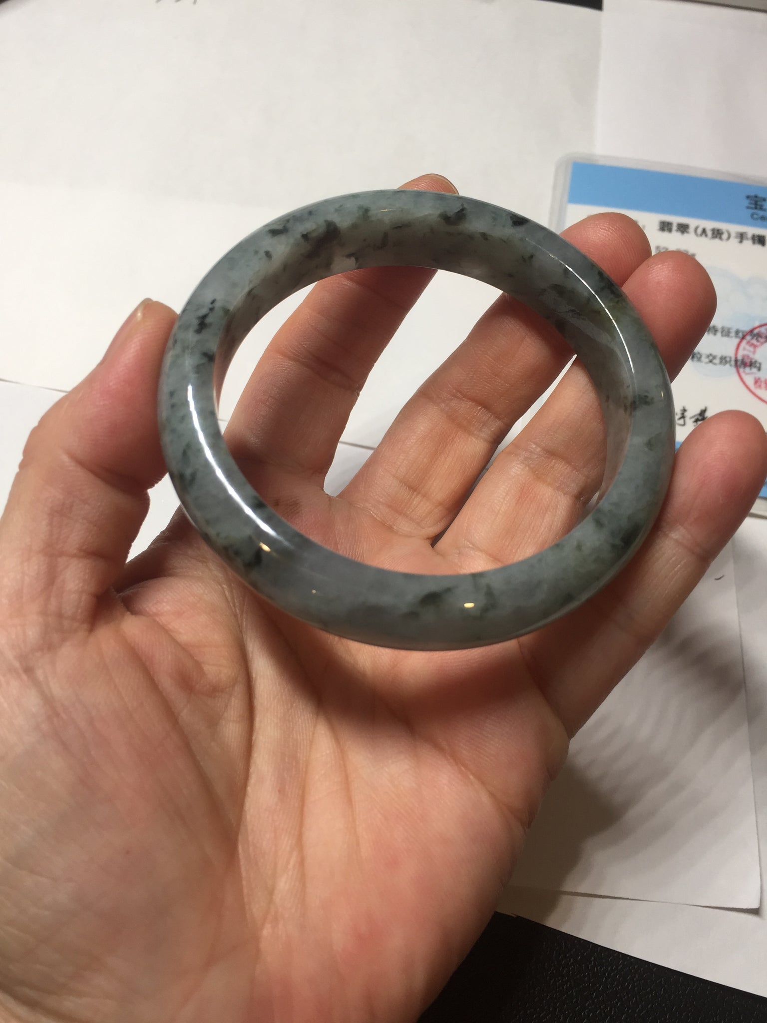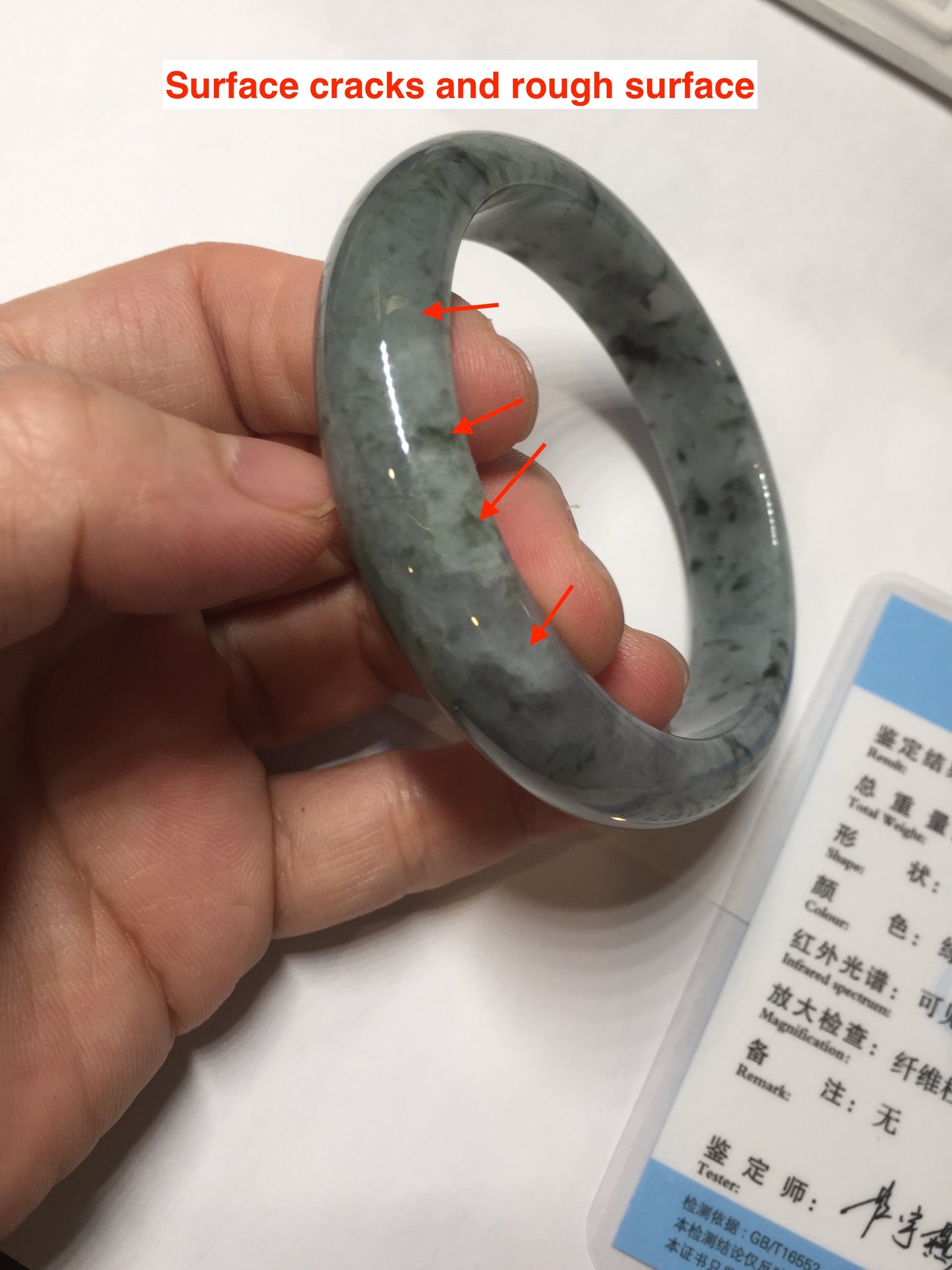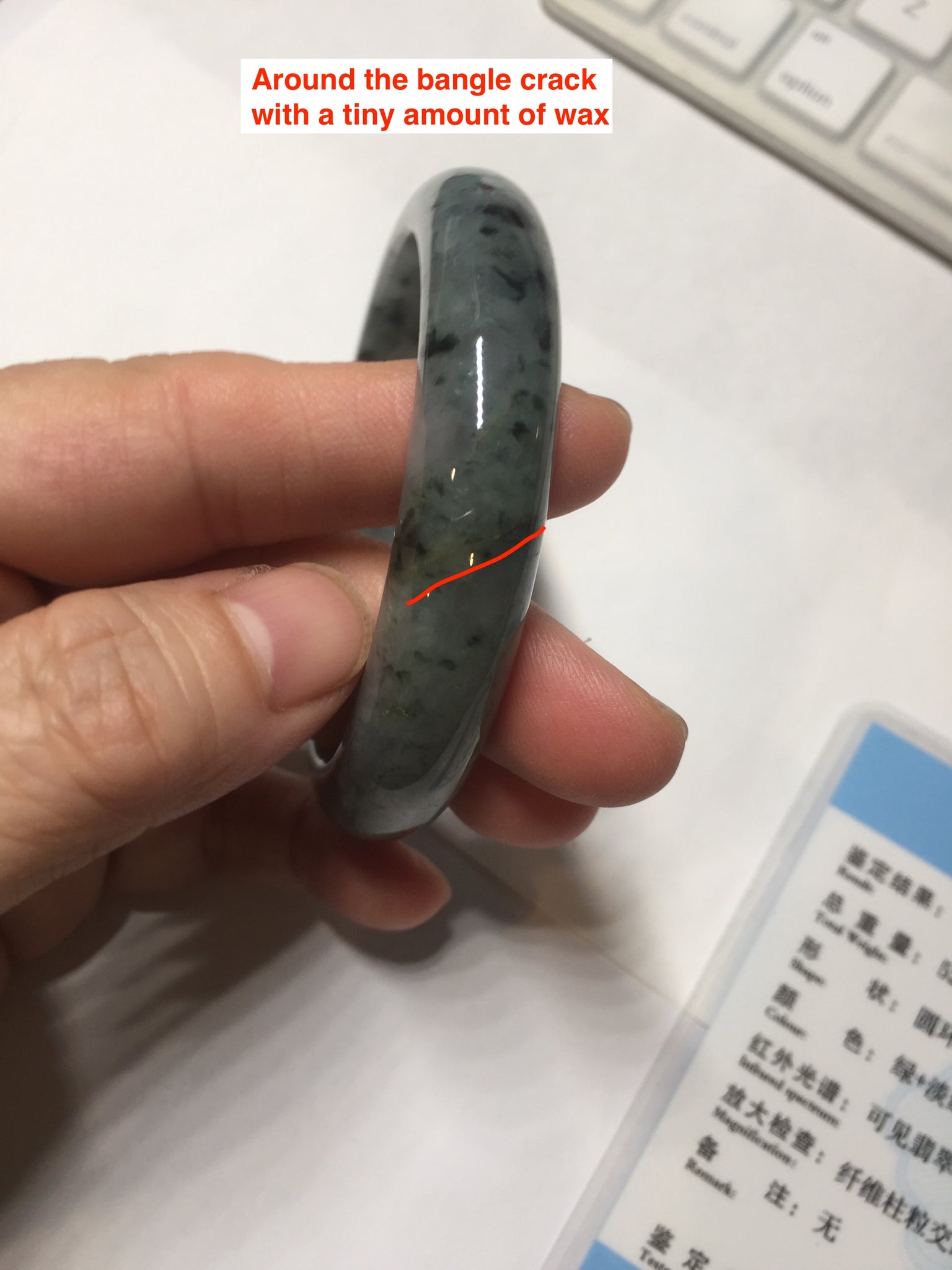 One around the bangle crack with a tiny amount of wax. Some surface cracks and small rough surfaces. The bangle is solid(Guaranteed!). Make high pitch sound when tapped. Some hairlines, cotton lines, cotton areas, and cotton spots. No transparent. The purple is super light. Way lighter than in the photos due to the purple color always more camera friendly.