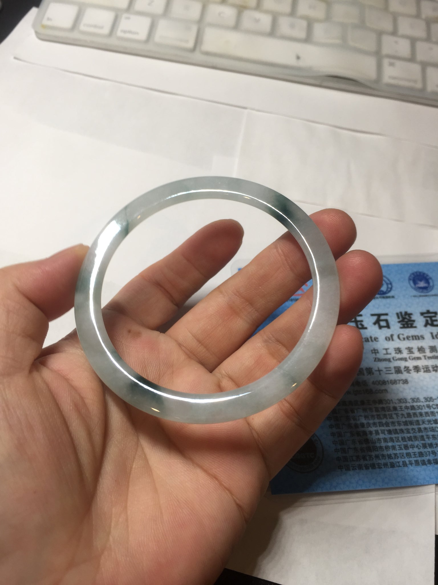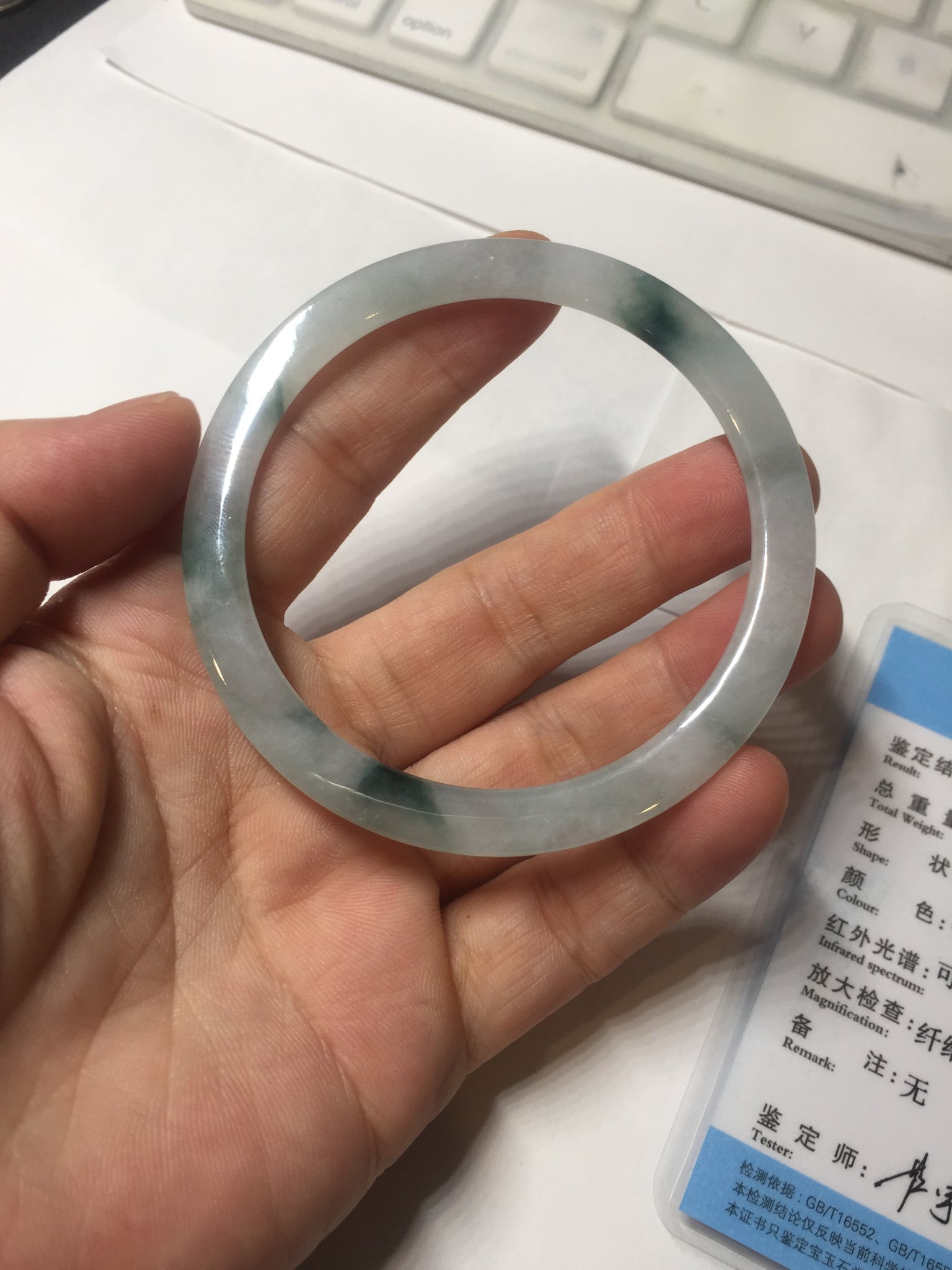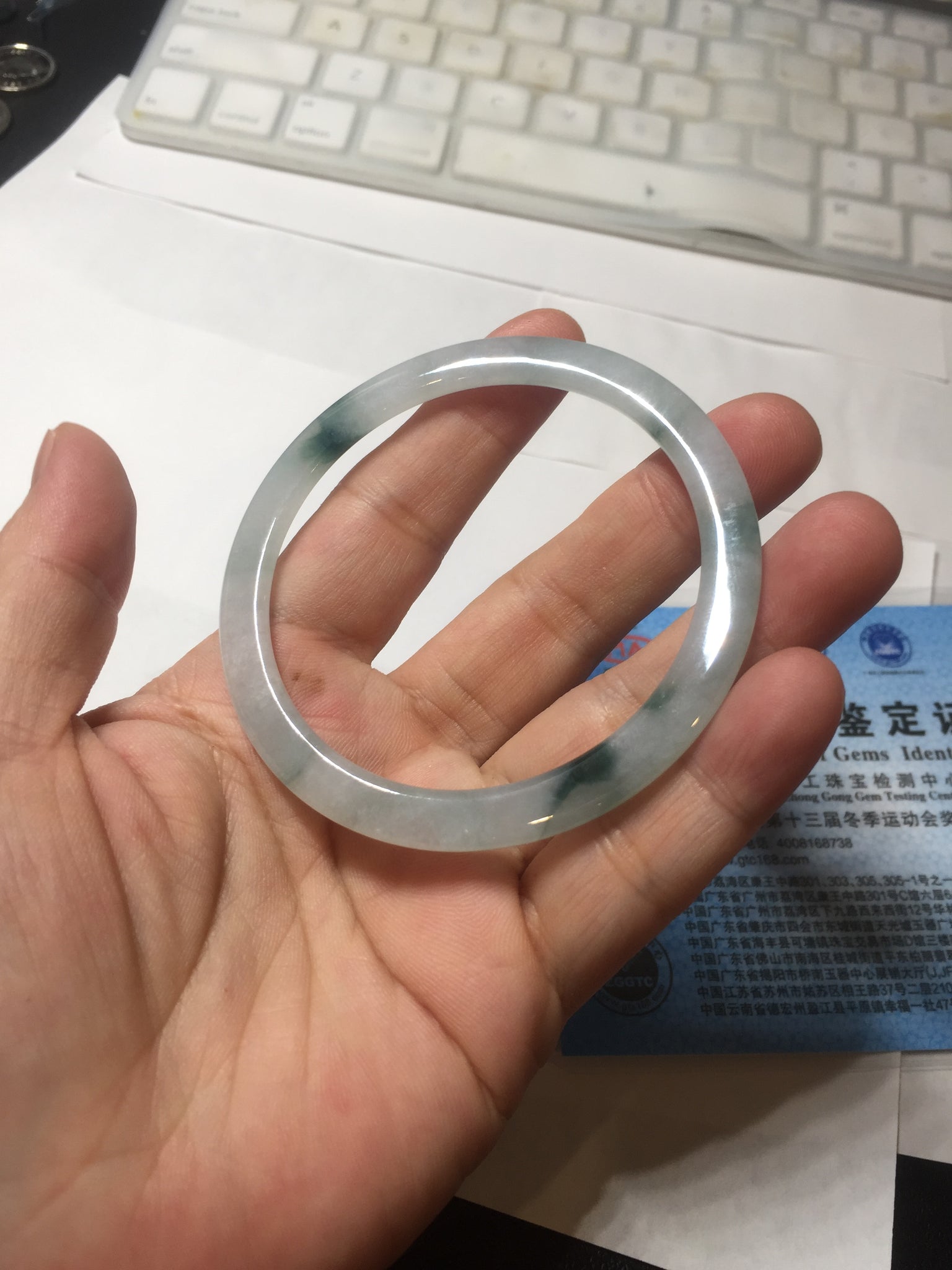 57.5mm certified 100% natural type A icy watery white beige with green floating flowers flat jadeite bangle PD26-5816