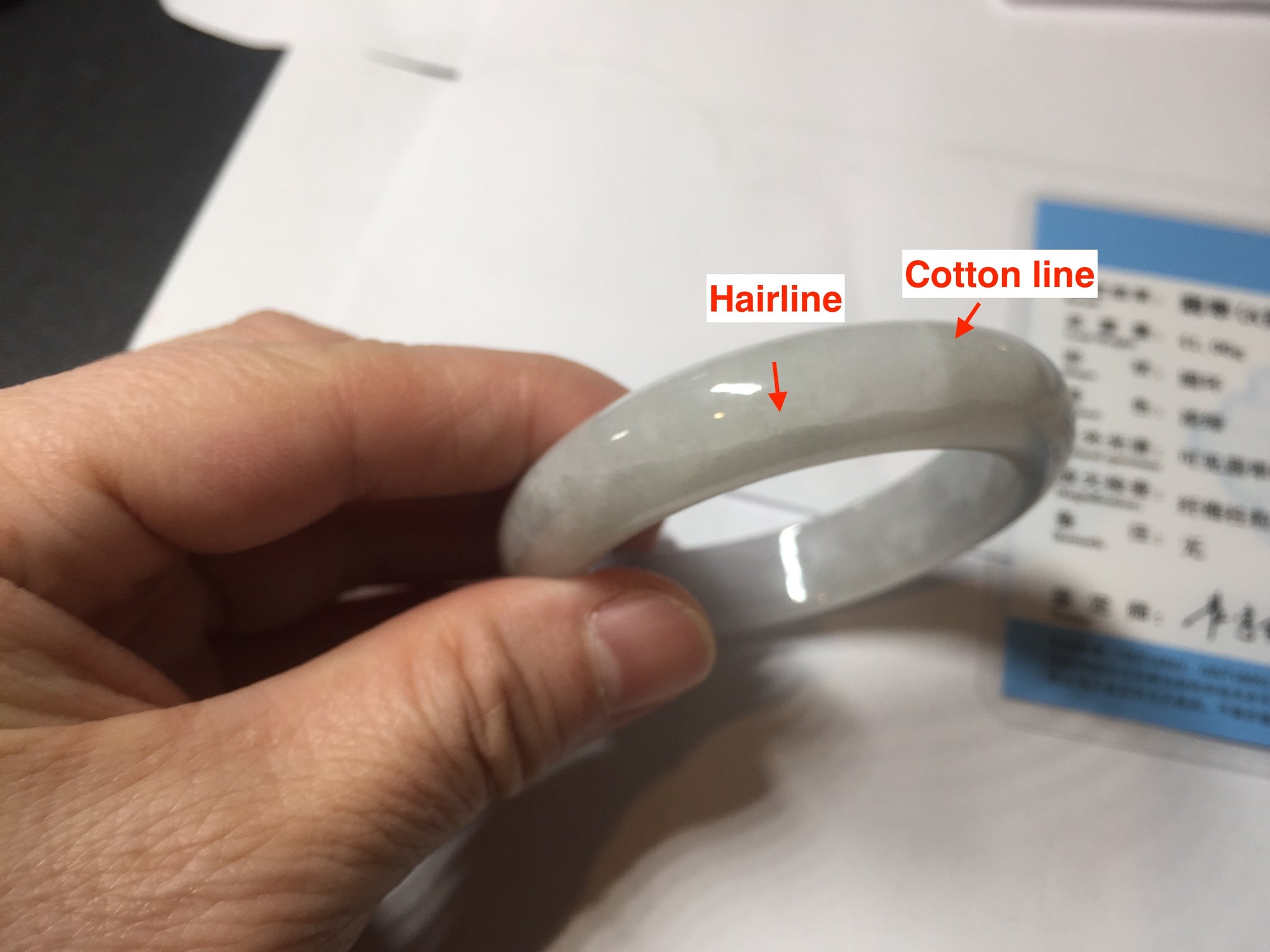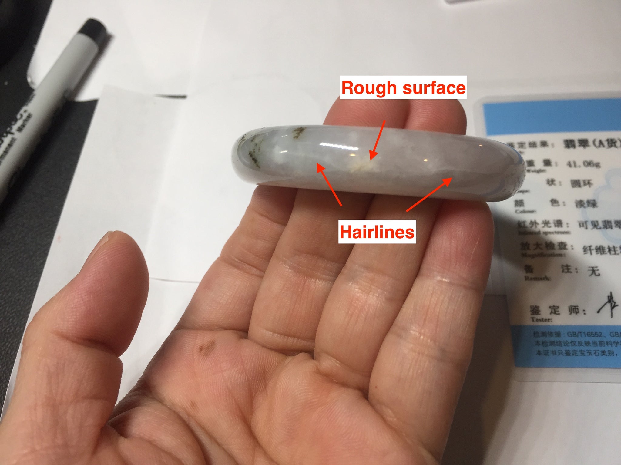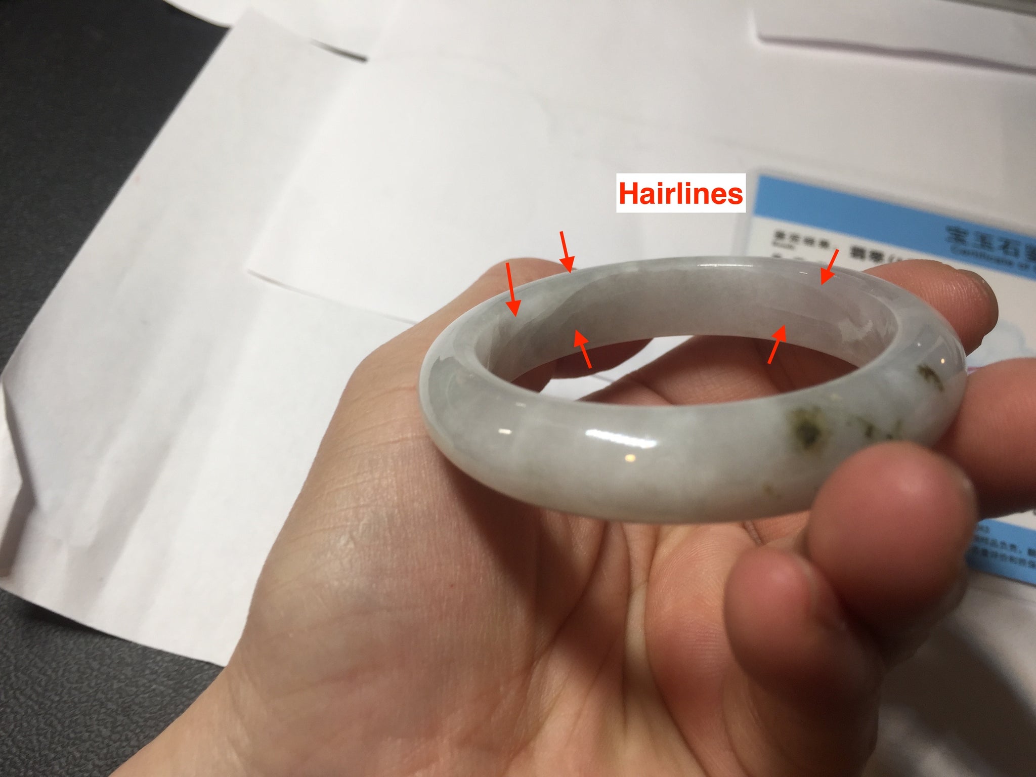 One crack. The bangle is solid. Some long hairlines. Some rough surfaces. Some cotton spots and lines.