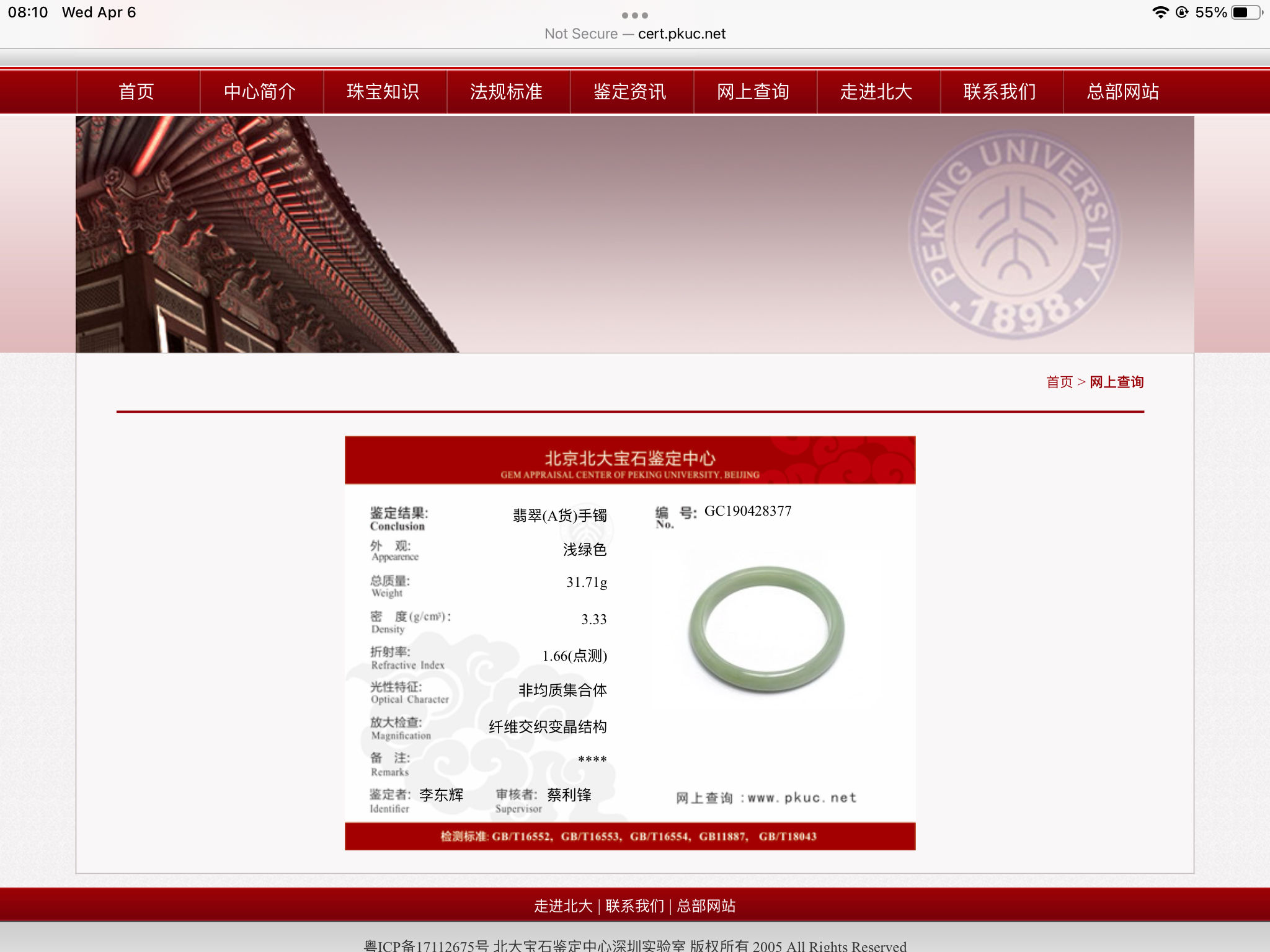 The certificate is lost. 100% natural jadeite jade bangle guaranteed. I only have the online certificate link.