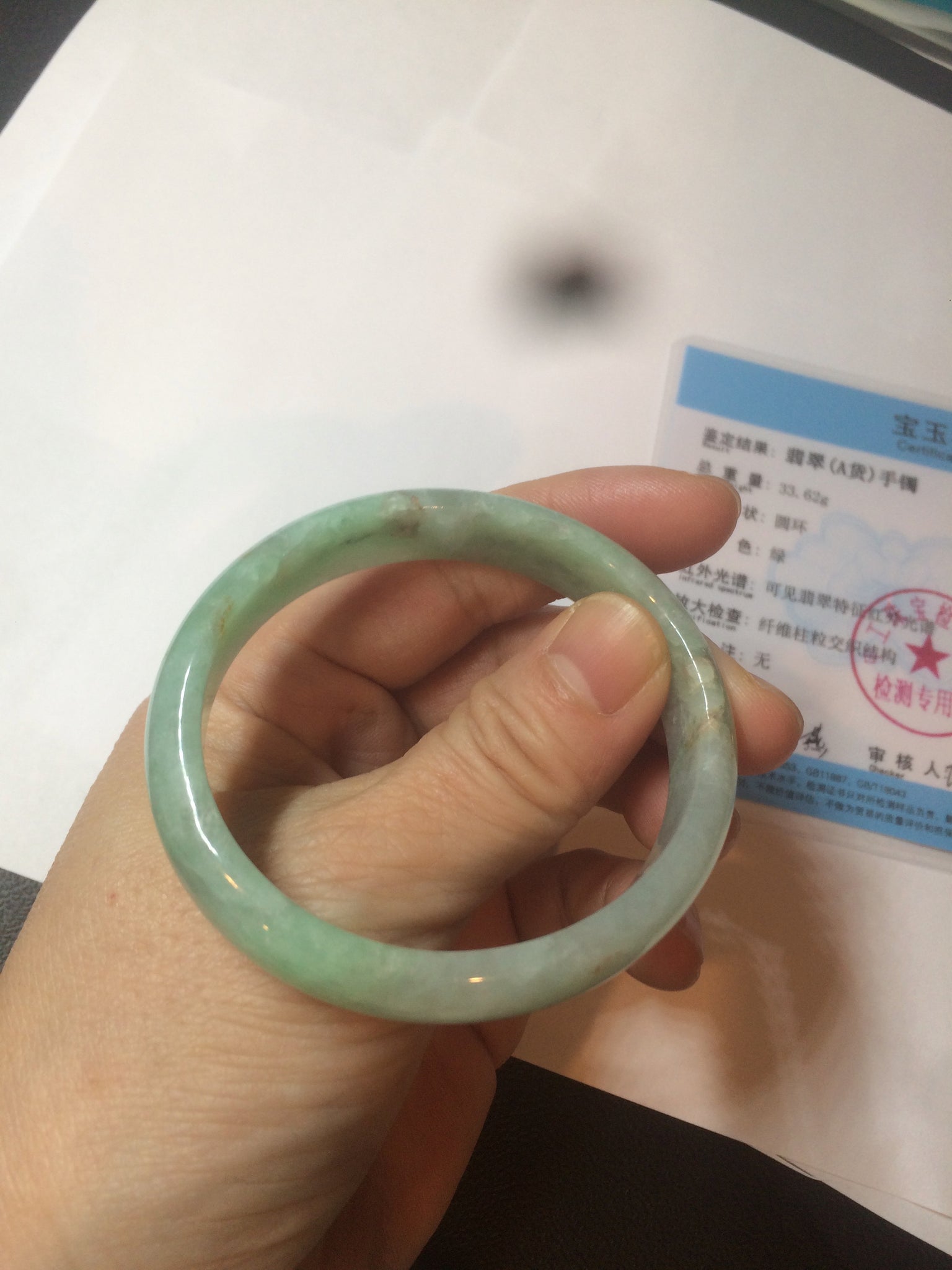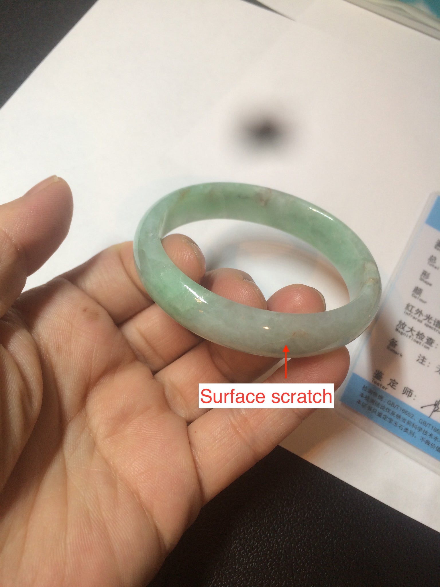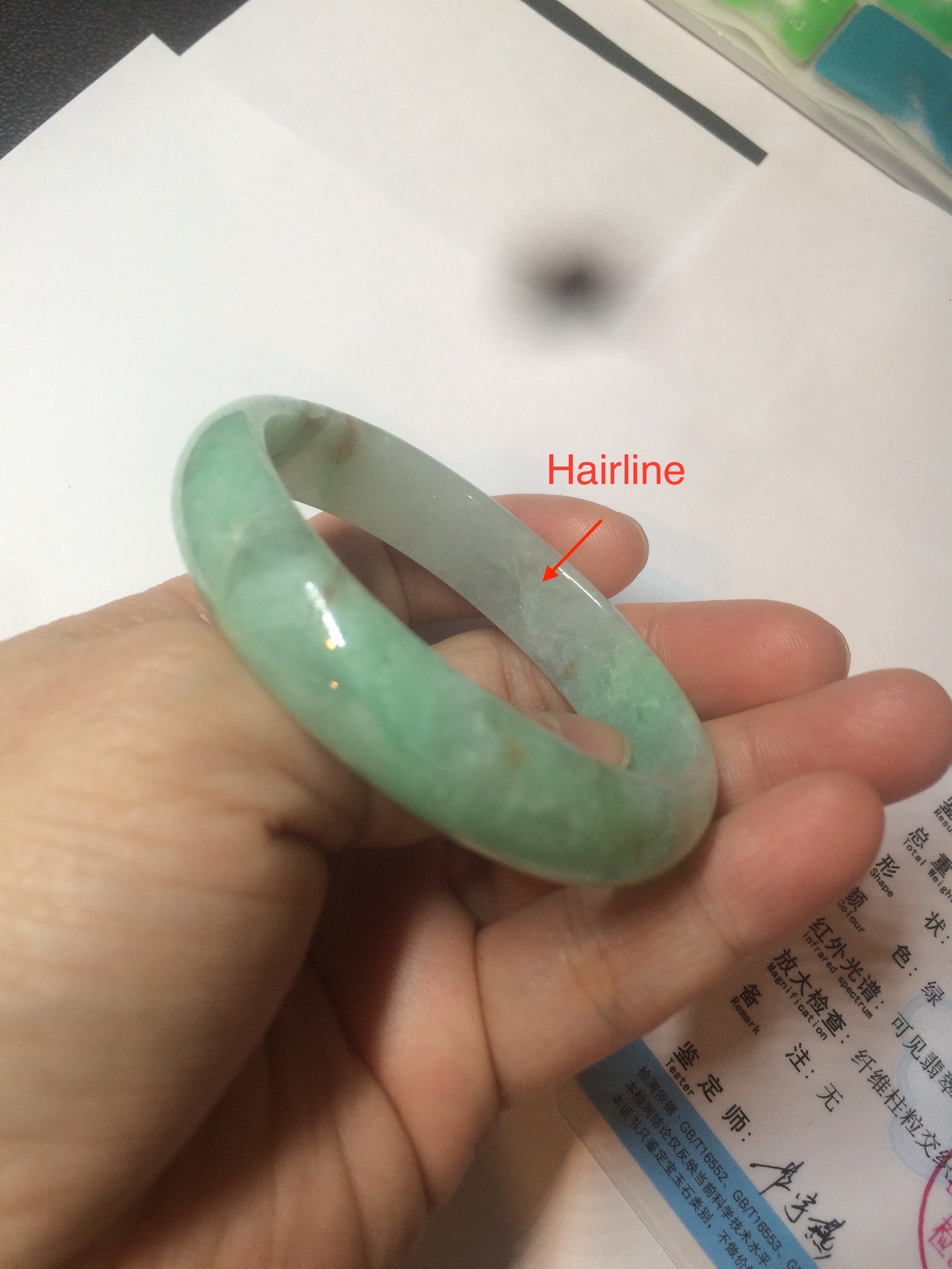 Quite a lot of cracks, hairlines, and rough surface(photos may not show all). The bangle is still firm. Cotton lines, hairlines and spots.