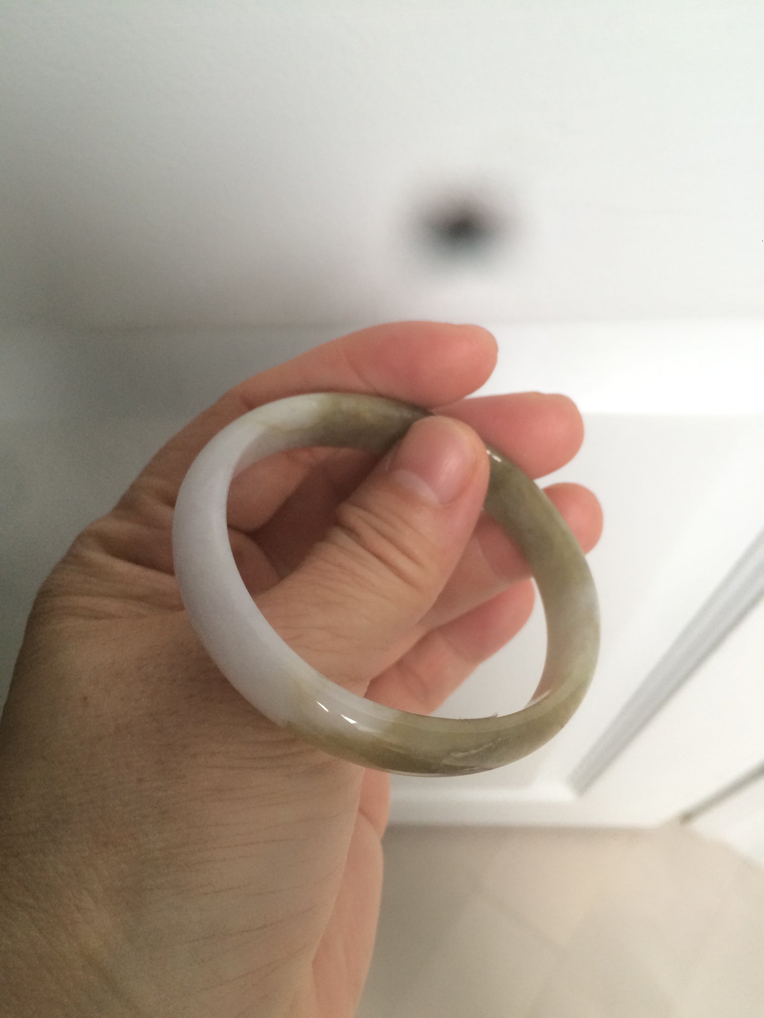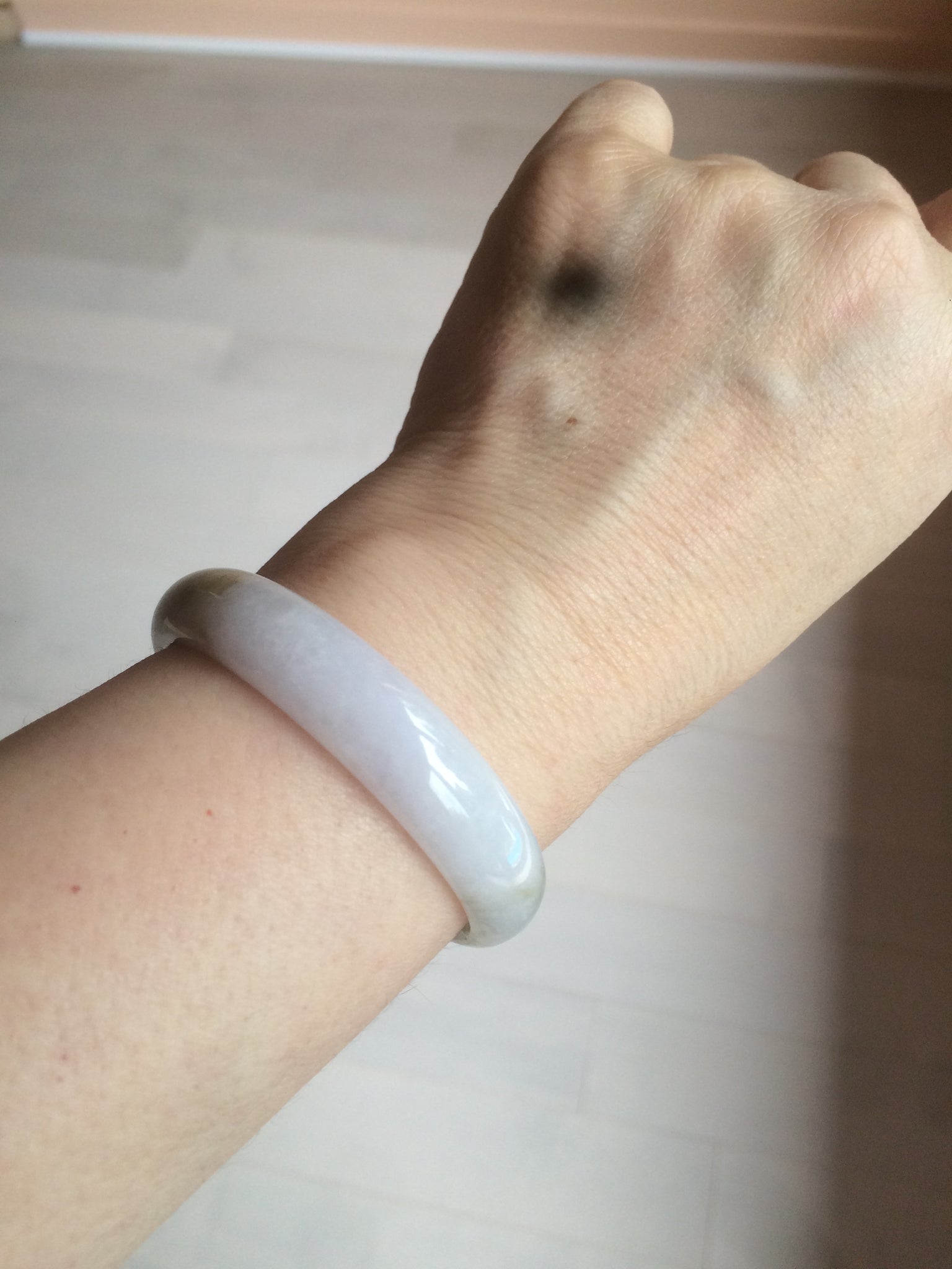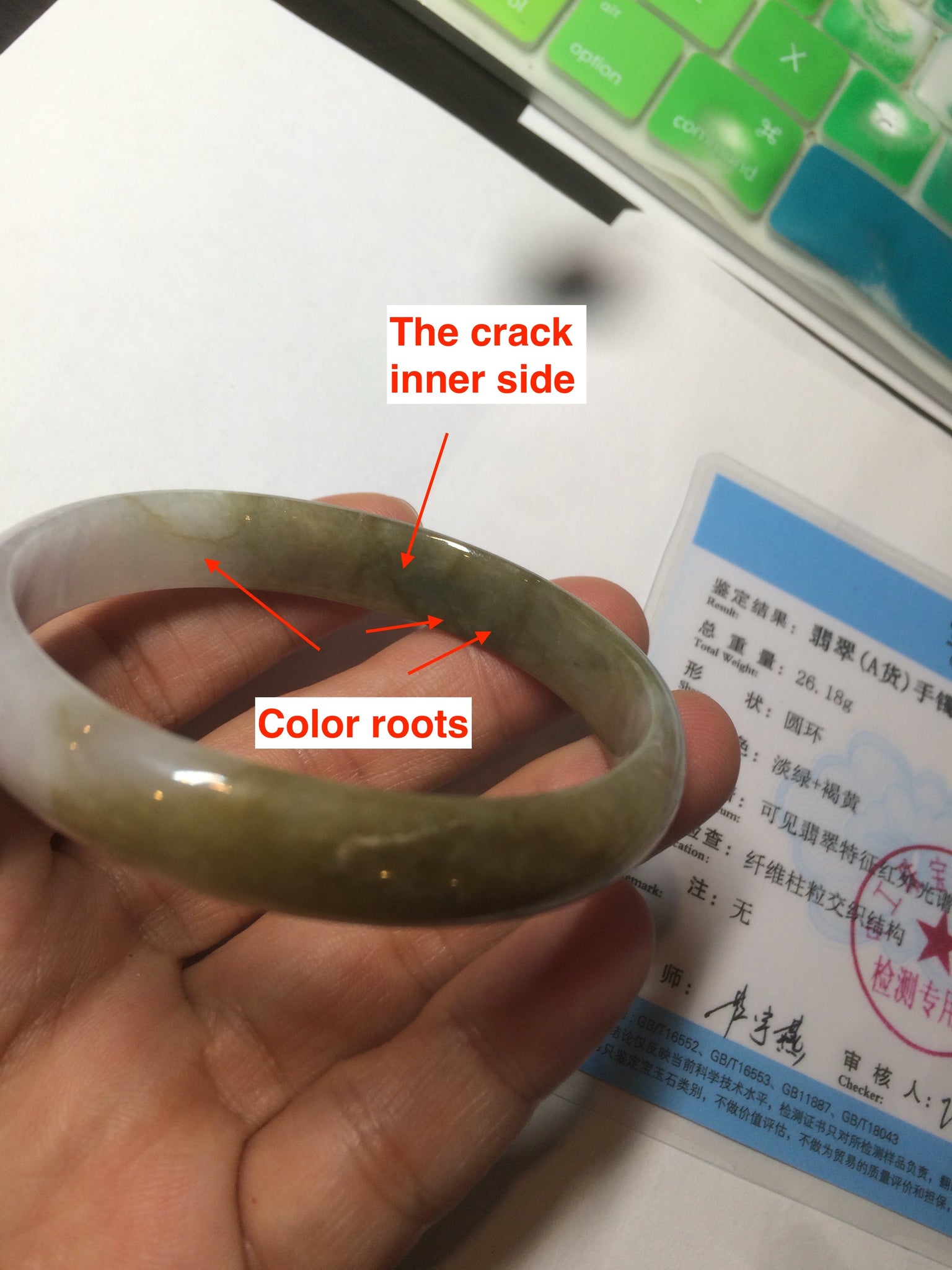 Two color root cracks. One is almost around the bangle. The bangle is still solid.  One brown/black area. Cotton lines and hairlines. Cotton spots. Black spots and cotton spots.