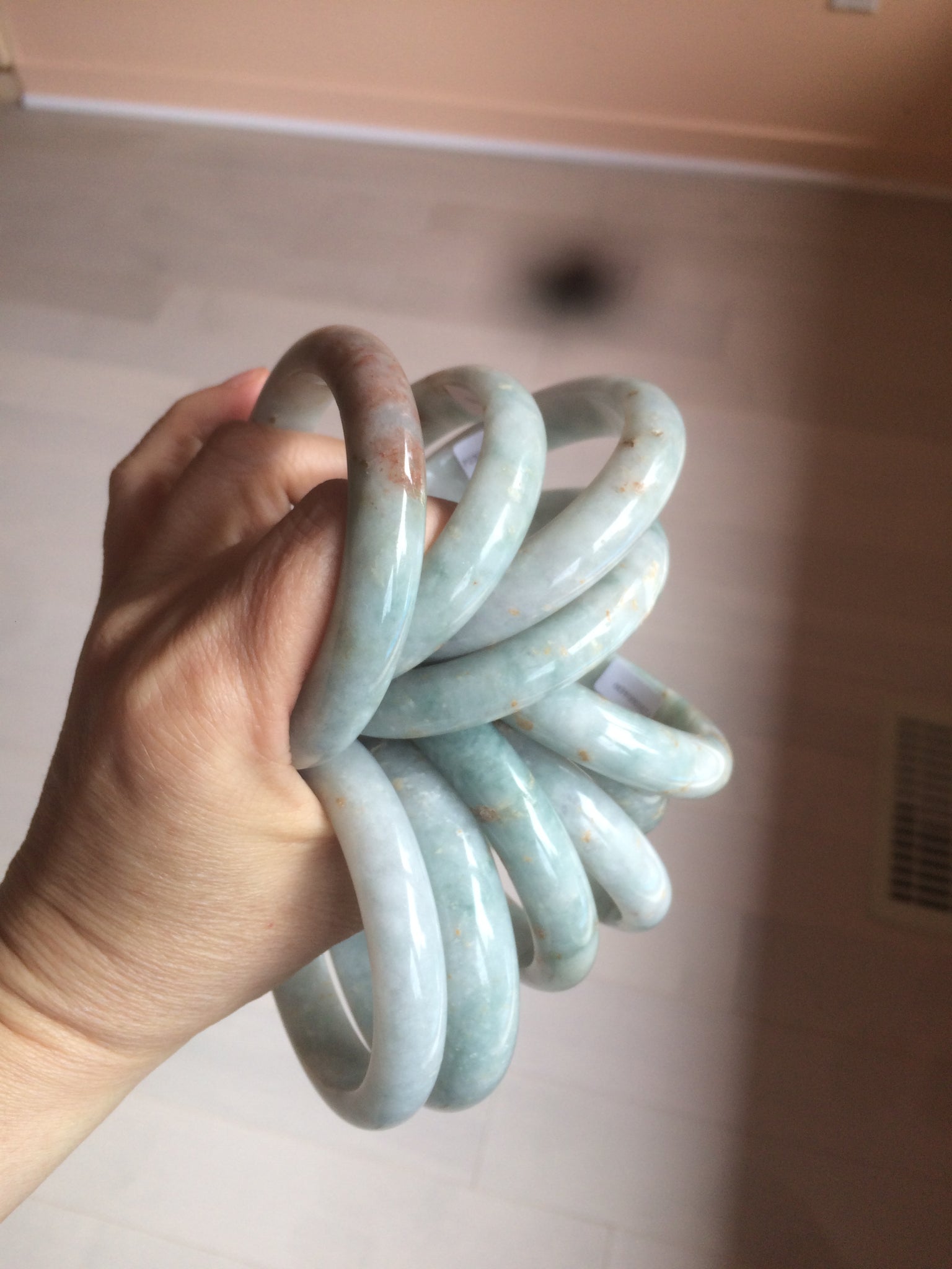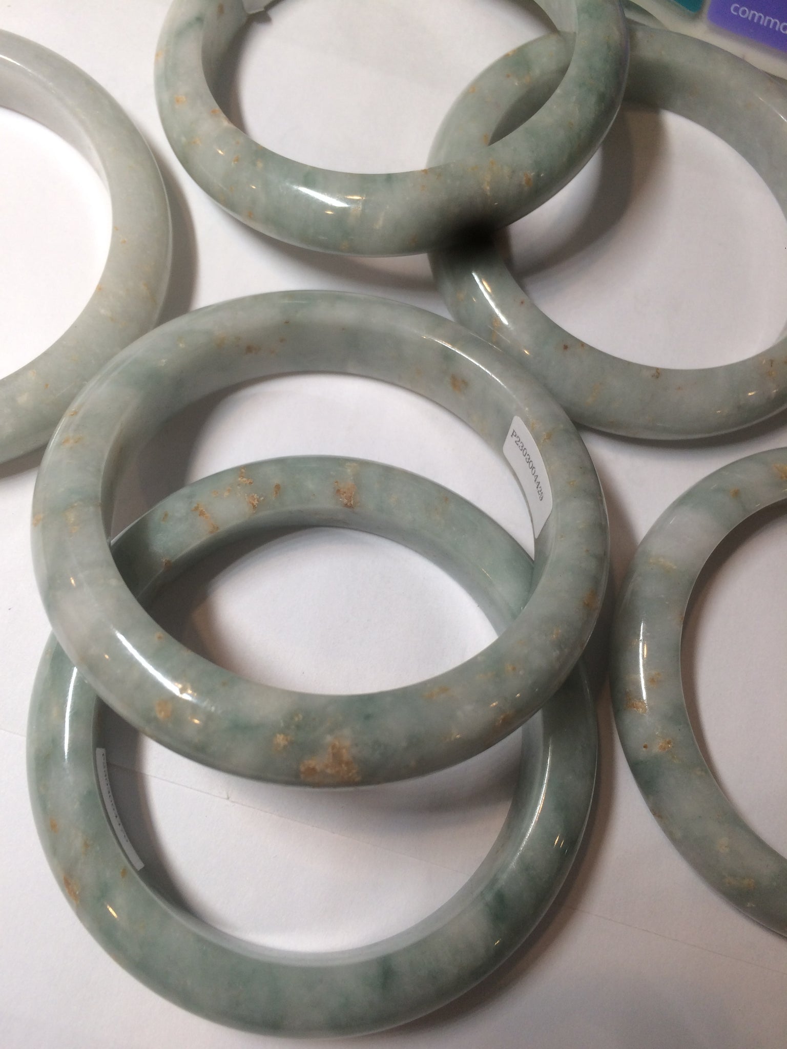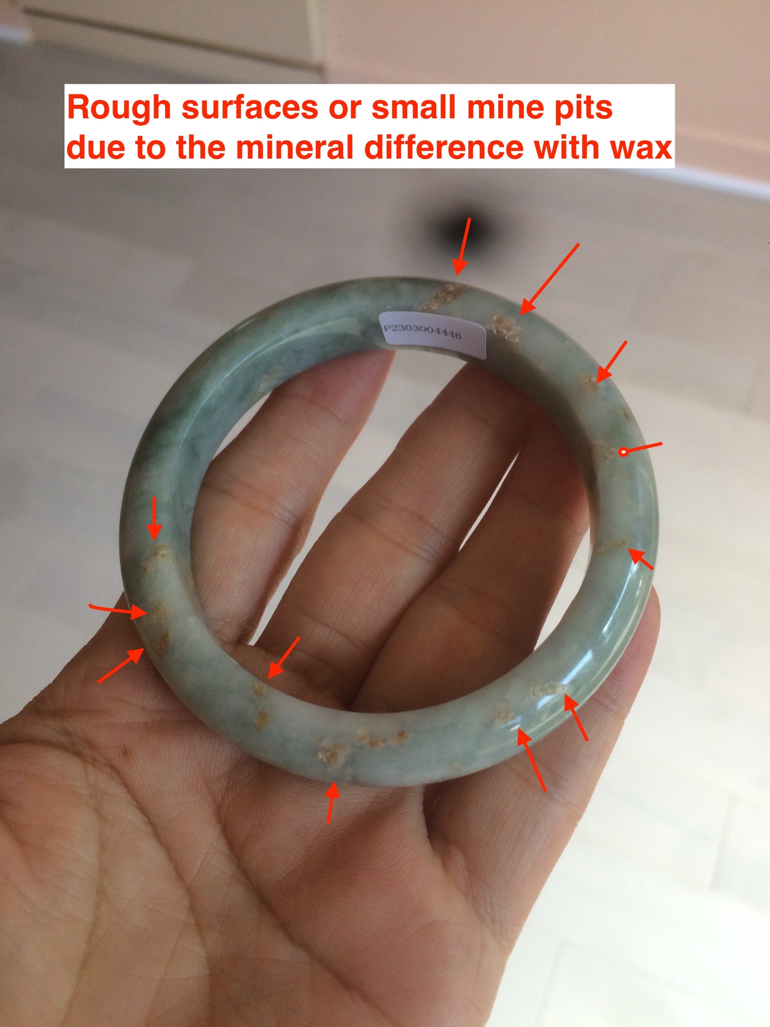 这批手镯都是一块石头开出来的,没有纹裂,就是有很多大小不一的红褐色氧化铁矿点,因为质地不同,所以有粗糙面,或者矿点掉了,有矿坑。抛光的时候因为用了有机腊,最后抛光平滑面的腊抹掉了,在不平滑面或者坑里,有相对多的腊残留。这样的腊在手镯表面,是可以接受,能开A货证书的。我也特意因此降价很多了,如果不喜欢腊,请不要买,谢谢。