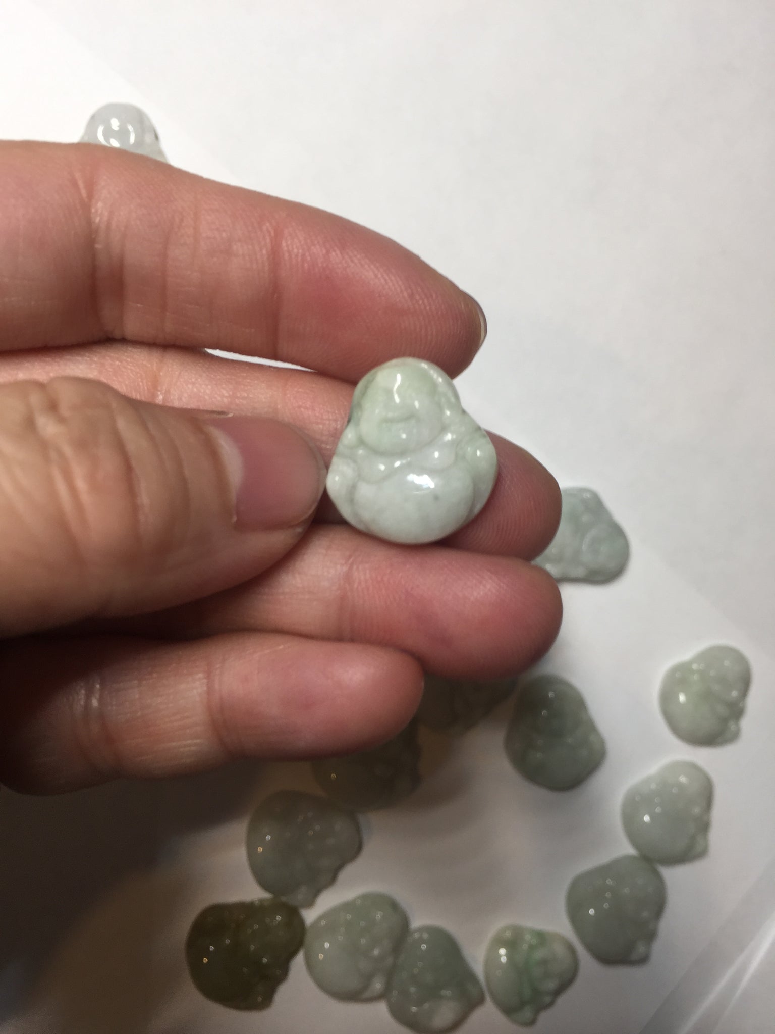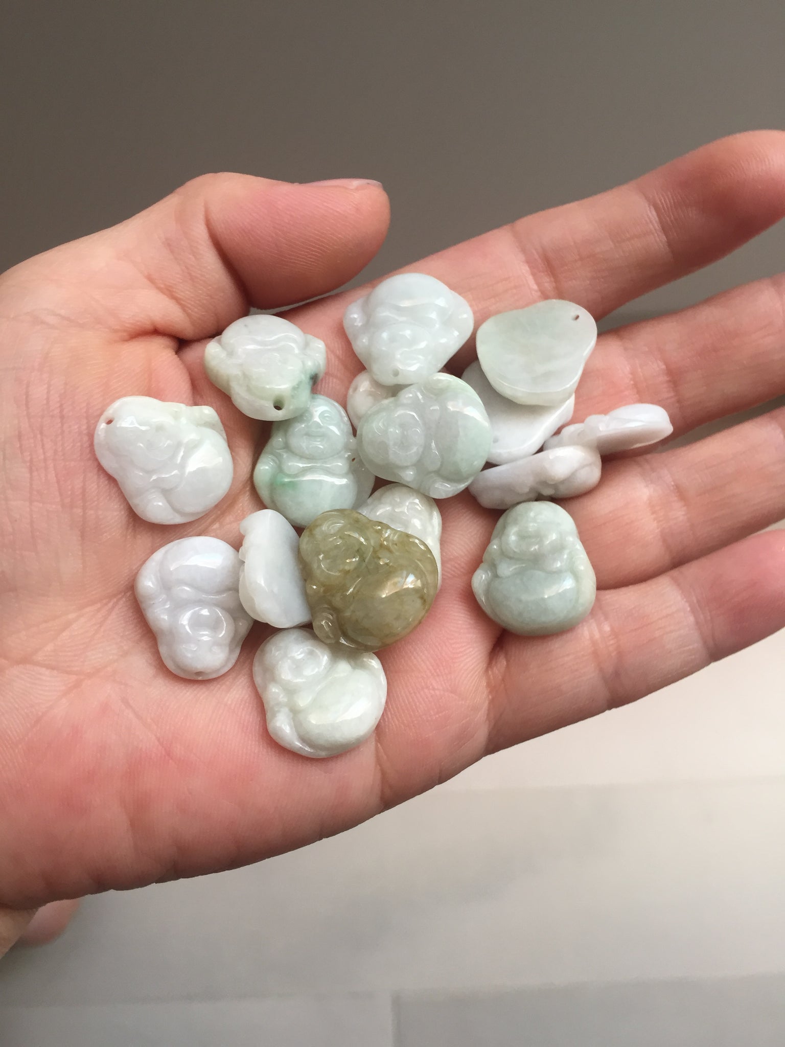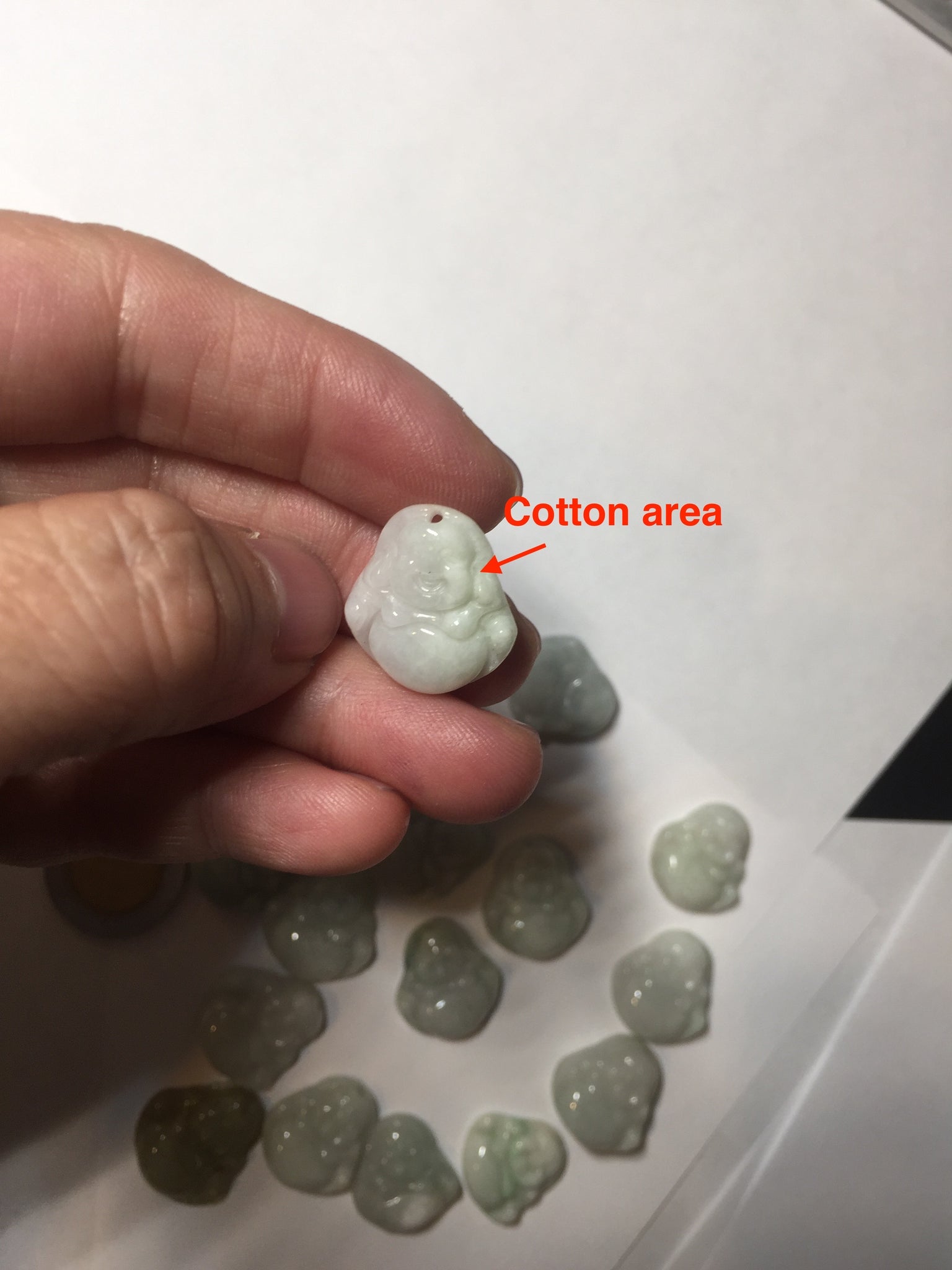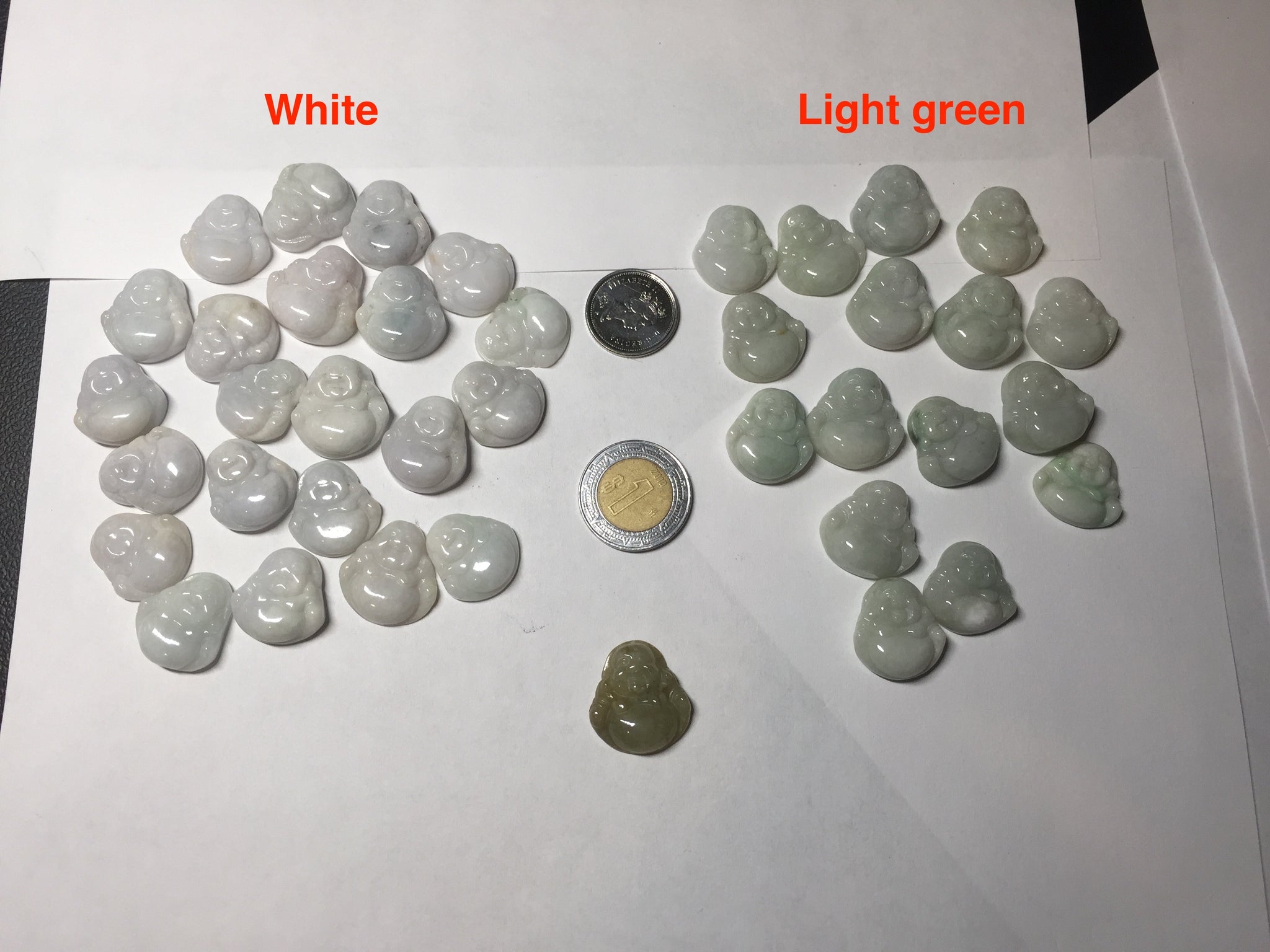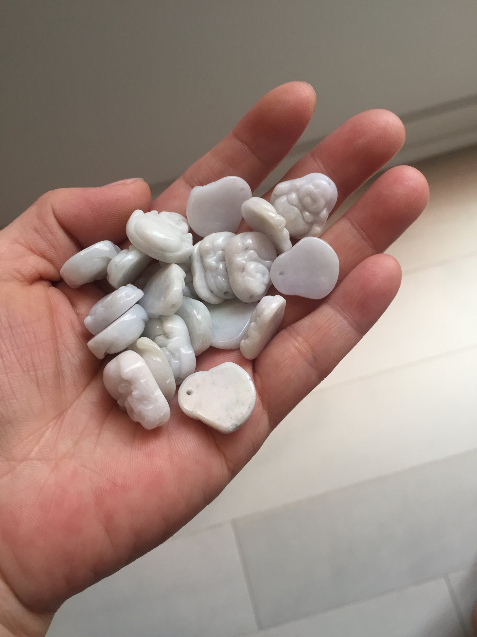 Not the best quality jadeite jade. Not all of them are the same size. All don't have a crack but may have hairlines, color roots, small rough surfaces, black spots, cotton lines, cotton areas, and cotton spots. They are not prefectly round or carved, nor transparent or watery. The purple is super light if there is a purple color.