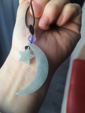 Type A 100% Natural light green jadeite Jade moon and star Pendant necklace AJ51