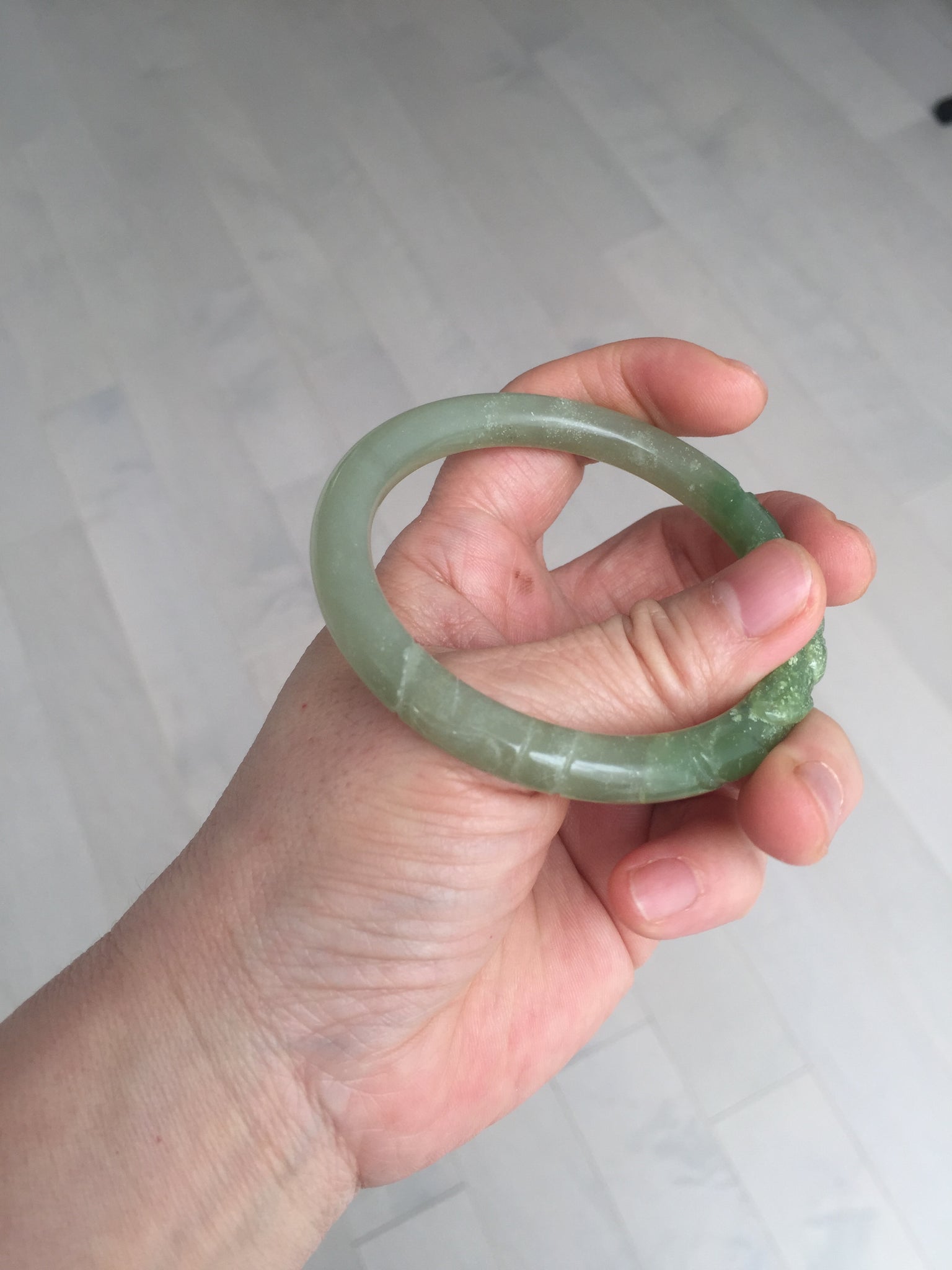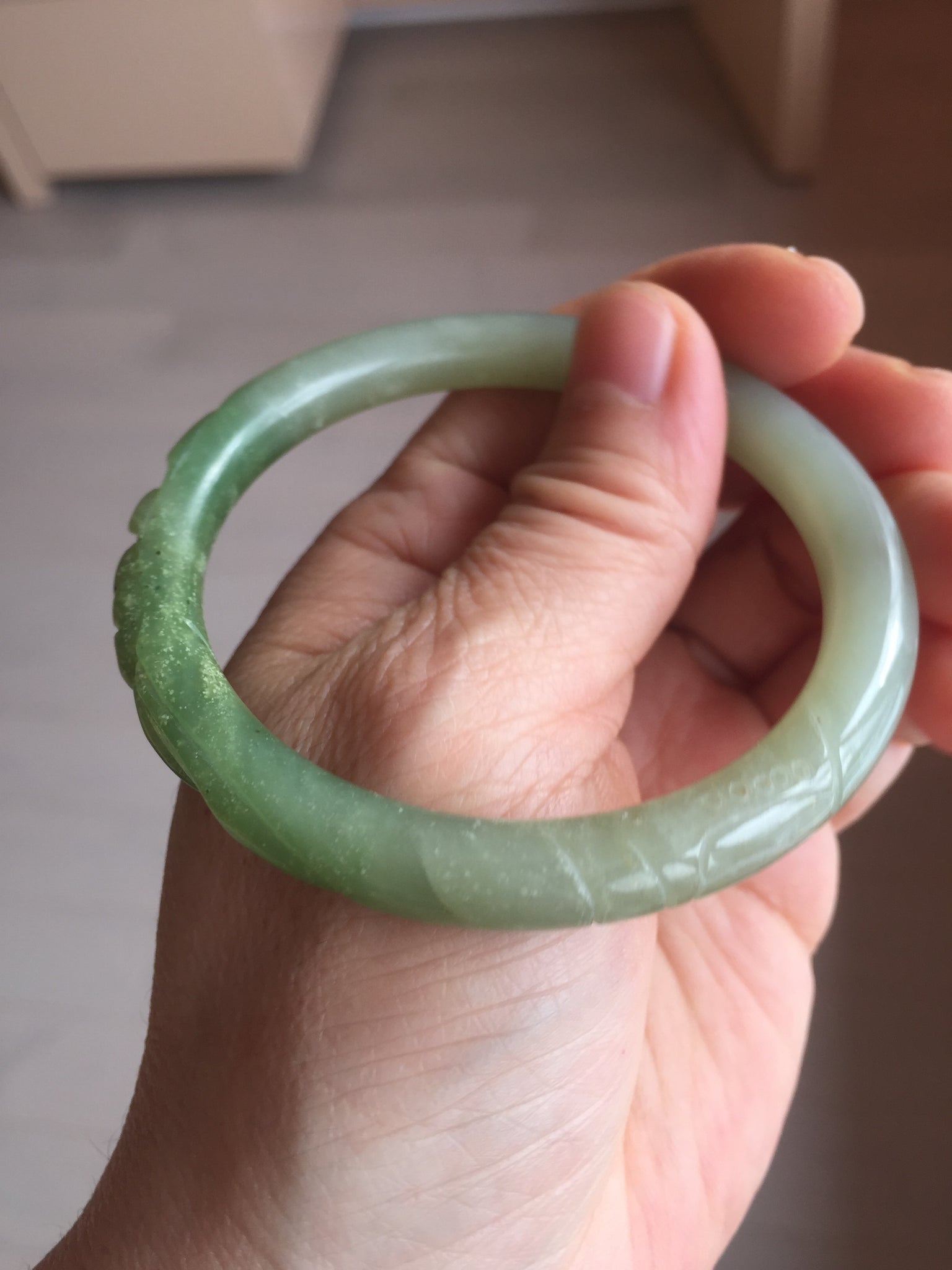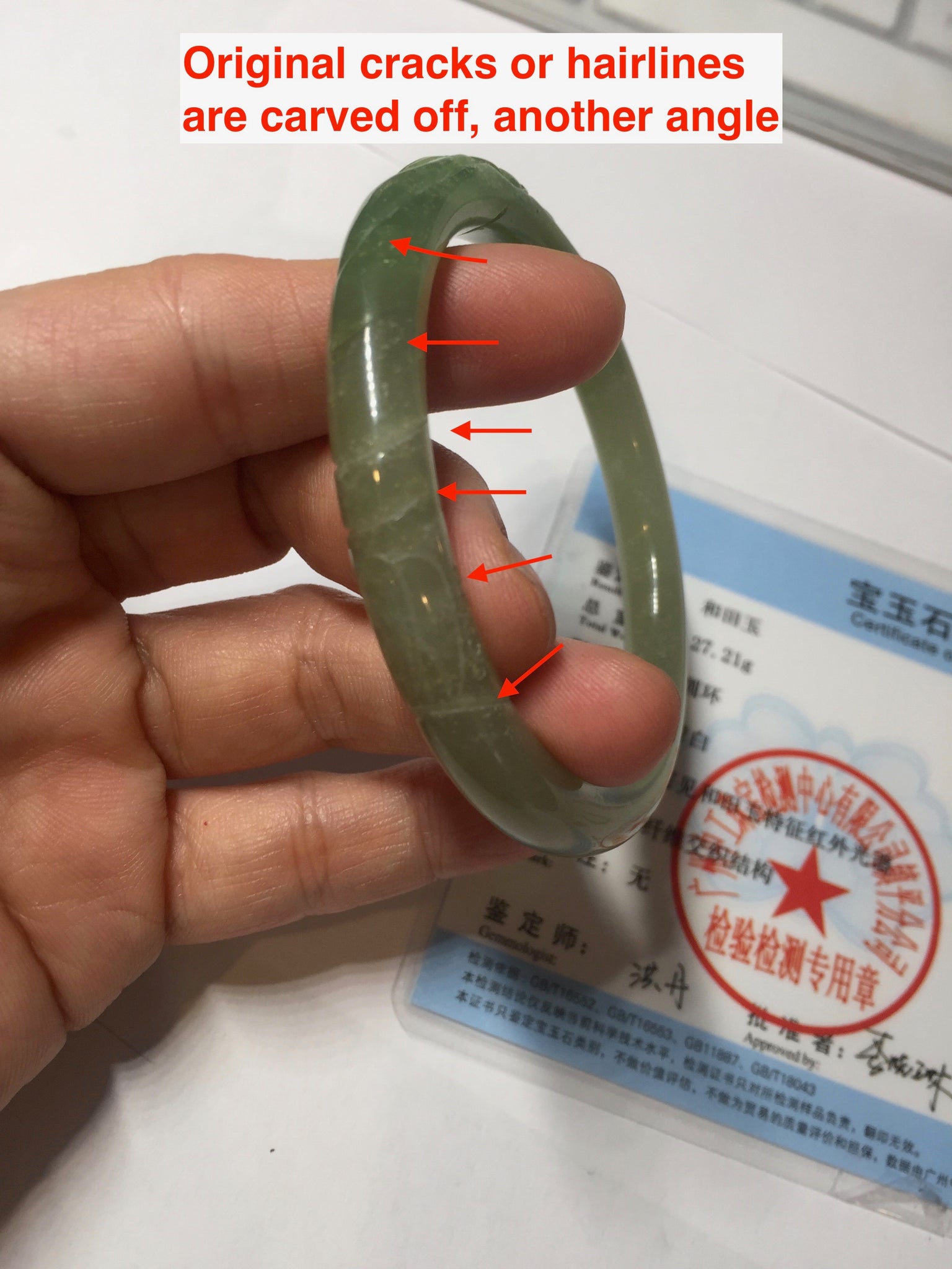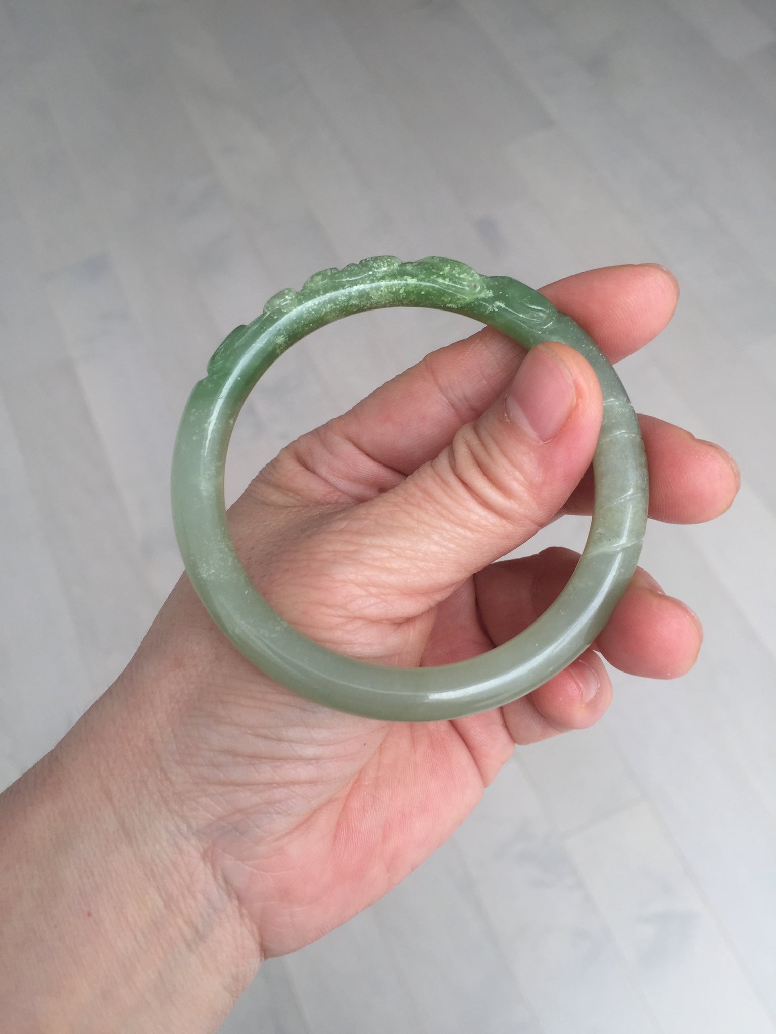Imperfections: Some original cracks or hairlines were carved off. The bangle is still firm. Some water lines. Some snowy white cotton spots. Has some gray color.