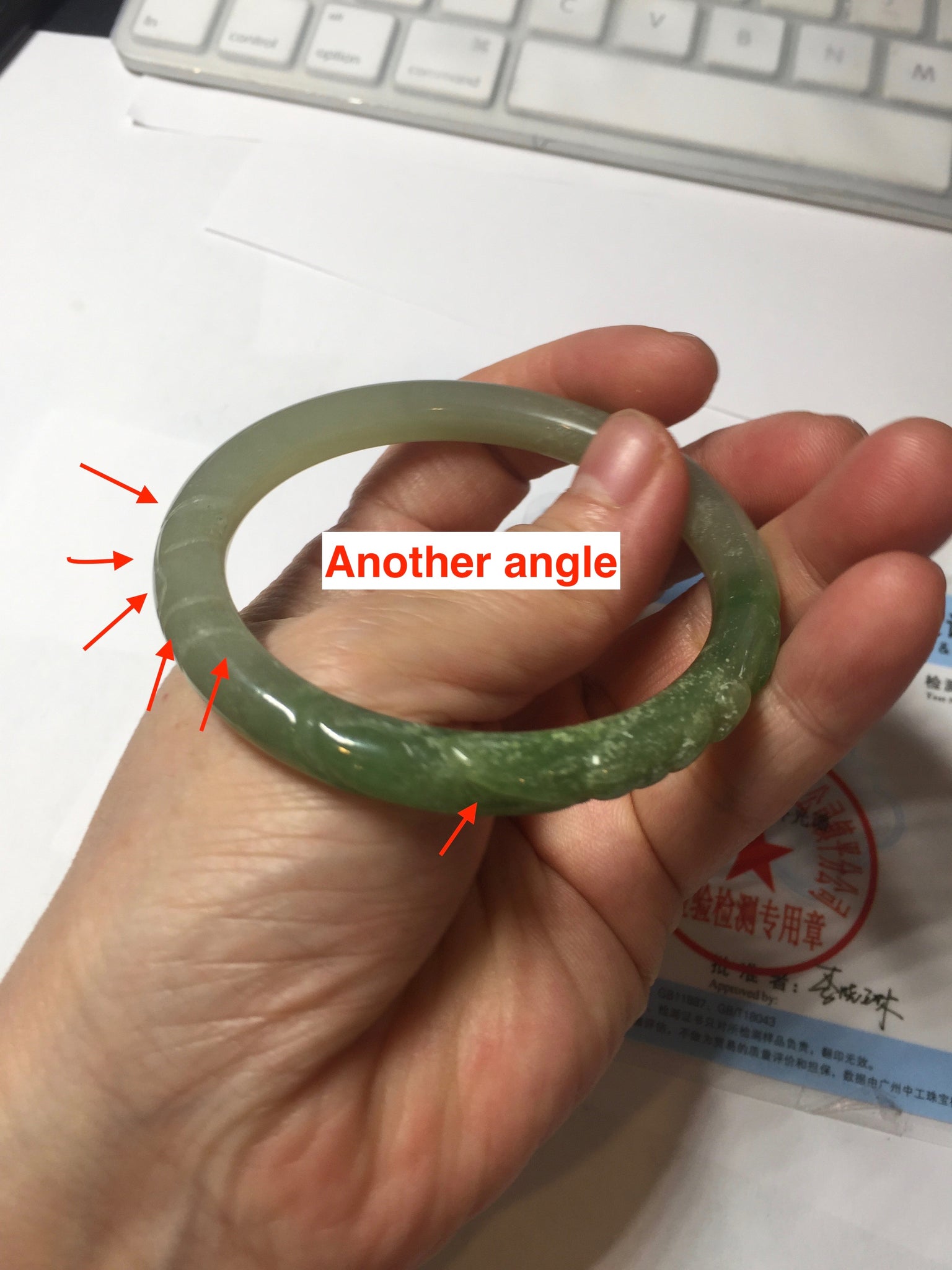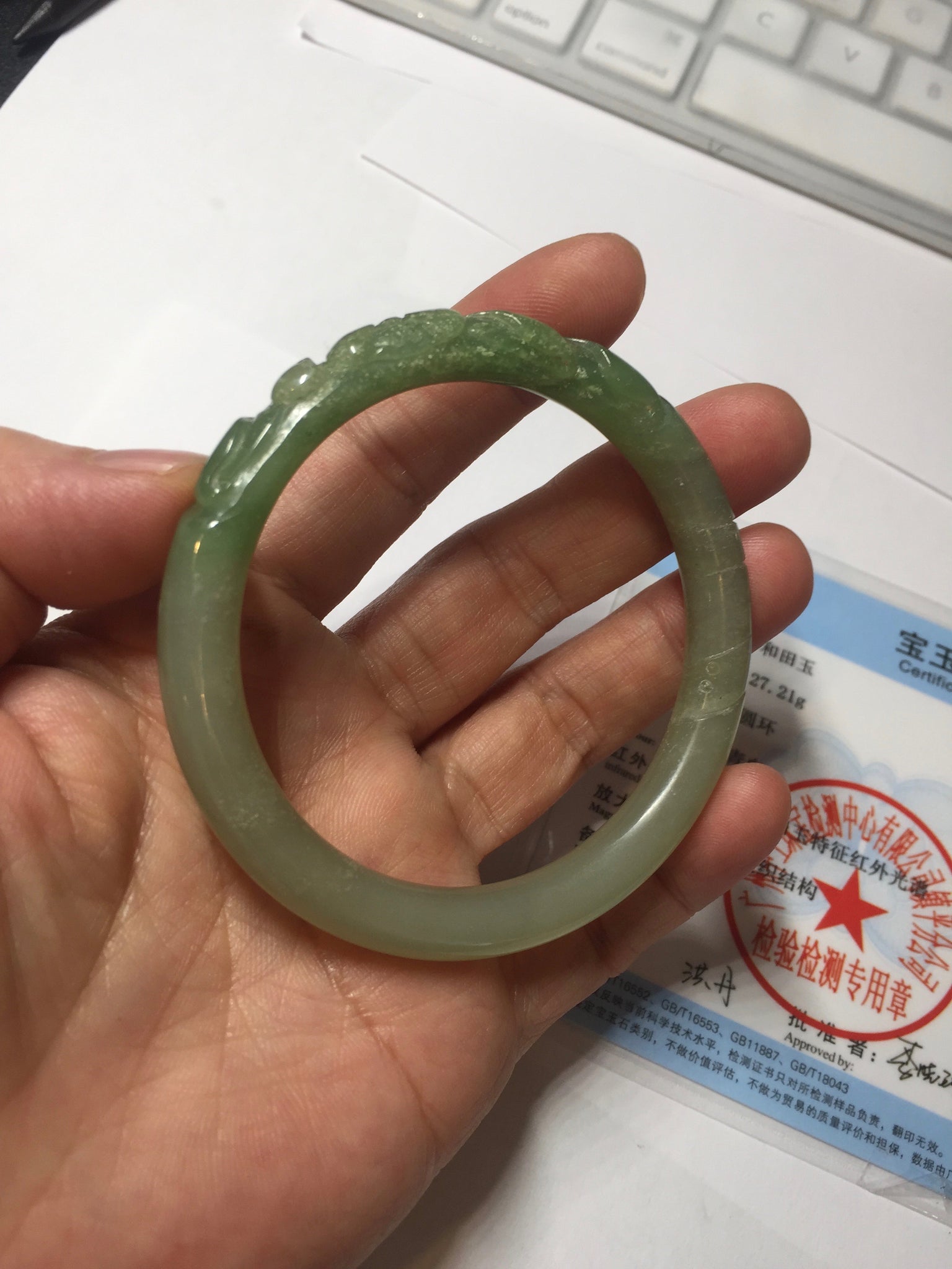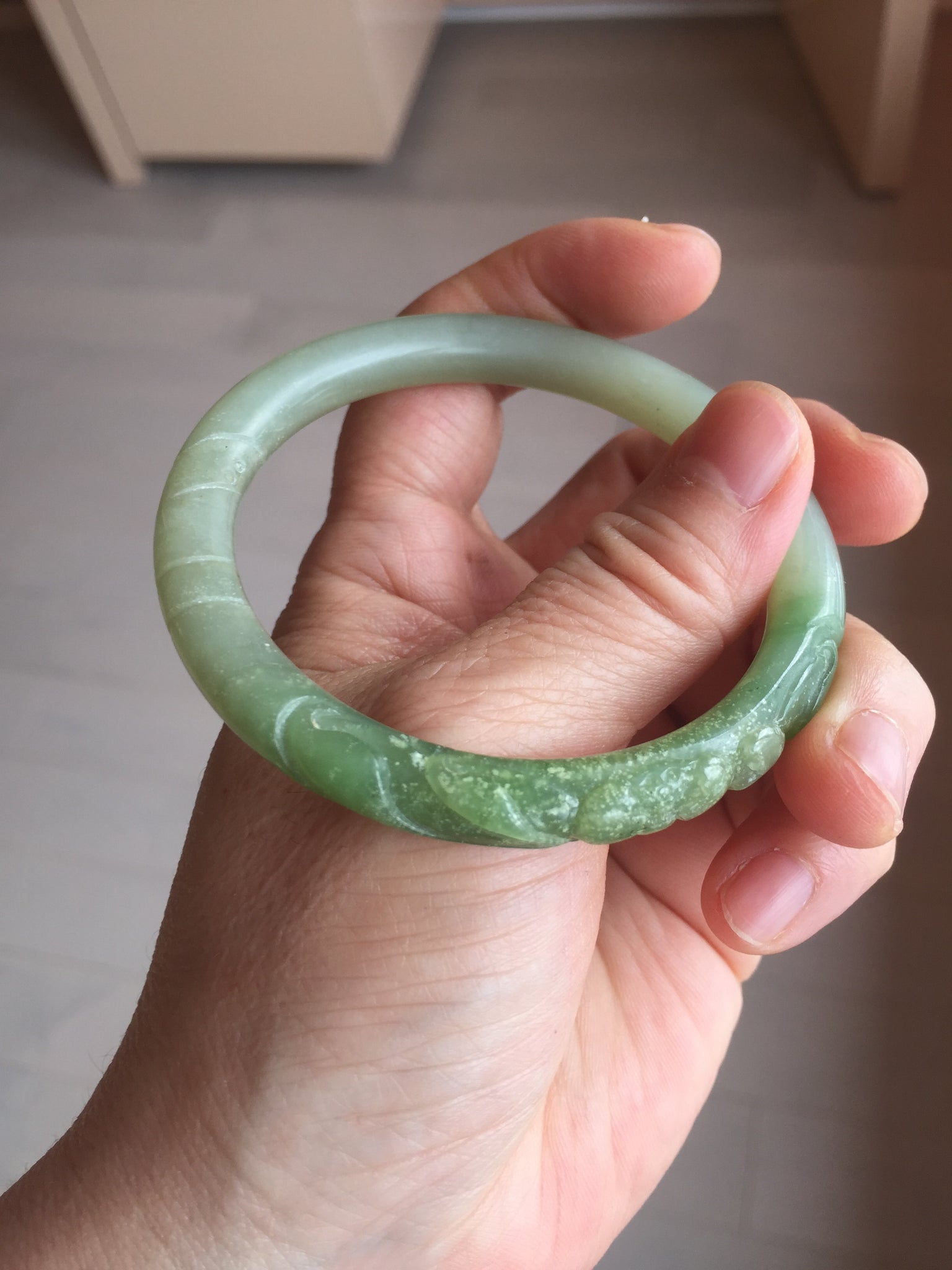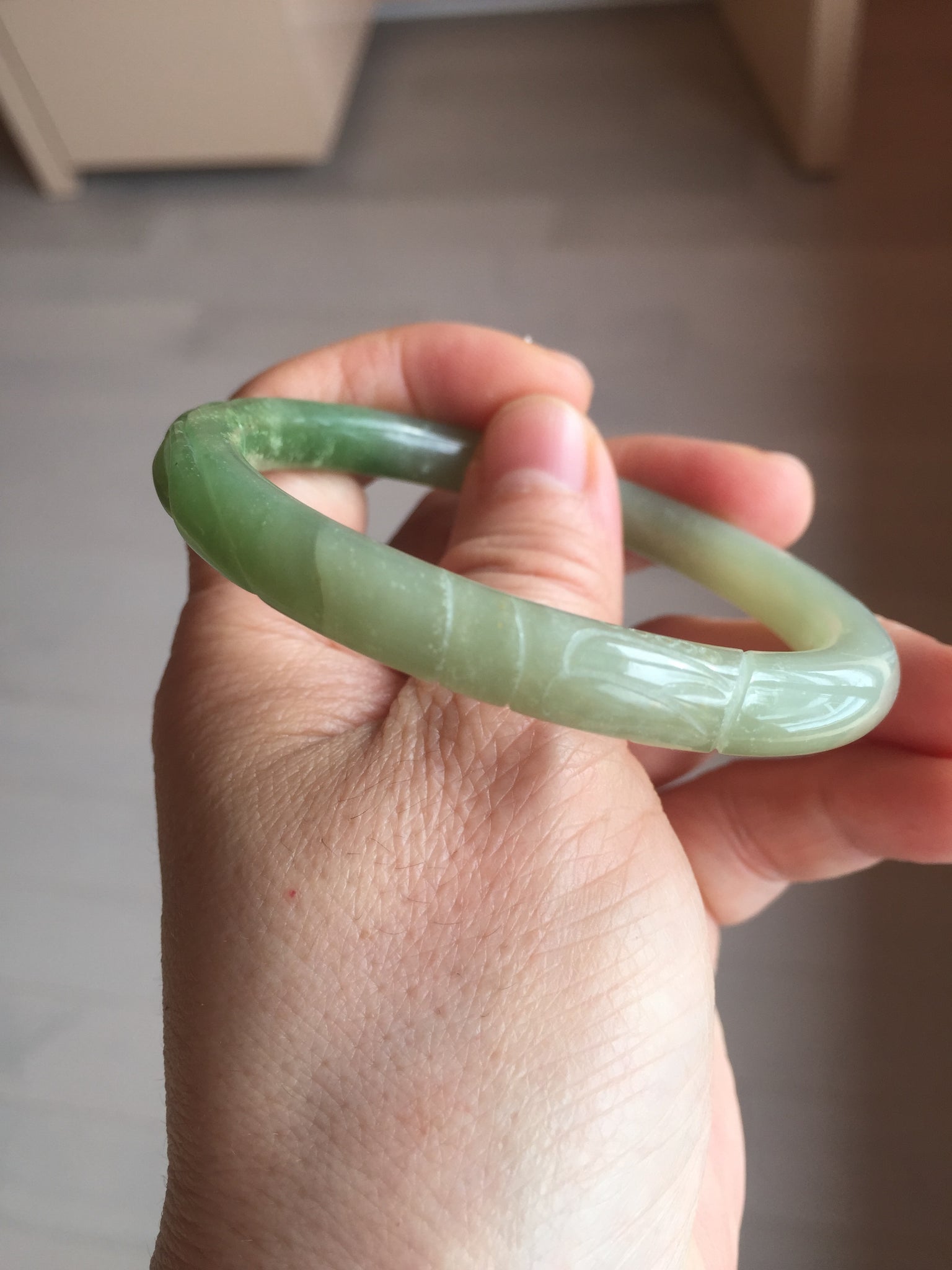 Imperfections: Some original cracks or hairlines were carved off. The bangle is still firm. Some water lines. Some snowy white cotton spots. Has some gray color.