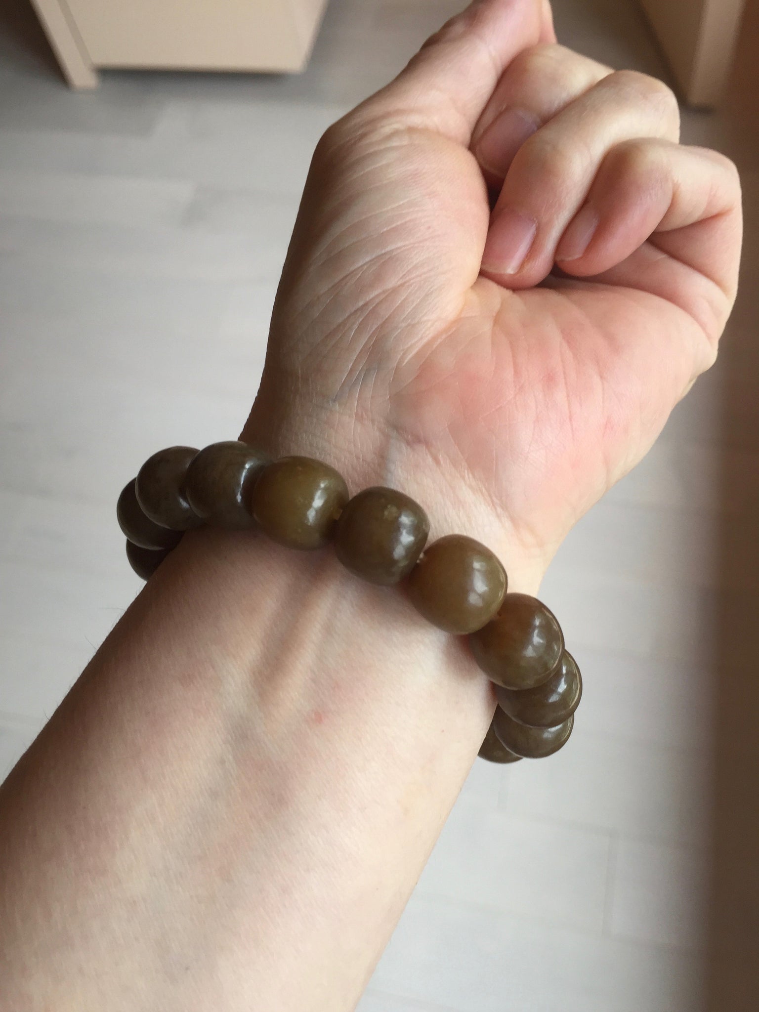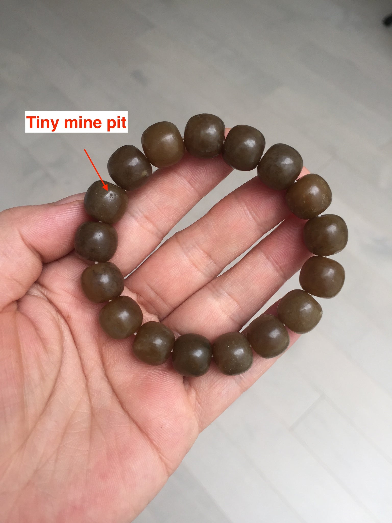 No crack. No hairline. Some beads may have cotton spots, tiny mine pits, and black spots. Some nephrite jade structures are visible. The photo is slightly better than the actual item.
