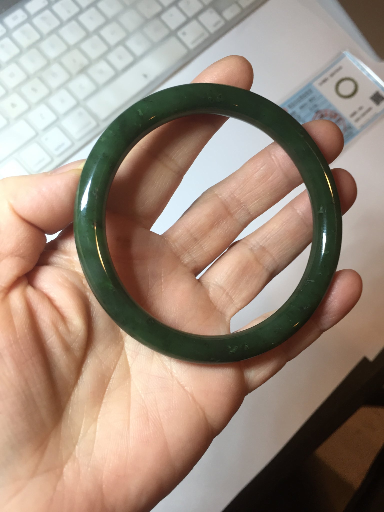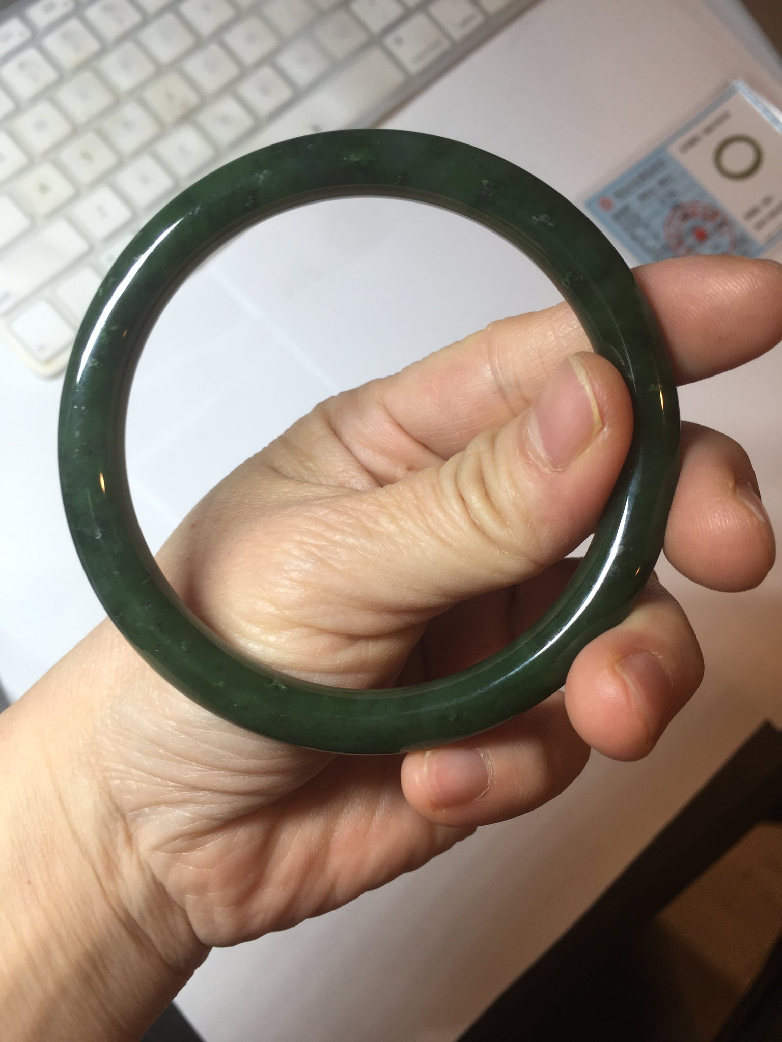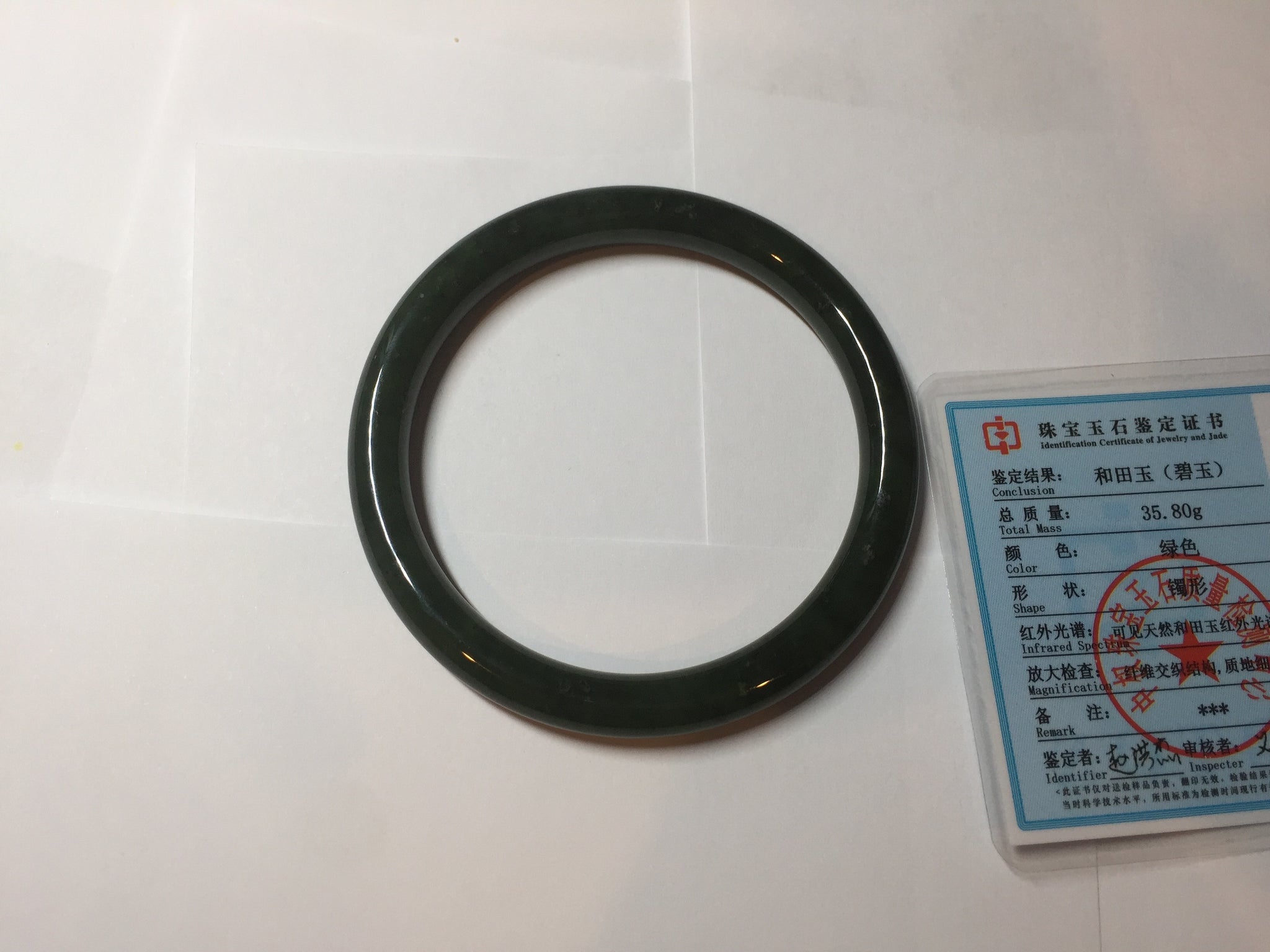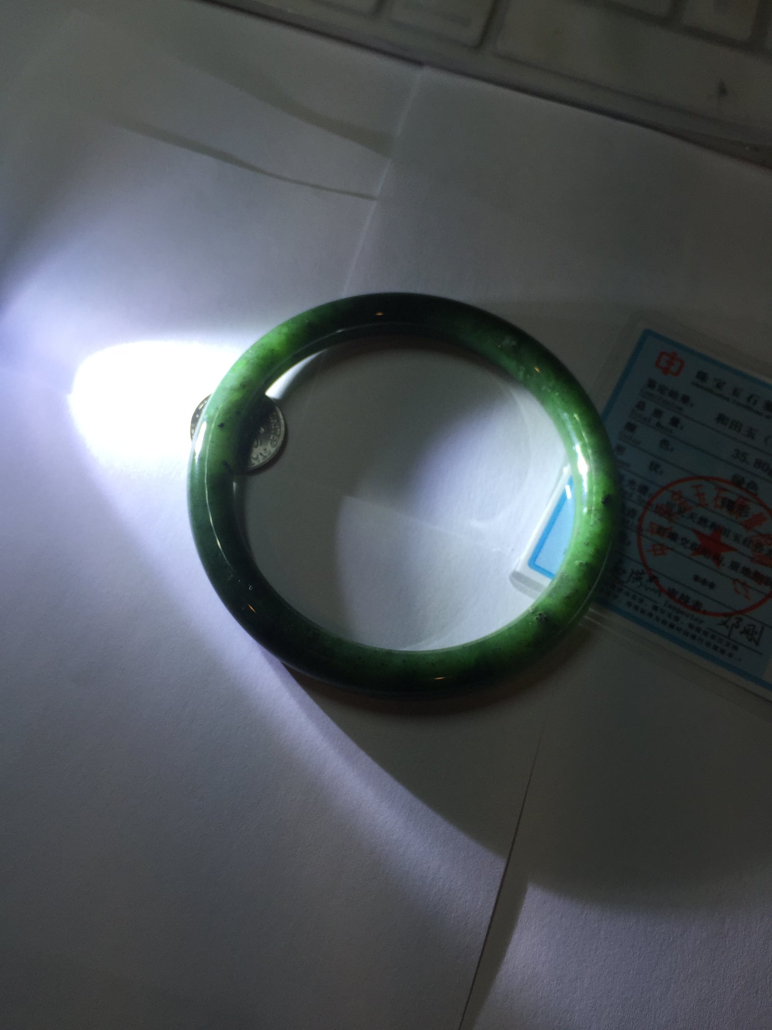 Imperfections: No crack. No hairline. Black spots. Some cotton spots. Some black cloudiness and spots. Has black colors. Under normal light, it is close to dark green/black.