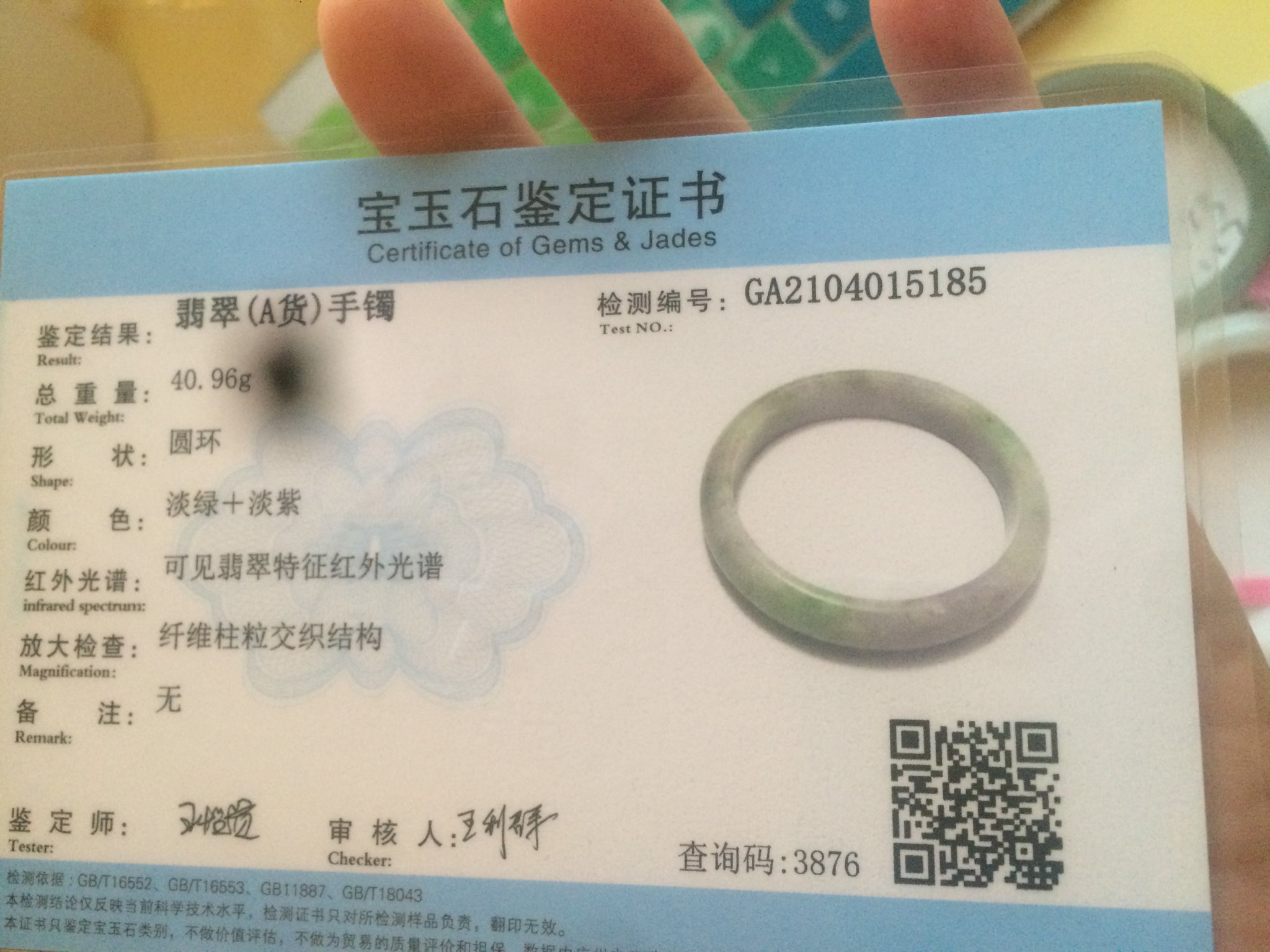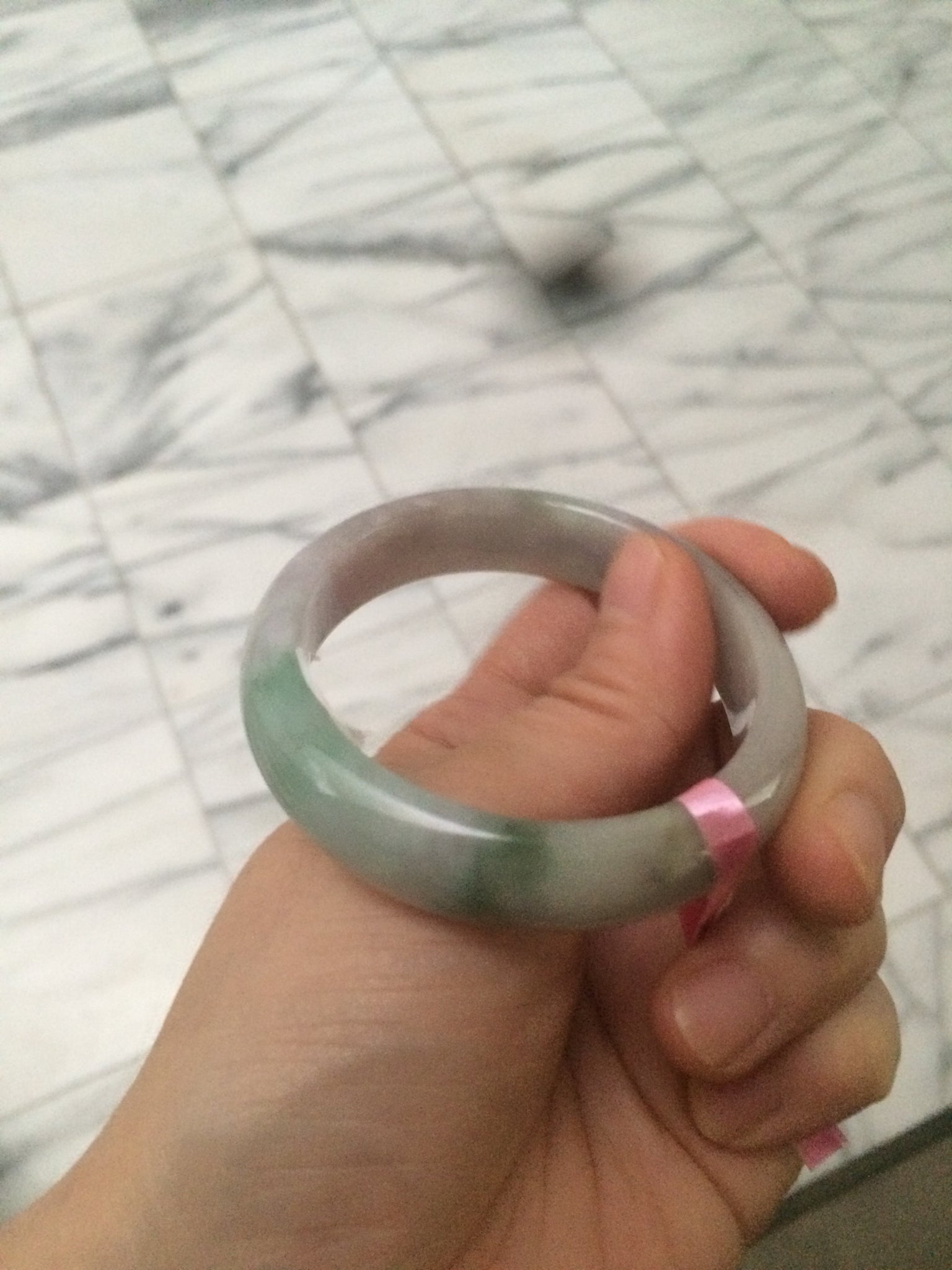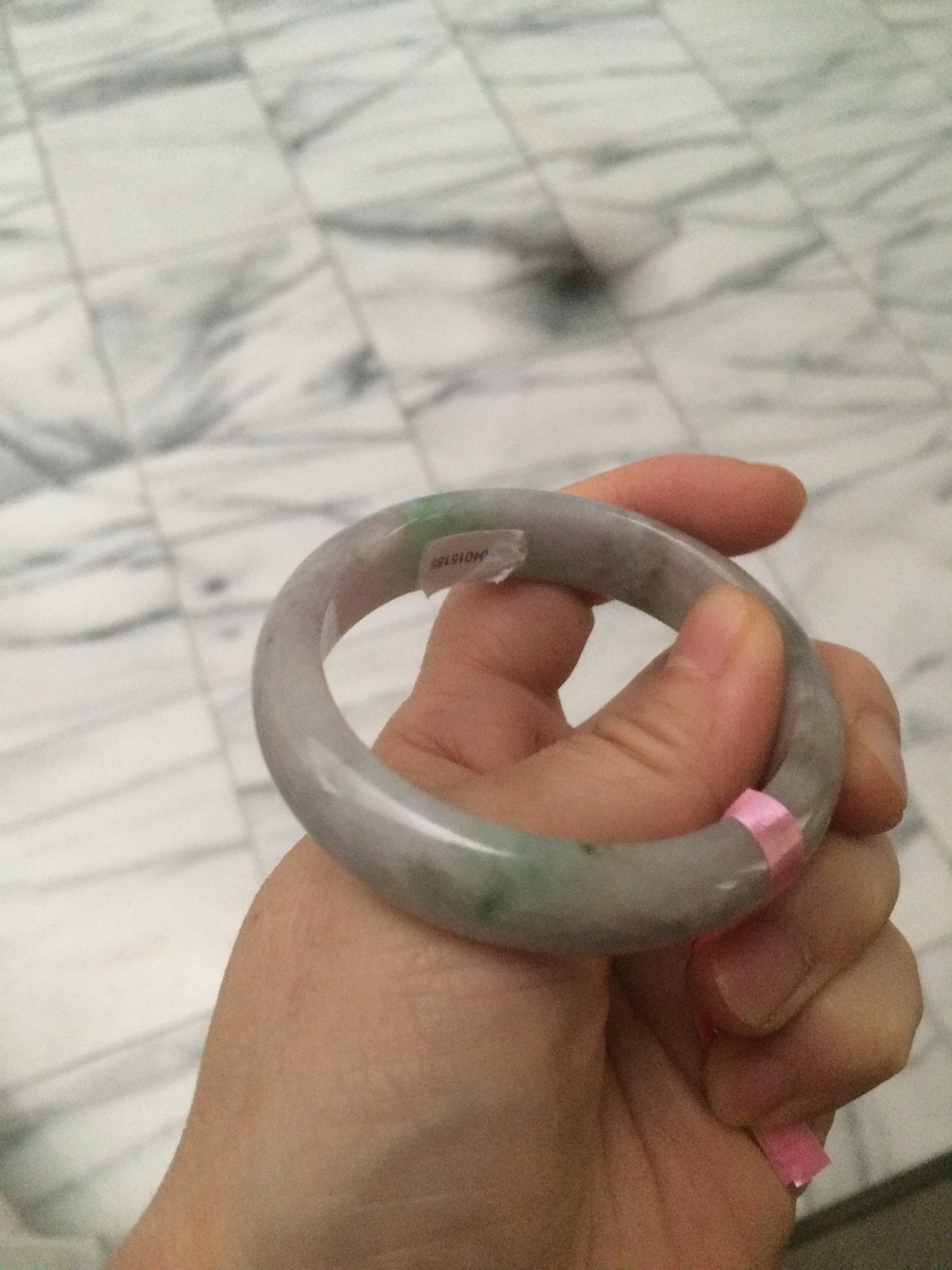 Some cracks, one is deep but wasn't cut through the whole bangle. Some hairlines and brown spots. This bangle also has a gray color. The purple is lighter than the photos since purple is more camera-friendly. Has some gray color.