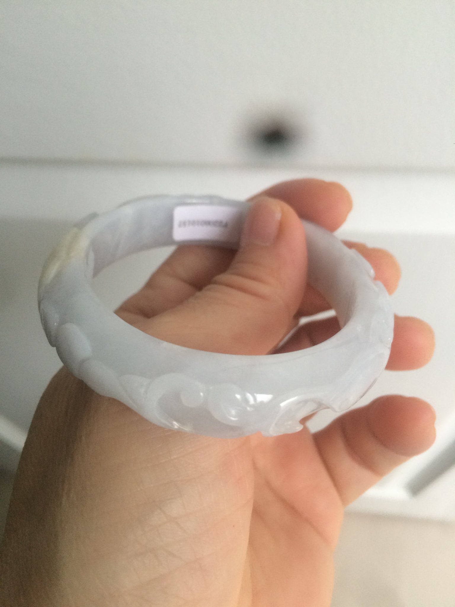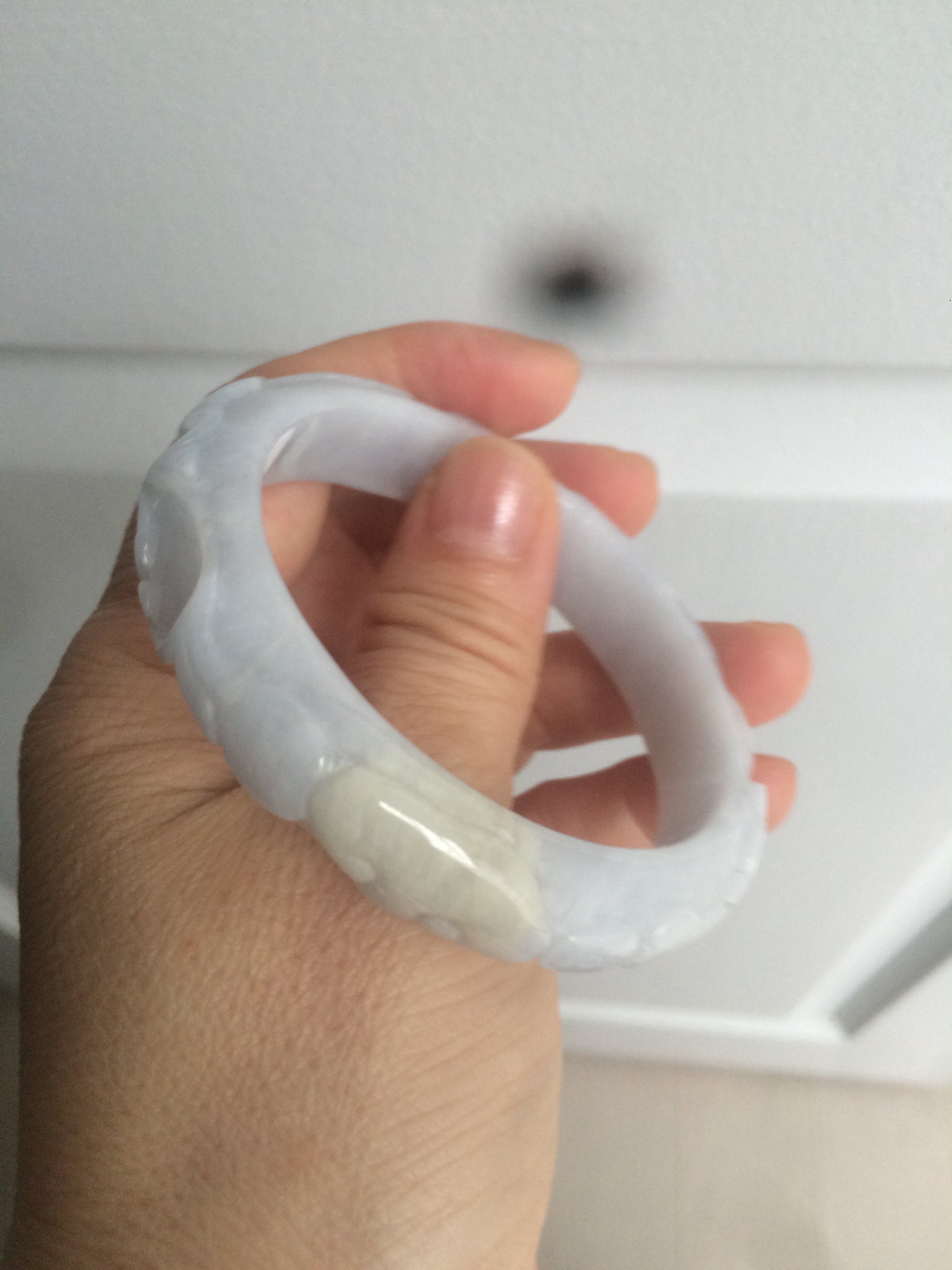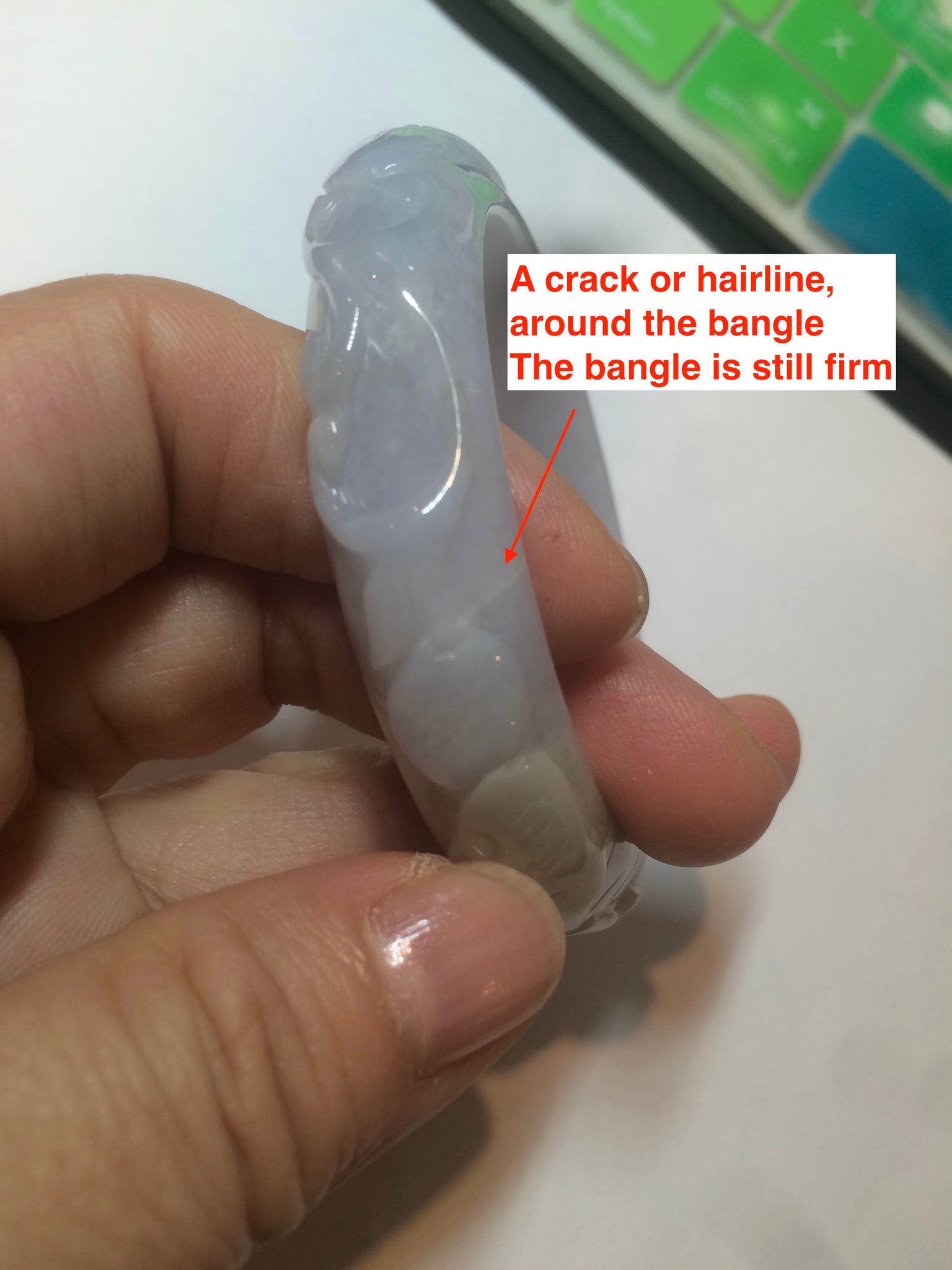 One around the bangle crack or hairline. This may decrease the firmness of the bangle. I thing the bangle is still firm since it makes high pitched sound when clicked. 2 Cotton areas. Cotton spots. Not transparent. The purple is extremely light. Lighter than photos.