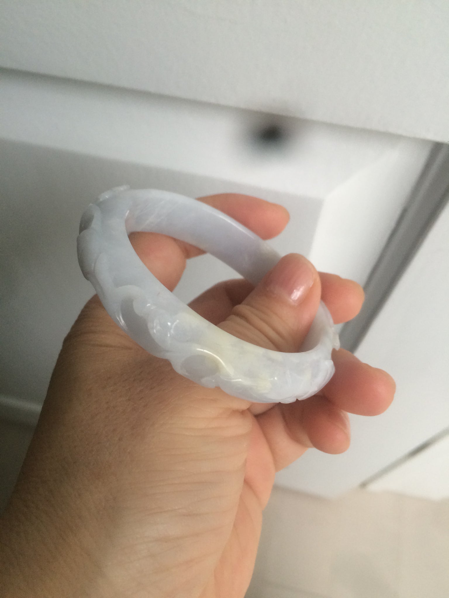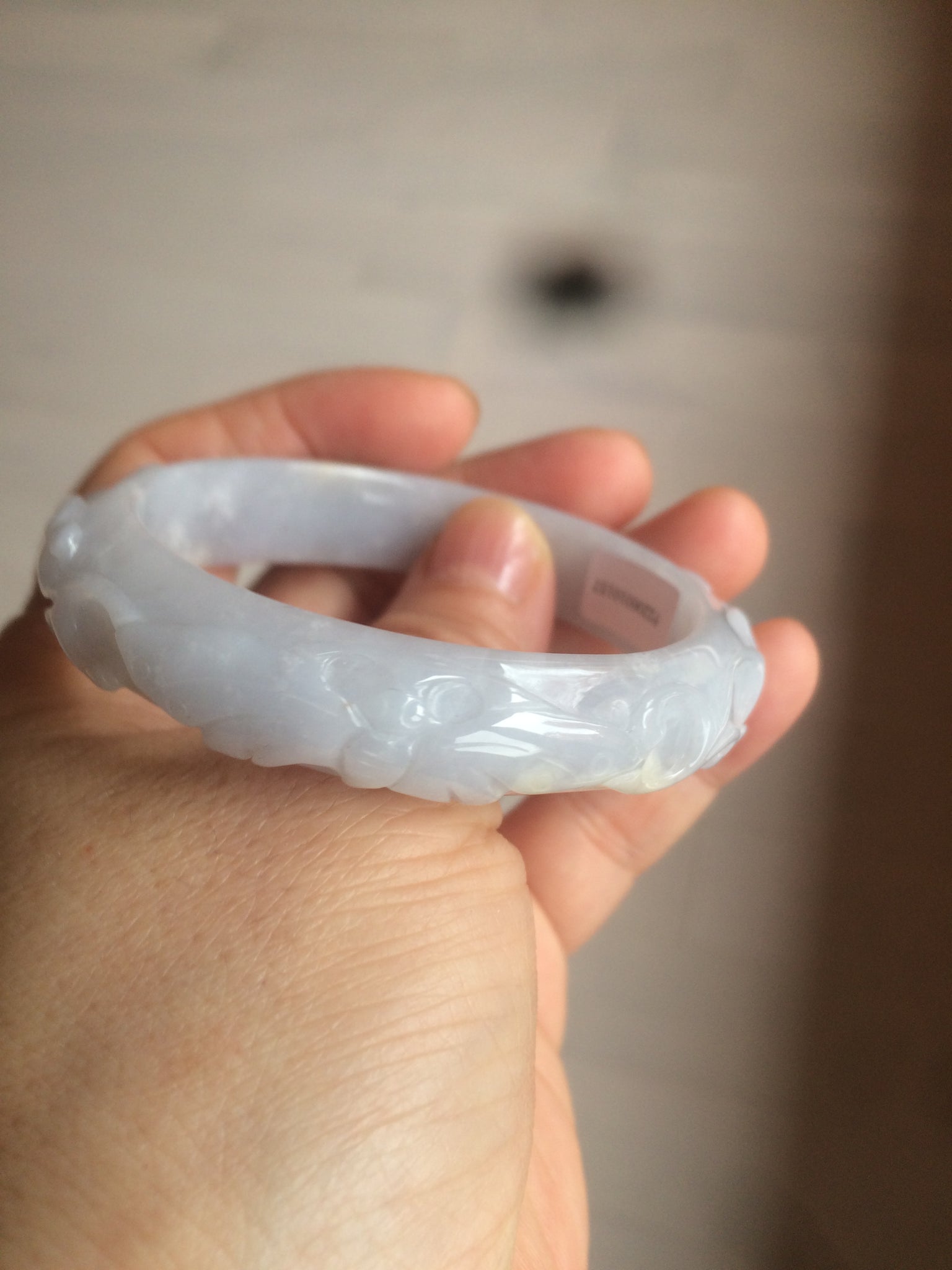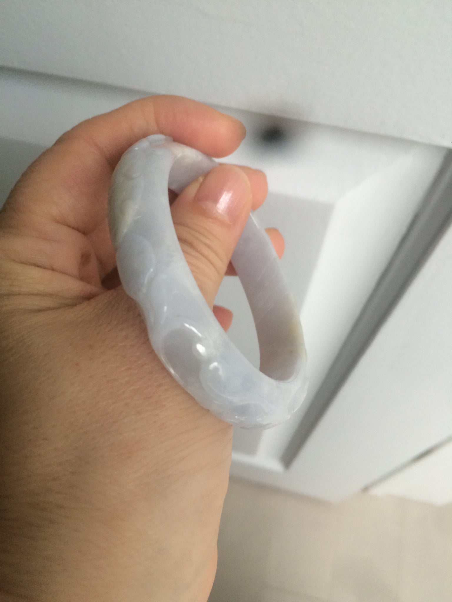 One around the bangle crack or hairline. This may decrease the firmness of the bangle. I thing the bangle is still firm since it makes high pitched sound when clicked. 2 Cotton areas. Cotton spots. Not transparent. The purple is extremely light. Lighter than photos.