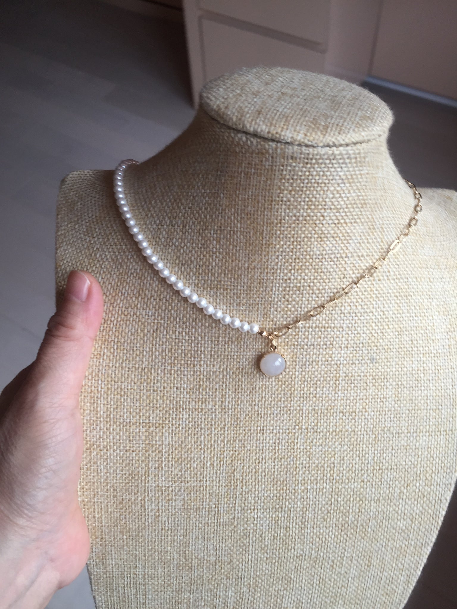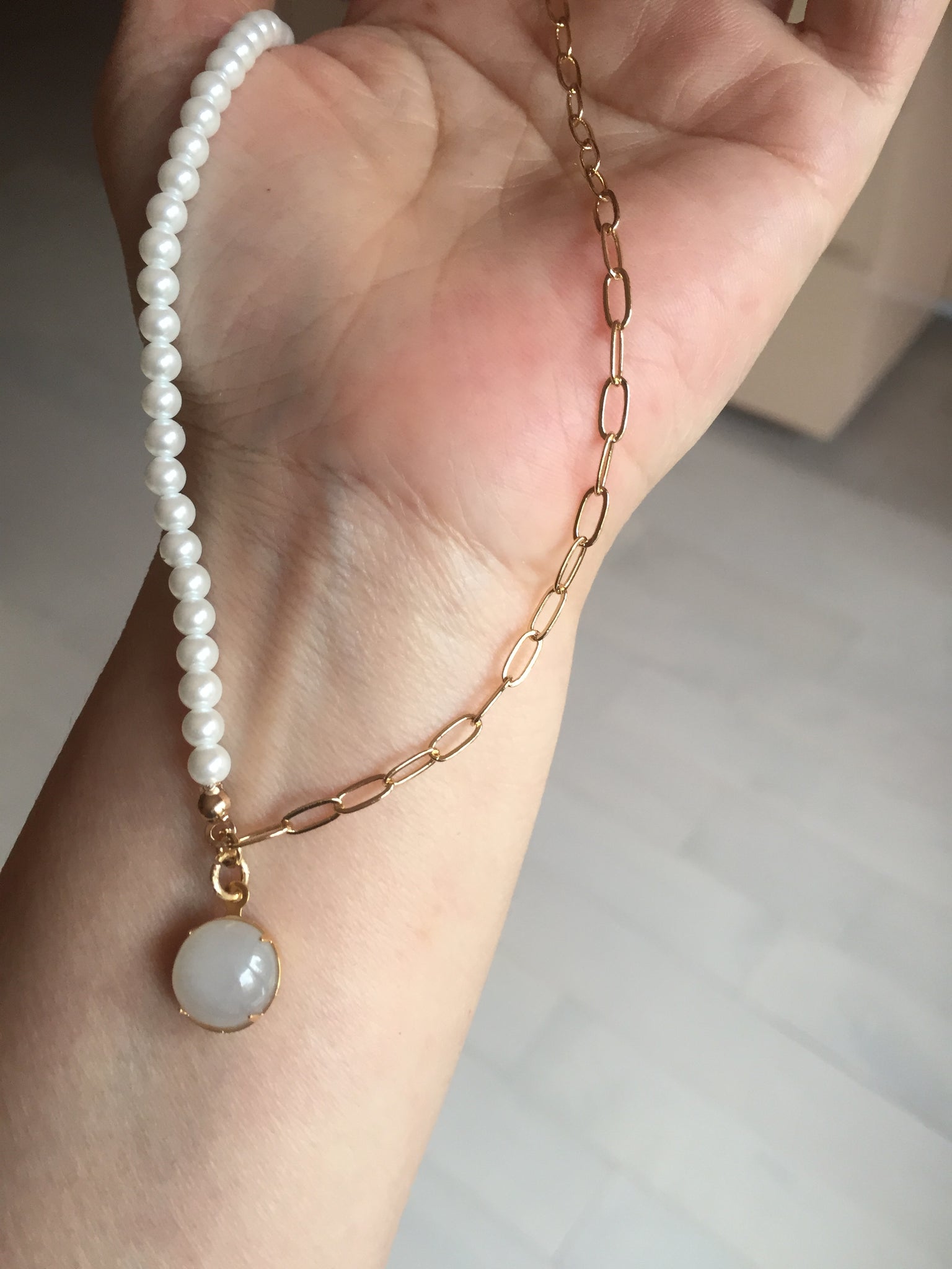 The pearls are faux pearl. We intentionally use lightweight faux pearls on the beaded side. Real pearls are much heavier and would pull the necklace off-center, causing the heavier side to slide to the lowest point while wearing. The faux pearls keep the overall weight balanced so the pendant sits beautifully in front.