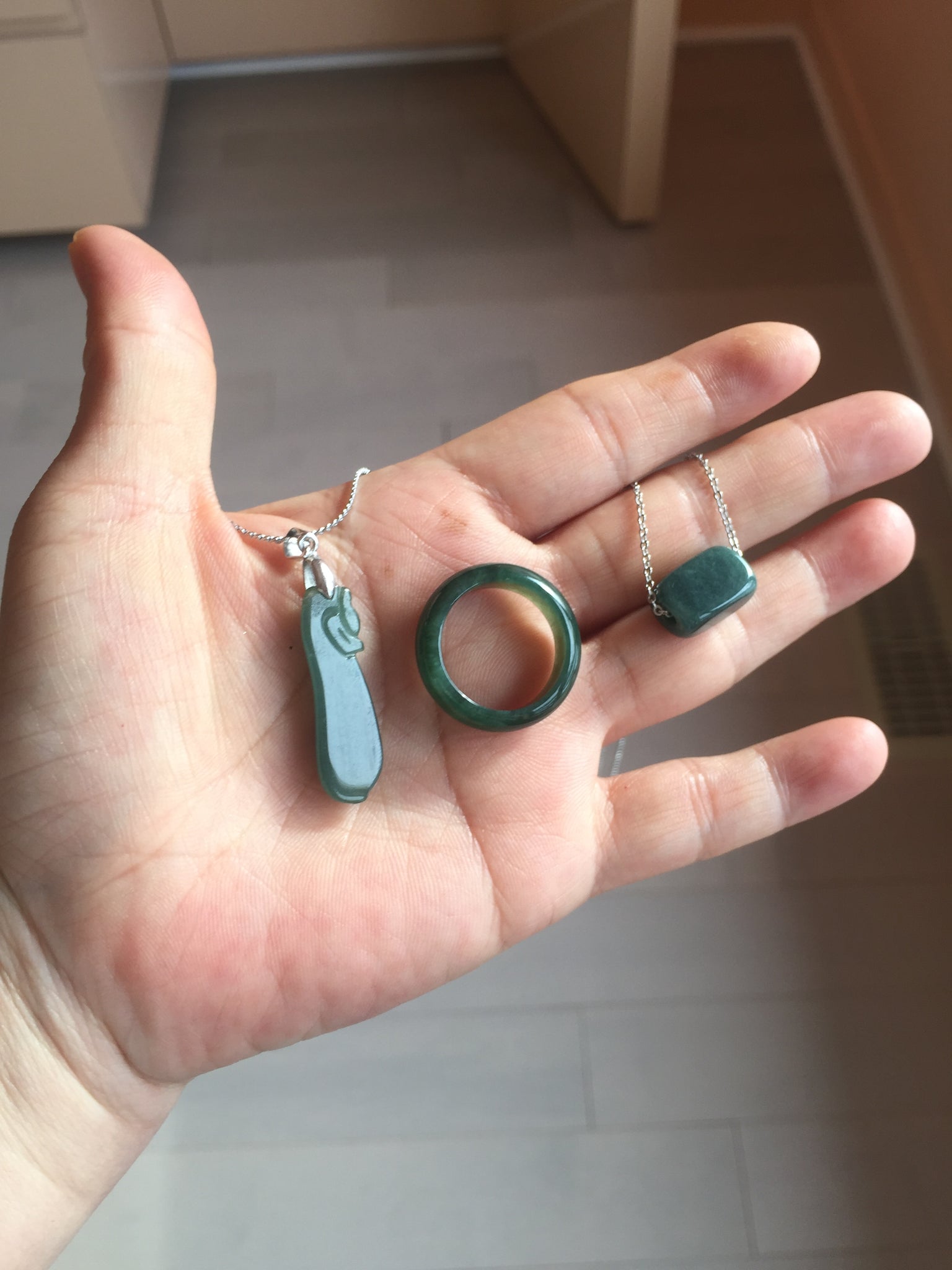 3 pieces Type A 100% Natural dark green/black Jadeite Jade ring blessed melon(福瓜), rectangle safety bead pendants set BK133
