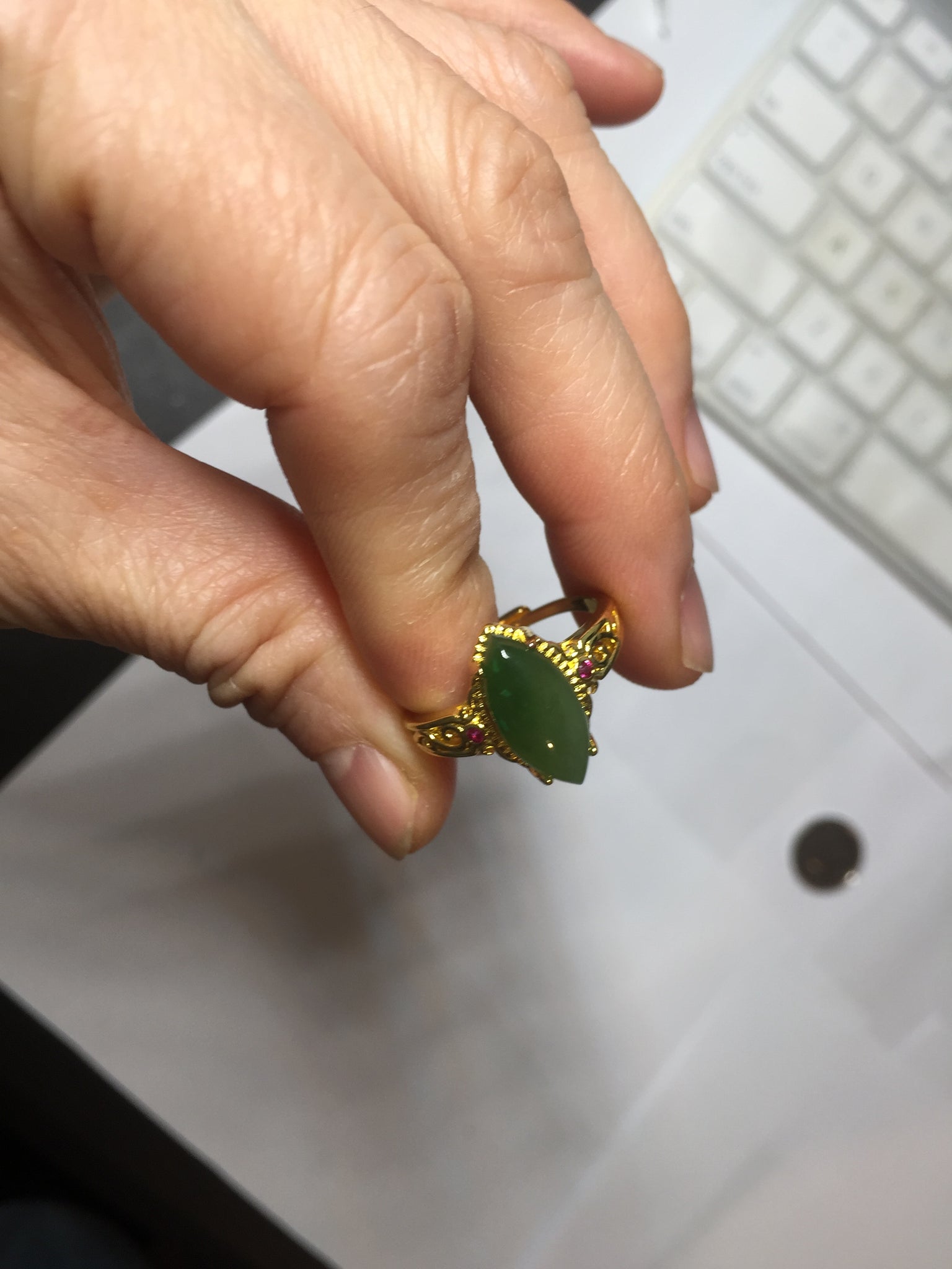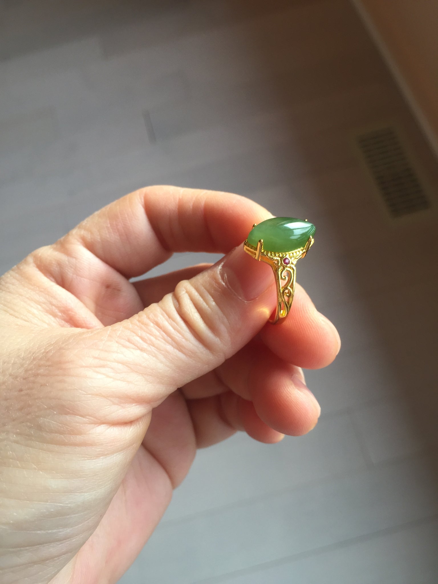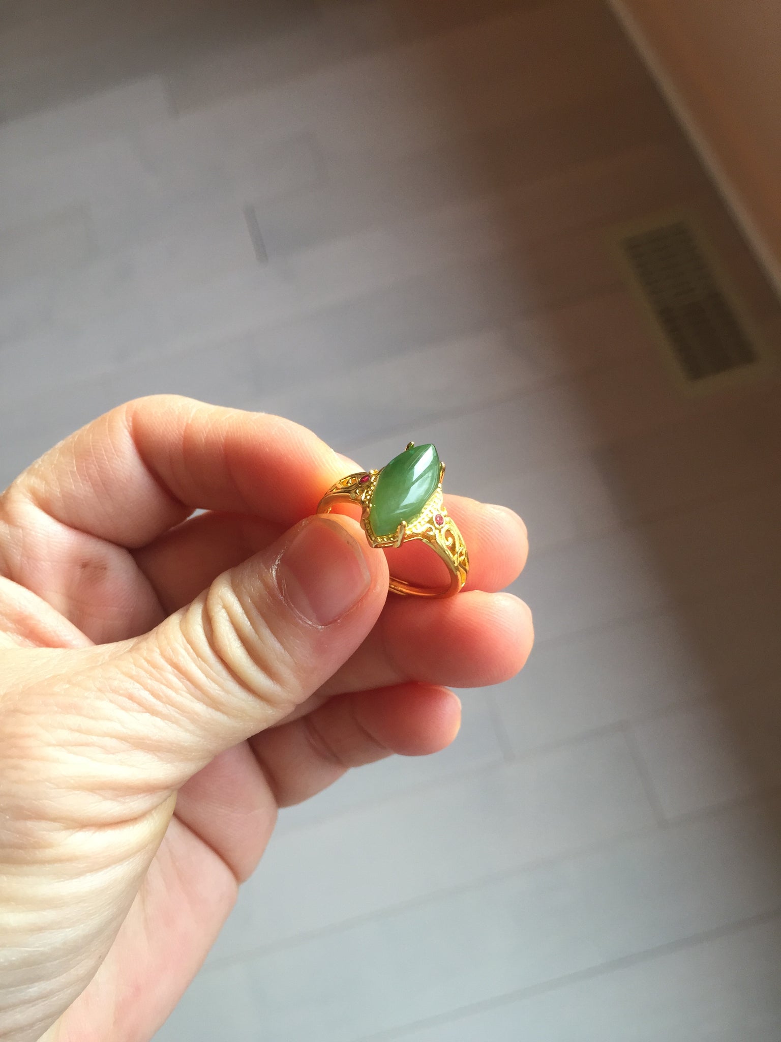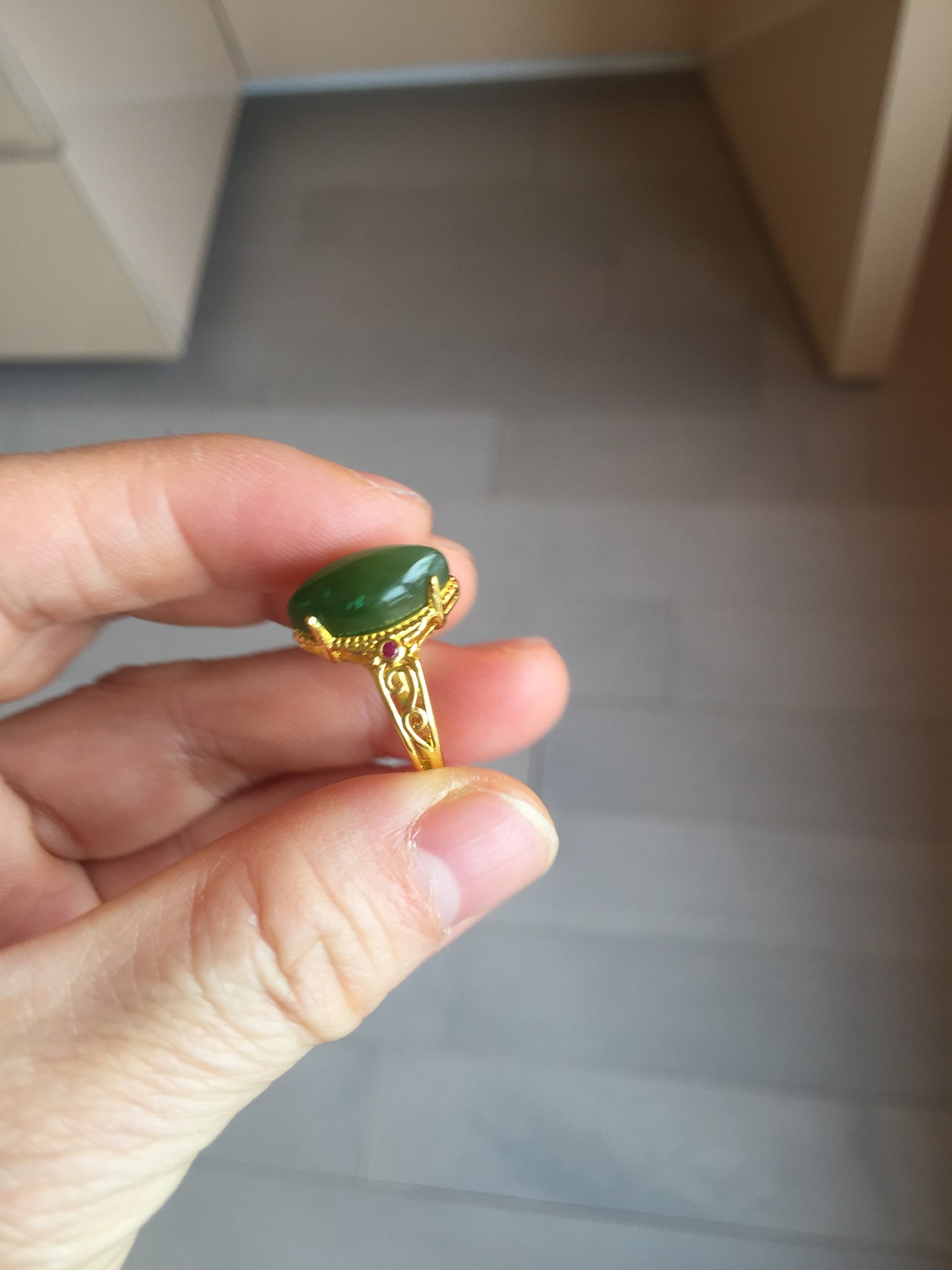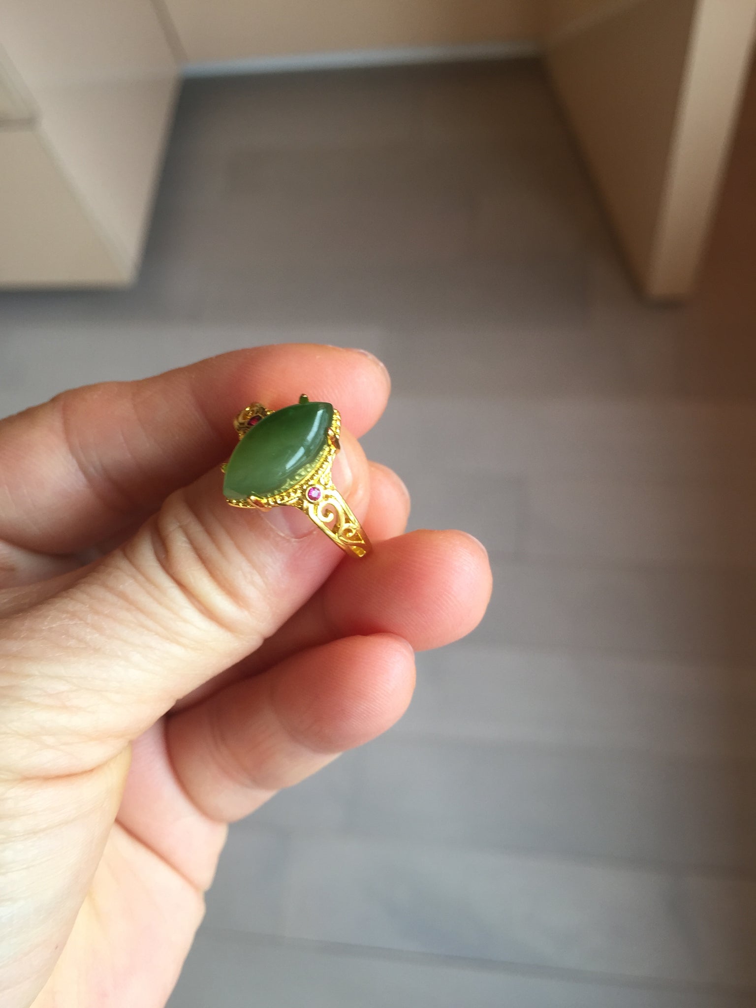 No crack. No hairline. Some small cotton areas. One of them with rough surface due to the mineral difference. Has a little bit of gray/black color. The two red beads on the holder are man-made stones.