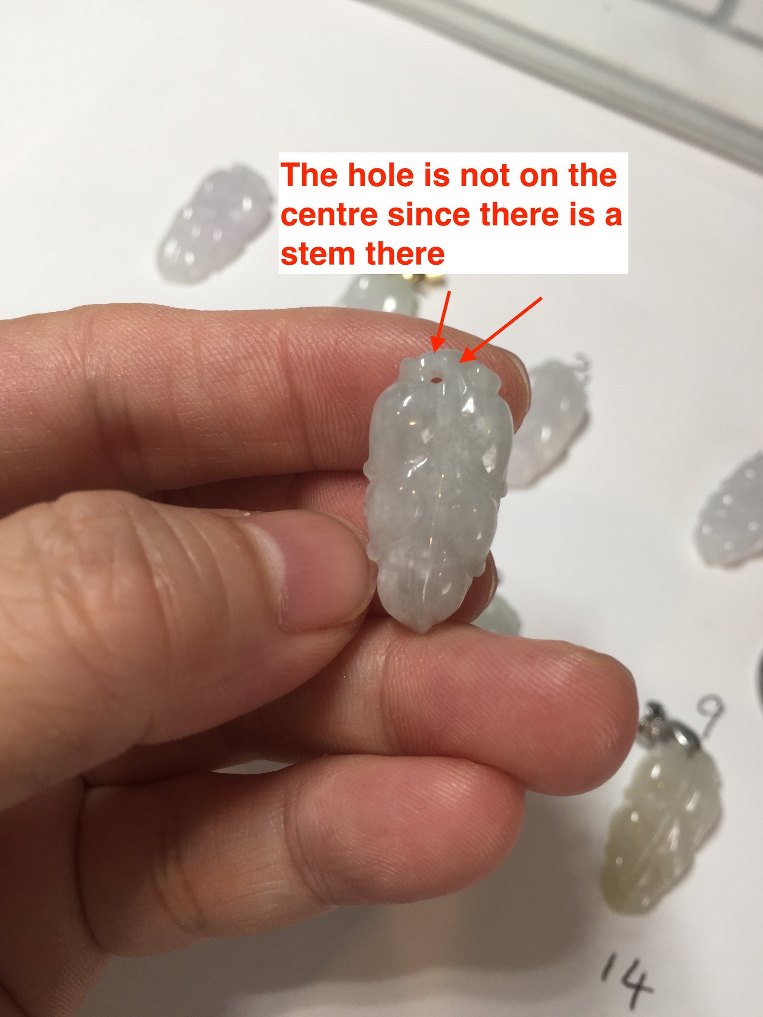 All have no cracks or hairlines. The texture of the purple leaves is not so delicate. They may have color roots, cotton lines, and cotton areas. The pendant hole is not in the centre of the pendant since there is a stem there. It is not a flaw.