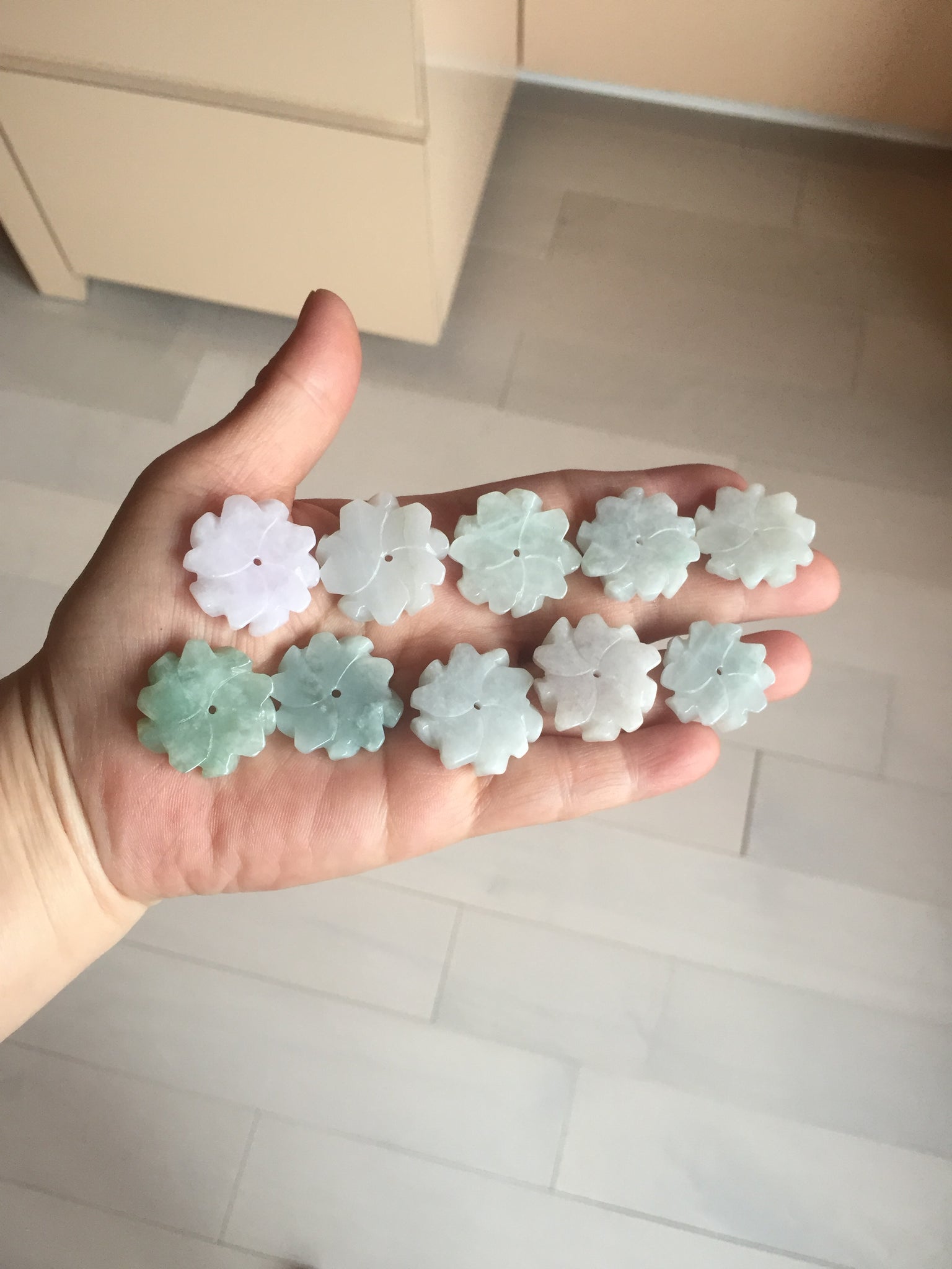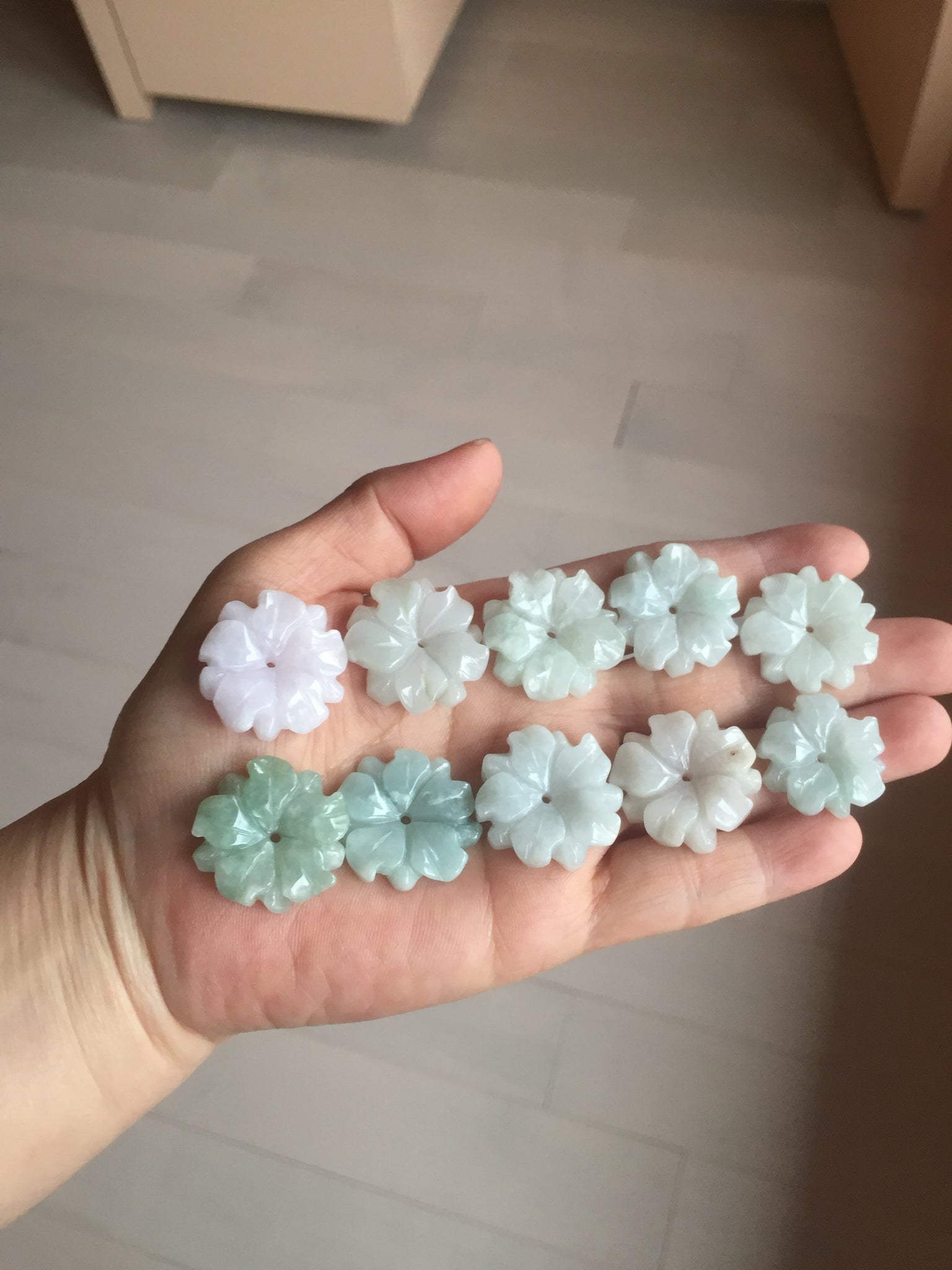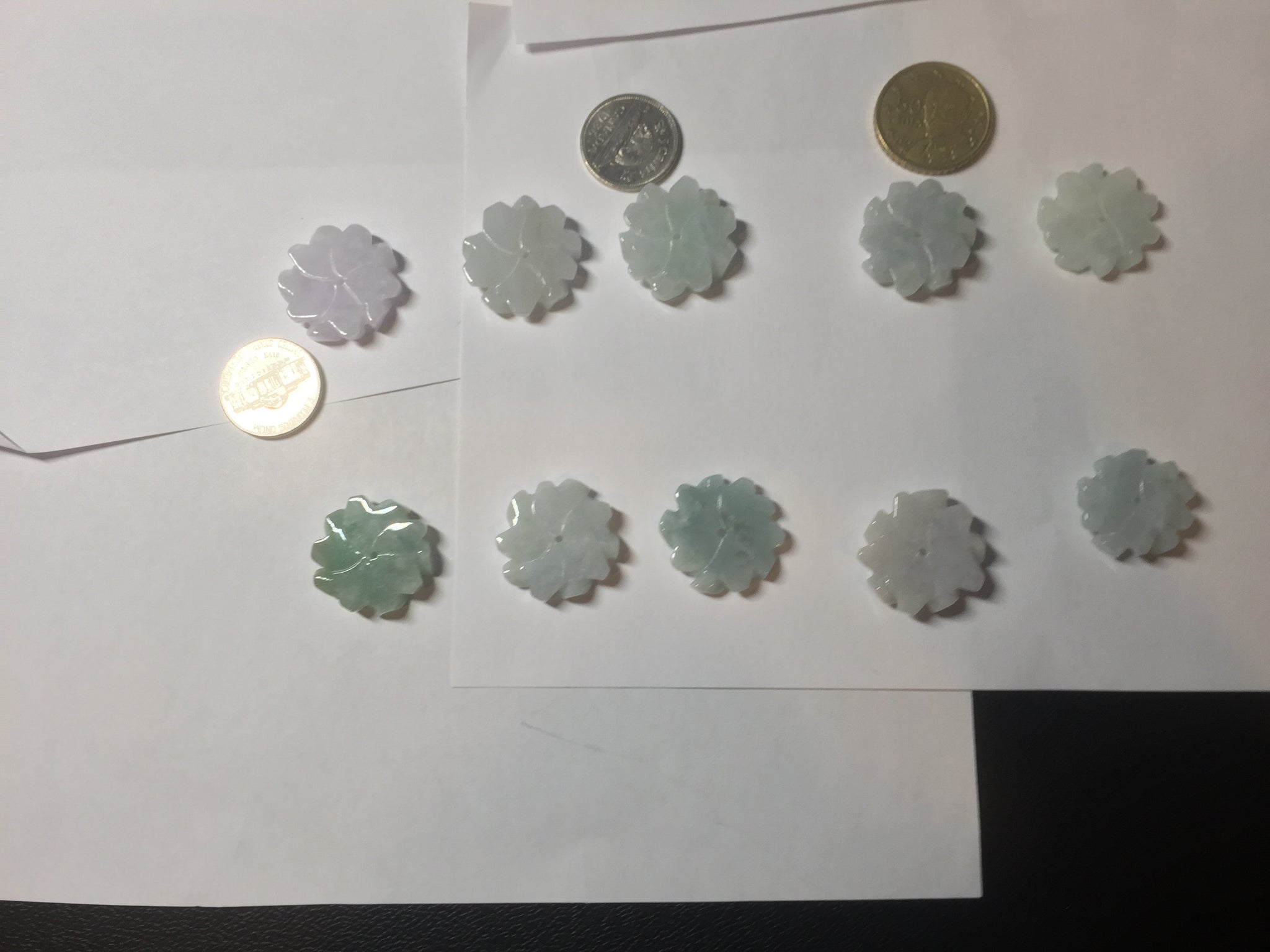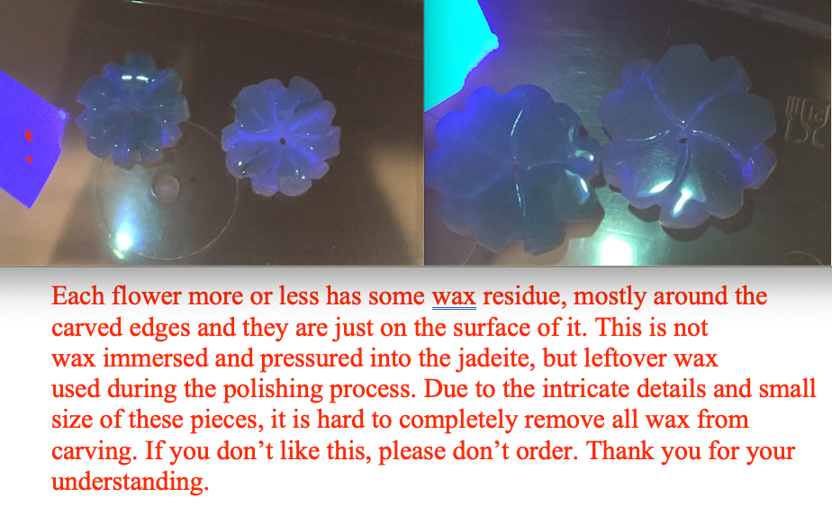 Each flower more or less has some wax residue, mostly around the carved edges and they are just on the surface of it. This is not wax immersed and pressured into the jadeite, but leftover wax used during the polishing process. Due to the intricate details and small size of these pieces, it is hard to completely remove all wax from carving. If you don’t like this, please don’t order. Thank you for your understanding.