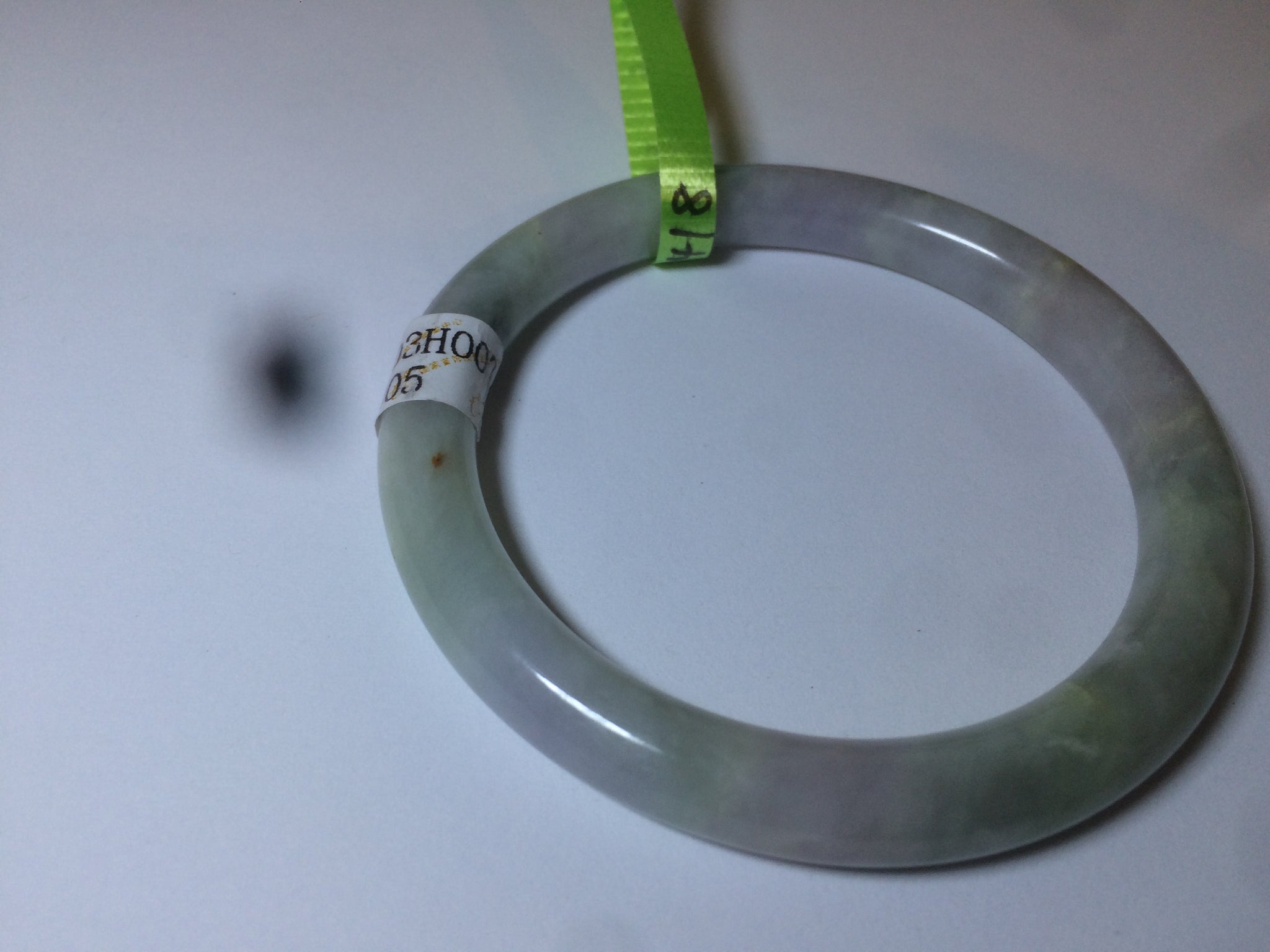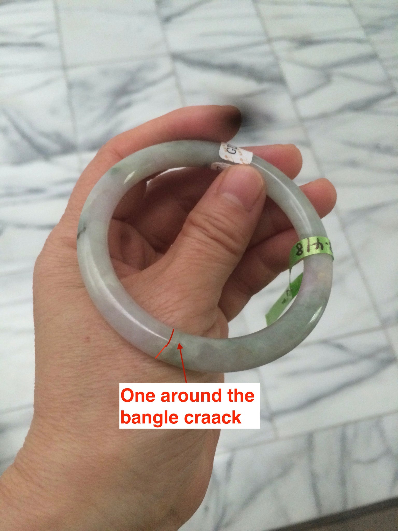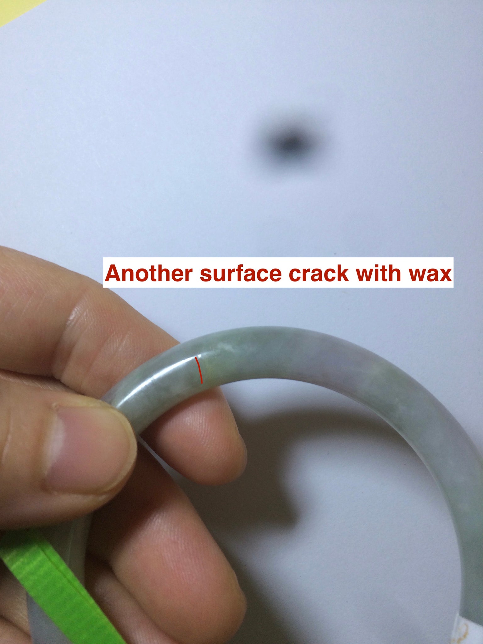 One around the bangle crack. the bangle is still firm. One small surface cracks with a tiny trace of wax. Cotton lines and spots.