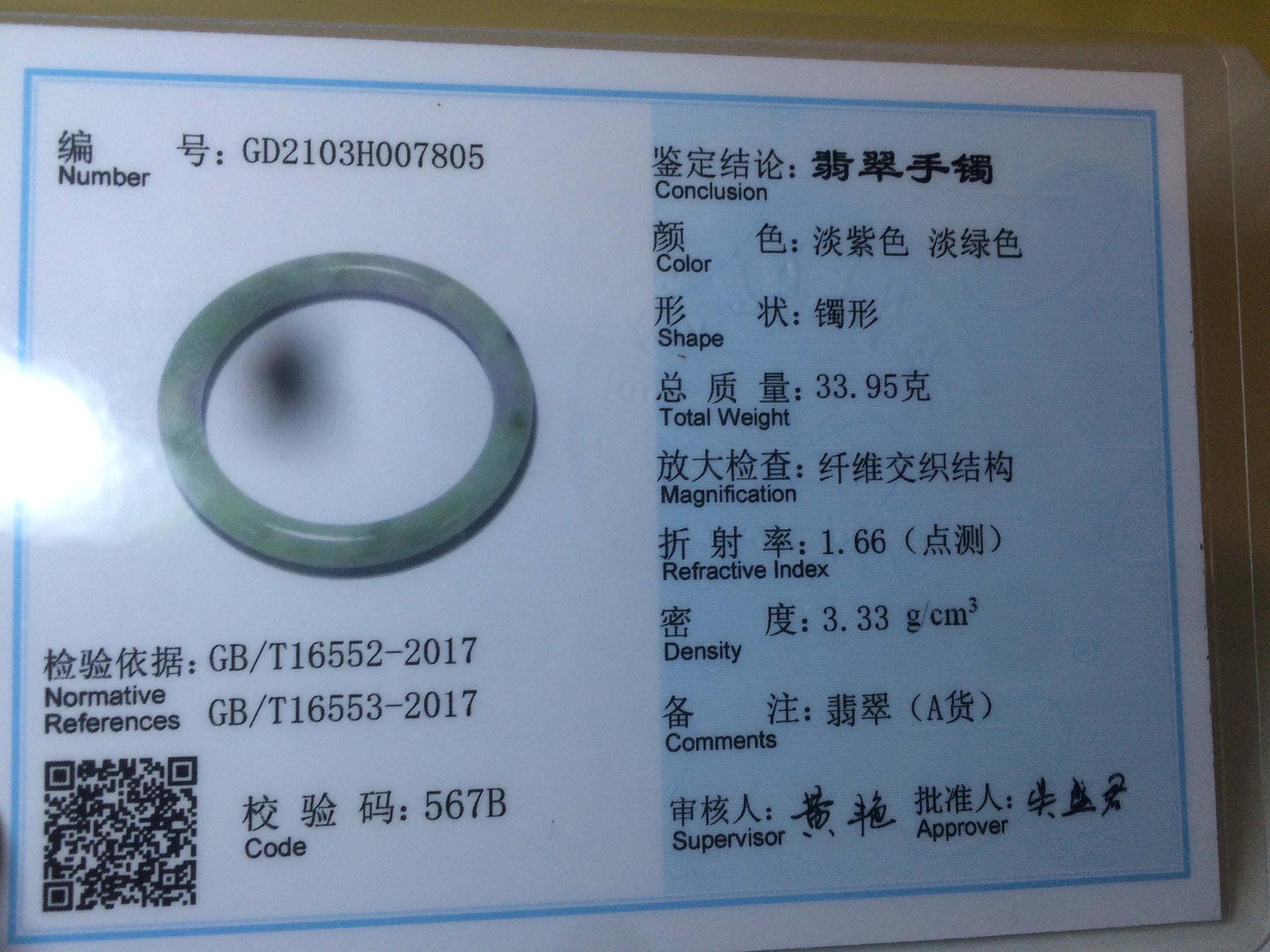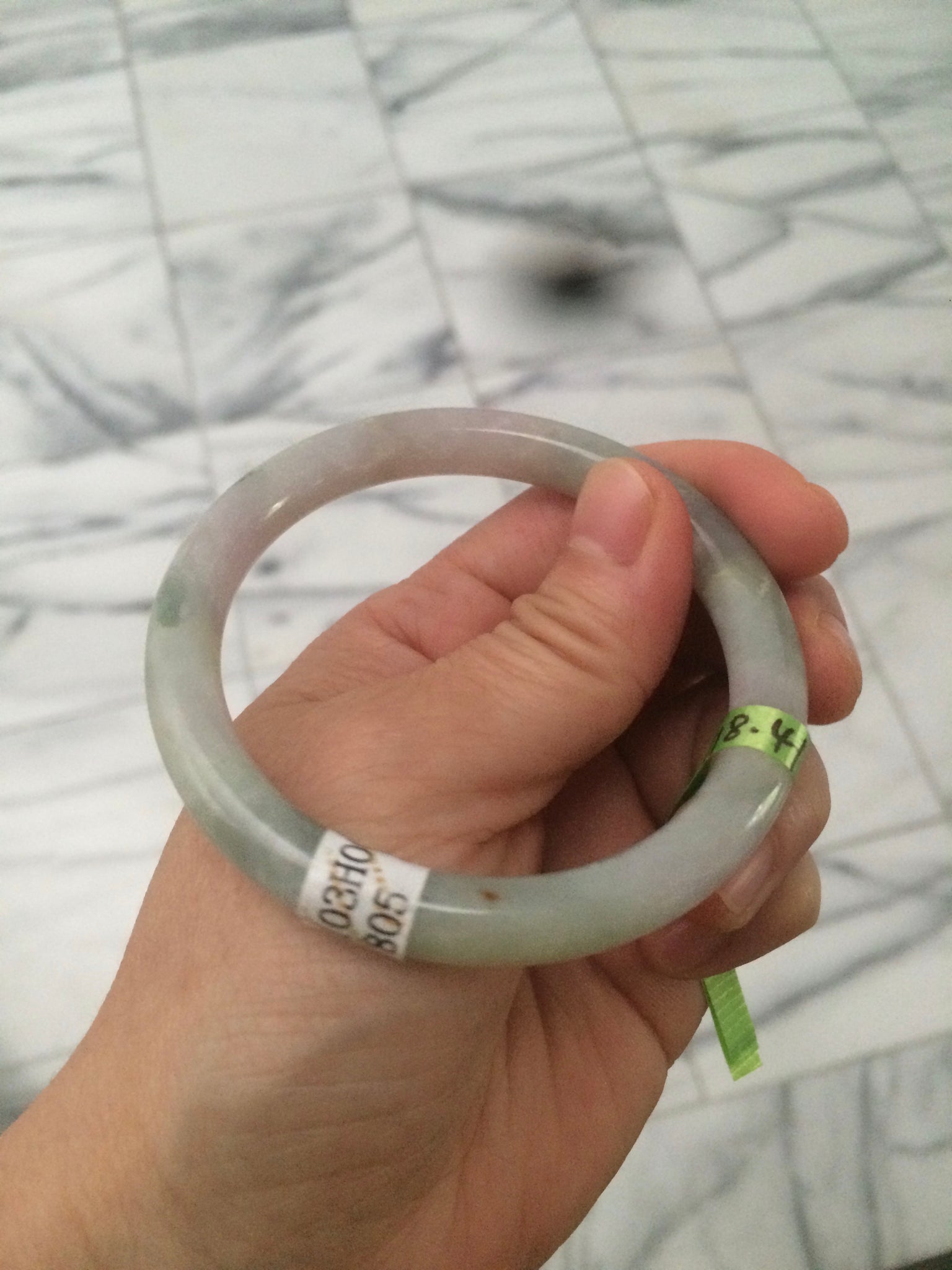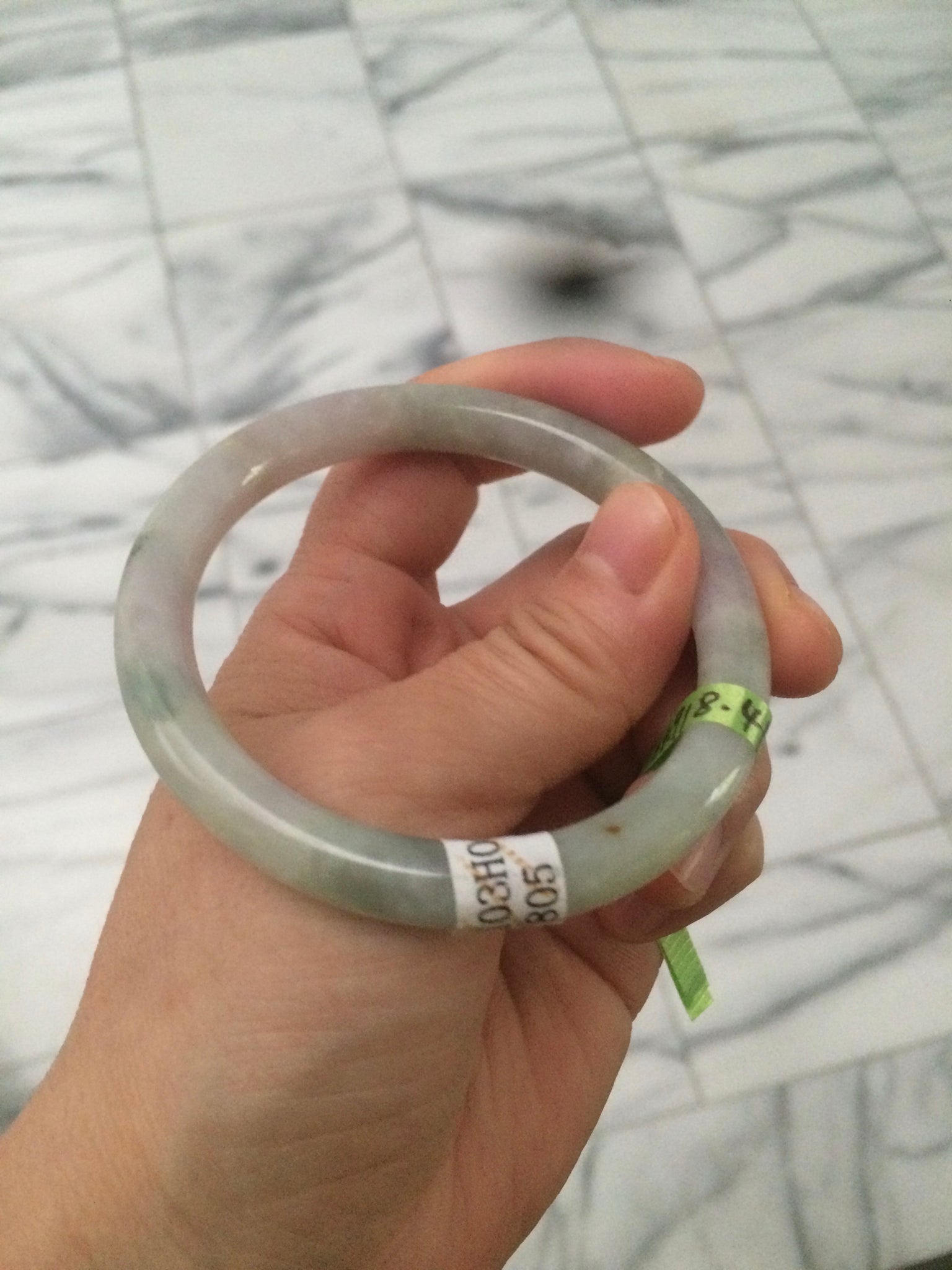 One around the bangle crack. the bangle is still firm. One small surface cracks with a tiny trace of wax. Cotton lines and spots.