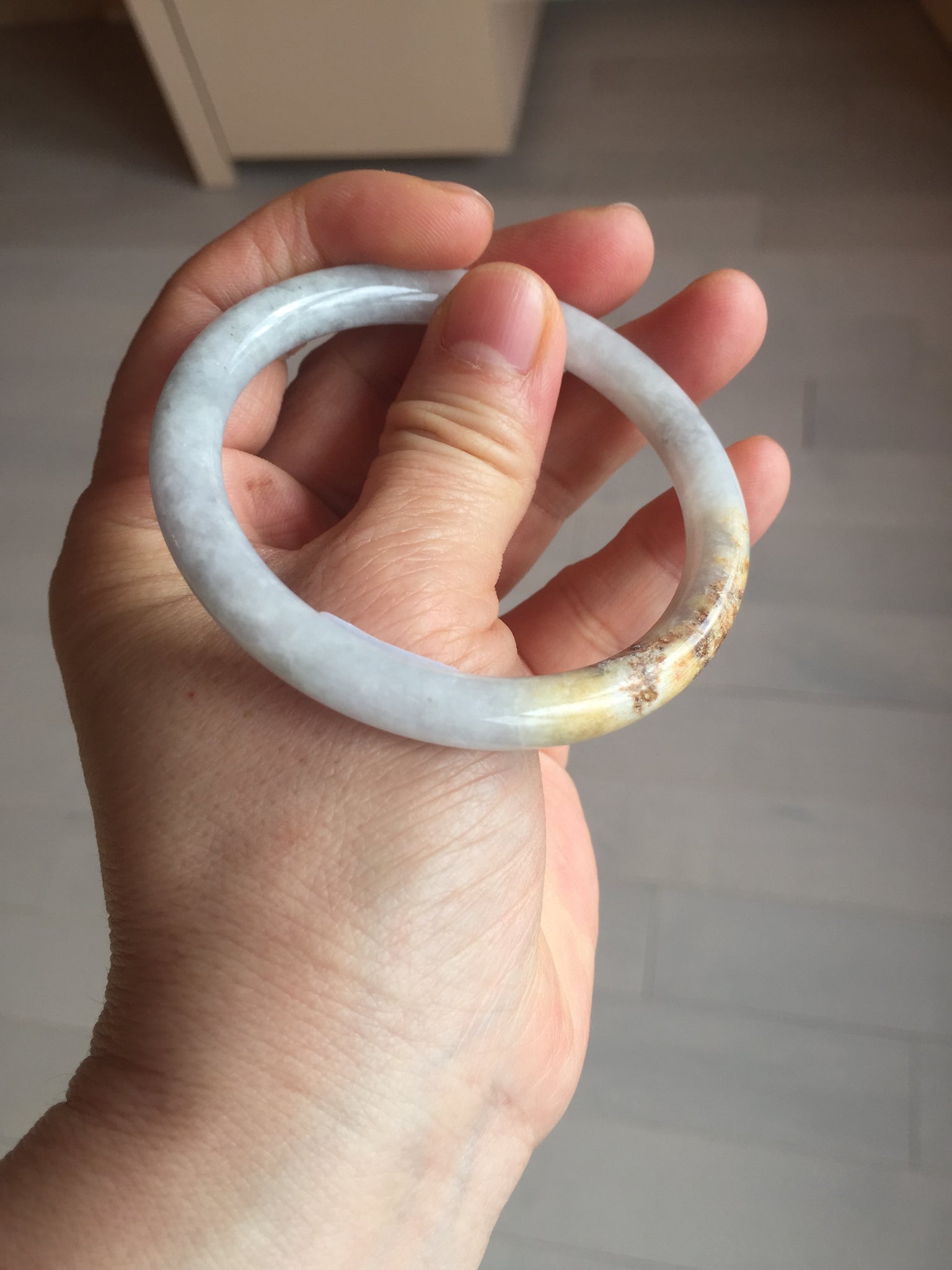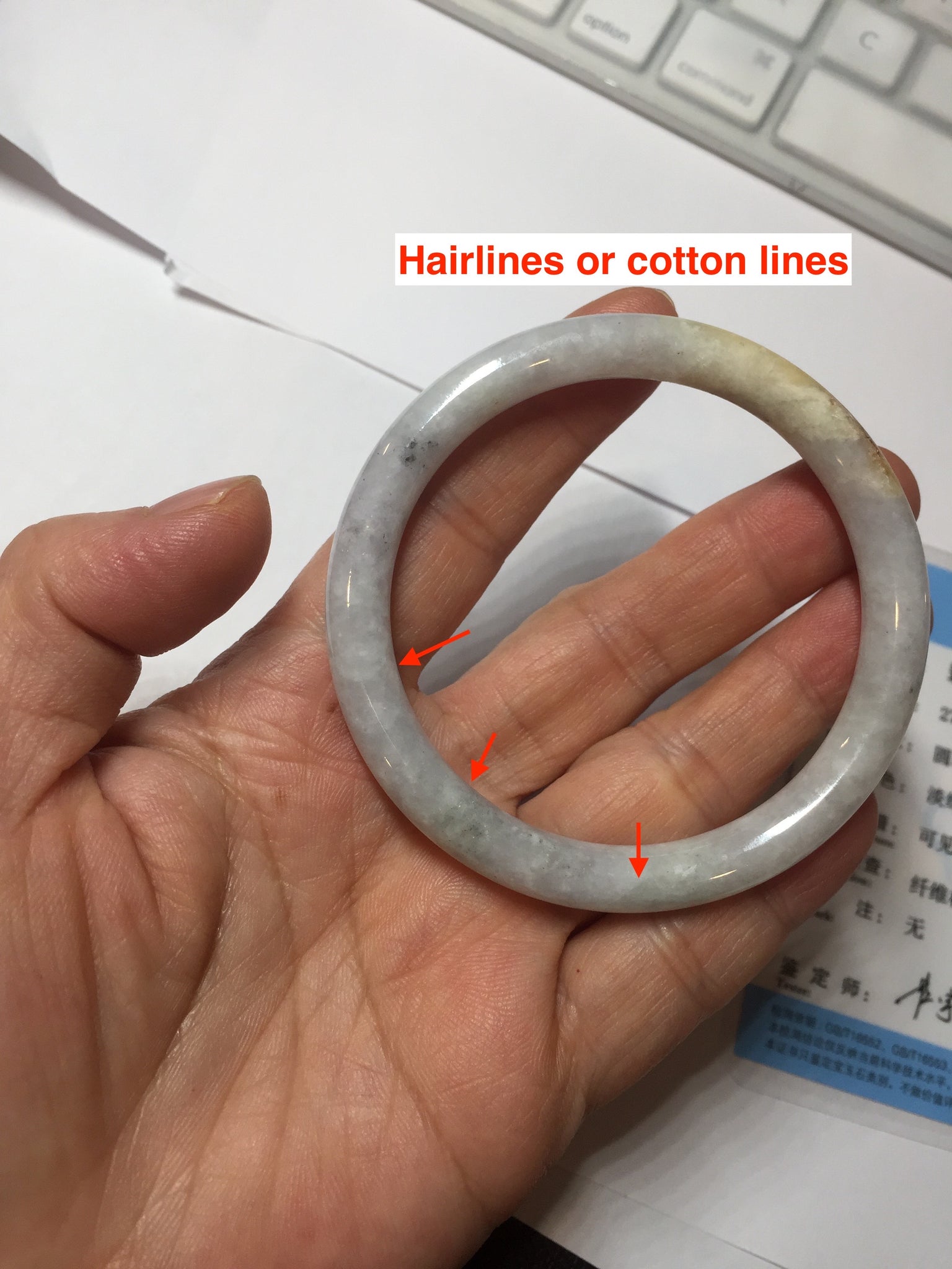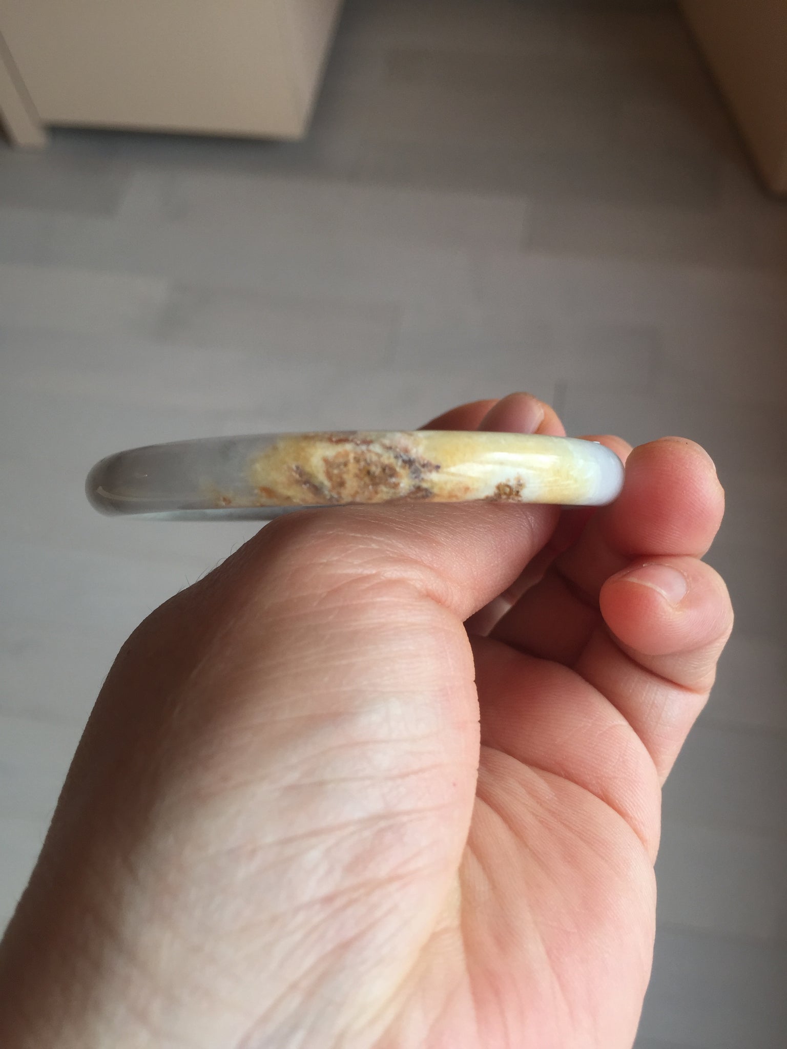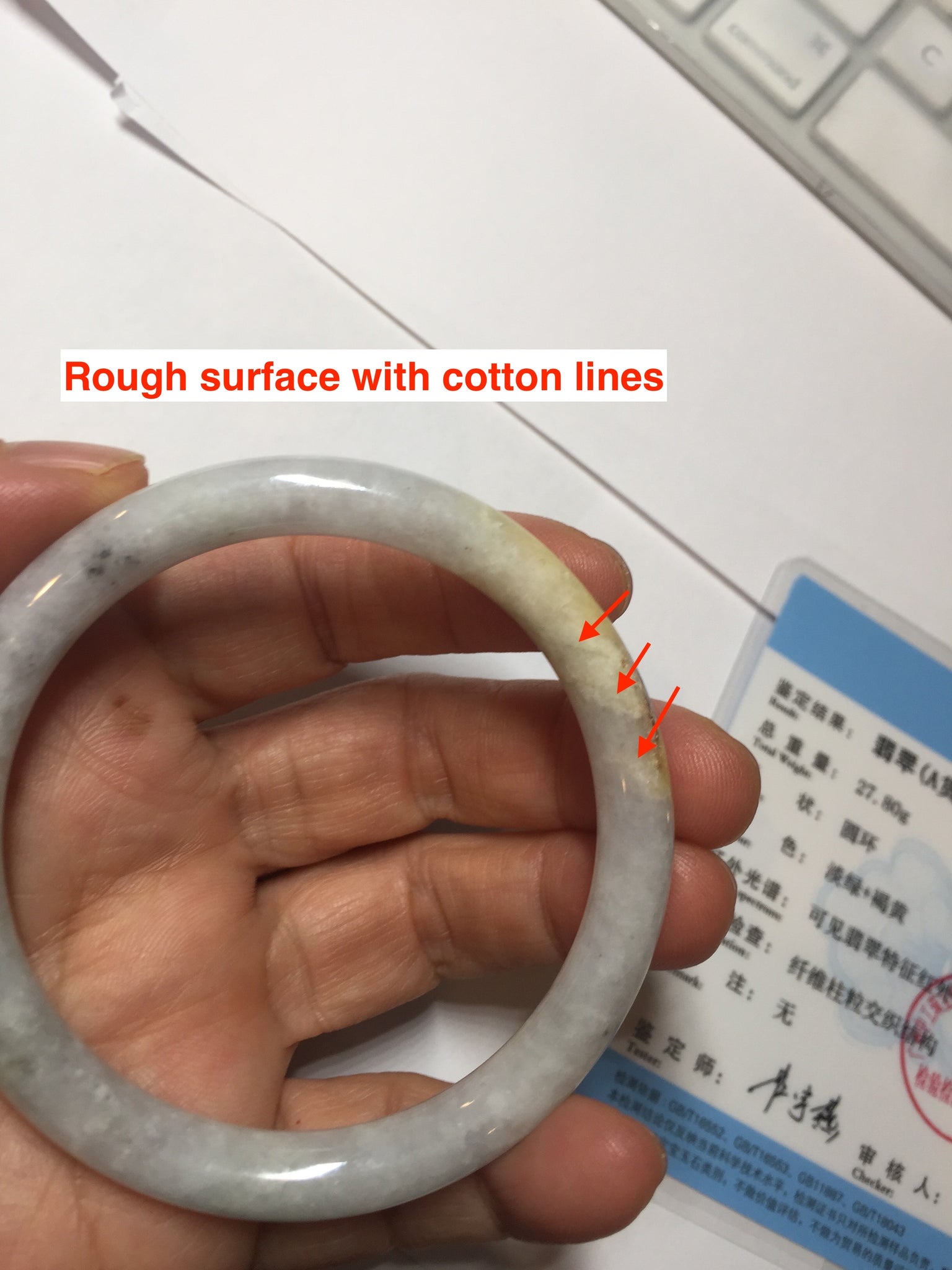 One yellow rough surface. Some hairlines or cotton lines. Some black spots. Not transparent or watery. The purple is lighter than in the photos due to the purple color always being more camera-friendly.
