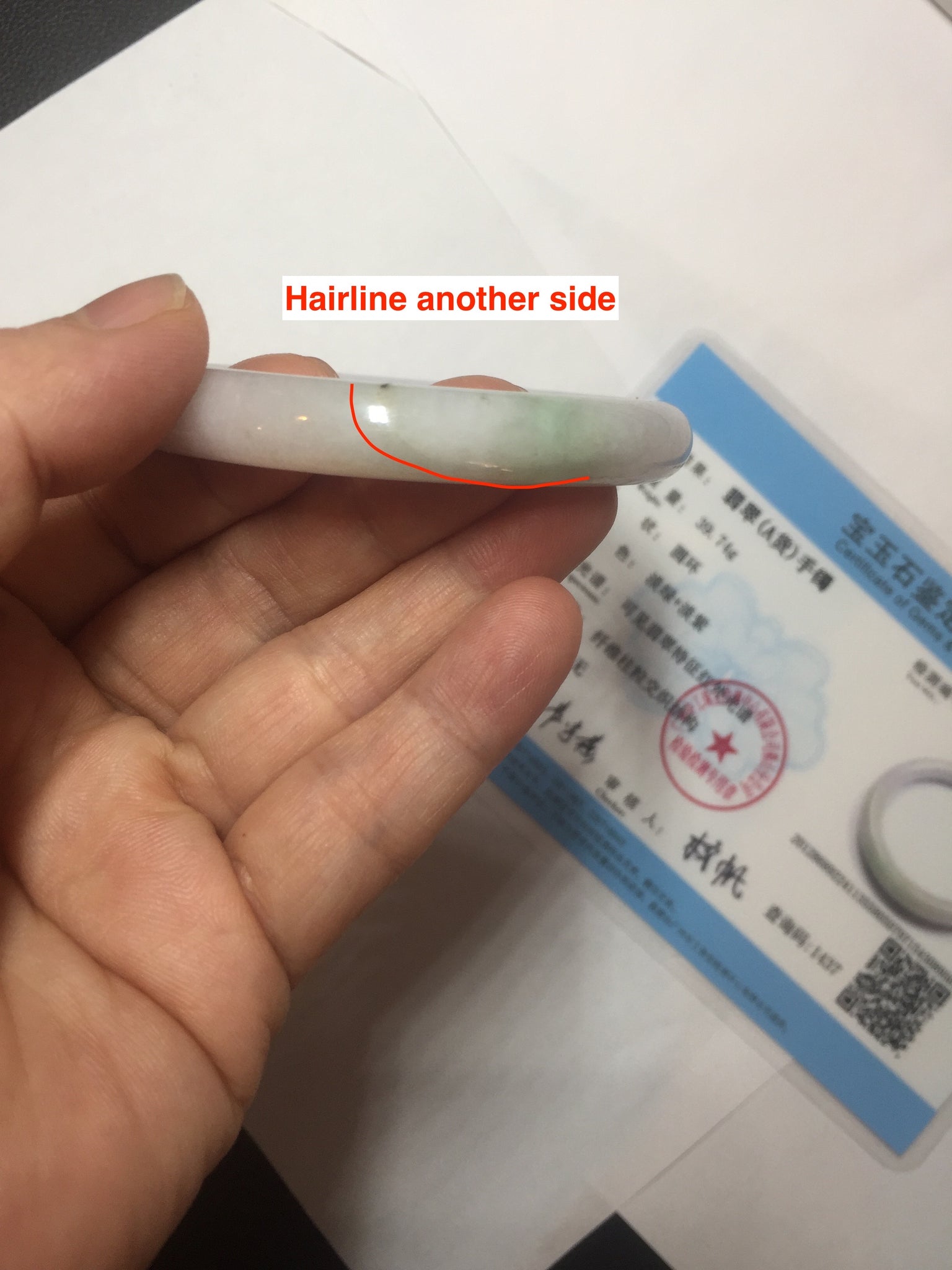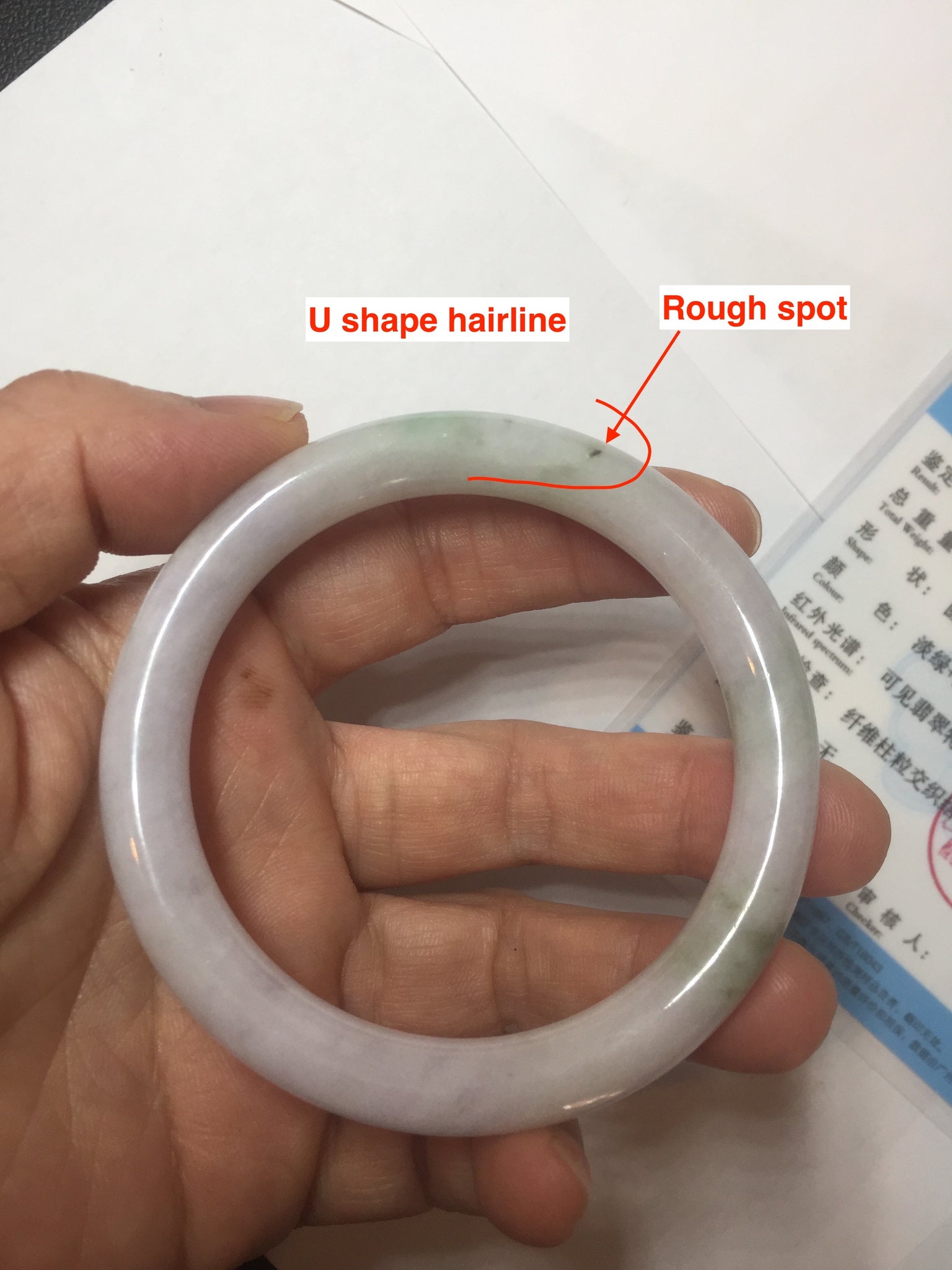 No crack. One U shape hairline. Some dark green rough surfaces or spots. Some cotton areas, cotton lines, and cotton spots. Not transparent. The purple is lighter than in the photos due to the purple color always more camera friendly.