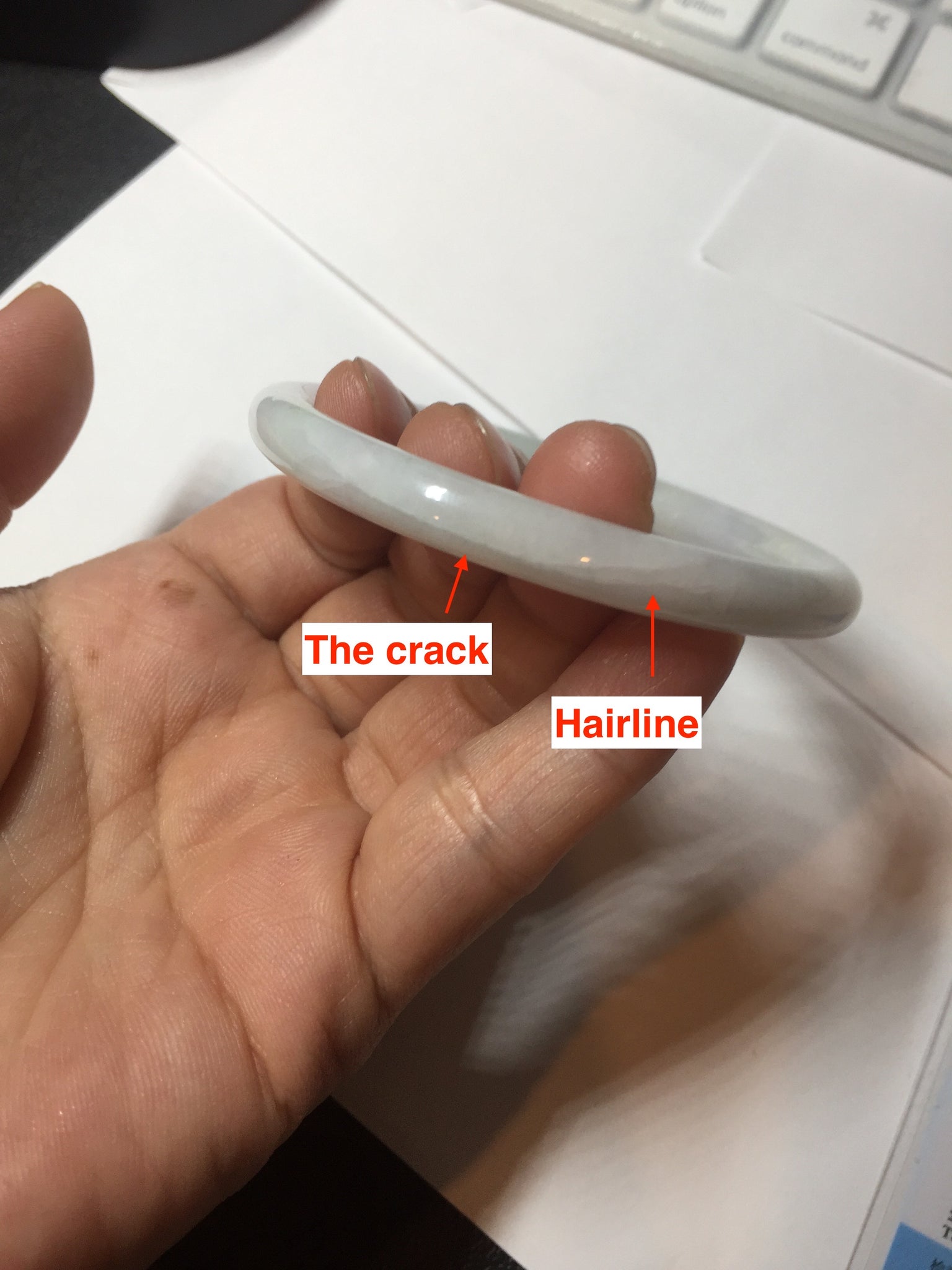 Some cracks and hairlines. The bangle is solid(guaranteed). Some cotton lines, and cotton spots. All colors are really light. The purple is lighter than in the photos due to the purple color always being more camera-friendly.