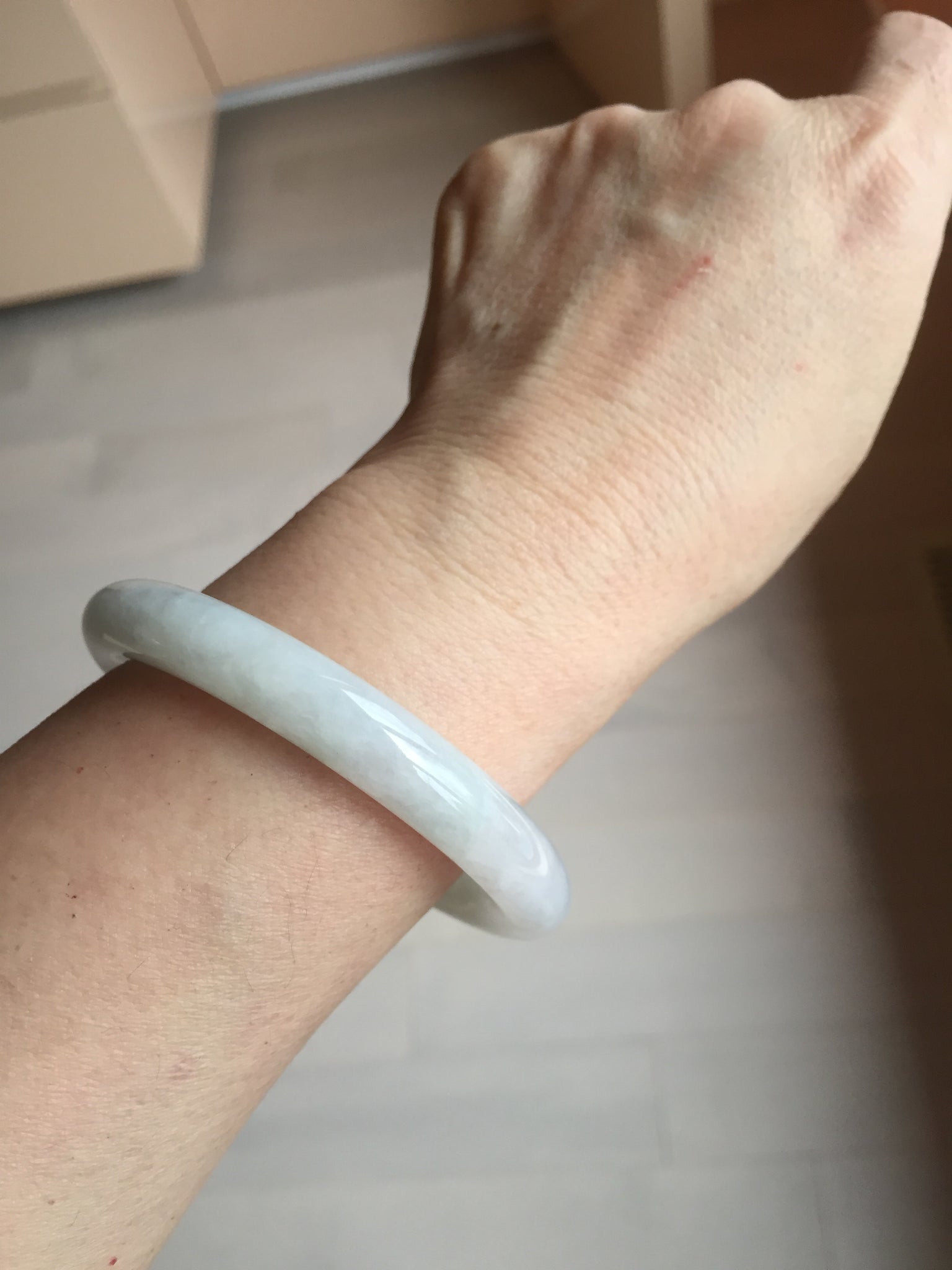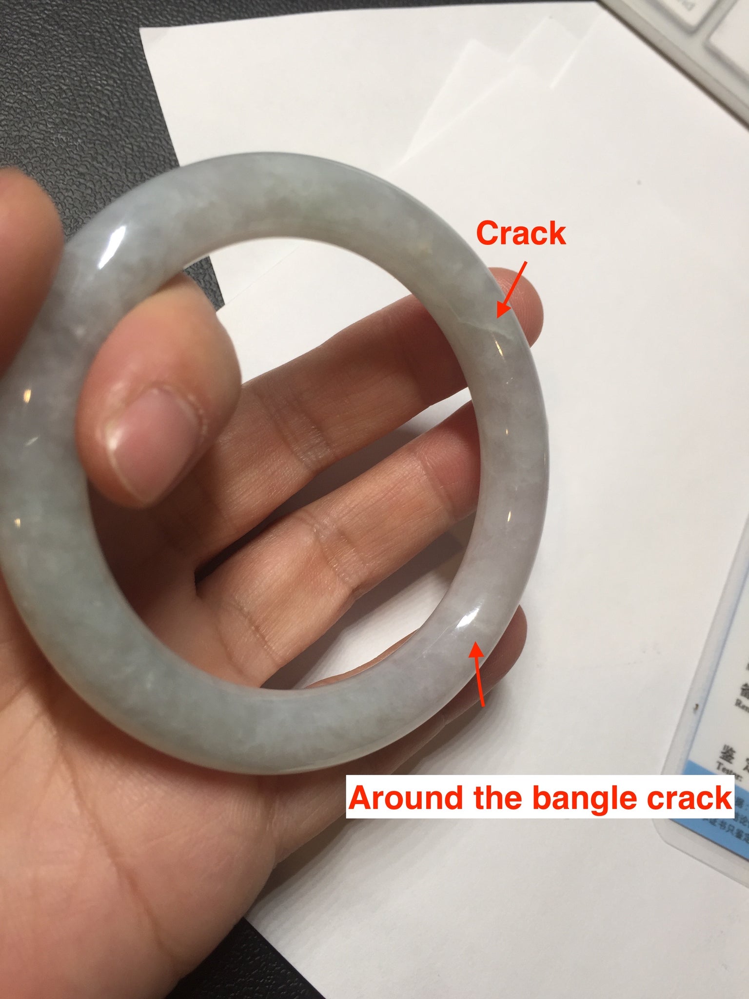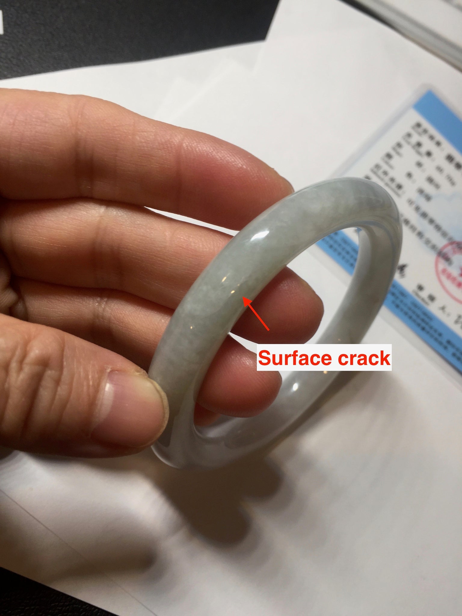 Some cracks. One is an around-the-bangle crack. But the inner side is connected. The bangle is solid(guaranteed!). It makes a high-pitched sound when clicked. Some cotton areas and cotton lines. Some small rough surfaces. The purple is lighter than in the photos due to the purple color always being more camera-friendly.