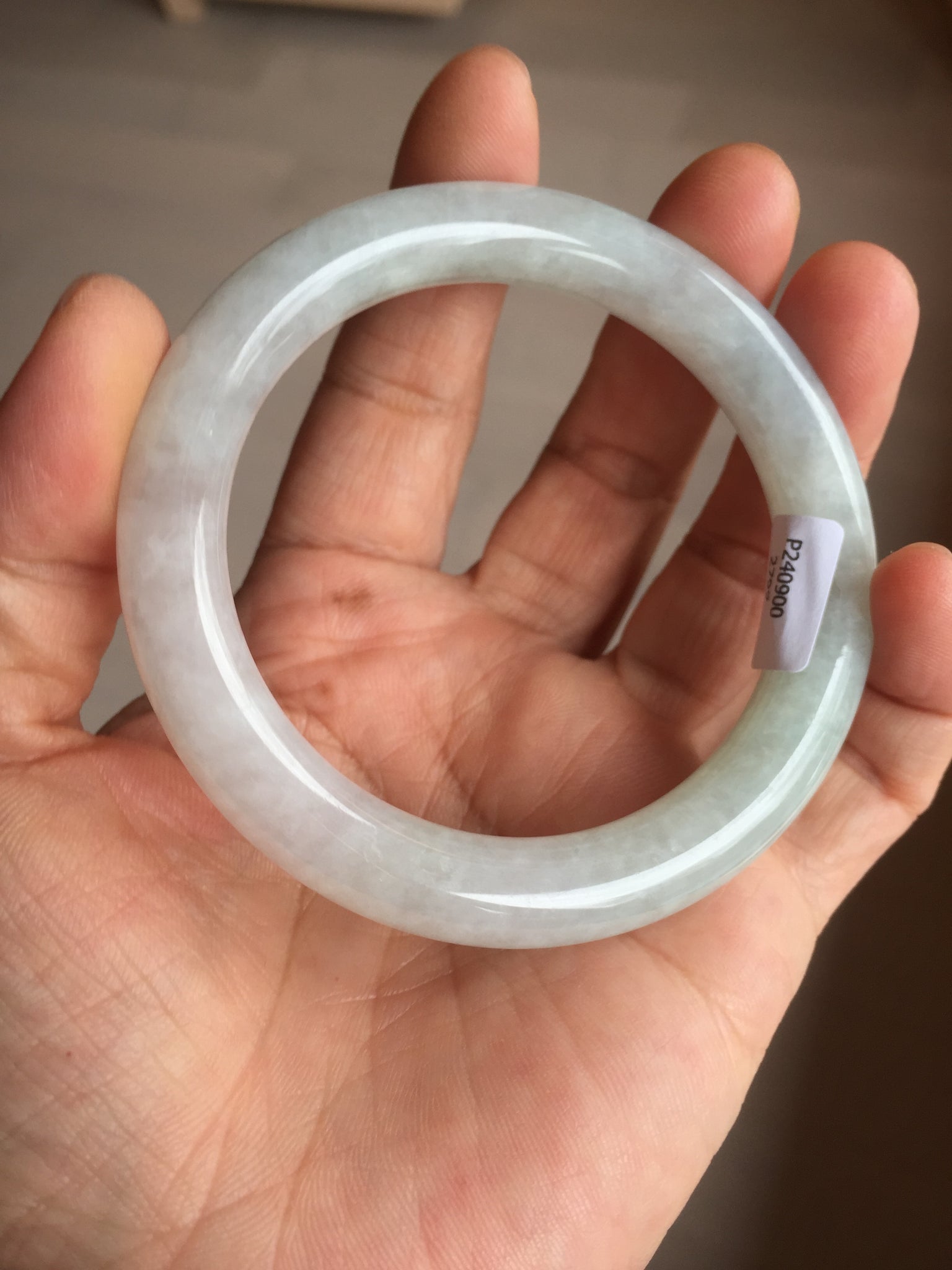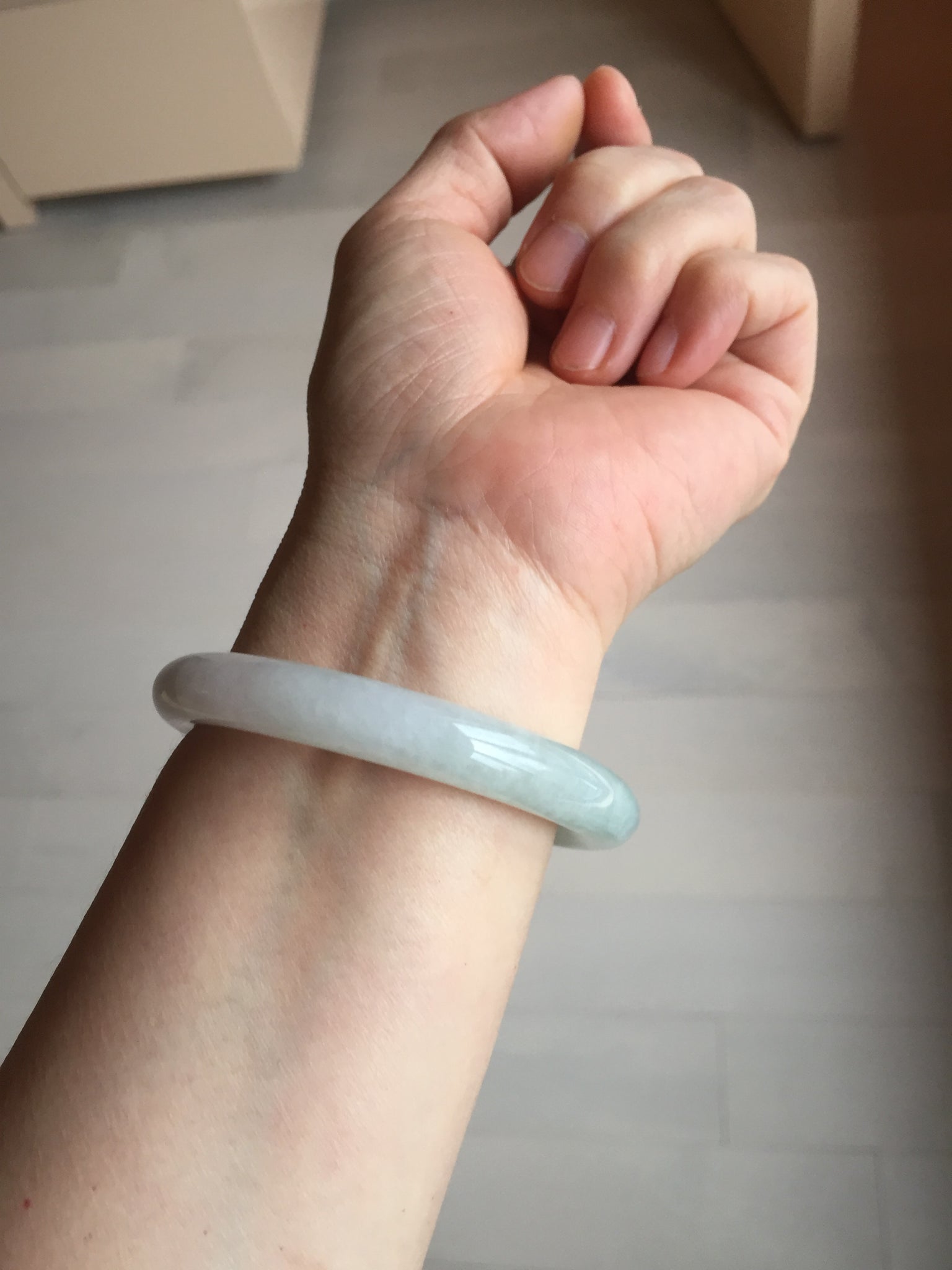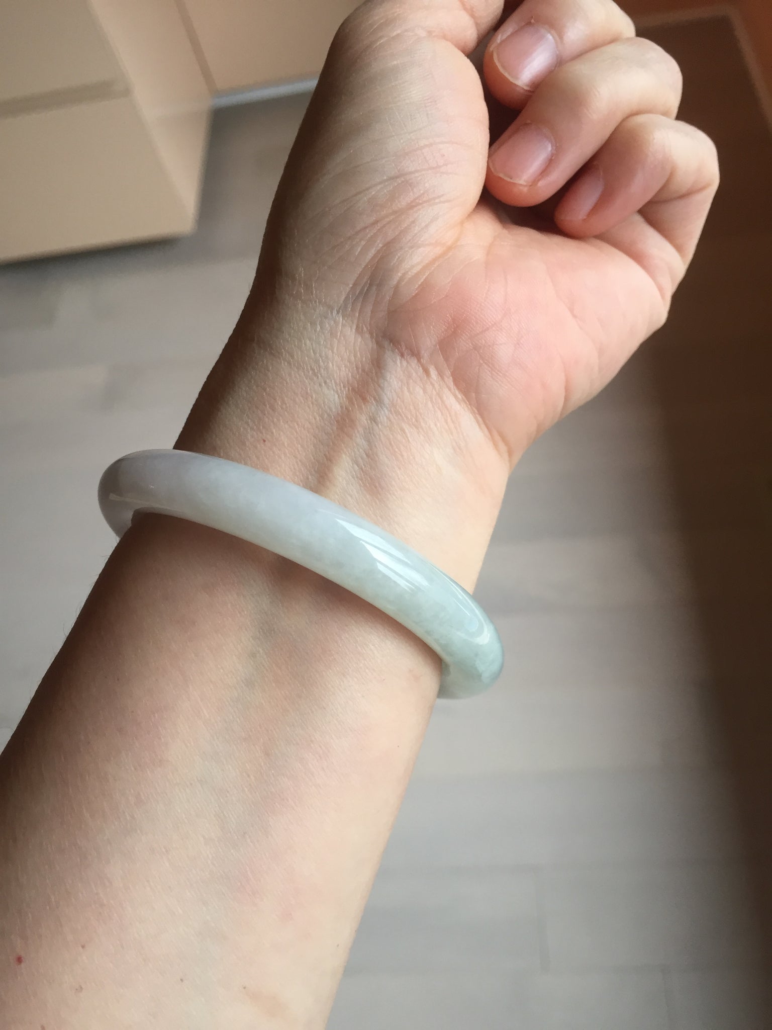 Some cracks. One is an around-the-bangle crack. But the inner side is connected. The bangle is solid(guaranteed!). It makes a high-pitched sound when clicked. Some cotton areas and cotton lines. Some small rough surfaces. The purple is lighter than in the photos due to the purple color always being more camera-friendly.