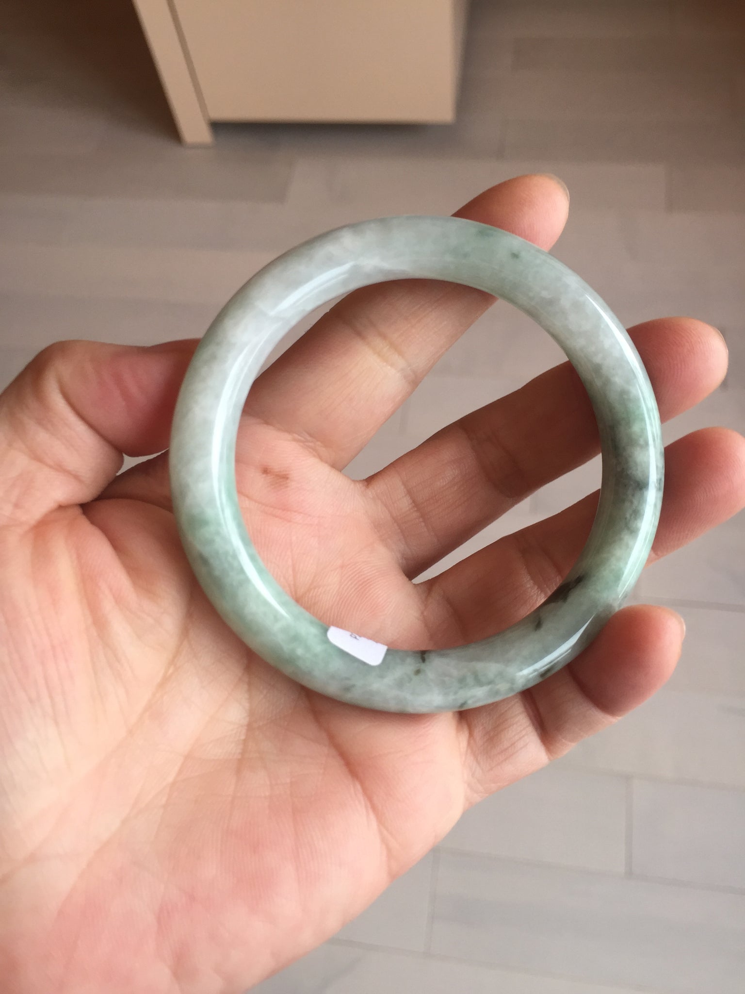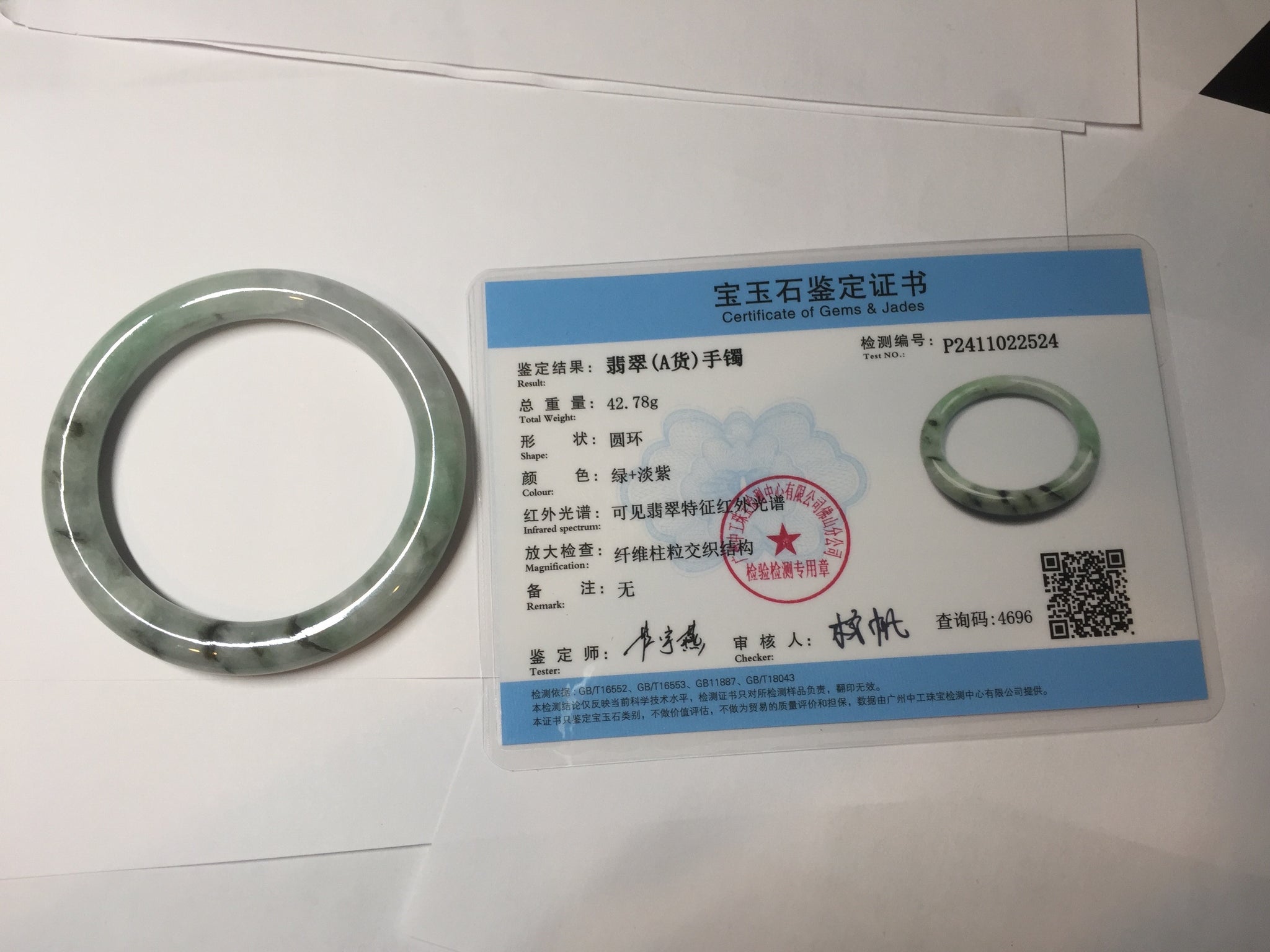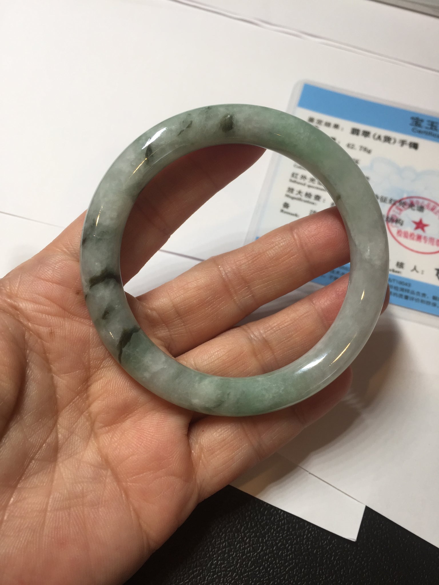 One crack. The bangle is solid(Guaranteed). Quite a lot of hairline, cotton lines, and structure lines. Some cotton spots.