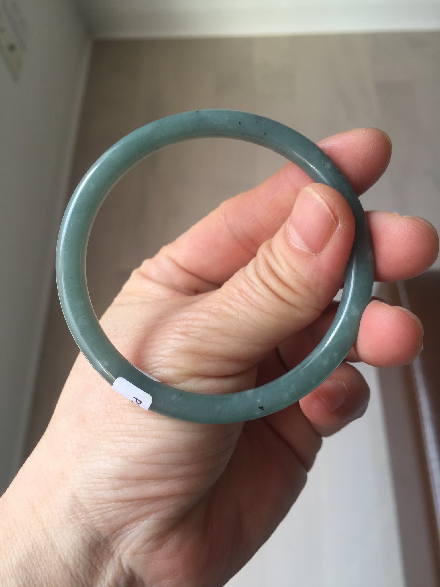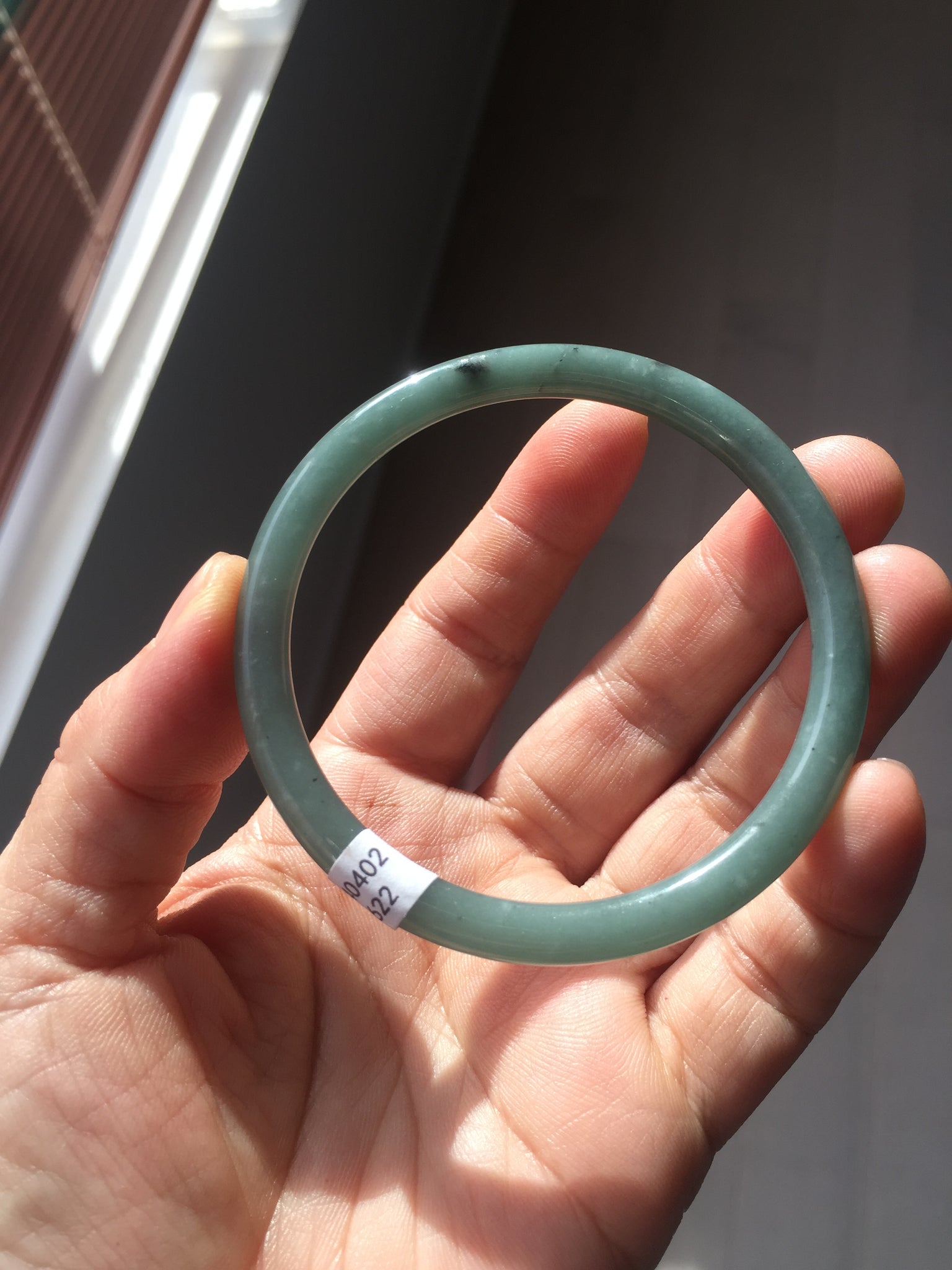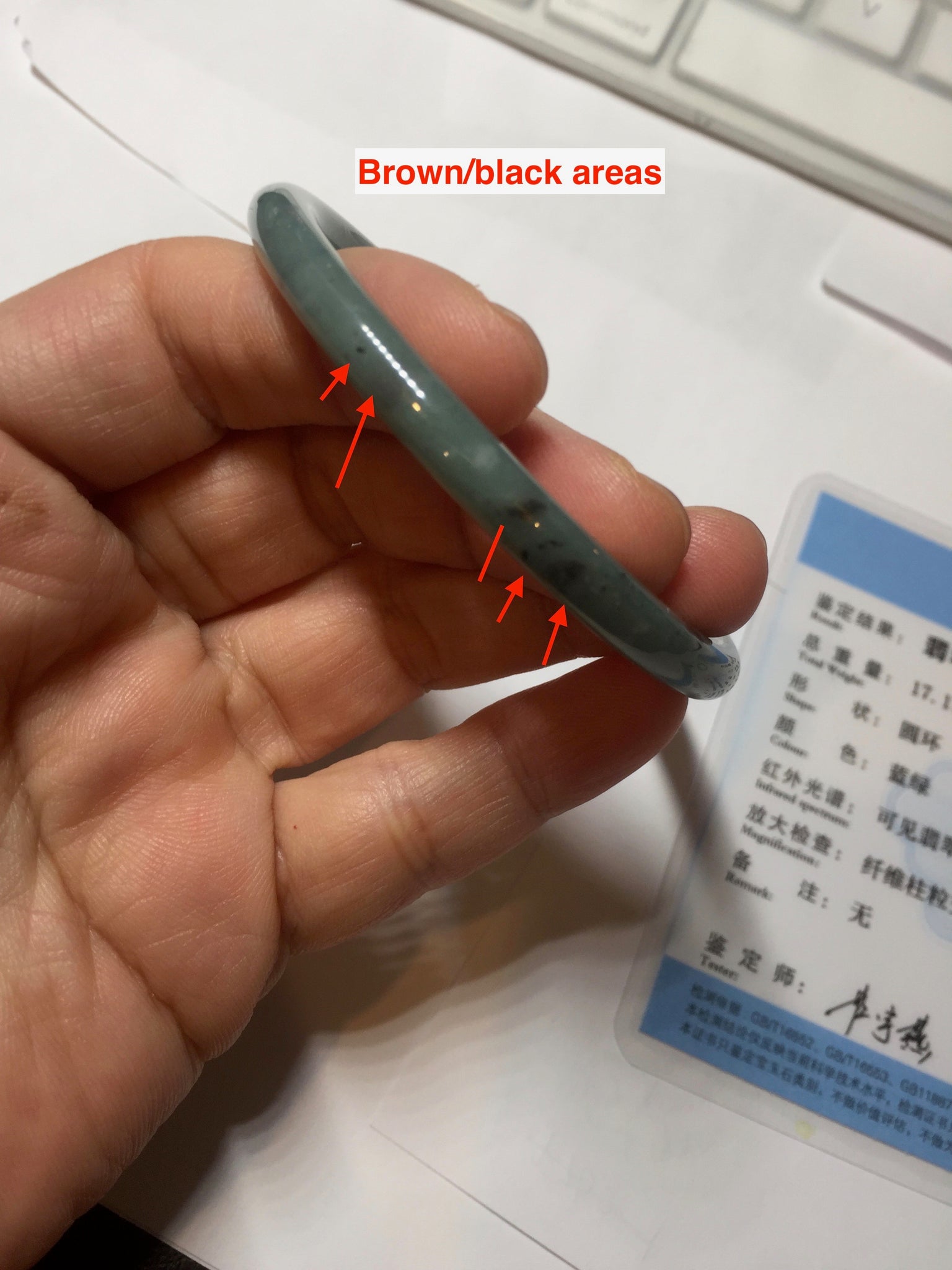 No crack. No hairline. Some brown/black areas. Some cotton lines, cotton areas, or spots. The bangle has some gray/black color.