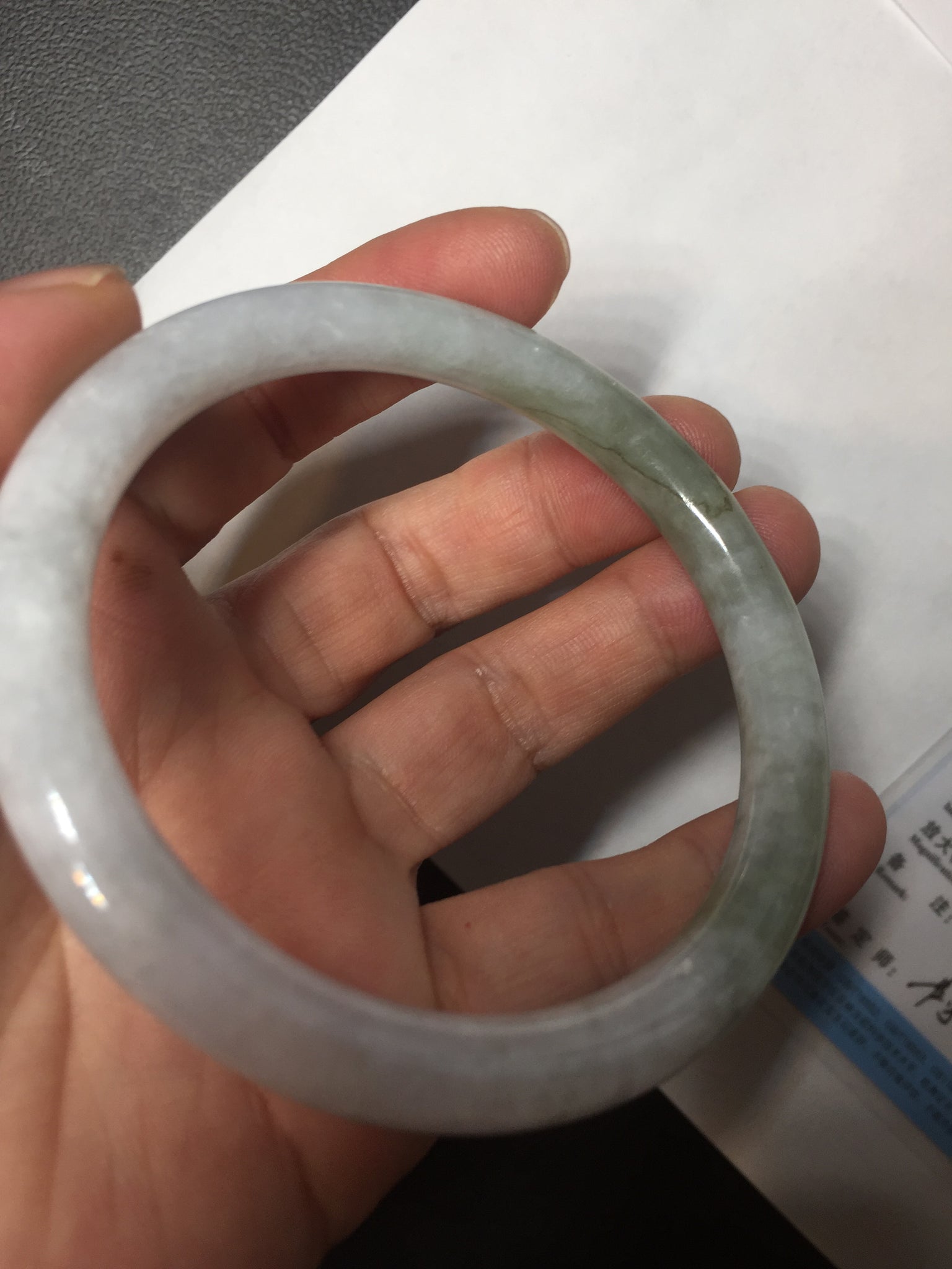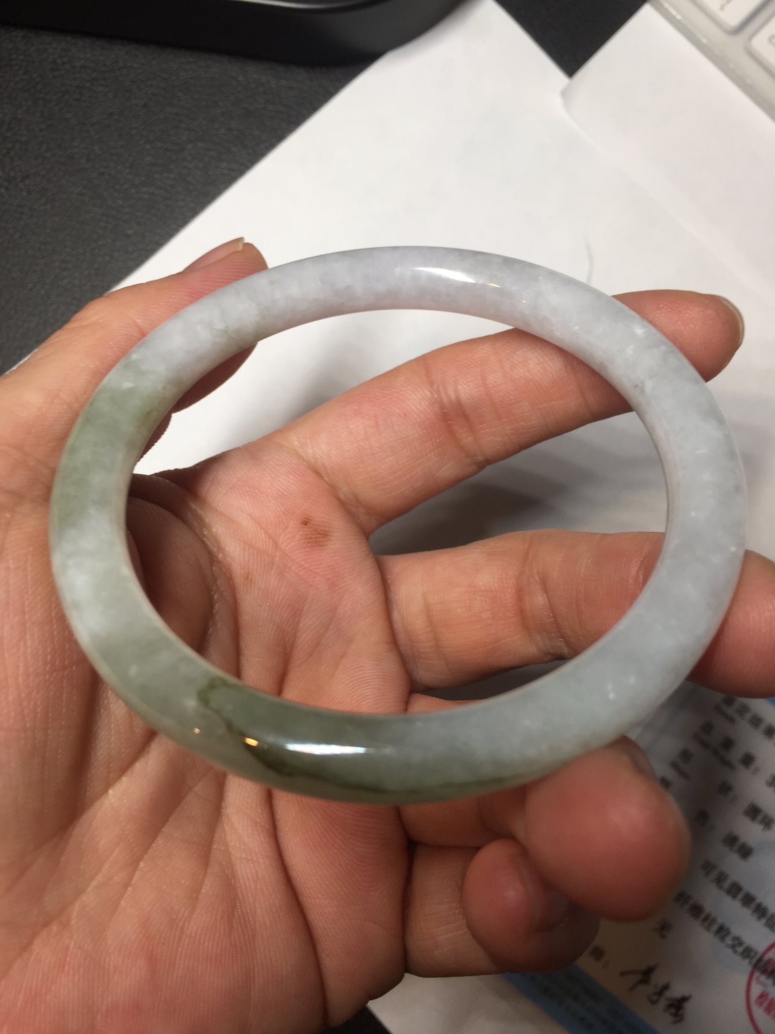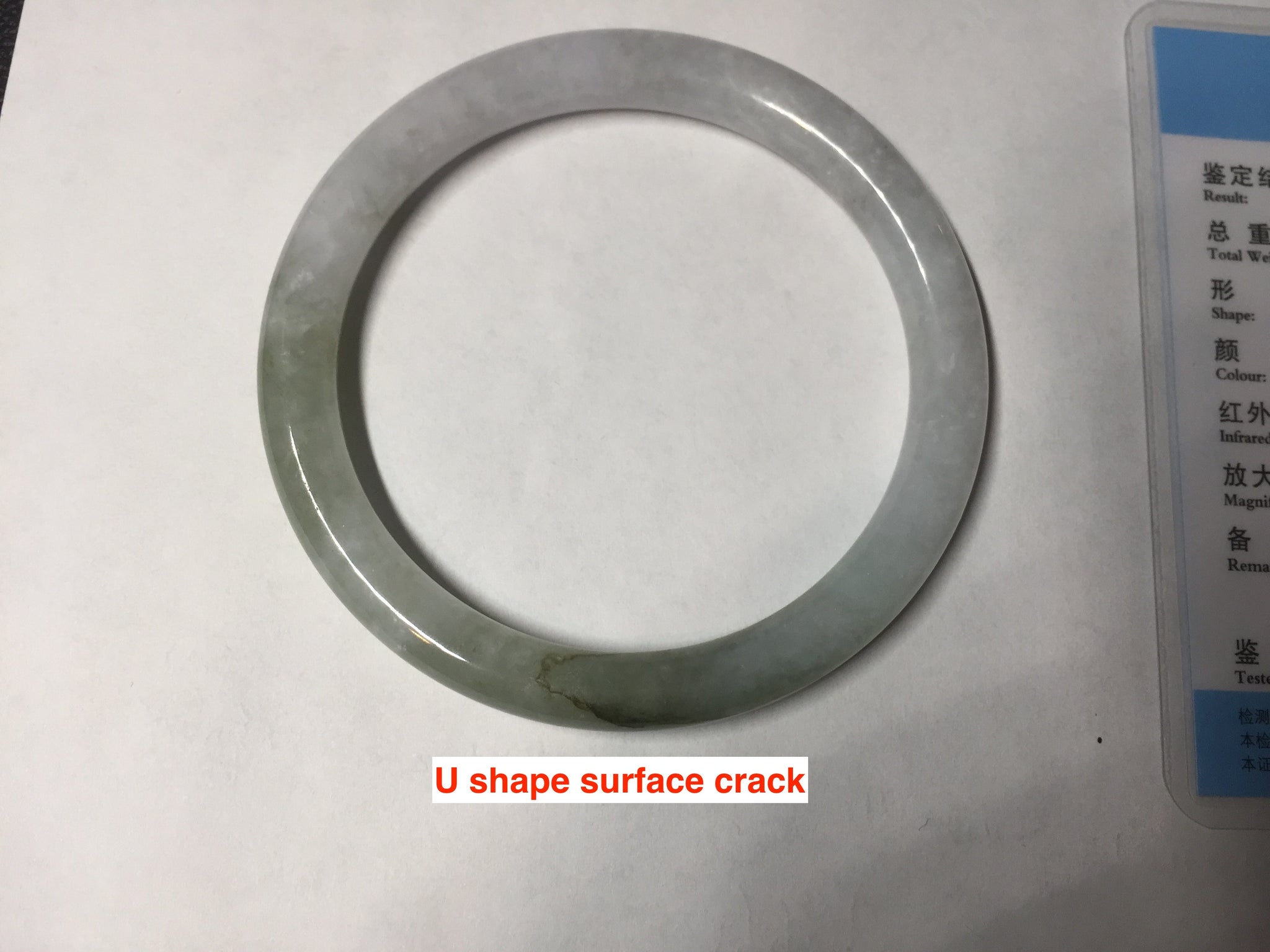 One U-shape dark green color root crack. The bangle is solid (Guaranteed!). One hairline. Some cotton lines, cotton areas, and cotton spots.