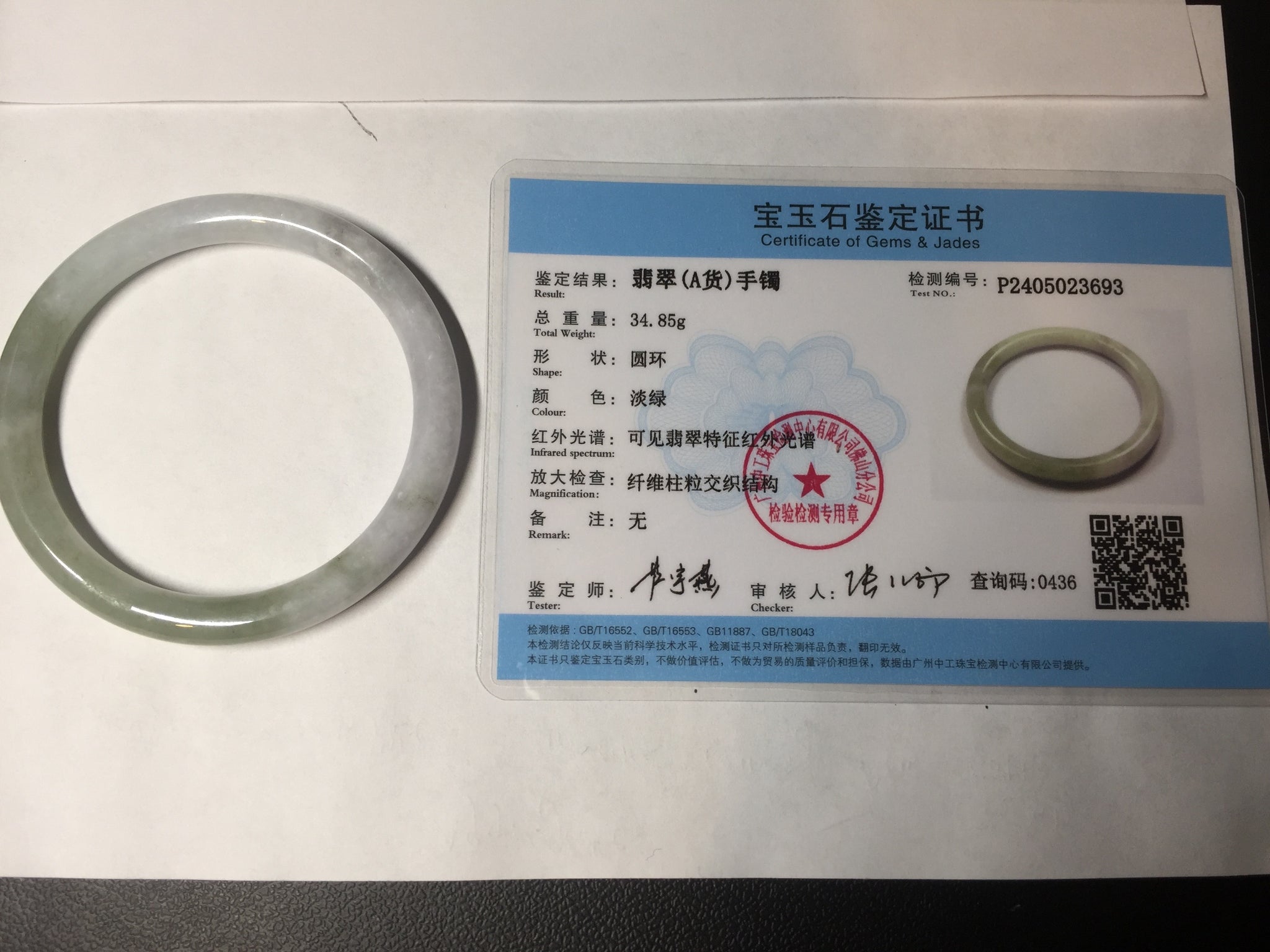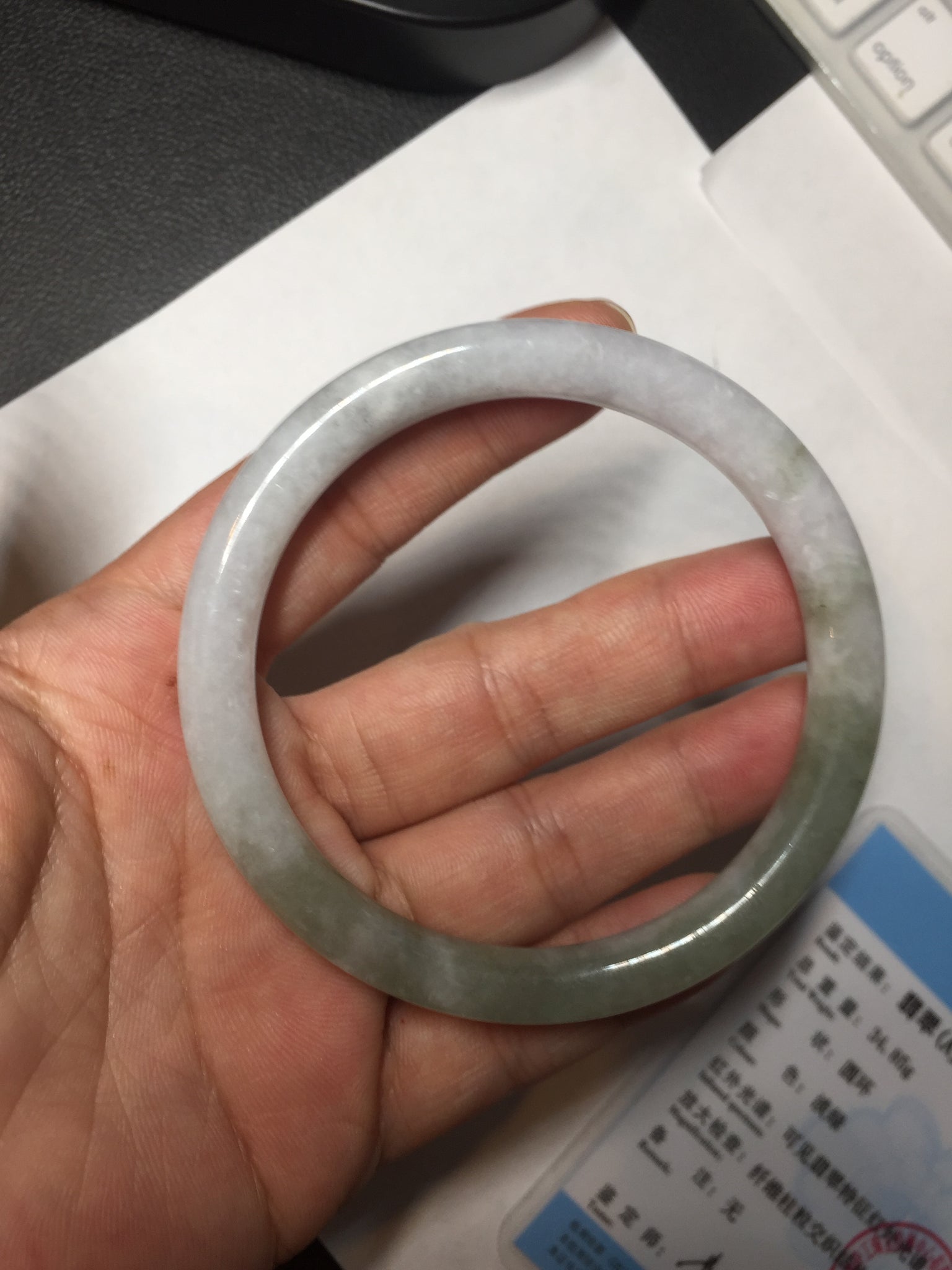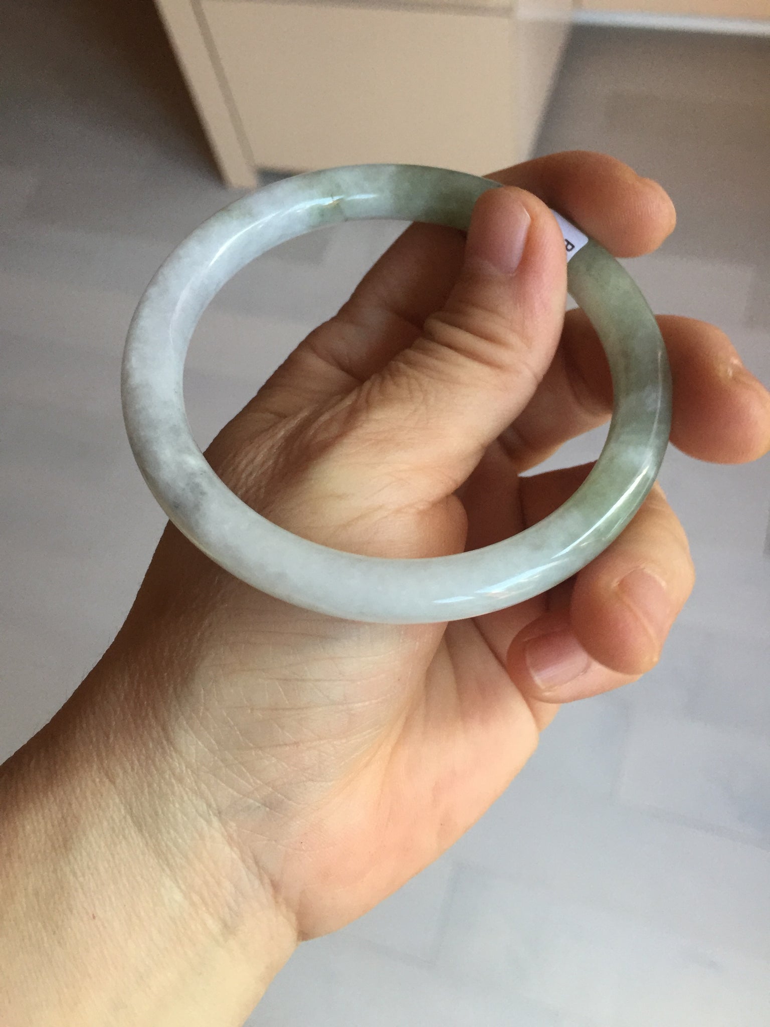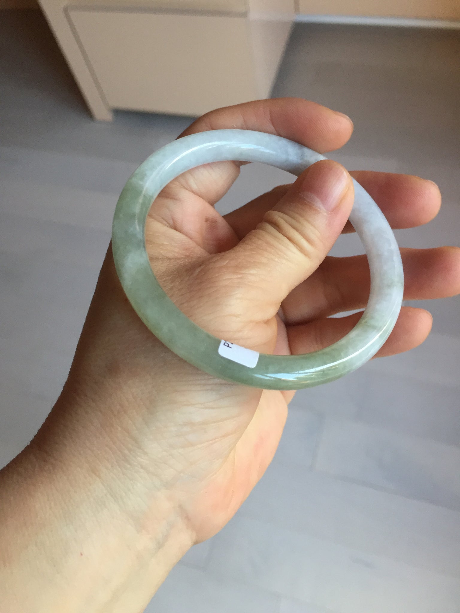 One U-shape dark green color root crack. The bangle is solid (Guaranteed!). One hairline. Some cotton lines, cotton areas, and cotton spots.