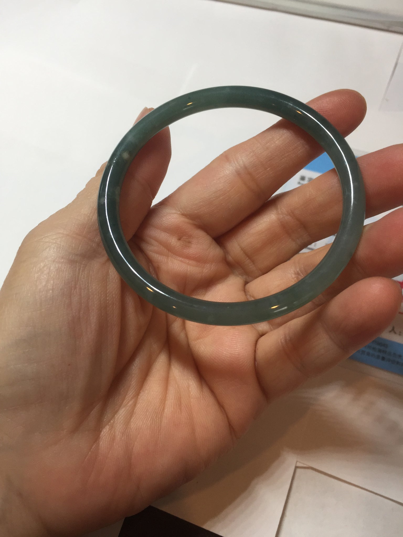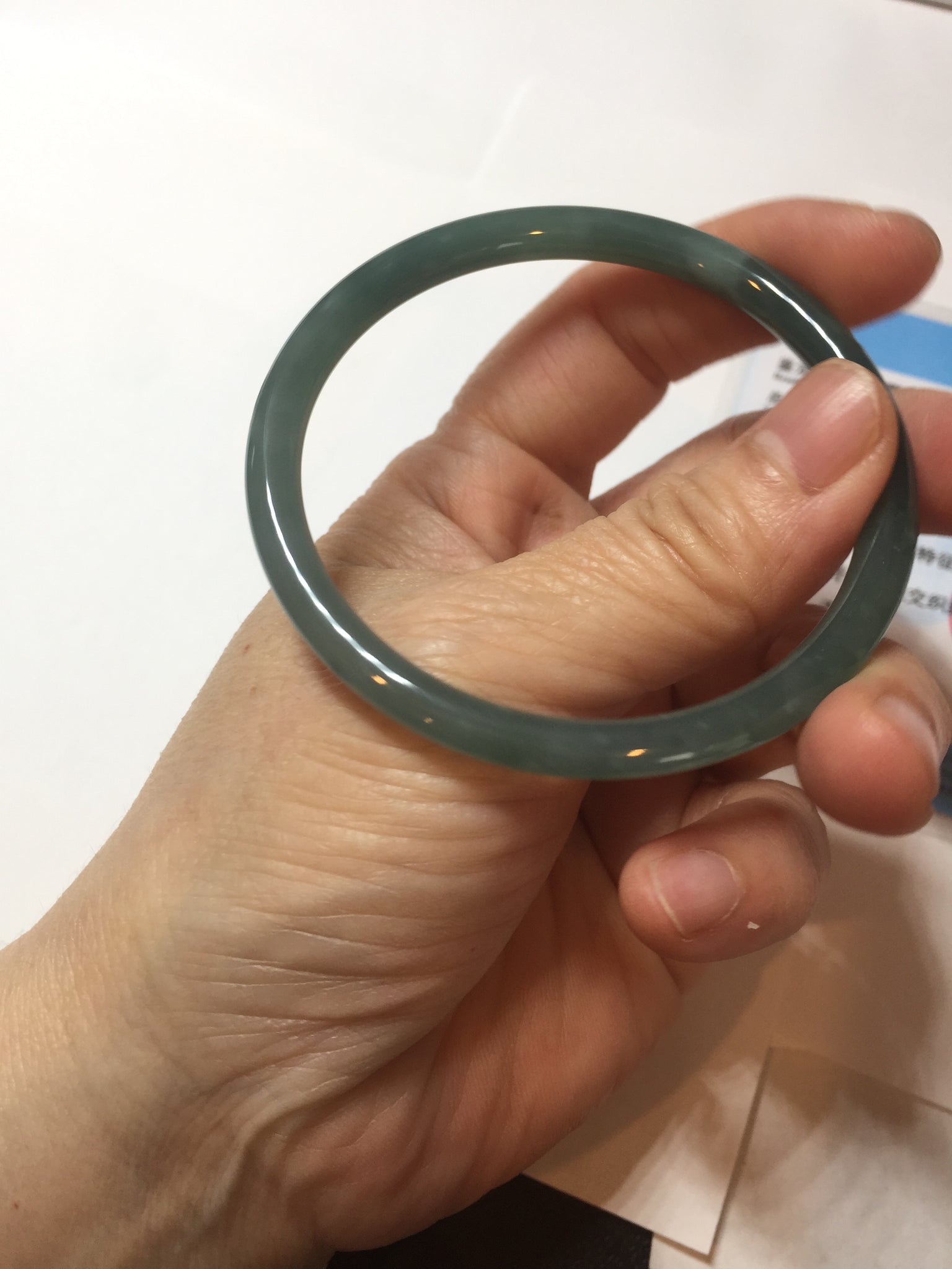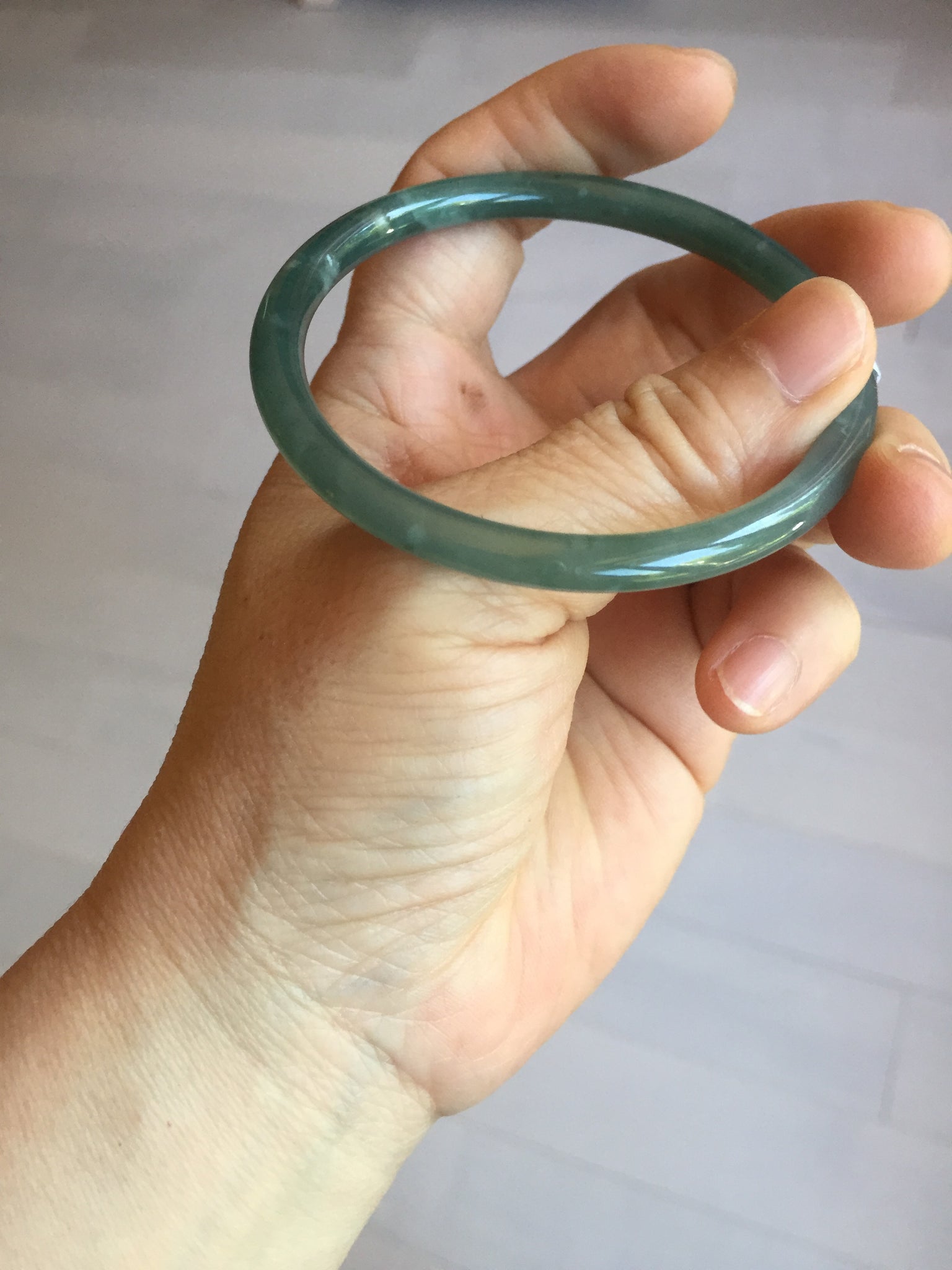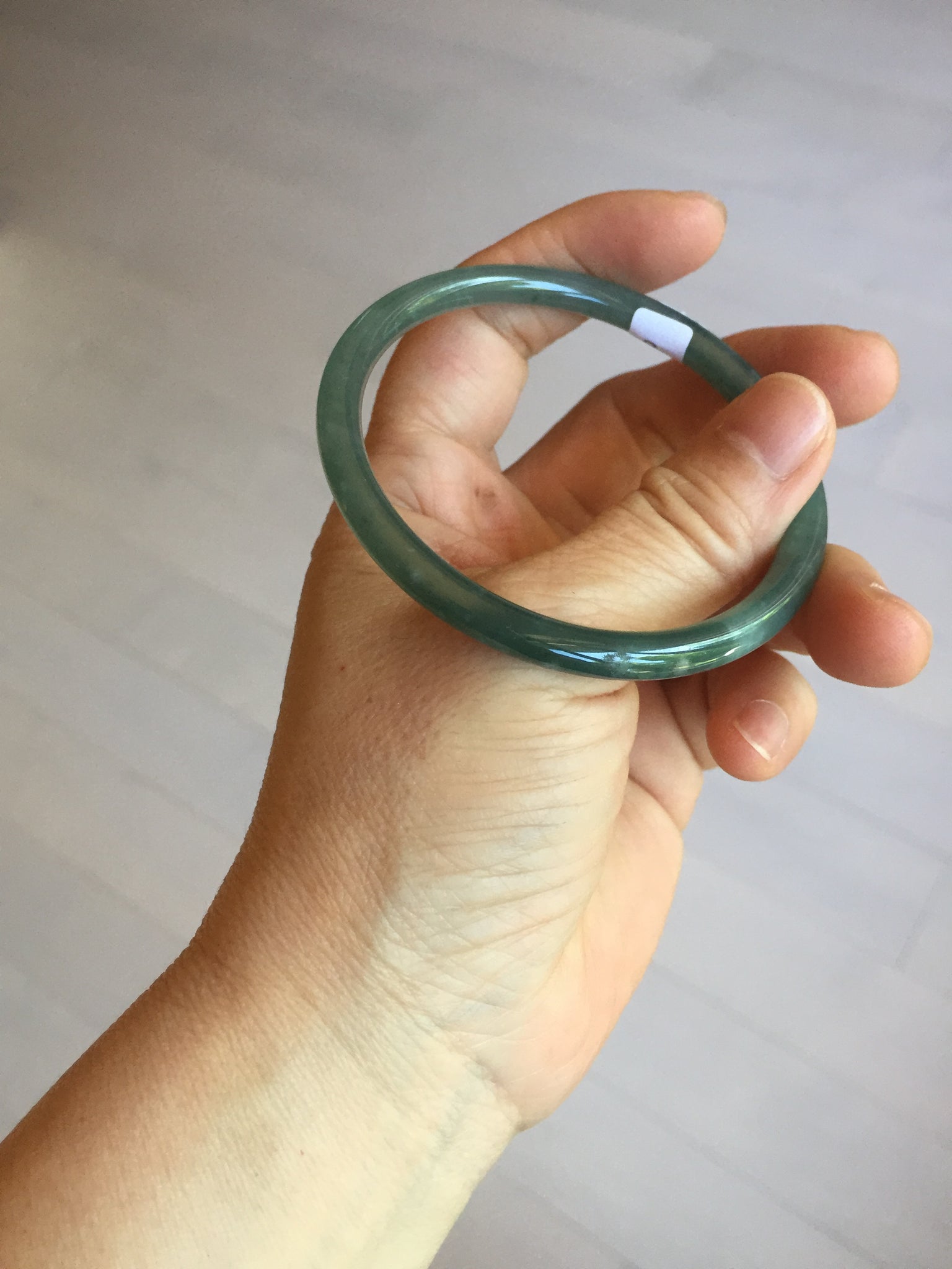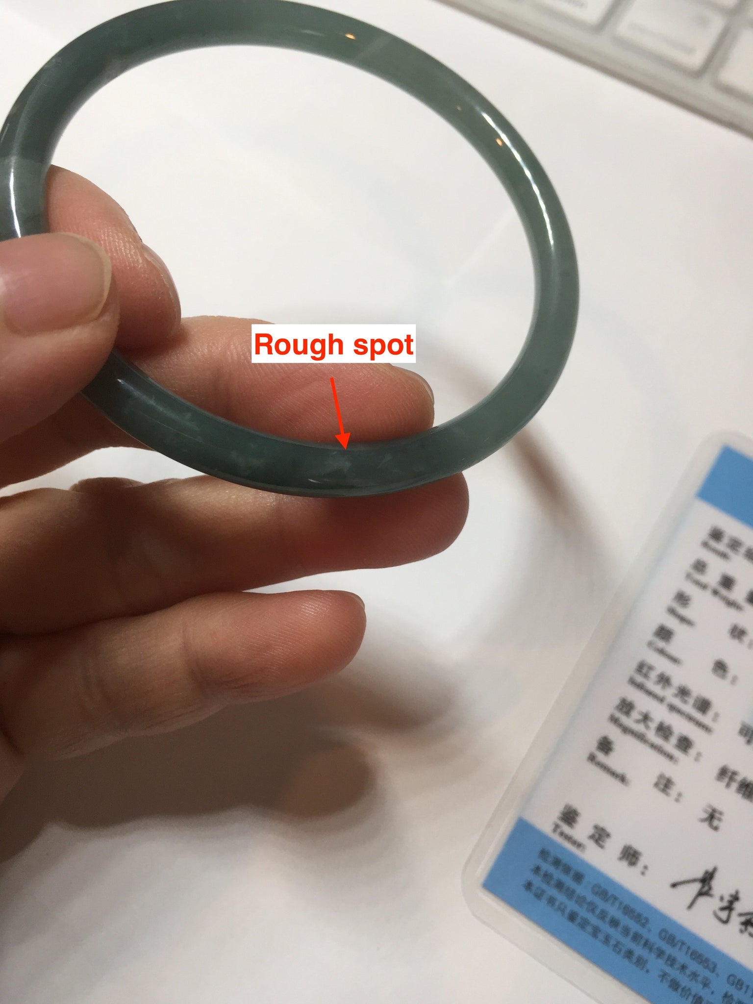 One surface crack. Some rough surfaces. One rough spot. The bangle is firm. Some cotton areas or spots. Has some grey/ black color.